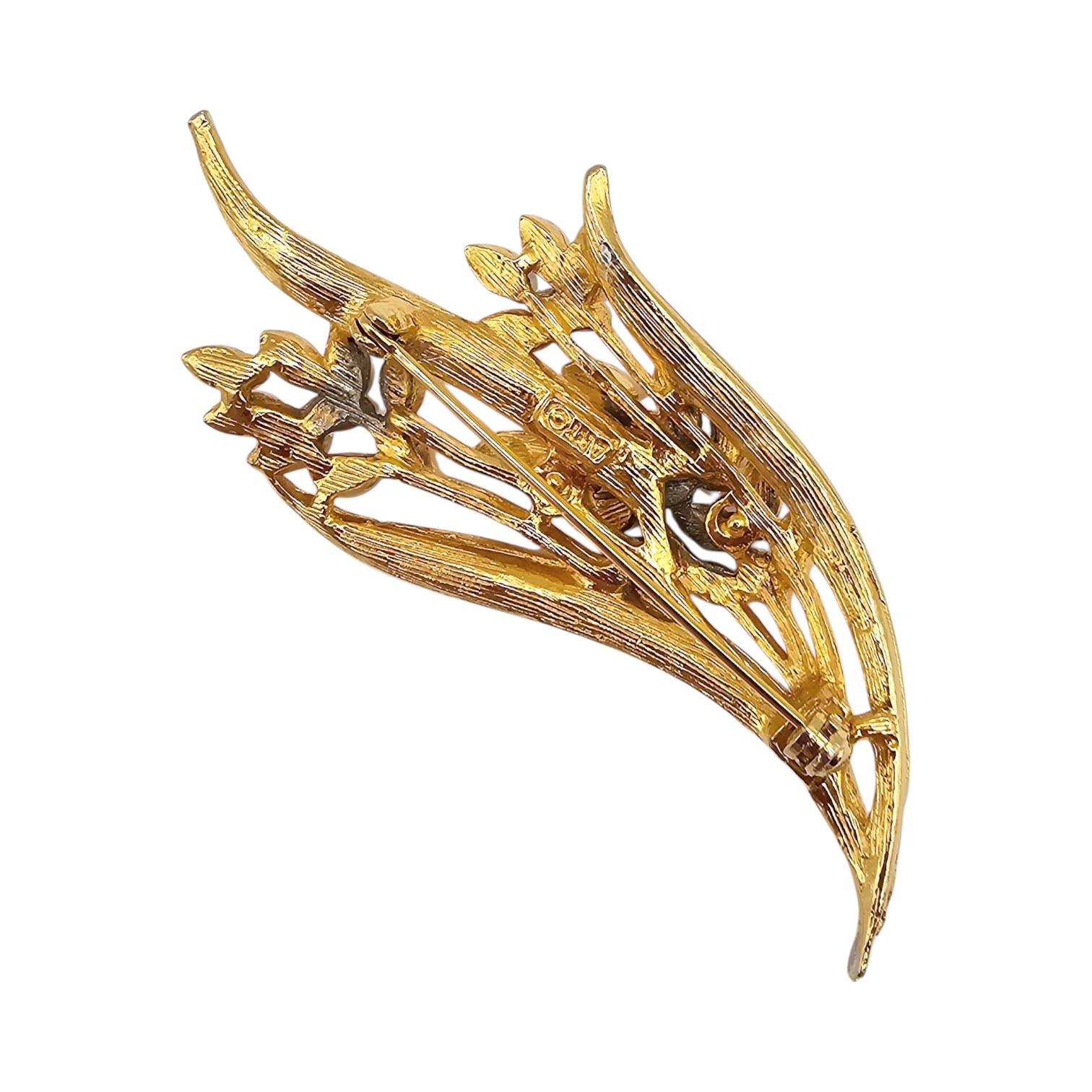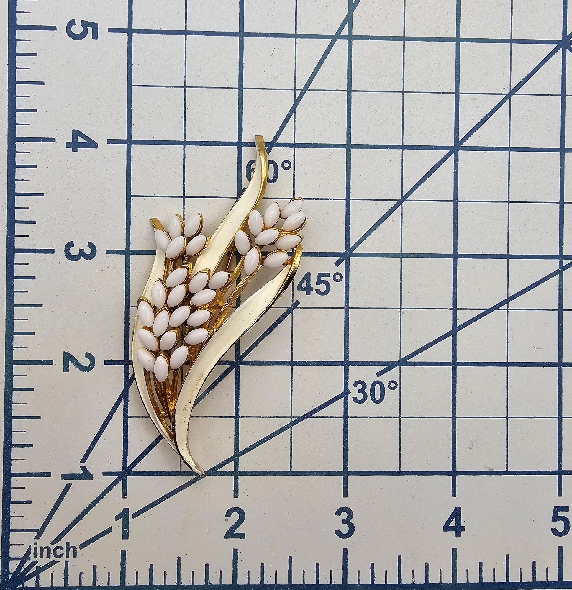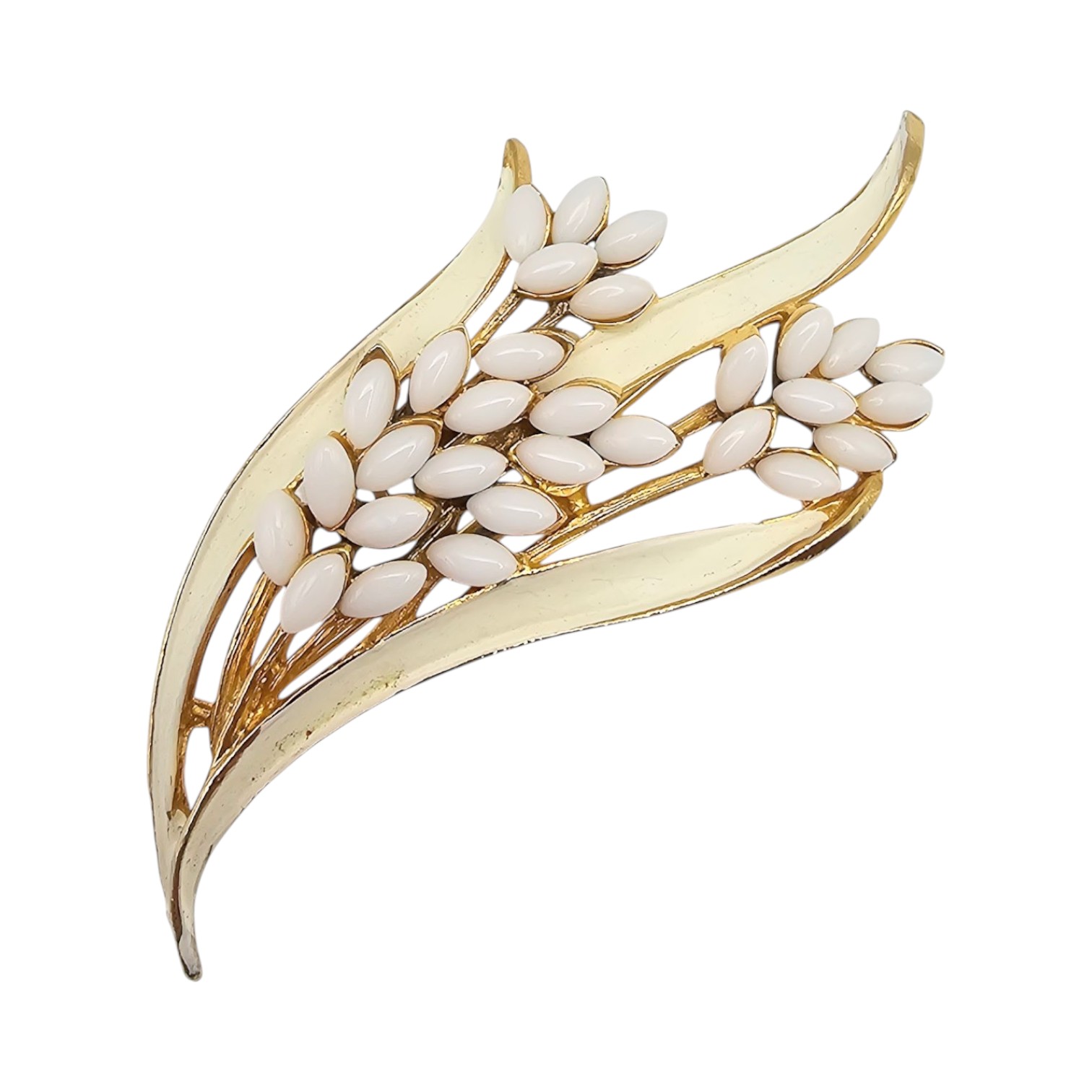 ART Milk Glass White Enamel Gold Tone Floral Spray Brooch