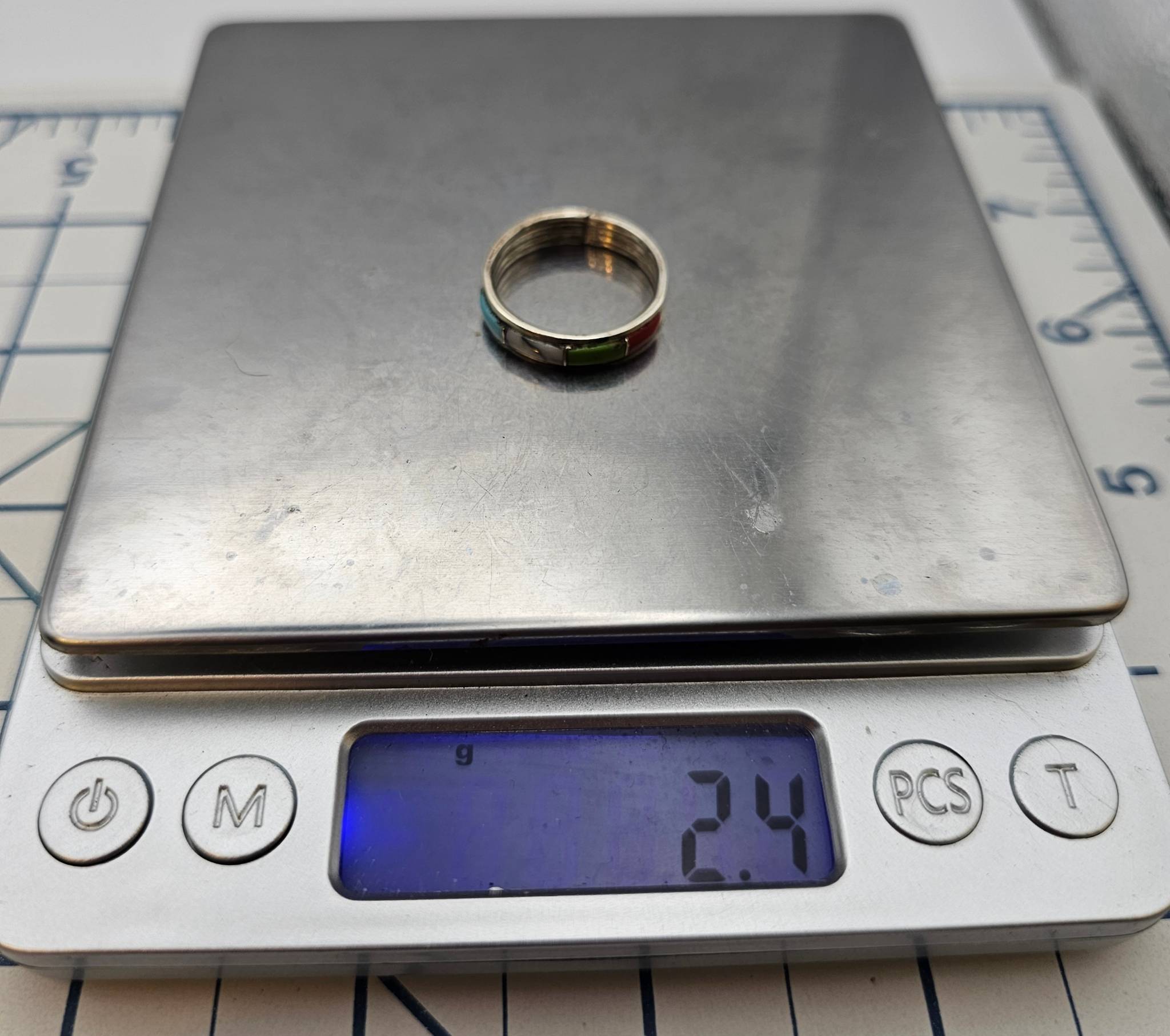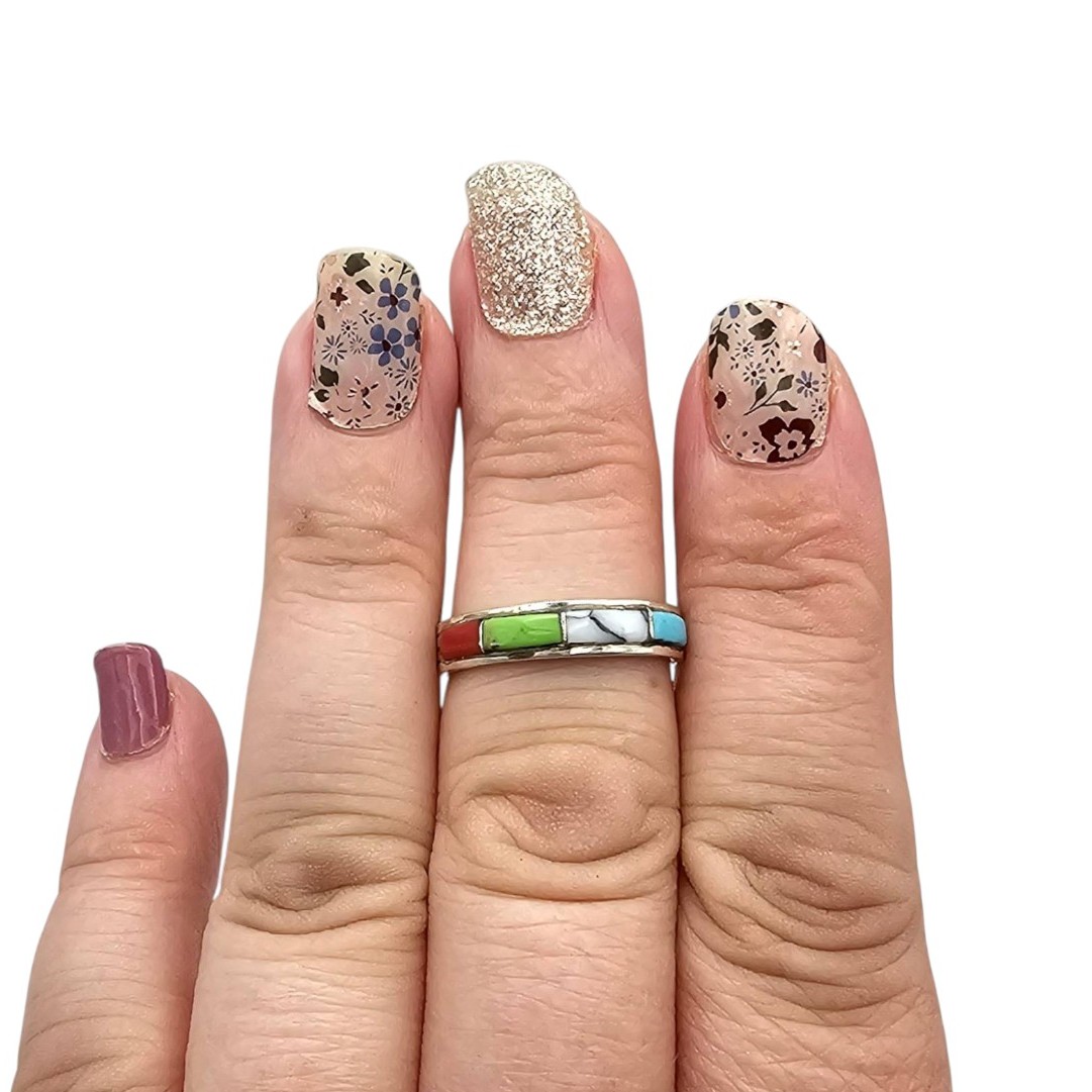 Sterling silver multi-stone ring handmade by Debbie Livingston, a Navajo artisan. Features inlaid sections of turquoise, white, red, and green stones on a smooth silver band. Marked “STERLING” on the interior. Ring size is 7.5 and weight is approximately 2.4 grams.