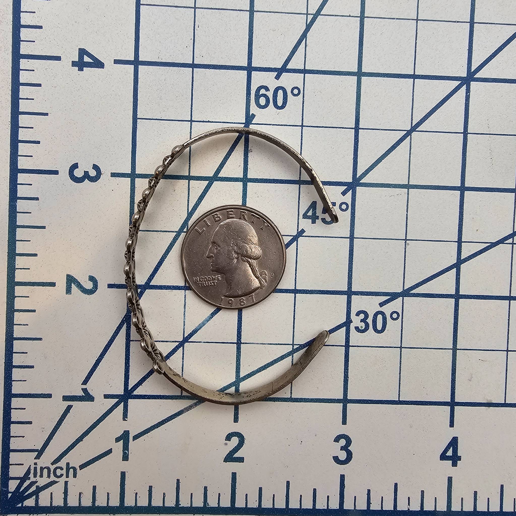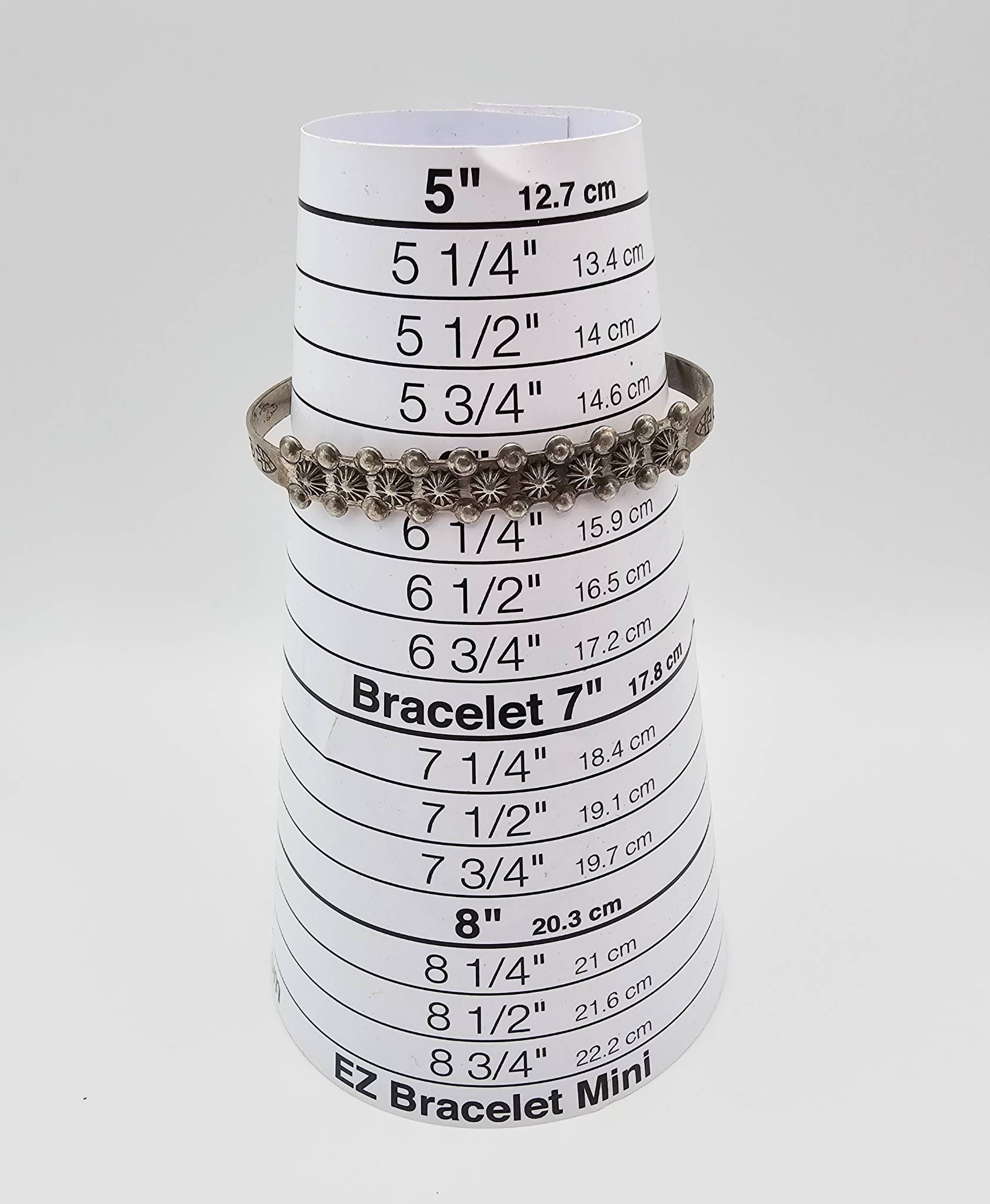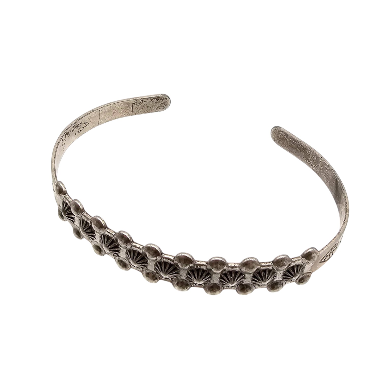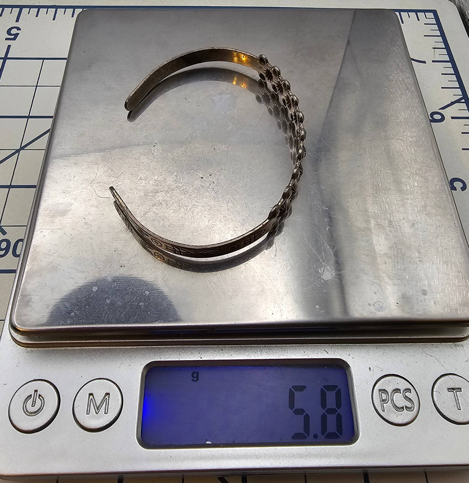 Sterling silver cuff bracelet handmade in a Navajo style, featuring intricate stamped patterns and raised decorative elements. The bracelet is marked as silver and weighs approximately 5.8 grams. Its approximate internal dimension is shown in the accompanying images.