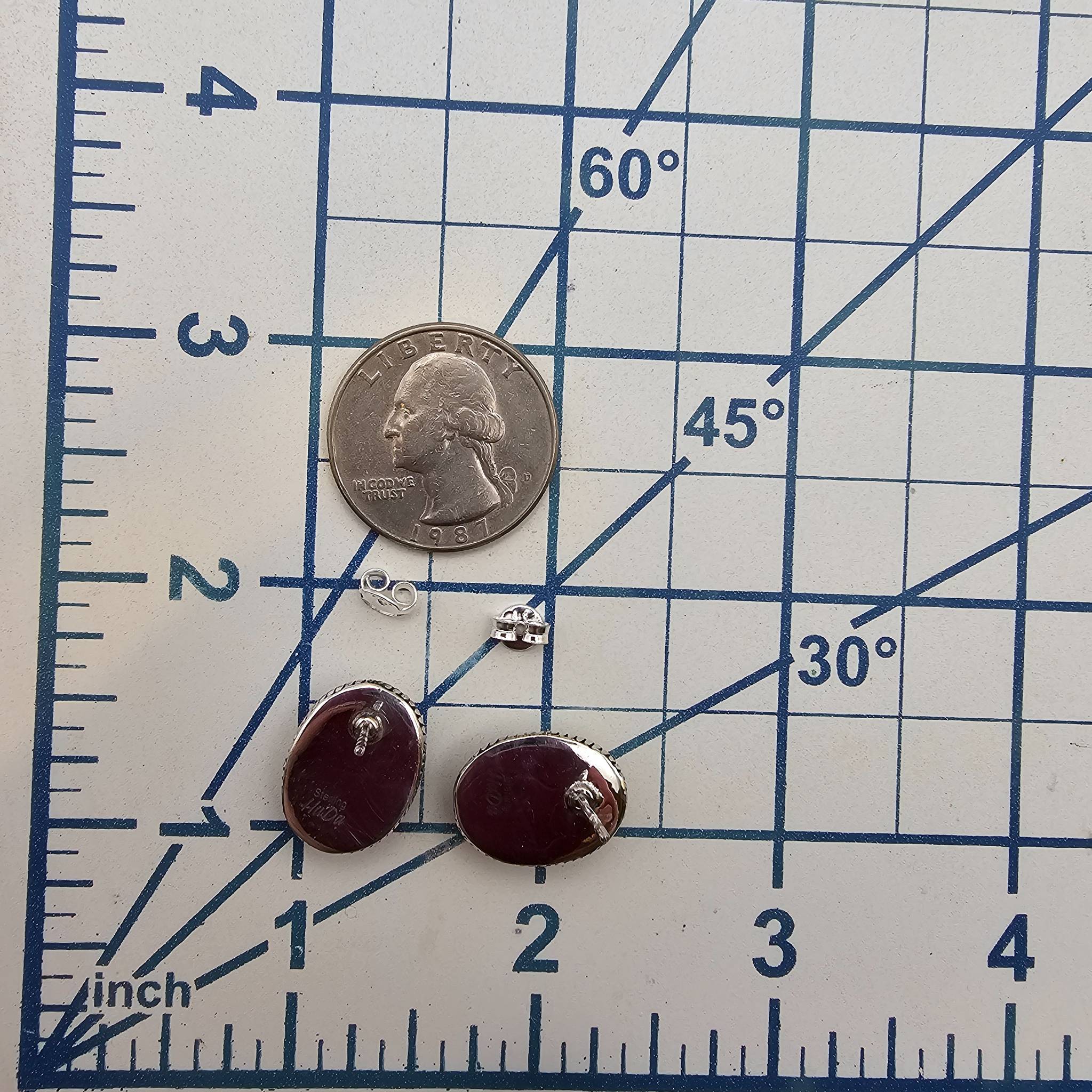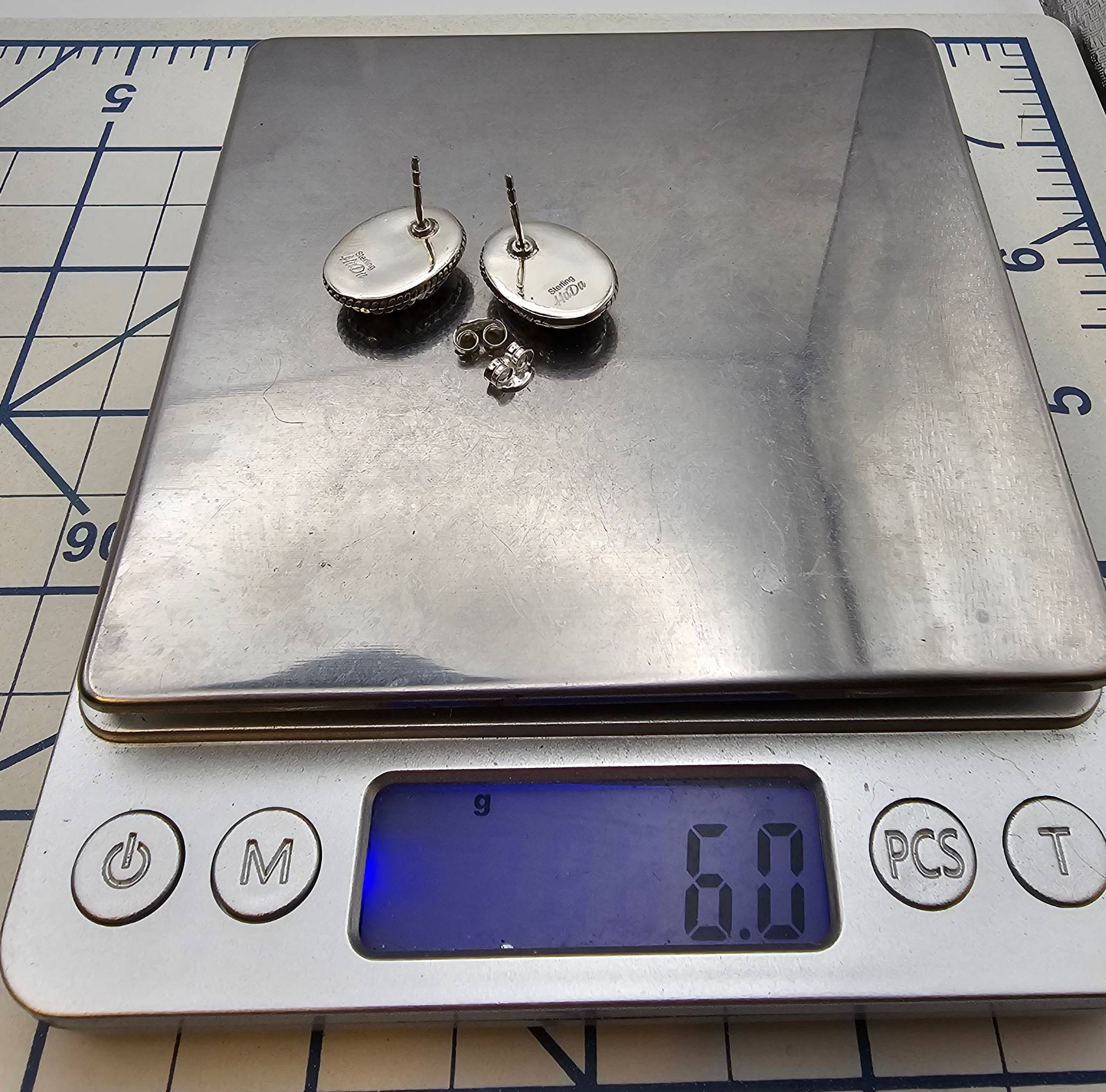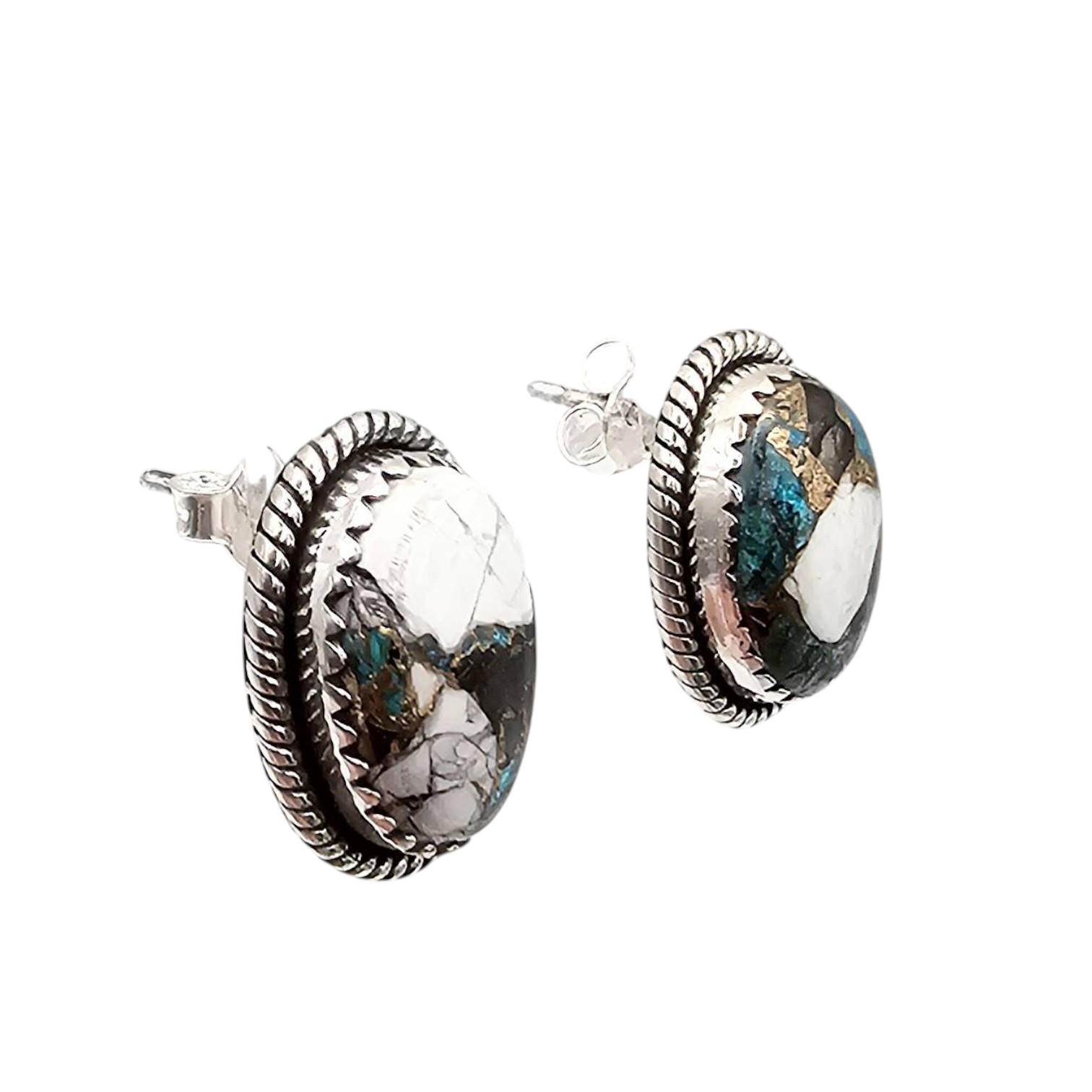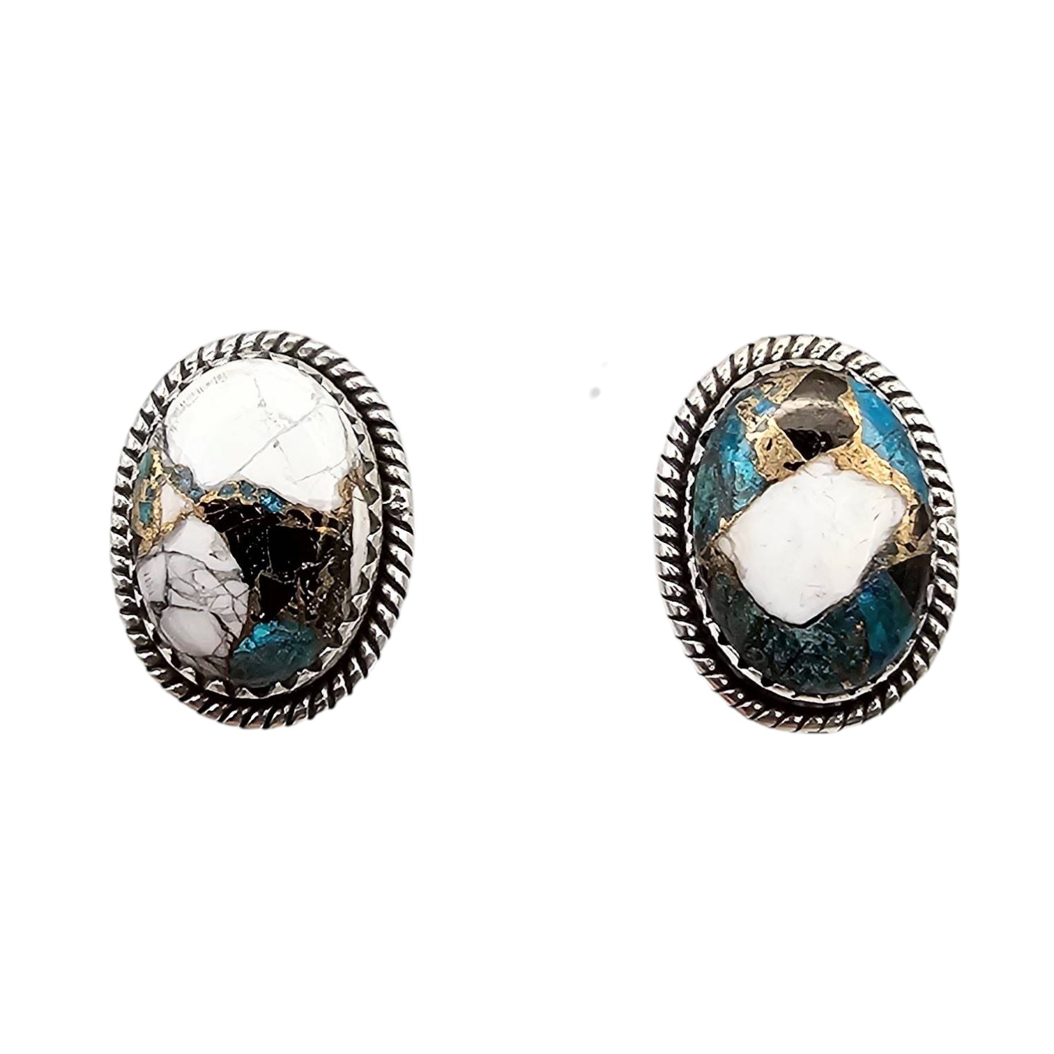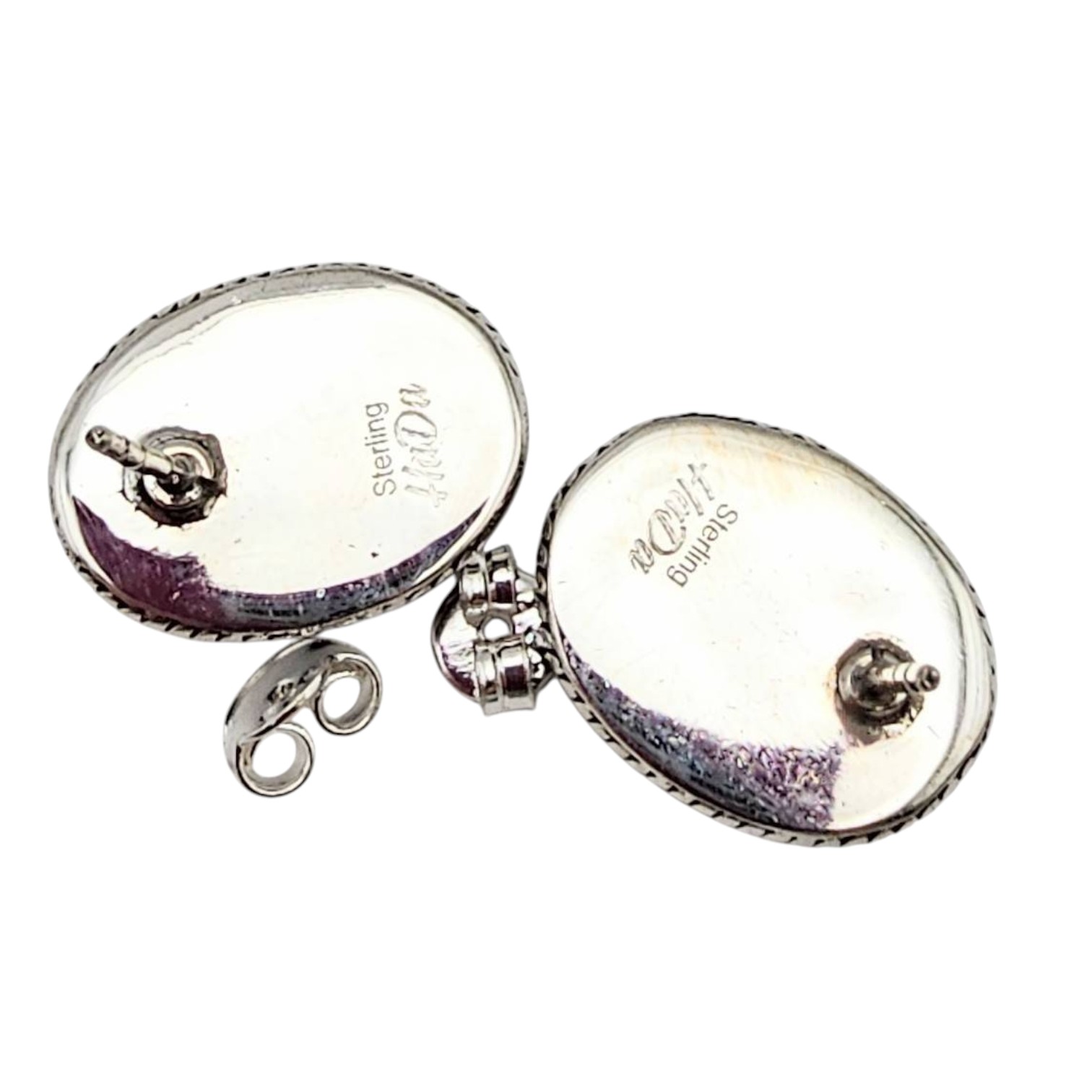 Stud earrings from the Hada Collection, crafted in sterling silver. Featuring white buffalo turquoise stones accented with intricate silver rope detail. Earrings are marked ‘Sterling’ and ‘Hada’. Weighs 6 grams in total. Posts with butterfly backs secure the earrings. Approximate size is just over 1 inch.