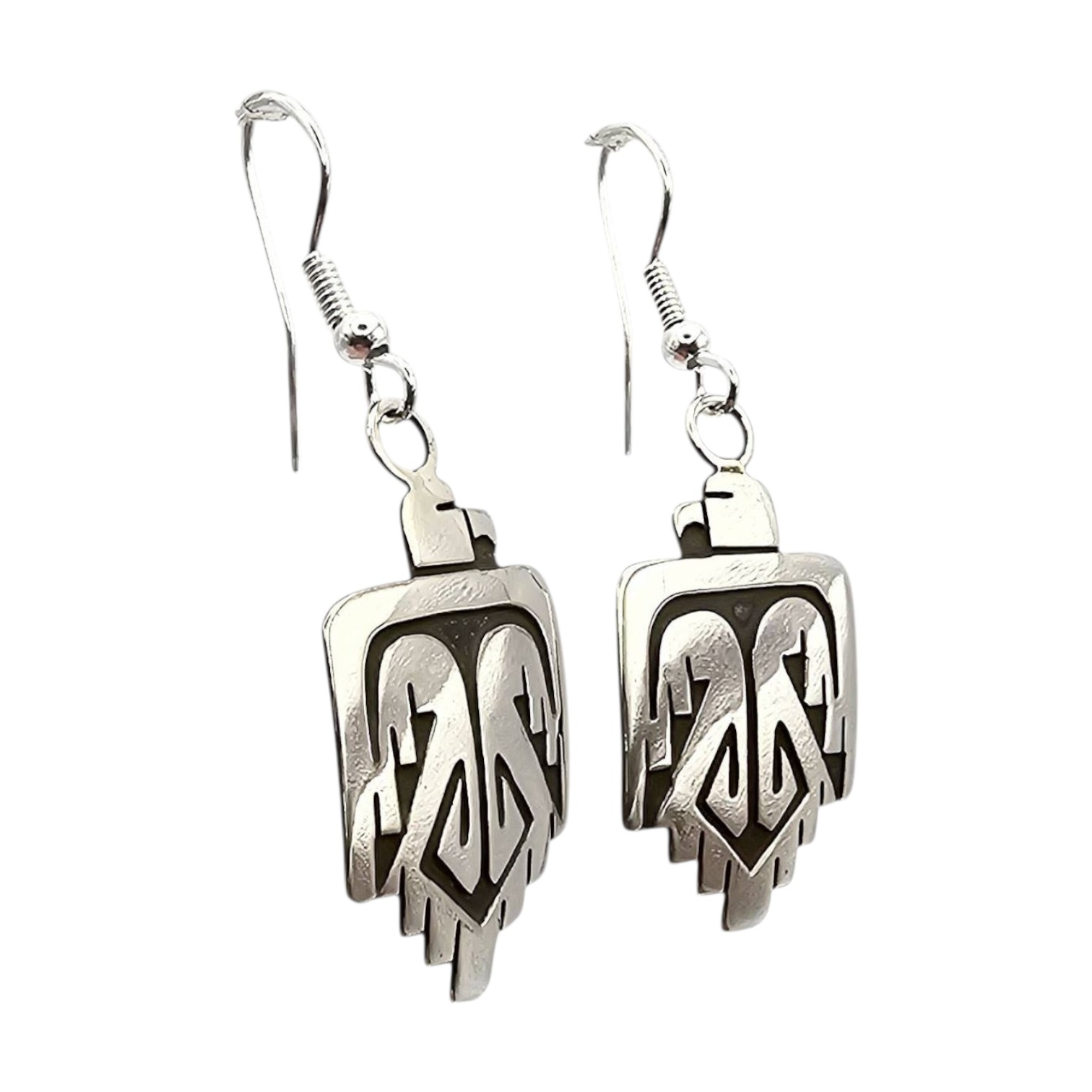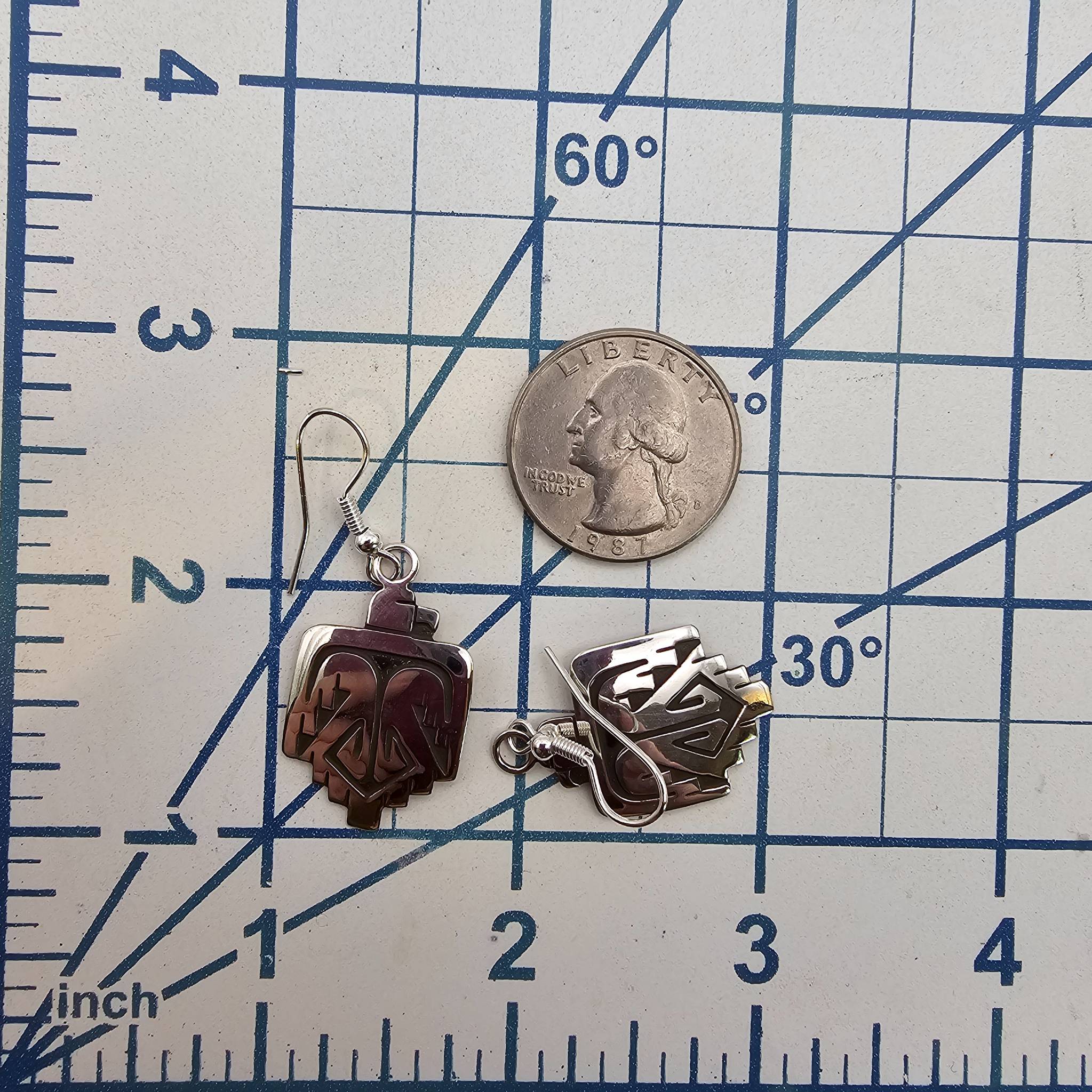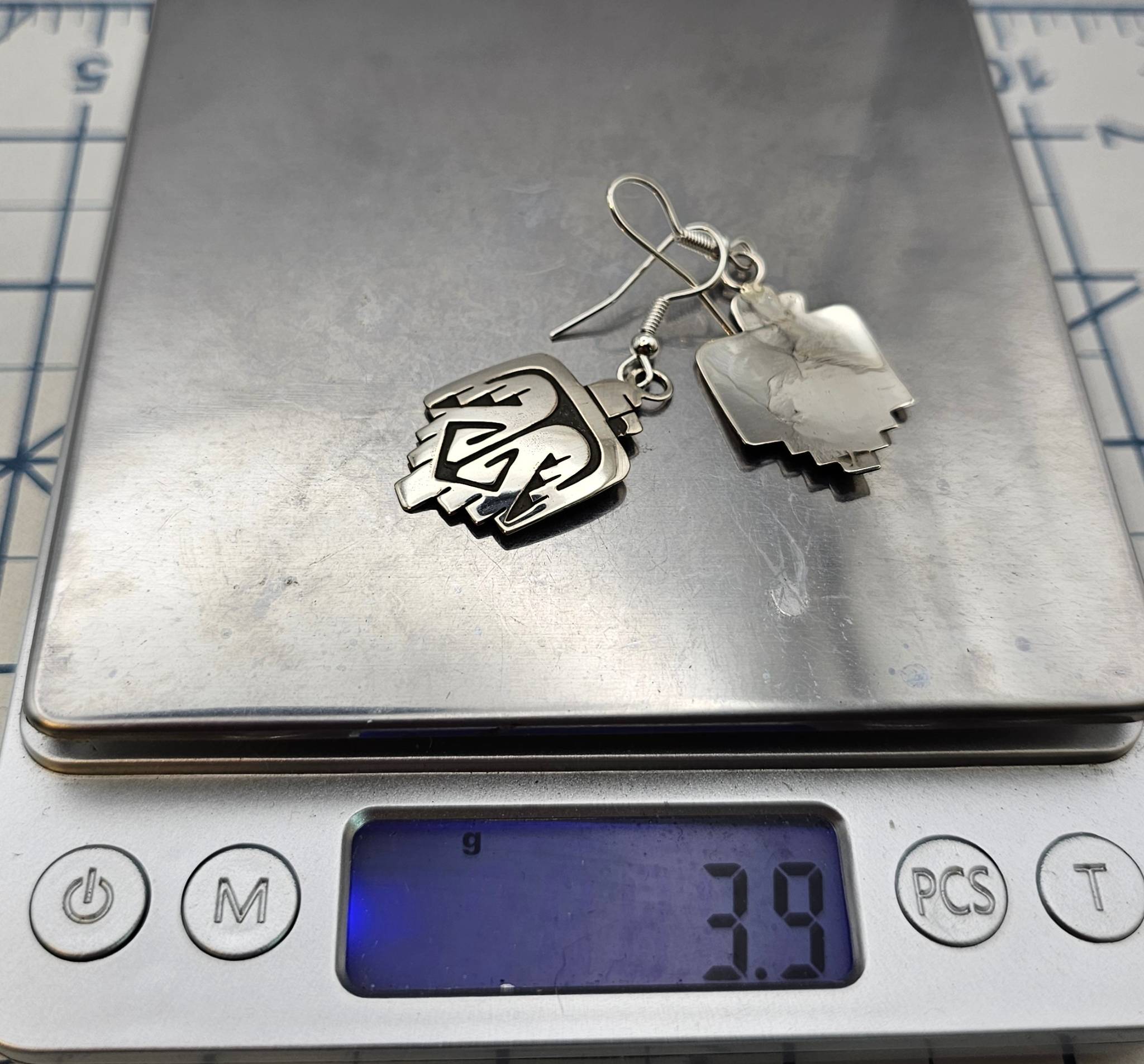 Jerman Dagarito Navajo handmade sterling silver Thunderbird earrings with a geometric and traditional Native American design. The earrings weigh 3.9 grams and feature a hook closure for easy wear. Each measures approximately 1 inch in length without the hook. An impressive example of Navajo craftsmanship.