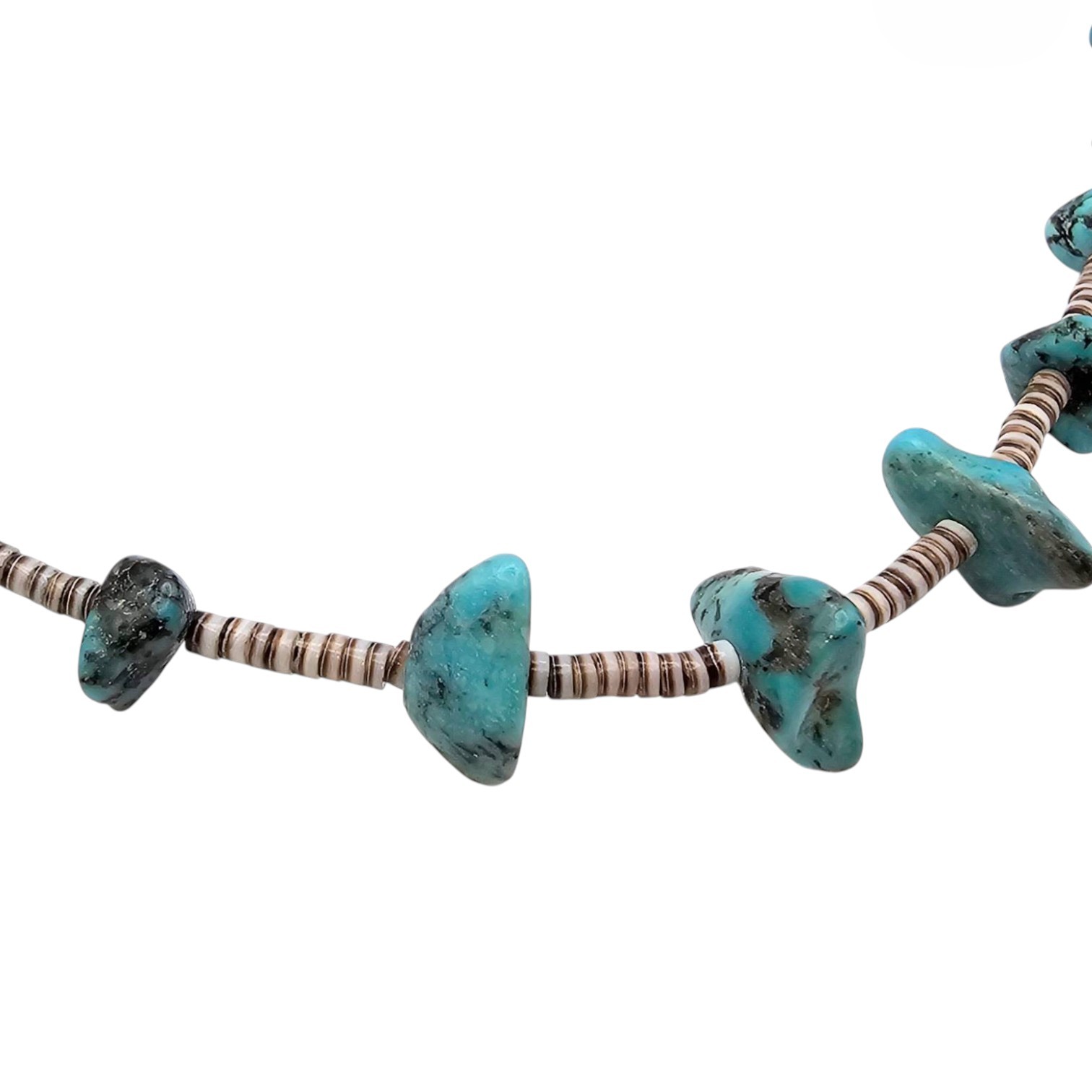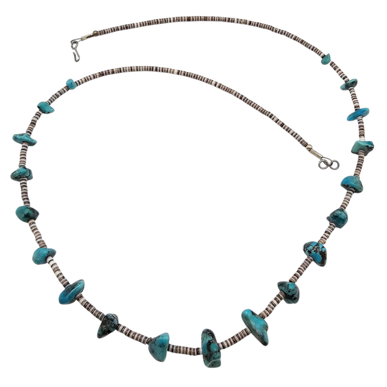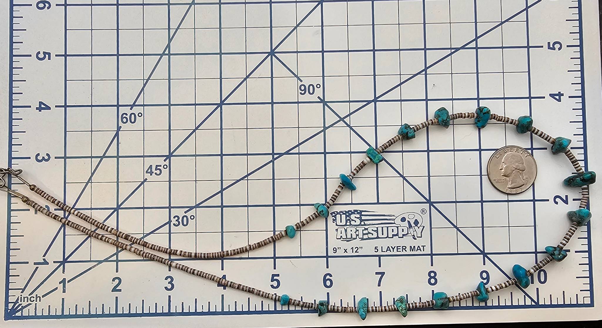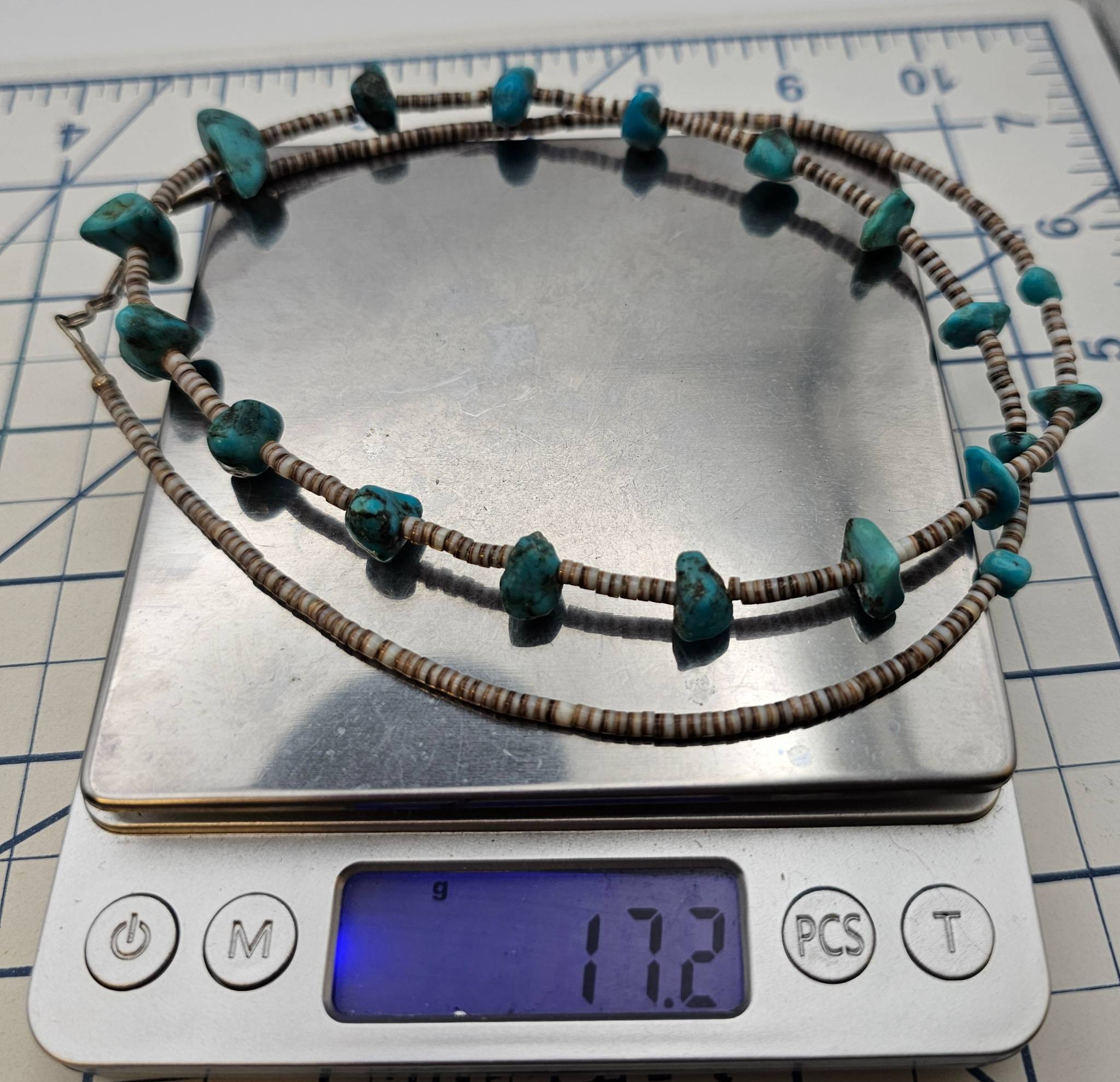 A Native Southwestern necklace featuring turquoise chunks and heishi beads, crafted with sterling silver components. The necklace has a total weight of 17.2 grams and includes a secure clasp. Total length is clearly visible next to a ruler for scale.