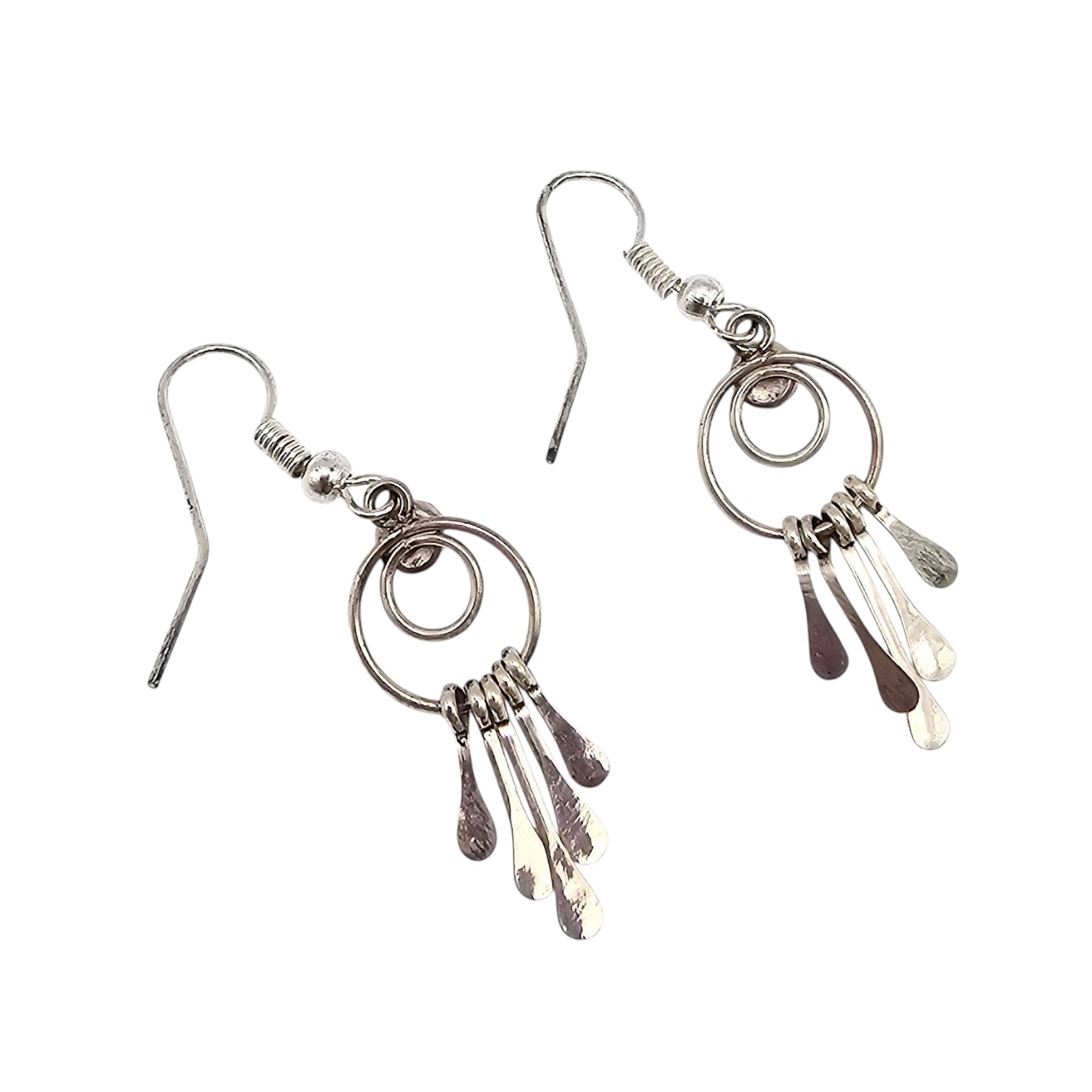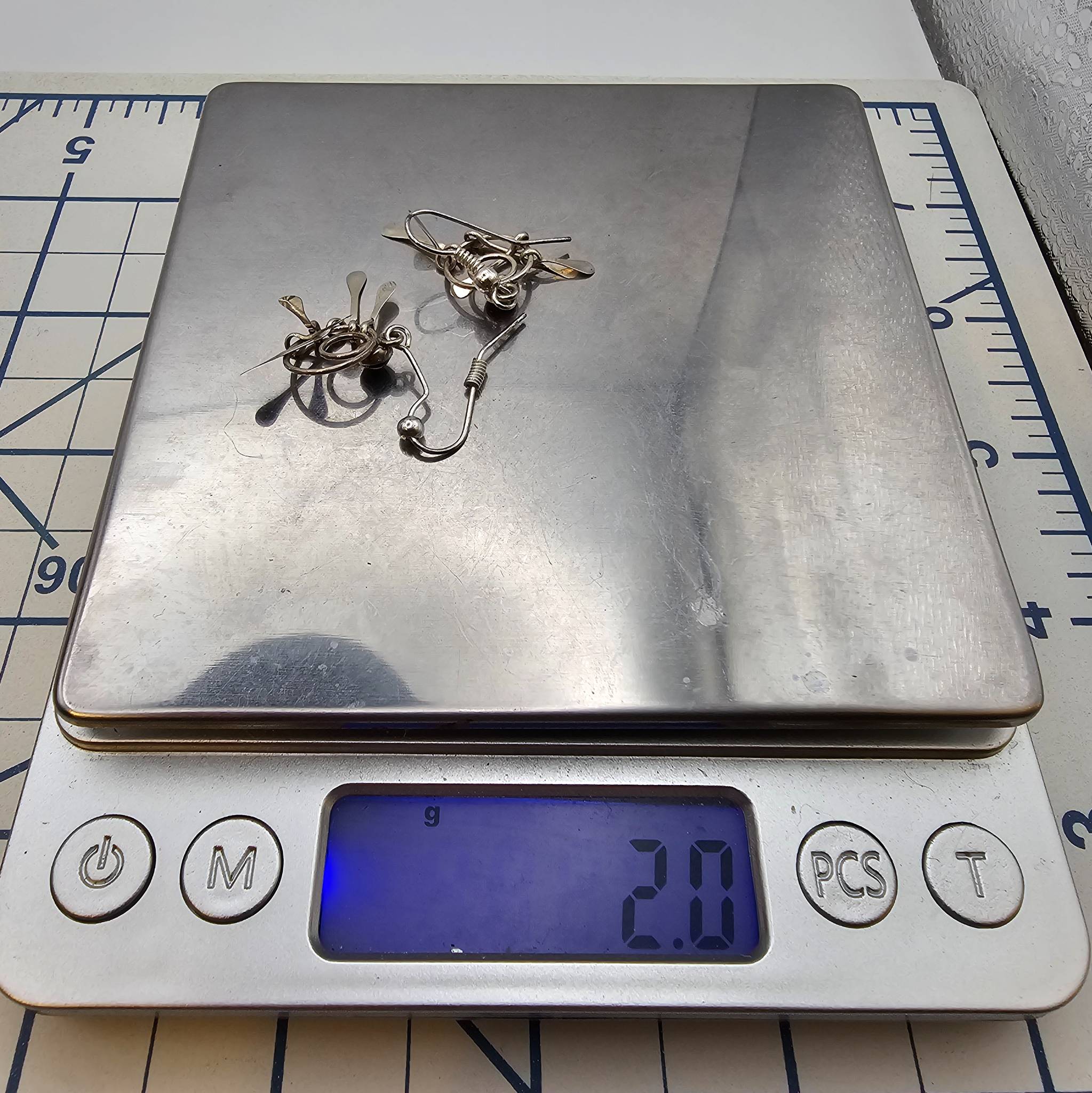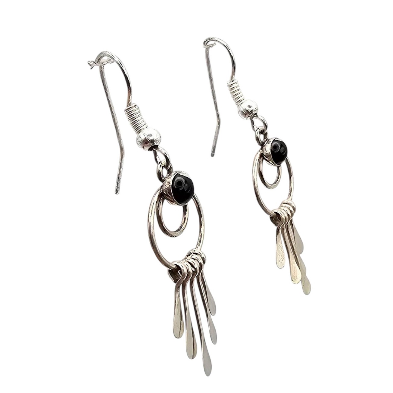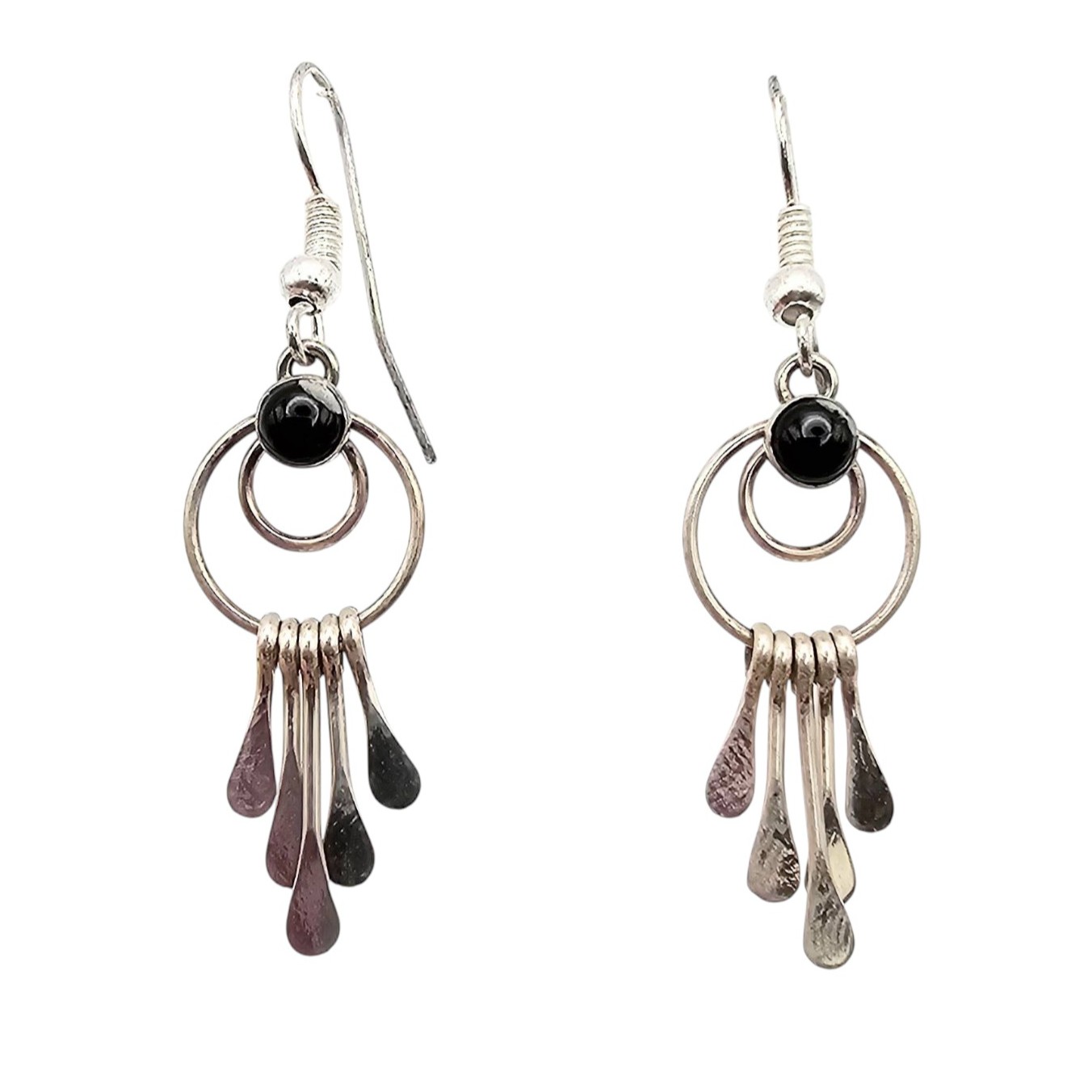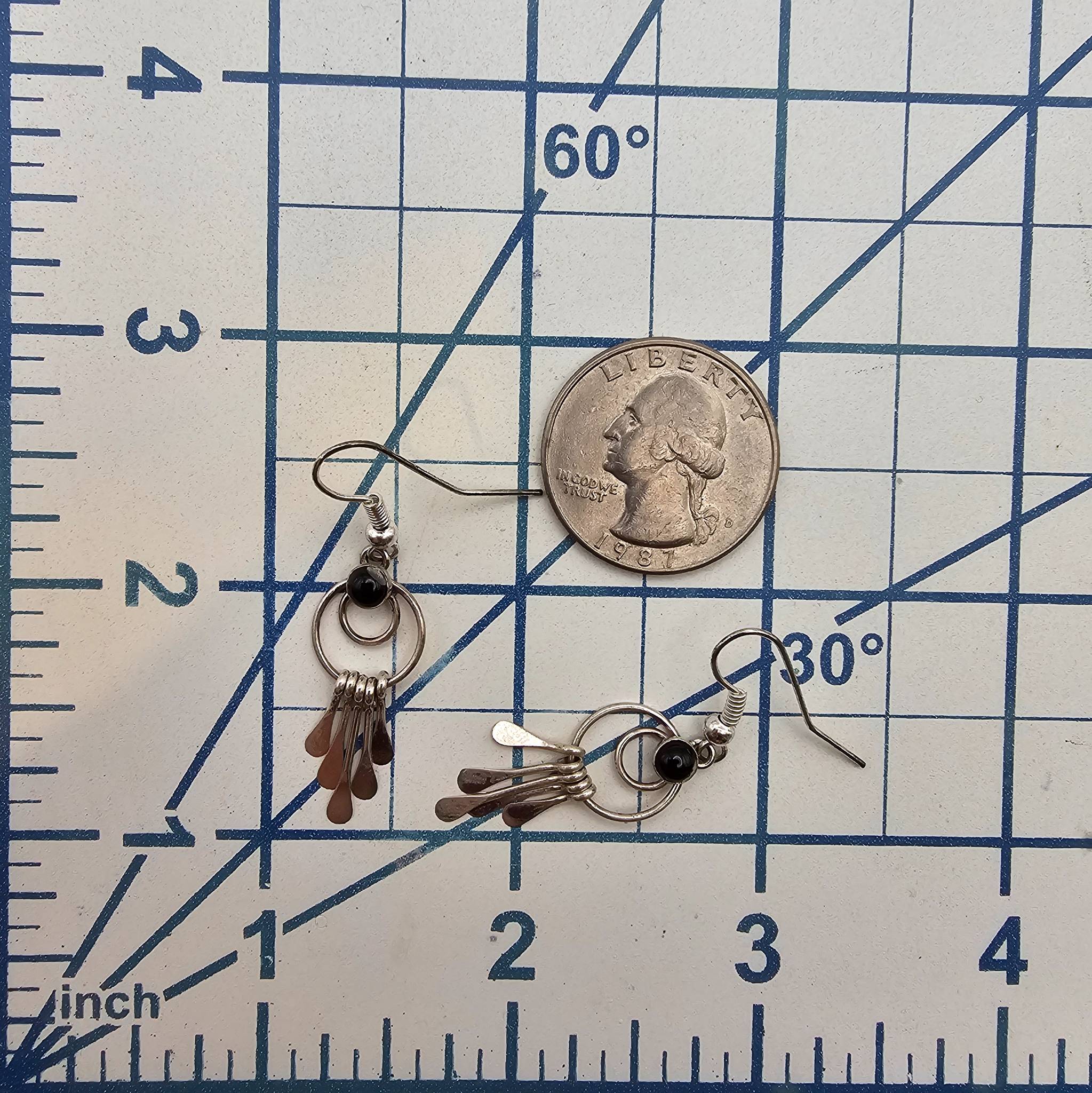 Handmade earrings by Pam Armstrong crafted with sterling silver and featuring black onyx accents. The earrings feature a circular design with cascading dangle elements and measure approximately 2 inches in length. They weigh 2 grams together, as shown on the scale.