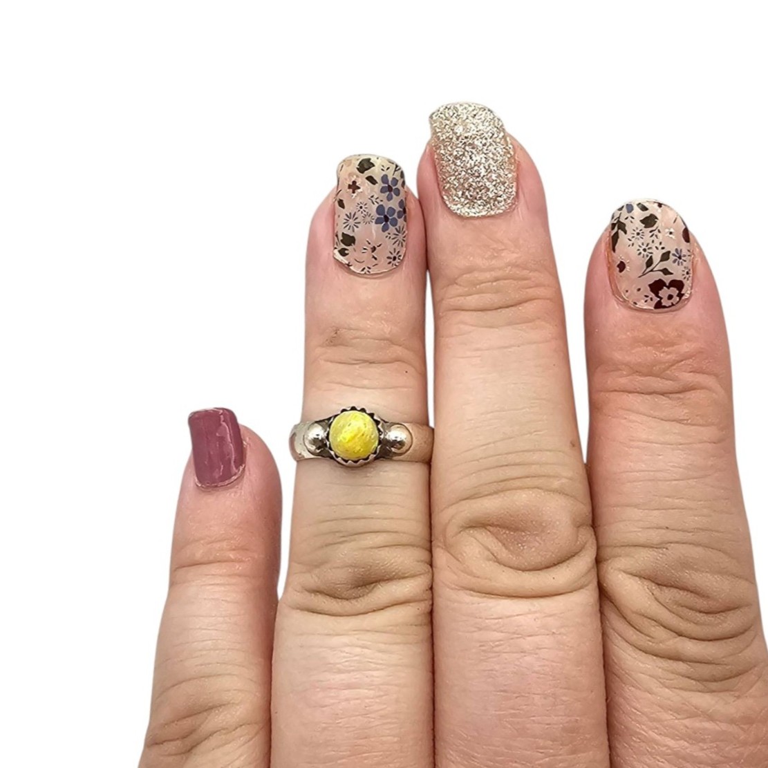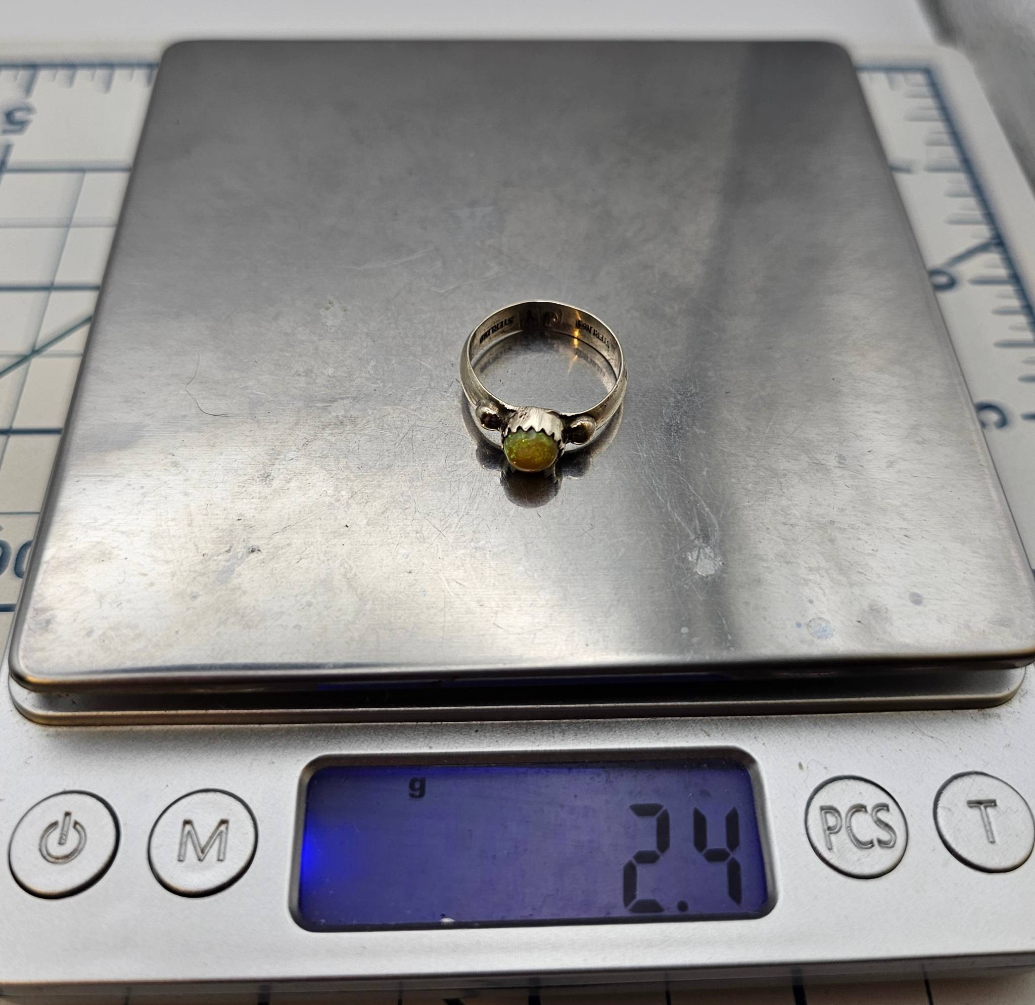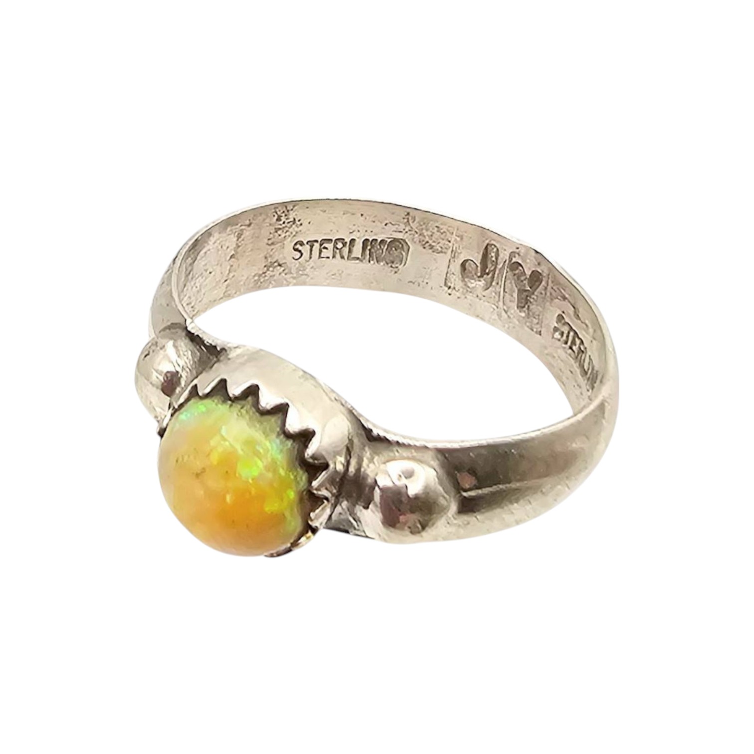 A handmade sterling silver ring by Navajo artisan Jason Yazzie featuring a central opal cabochon with a fiery yellow hue. The ring is size 6 and weighs approximately 2.4 grams.