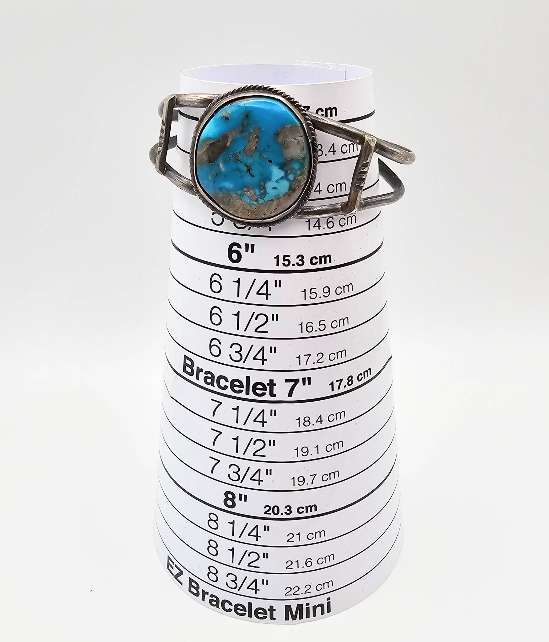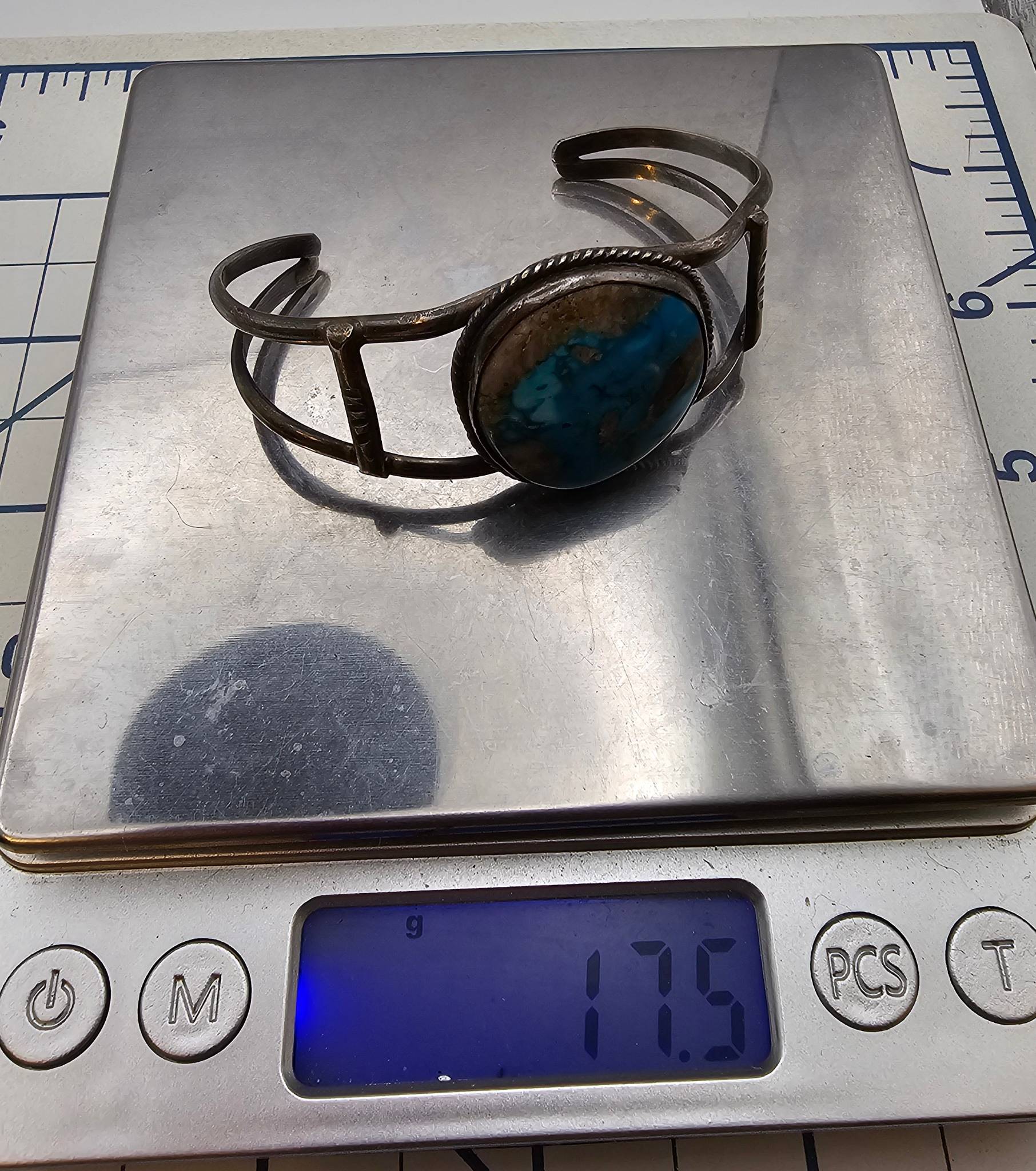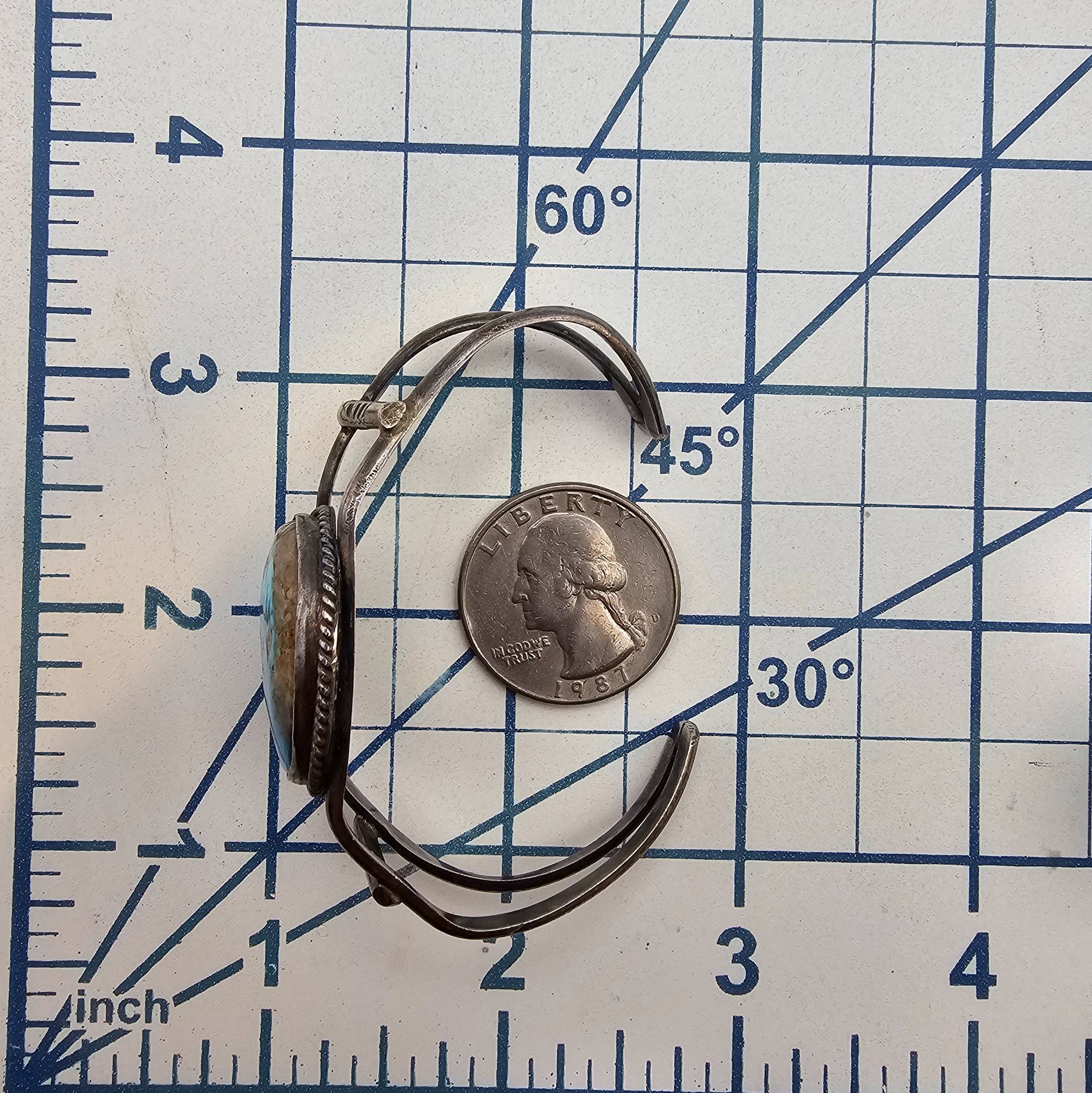 Navajo sterling silver cuff bracelet featuring a turquoise stone centerpiece. it weighs 17.5 grams. The design includes a double-band structure with a bezel-set turquoise stone surrounded by twisted detailing. The bracelet’s dimensions are shown on a grid and next to a quarter for scale.