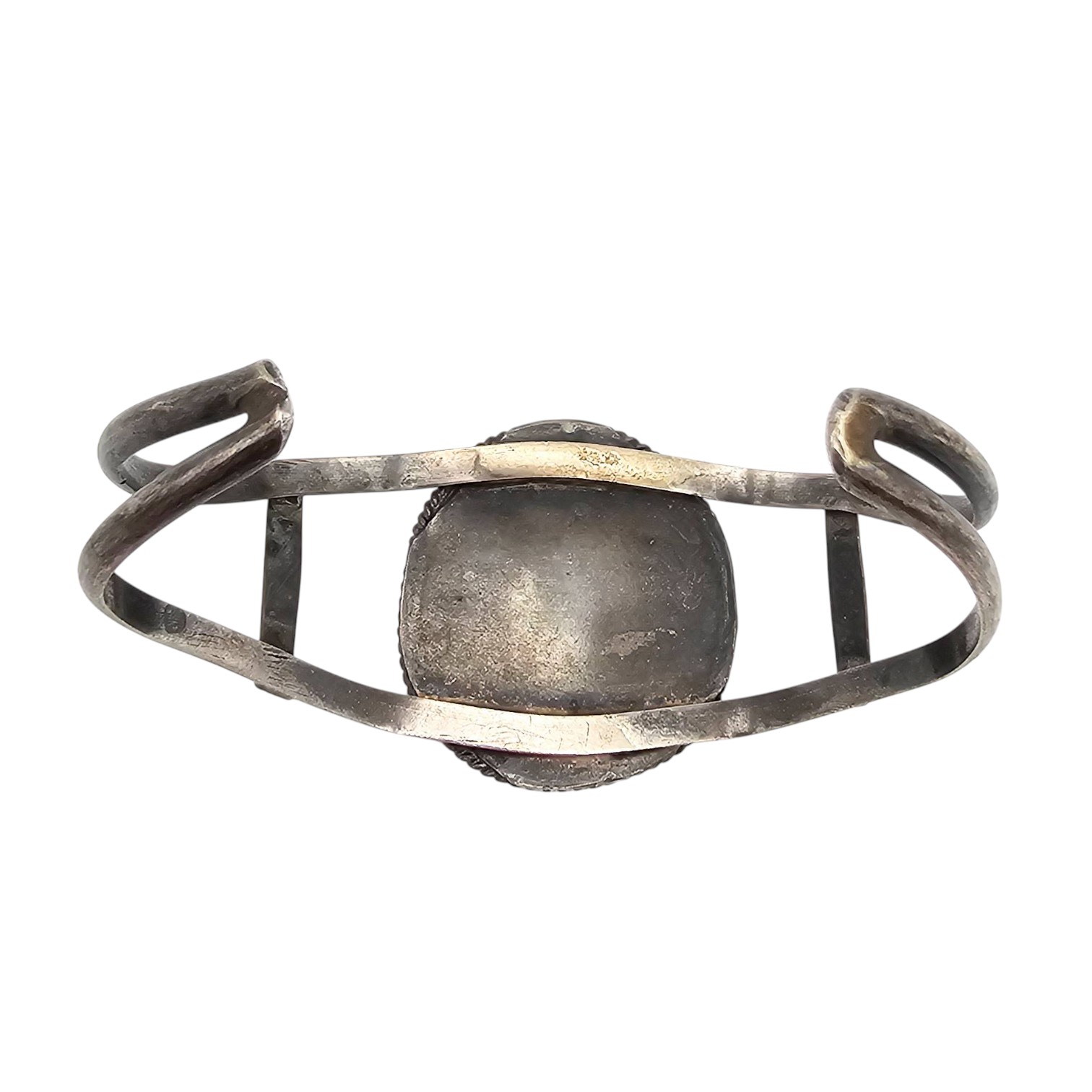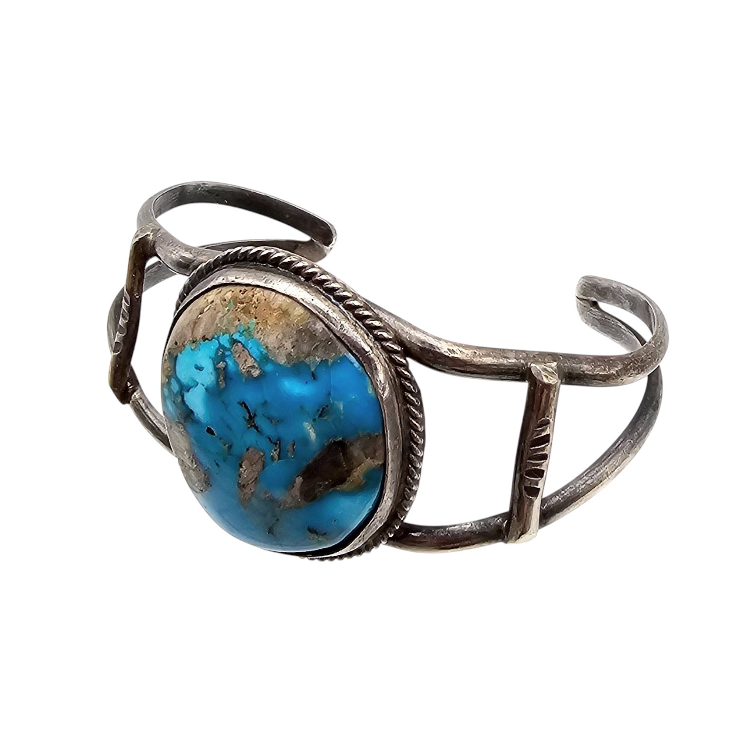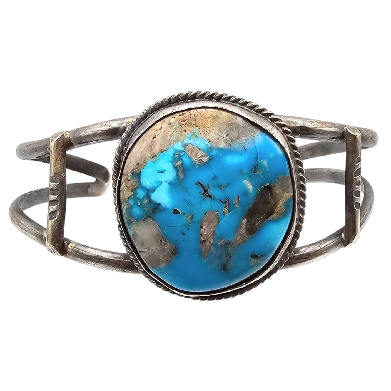 Navajo sterling silver cuff bracelet featuring a turquoise stone centerpiece. it weighs 17.5 grams. The design includes a double-band structure with a bezel-set turquoise stone surrounded by twisted detailing. The bracelet’s dimensions are shown on a grid and next to a quarter for scale.
