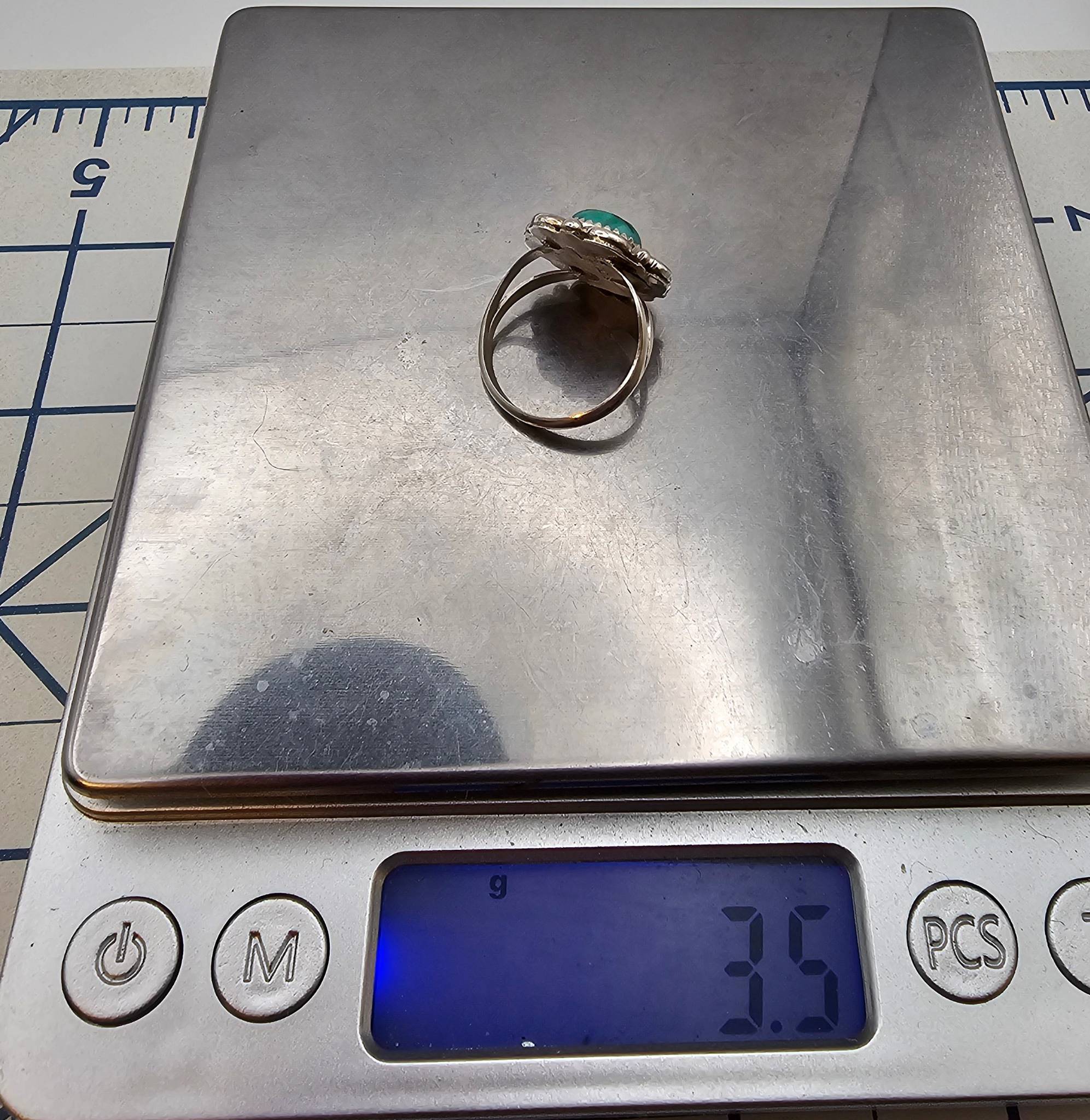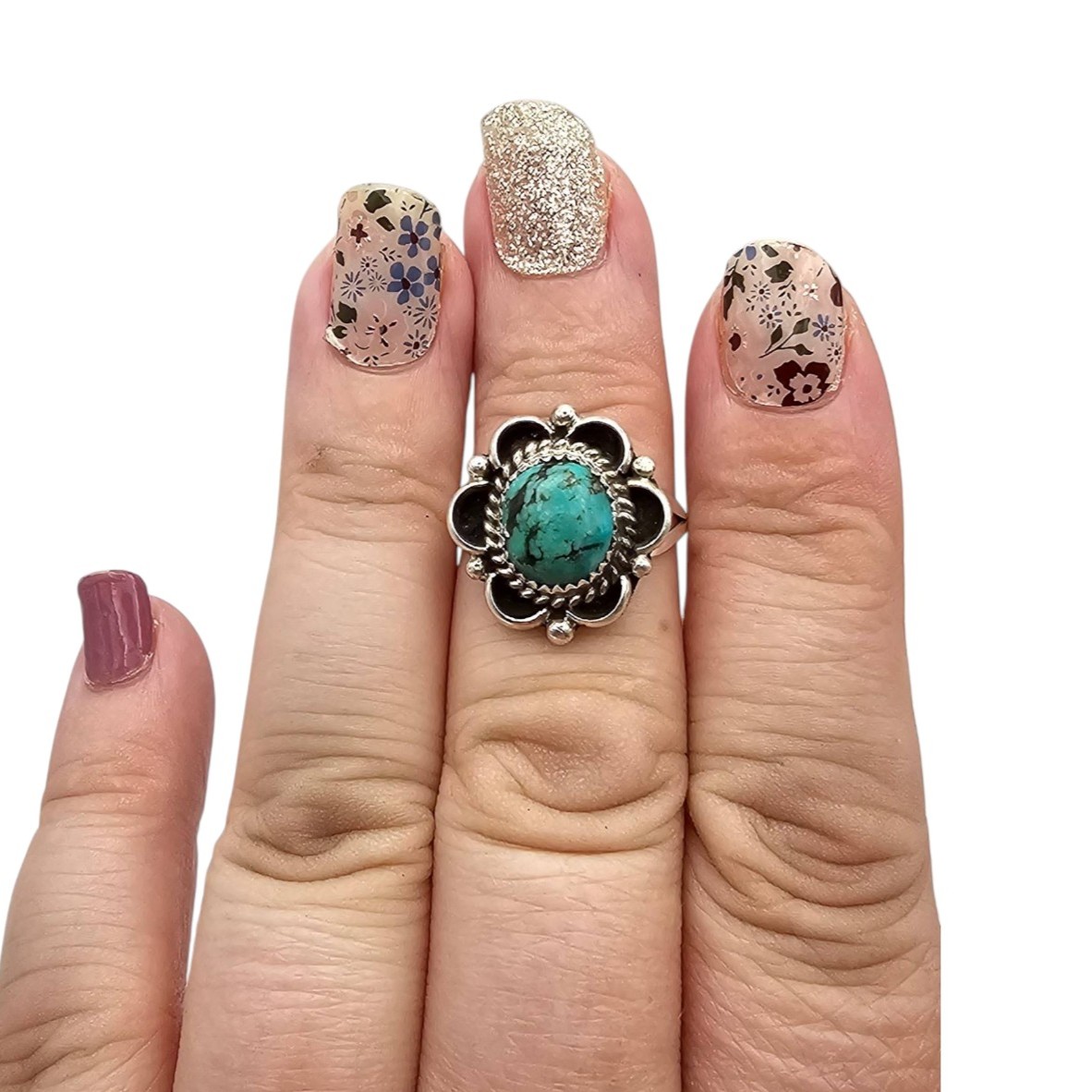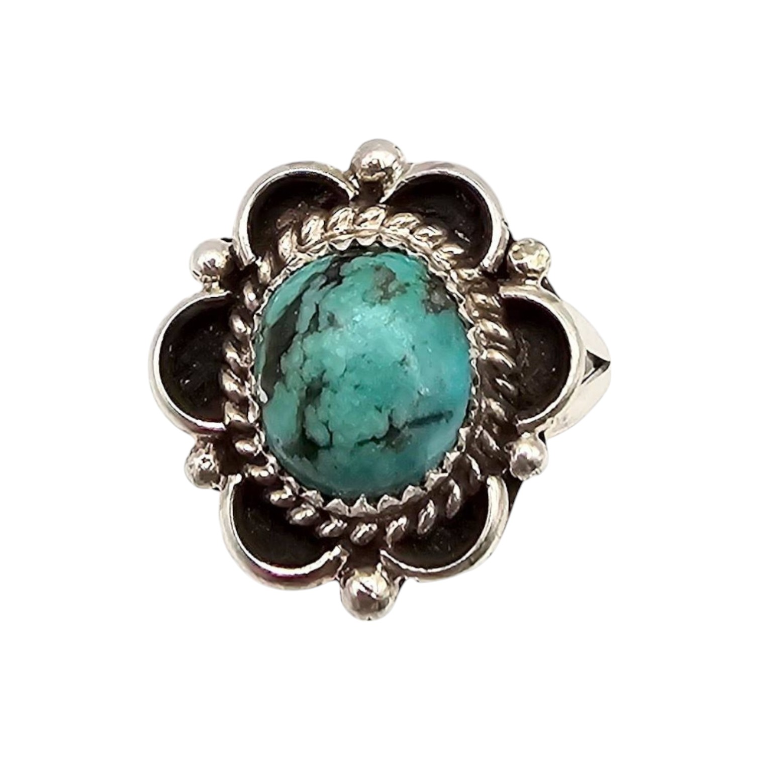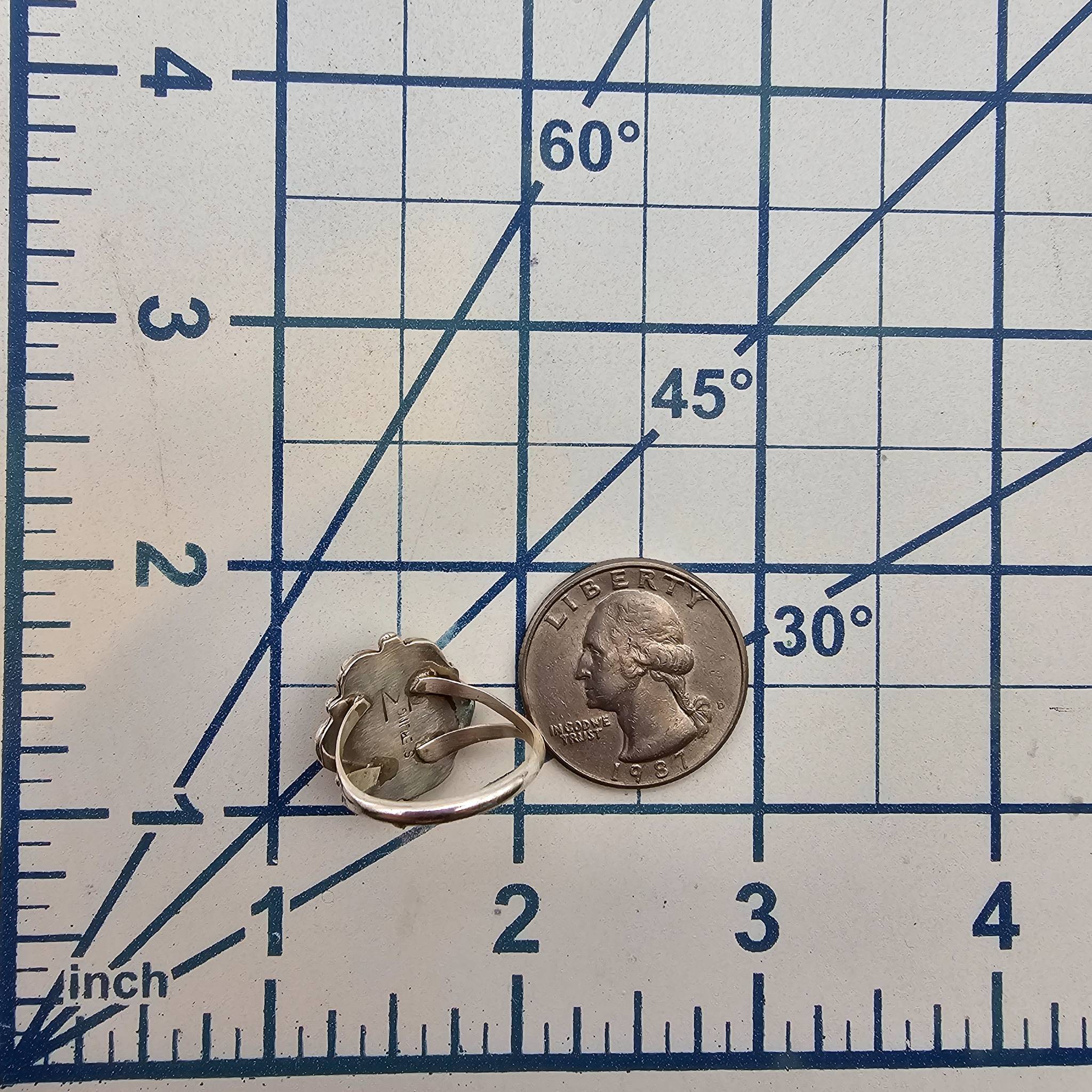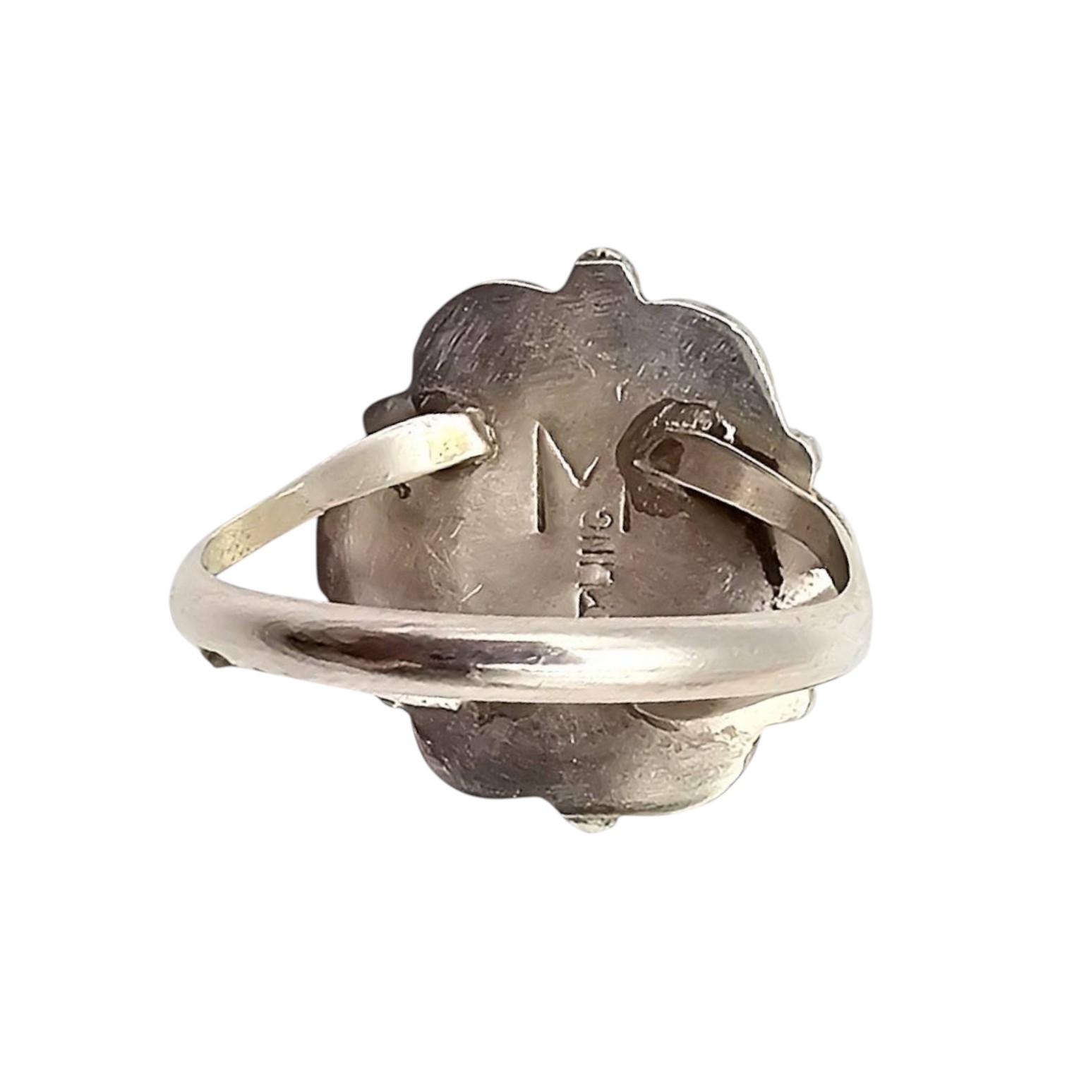 Handmade by Navajo artisan Freda Martinez, this sterling silver ring features an oval Kingman turquoise centerpiece. The intricate silverwork accents the vibrant turquoise stone. Ring size is 7 with a weight of approximately 3.5 grams.