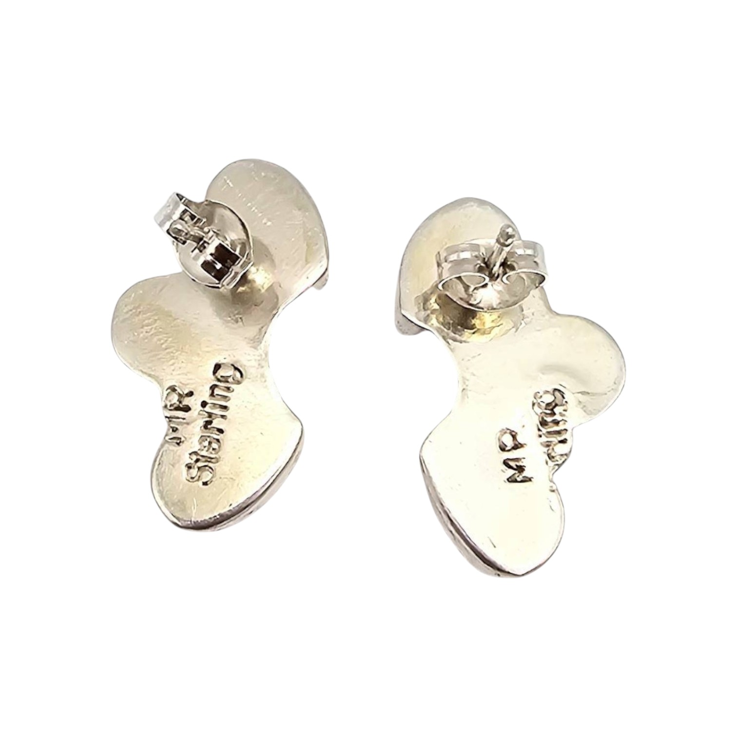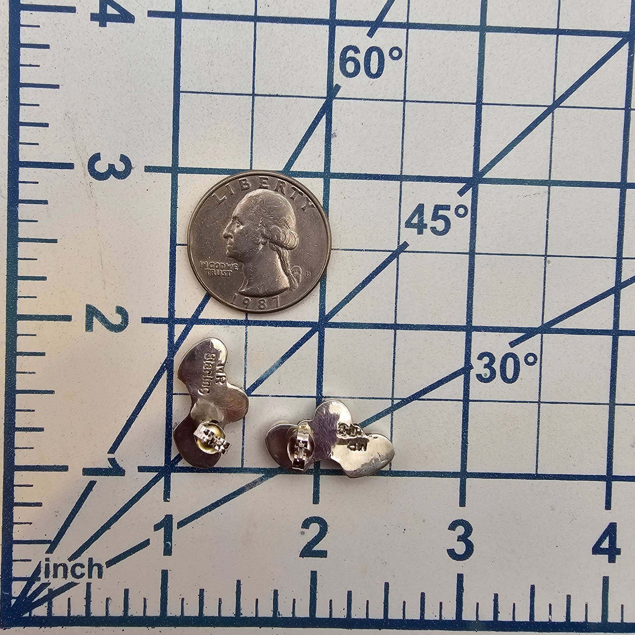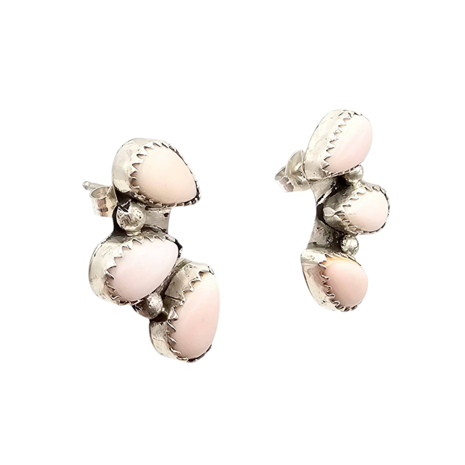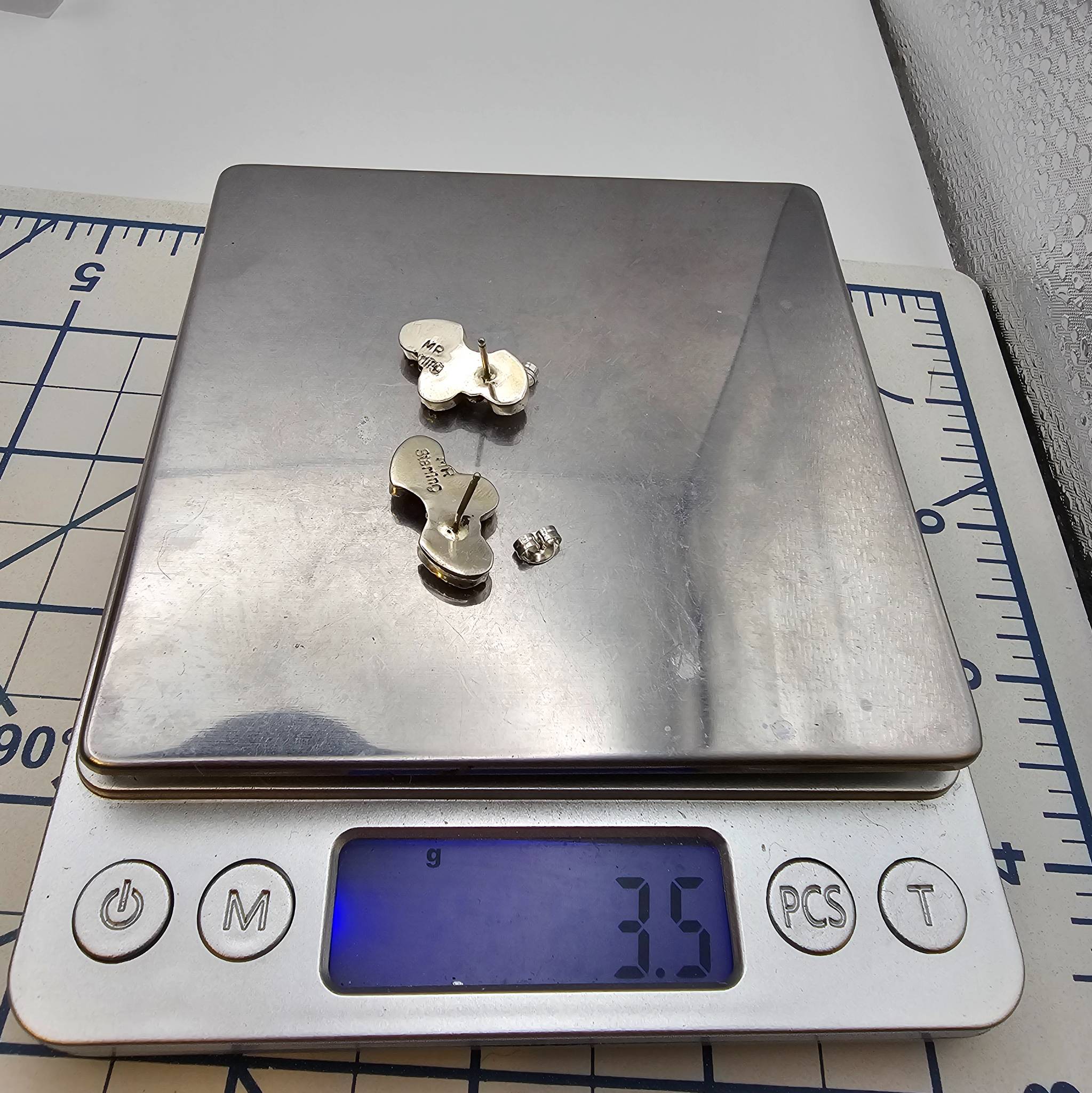 Handcrafted sterling silver (SS) earrings by Maxine Ramirez, featuring three pink conch-shaped stones set in a unique, traditional Navajo design. Each earring is marked with the artist’s signature. The combined weight of the earrings is 3.5 grams as shown on the scale. The size of the earrings is displayed alongside a coin for scale reference.