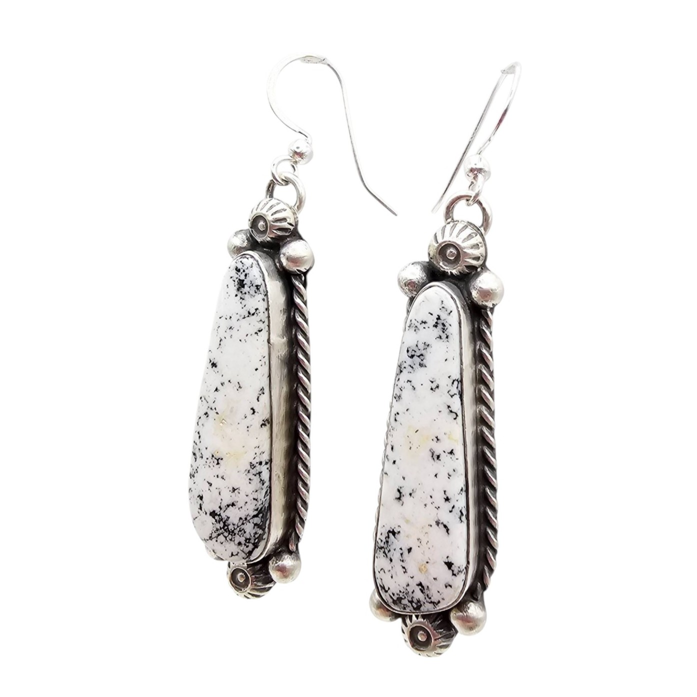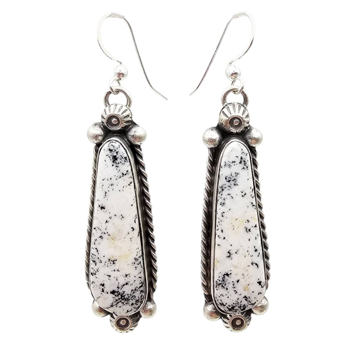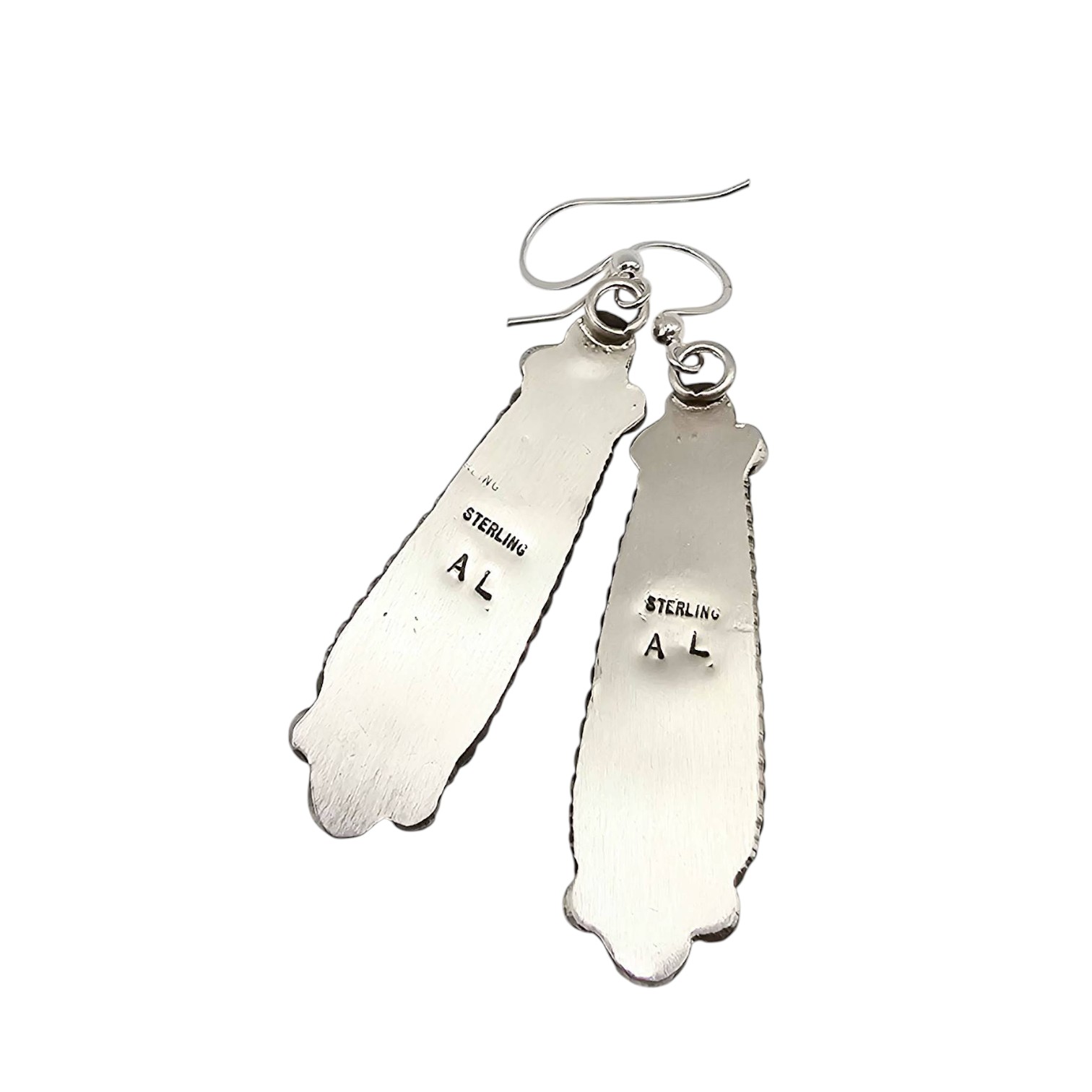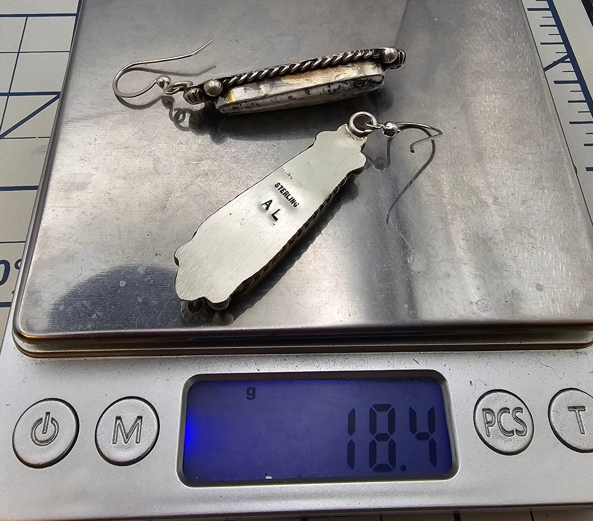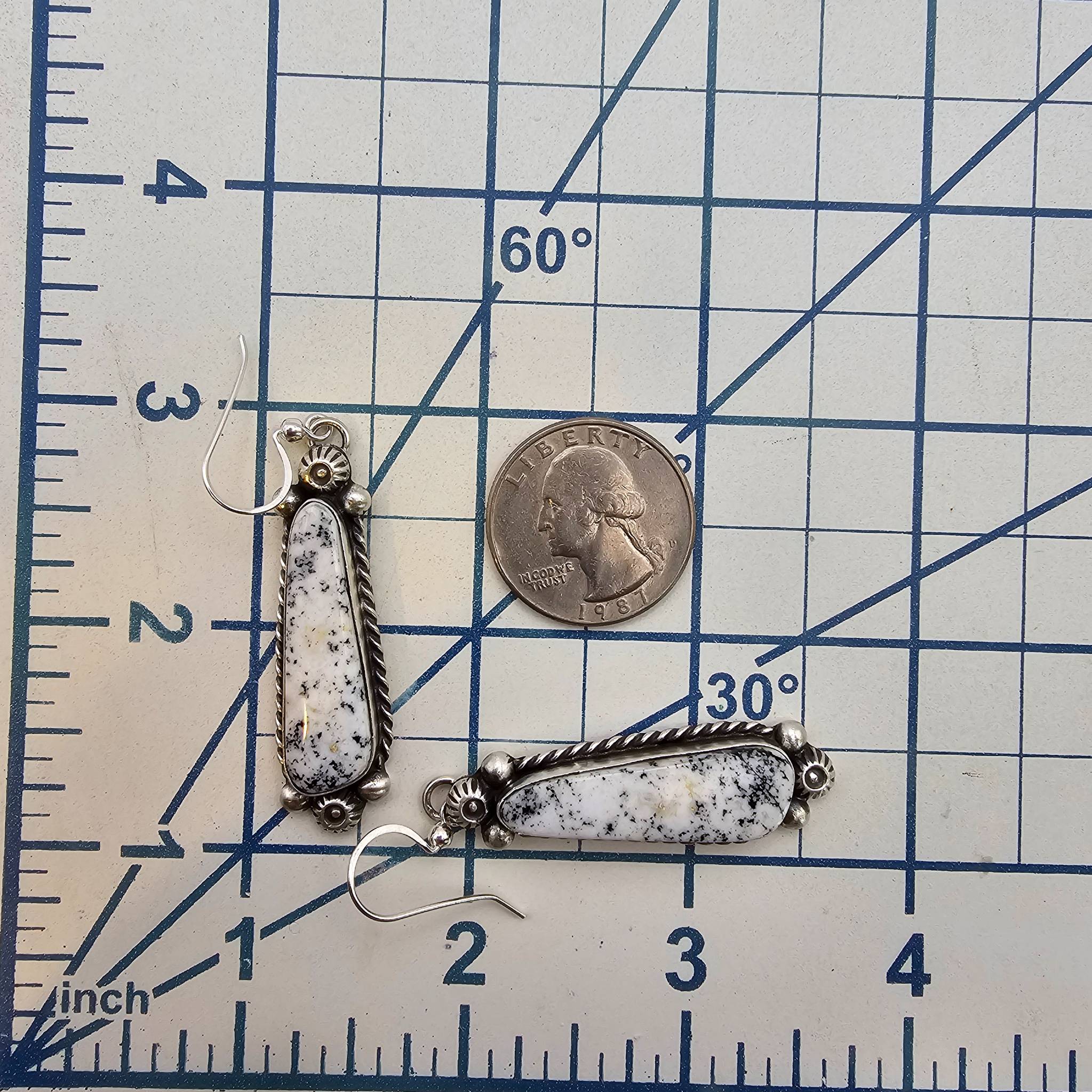 Navajo handmade earrings by Augustine Largo featuring White Buffalo Turquoise stones set in sterling silver (marked ‘STERLING’ and stamped ‘AL’). Total weight is 18.4 grams. Approximate dimensions shown with a quarter for scale.