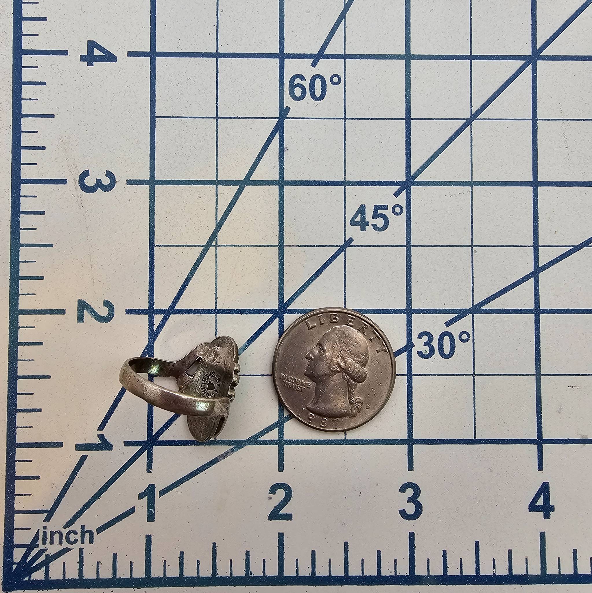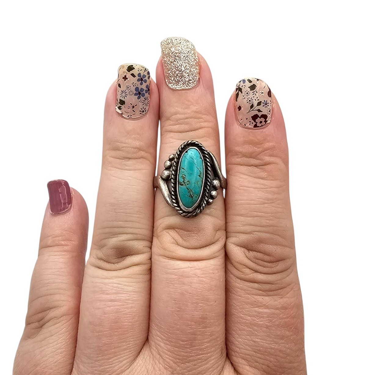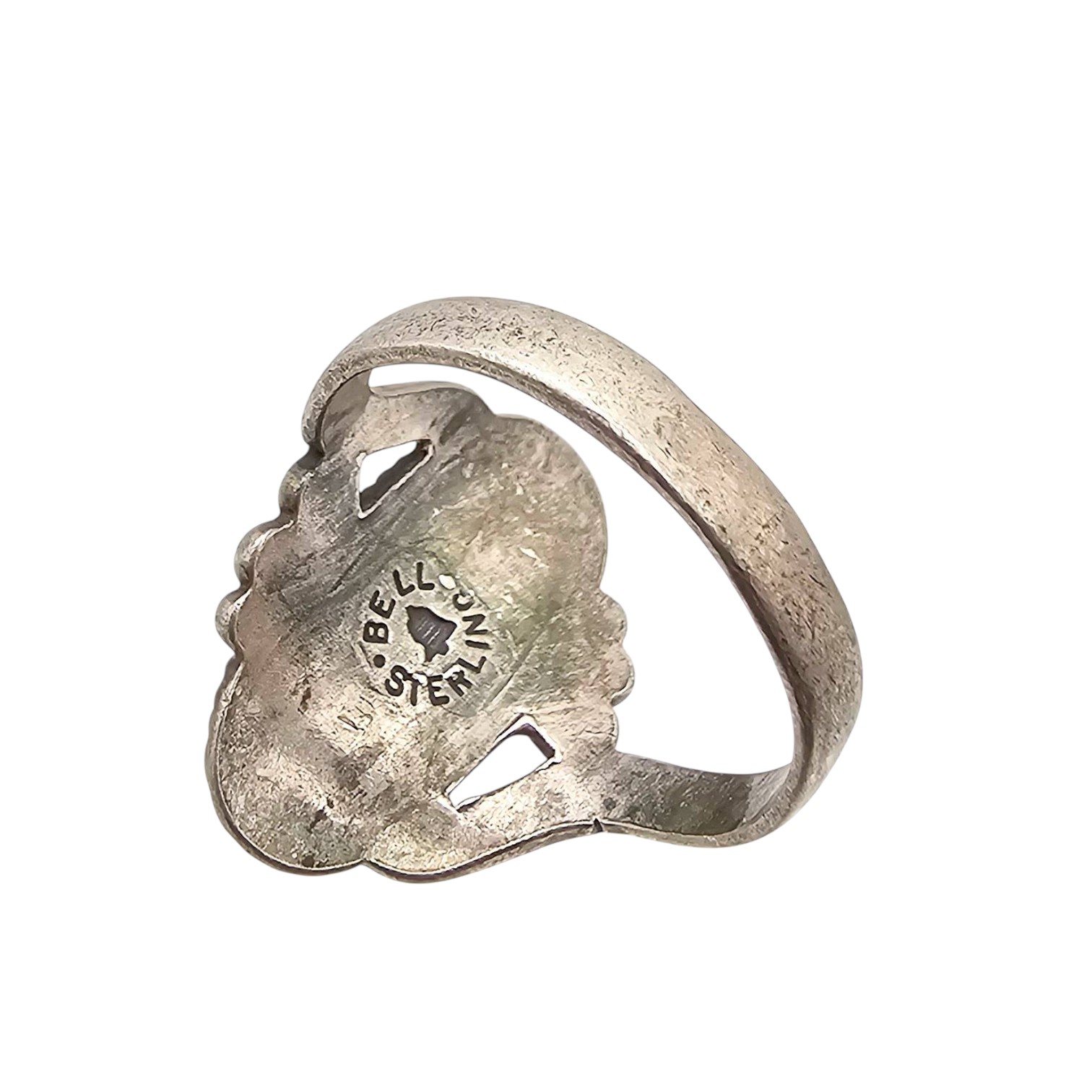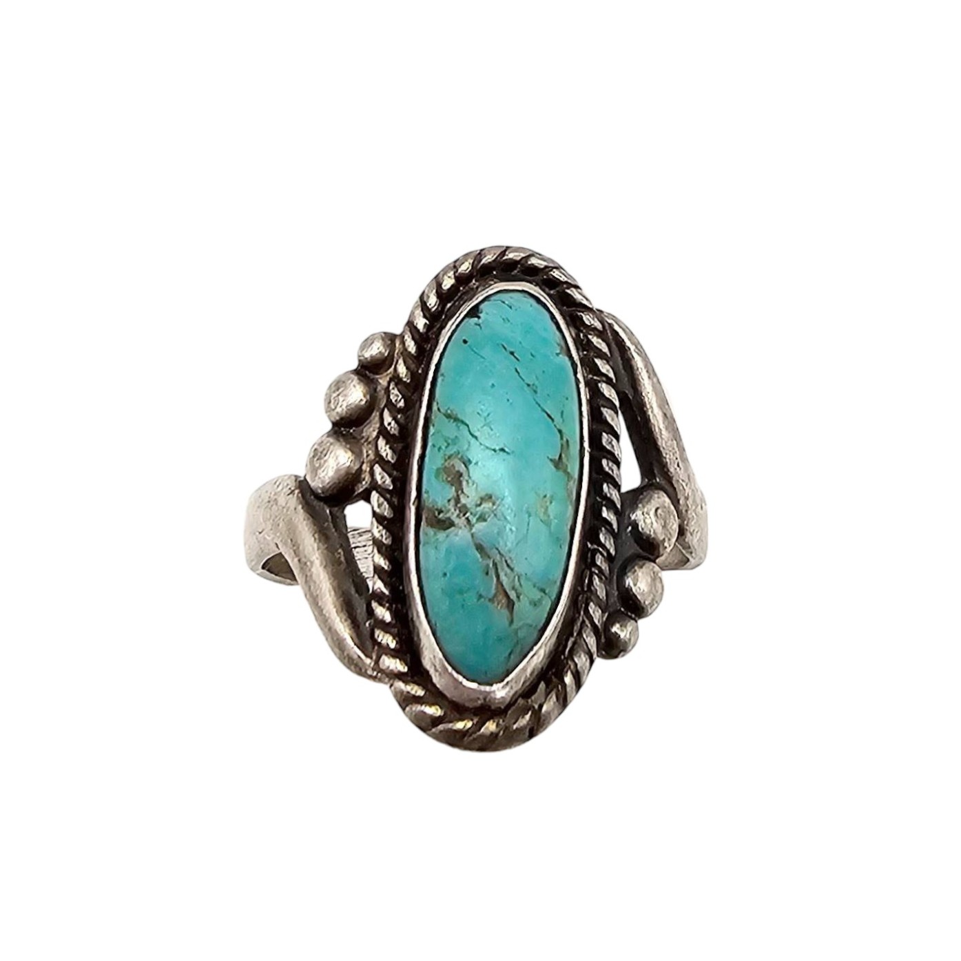 Sterling silver and turquoise ring by Bell Trading Post, featuring a hand-twisted rope design around an oval turquoise stone. Marked ‘Bell Sterling’ on the underside. Ring size 6.75 and weighs 4.4 grams. Measures approximately 1 inch in height.