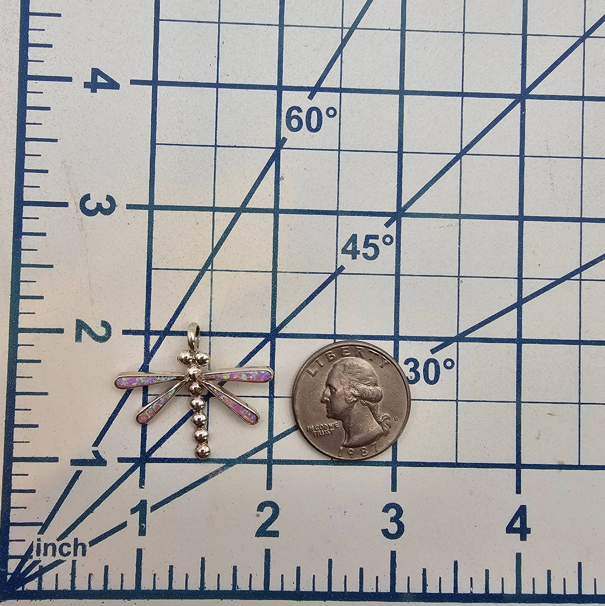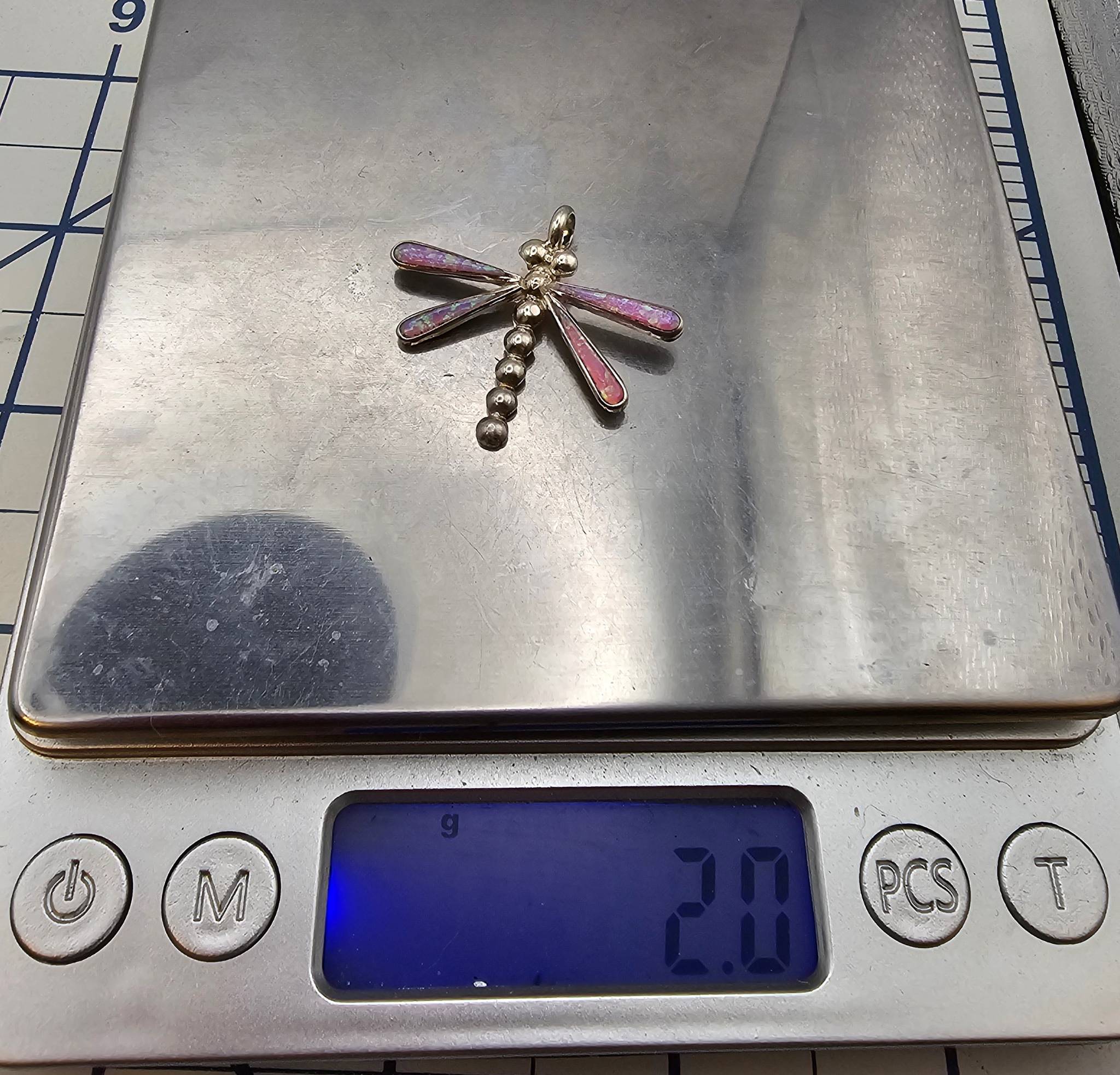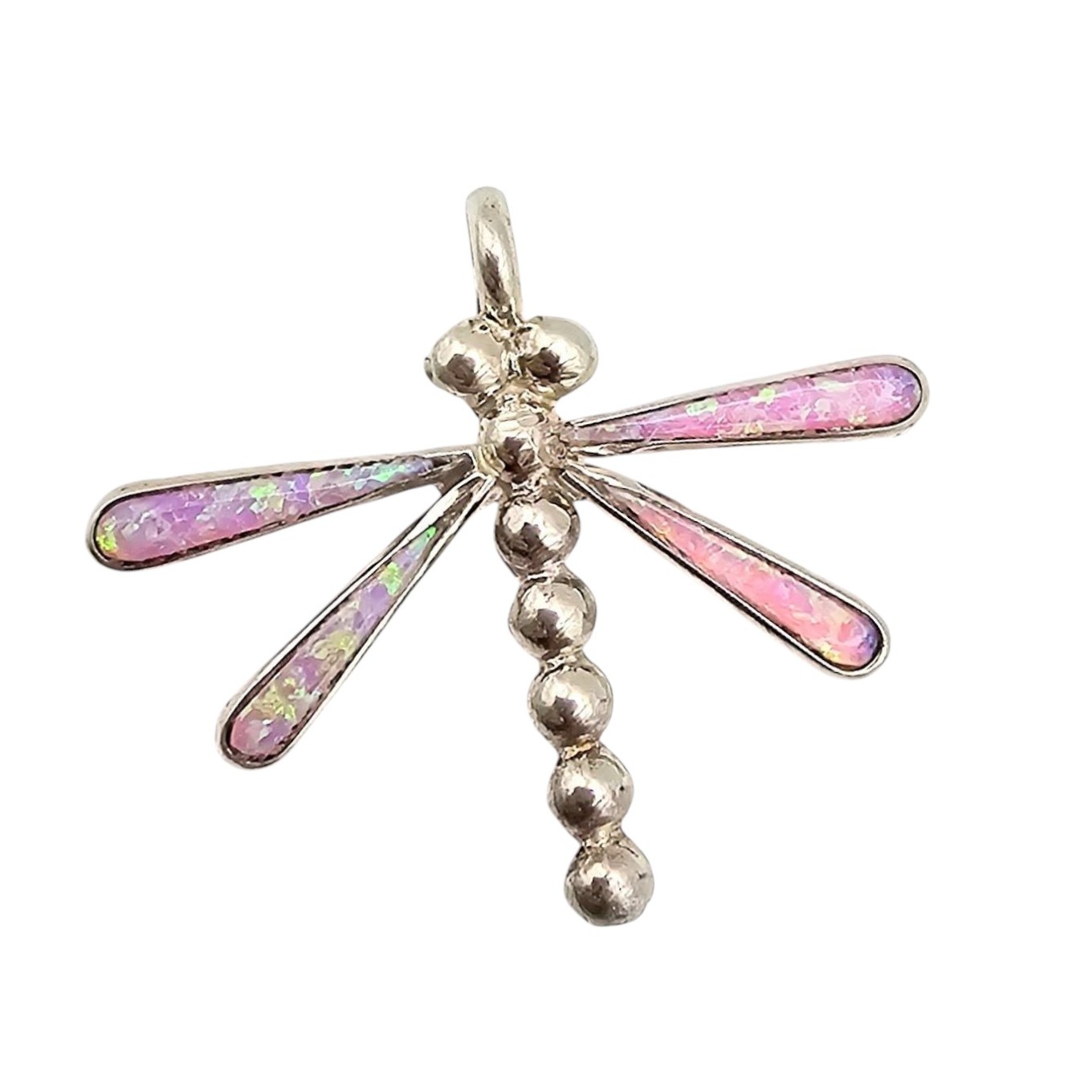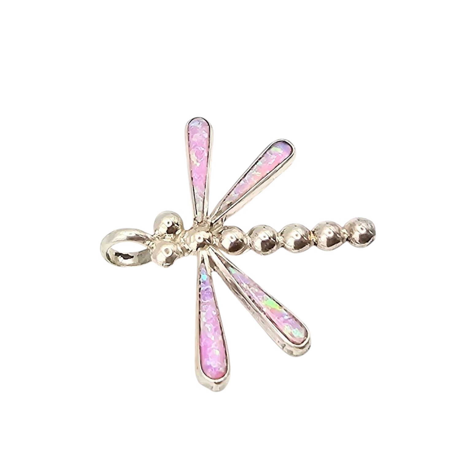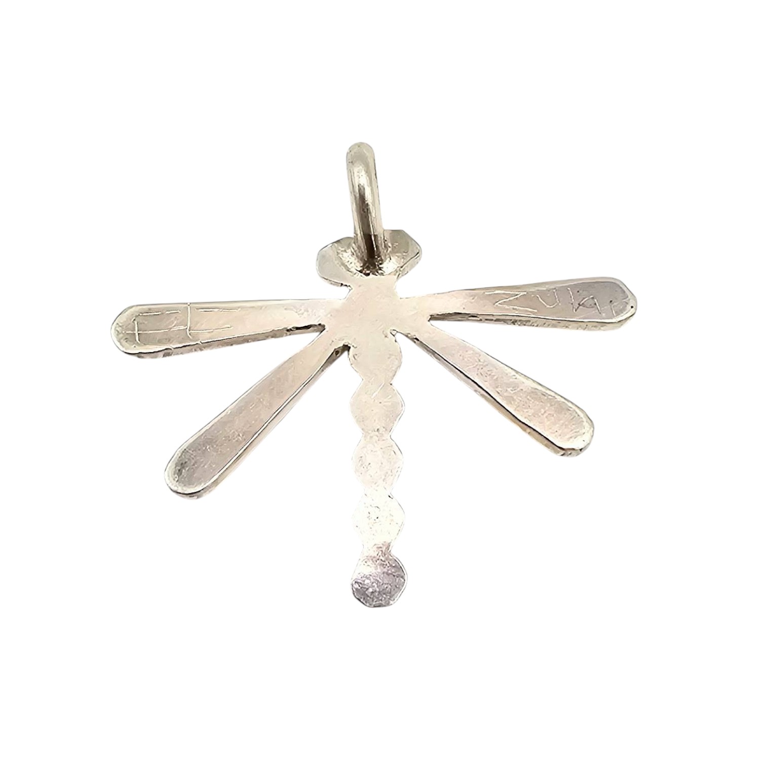 Handcrafted by Zuni artisan Emma Edaakie, this sterling silver pendant features a detailed dragonfly design inlaid with pink opal. The pendant measures approximately 1 inch and weighs 2 grams. Includes markings indicating ‘Zuni Handmade’ and ‘S/S’ for sterling silver.