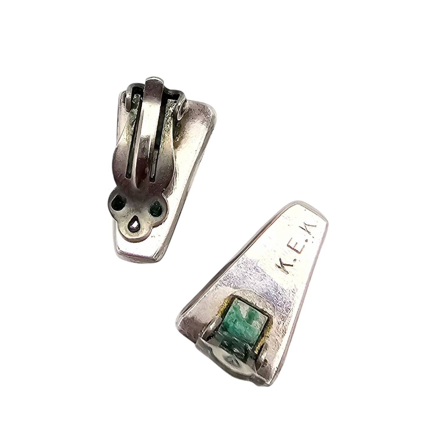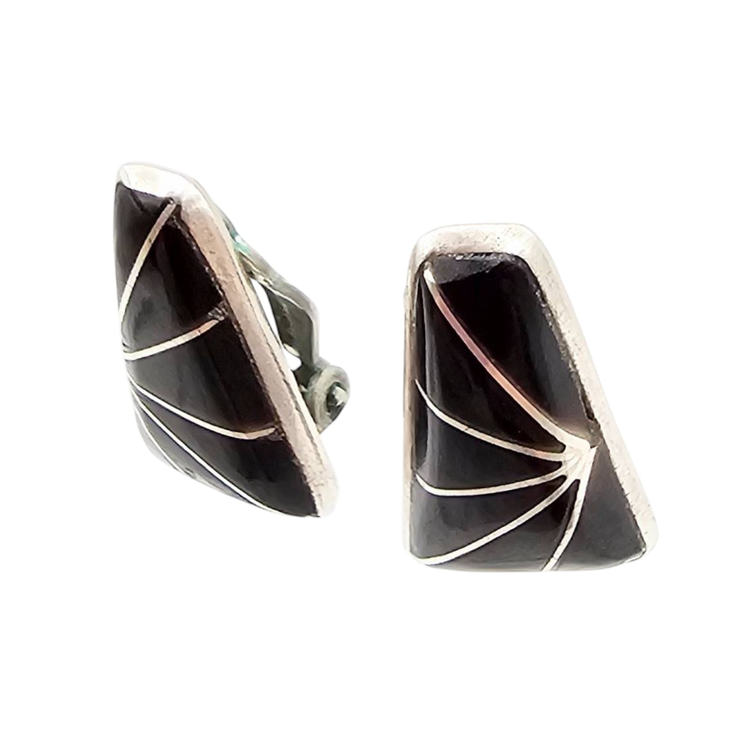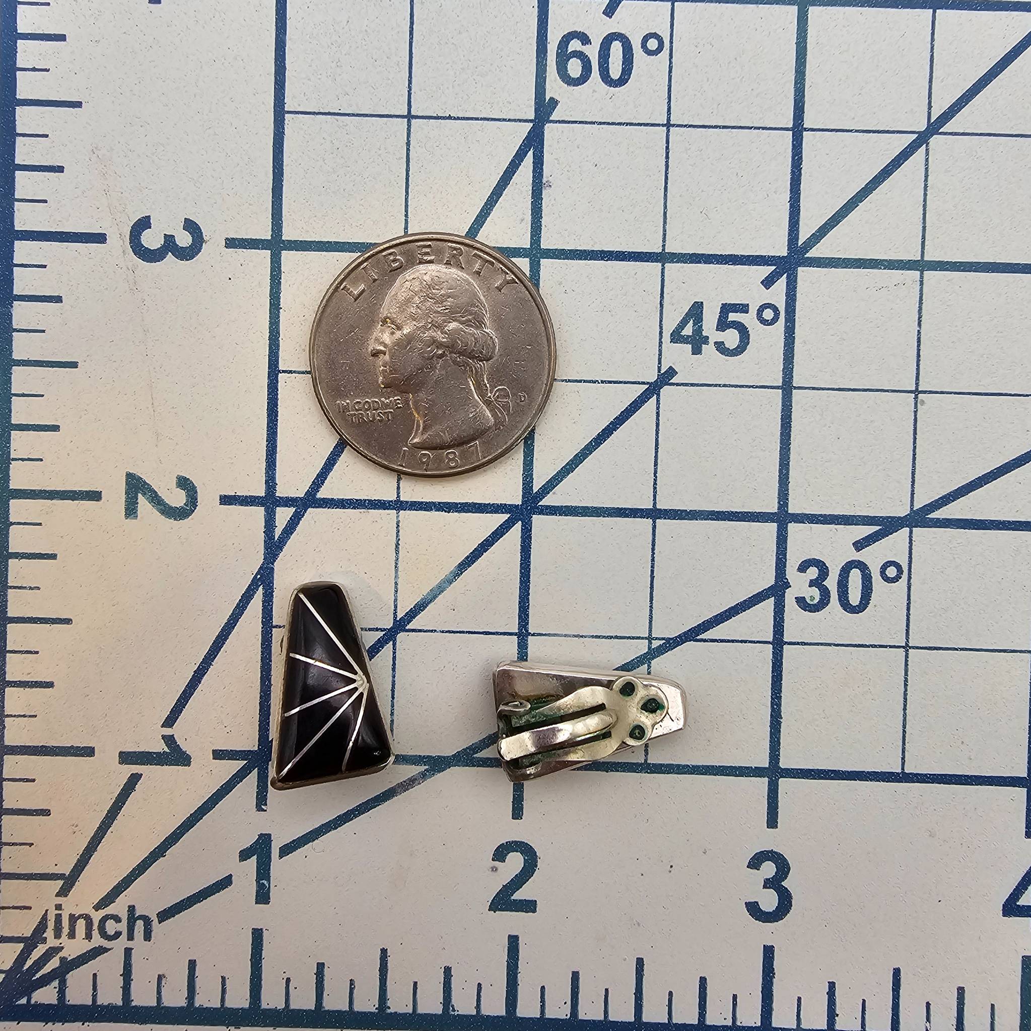 Sterling silver clip-on earrings marked K.E.K. featuring jet inlay with geometric line designs. Each measures approximately 1 inch in length. The combined weight is 4.8 grams. The clips are functional and secure. Marked ‘ ‘ on the back. Suitable for refined everyday or special occasion wear.
