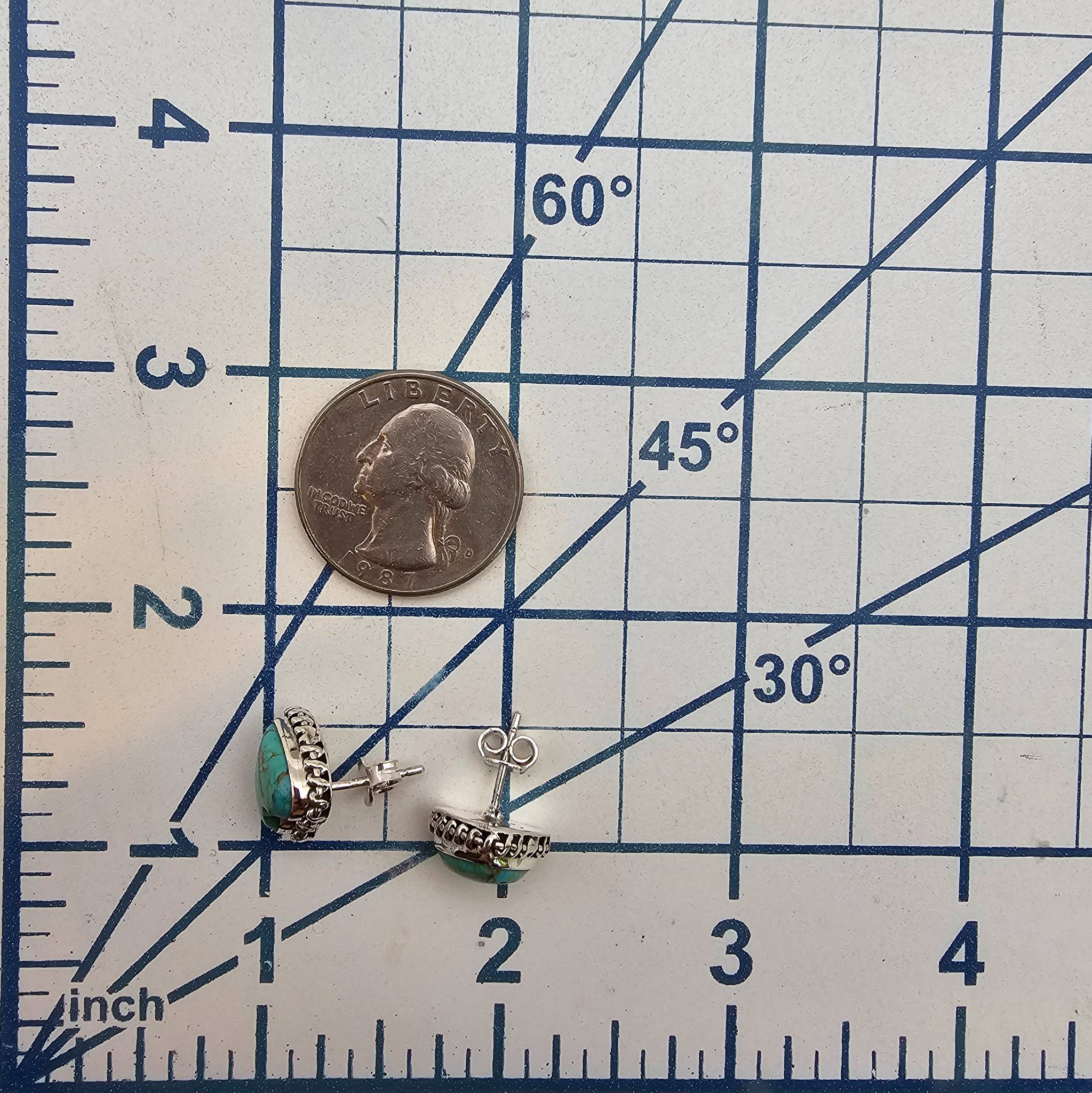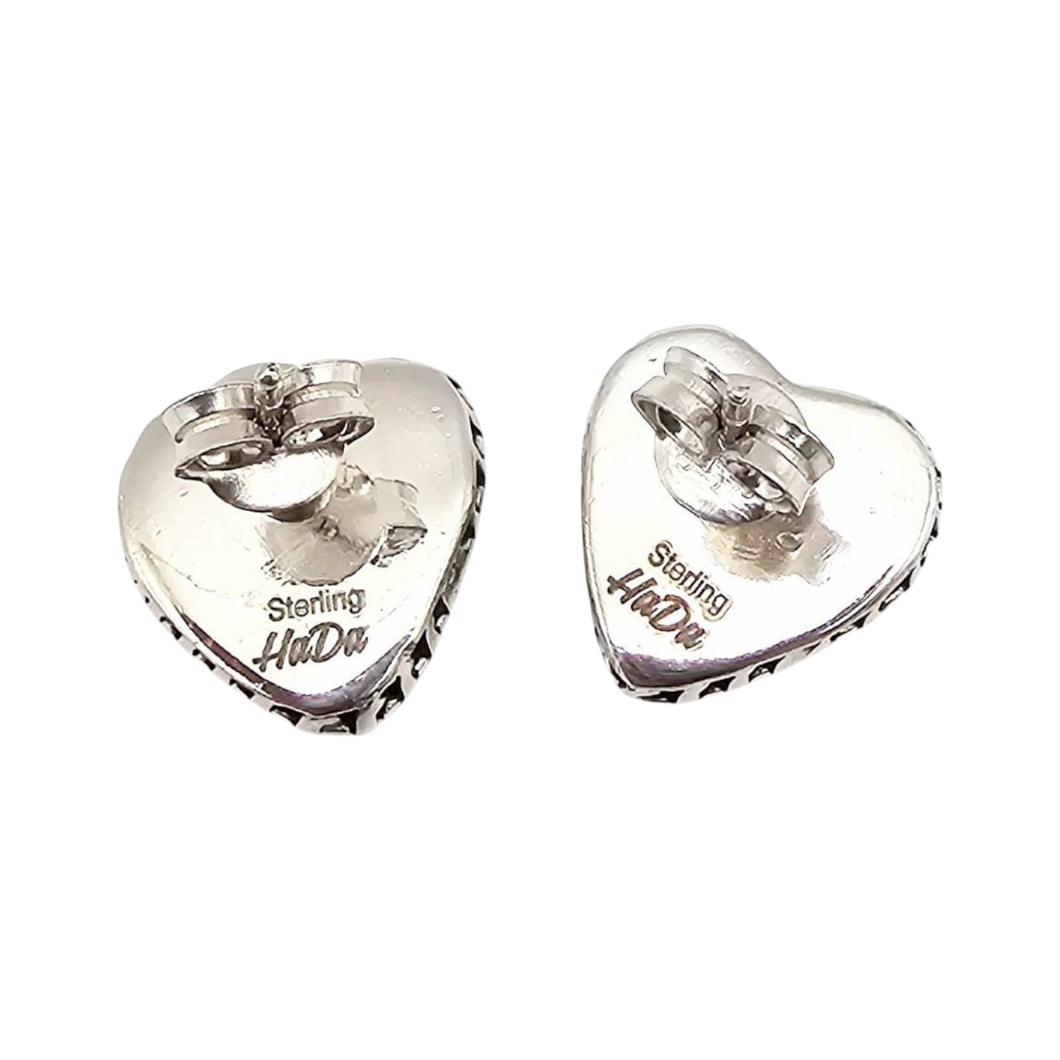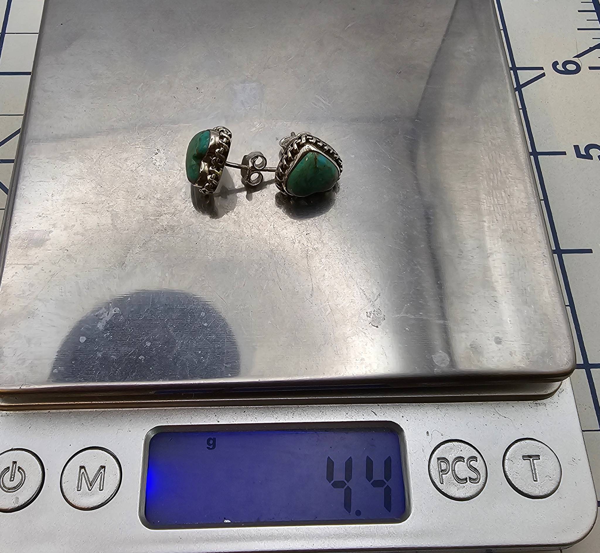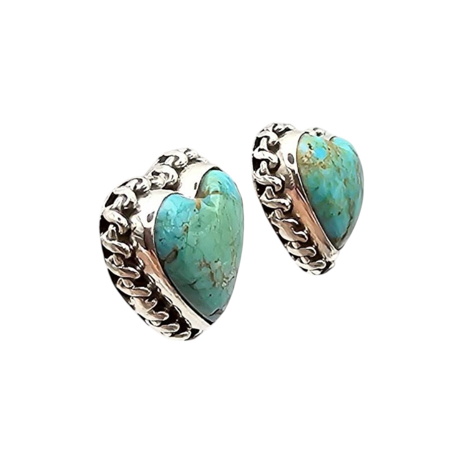Heart-shaped earrings from the Hada Collection made with Kingman turquoise stones set in sterling silver. The total weight is 4.4 grams. Features secure post backs and detailed silverwork around each stone.