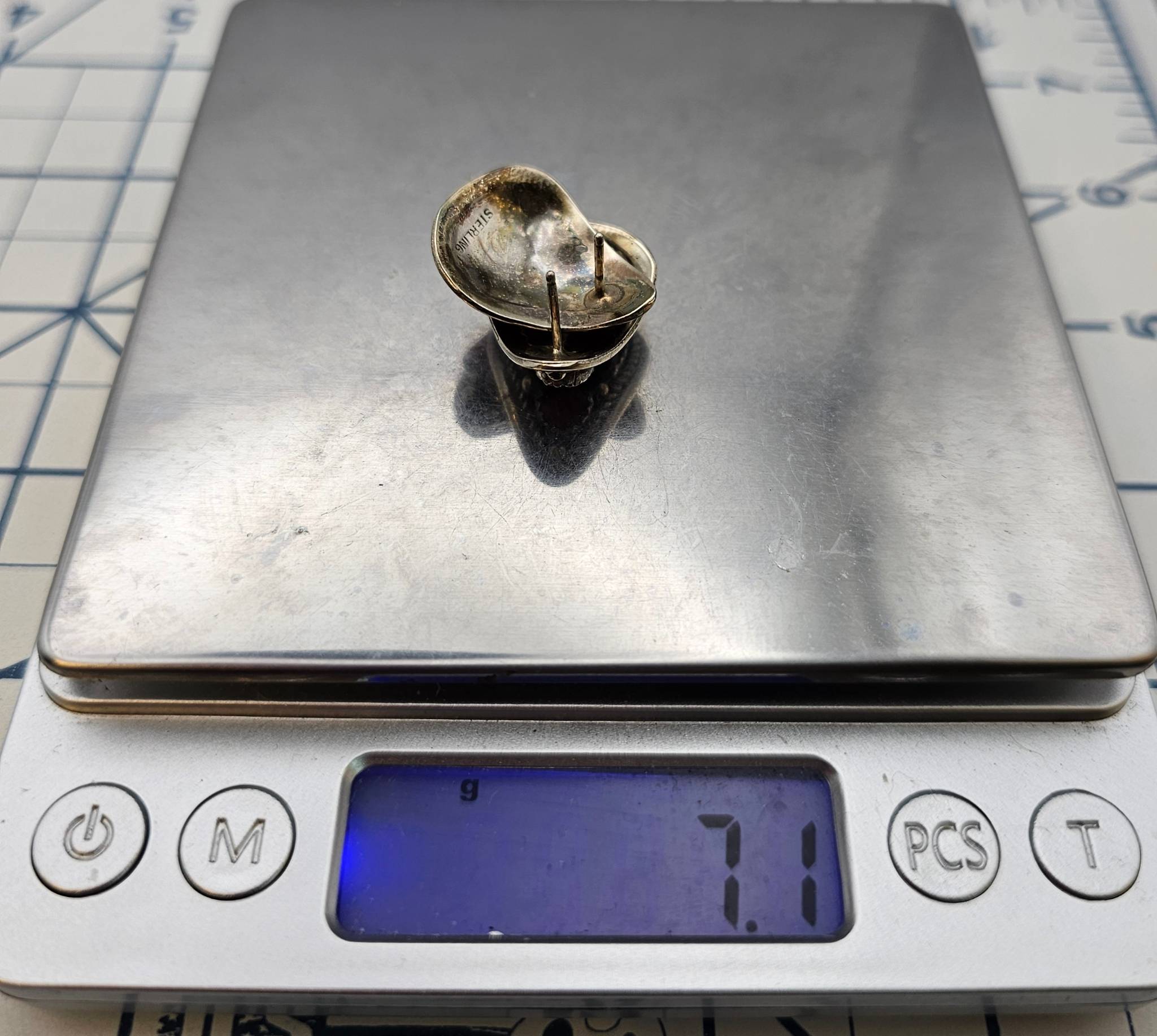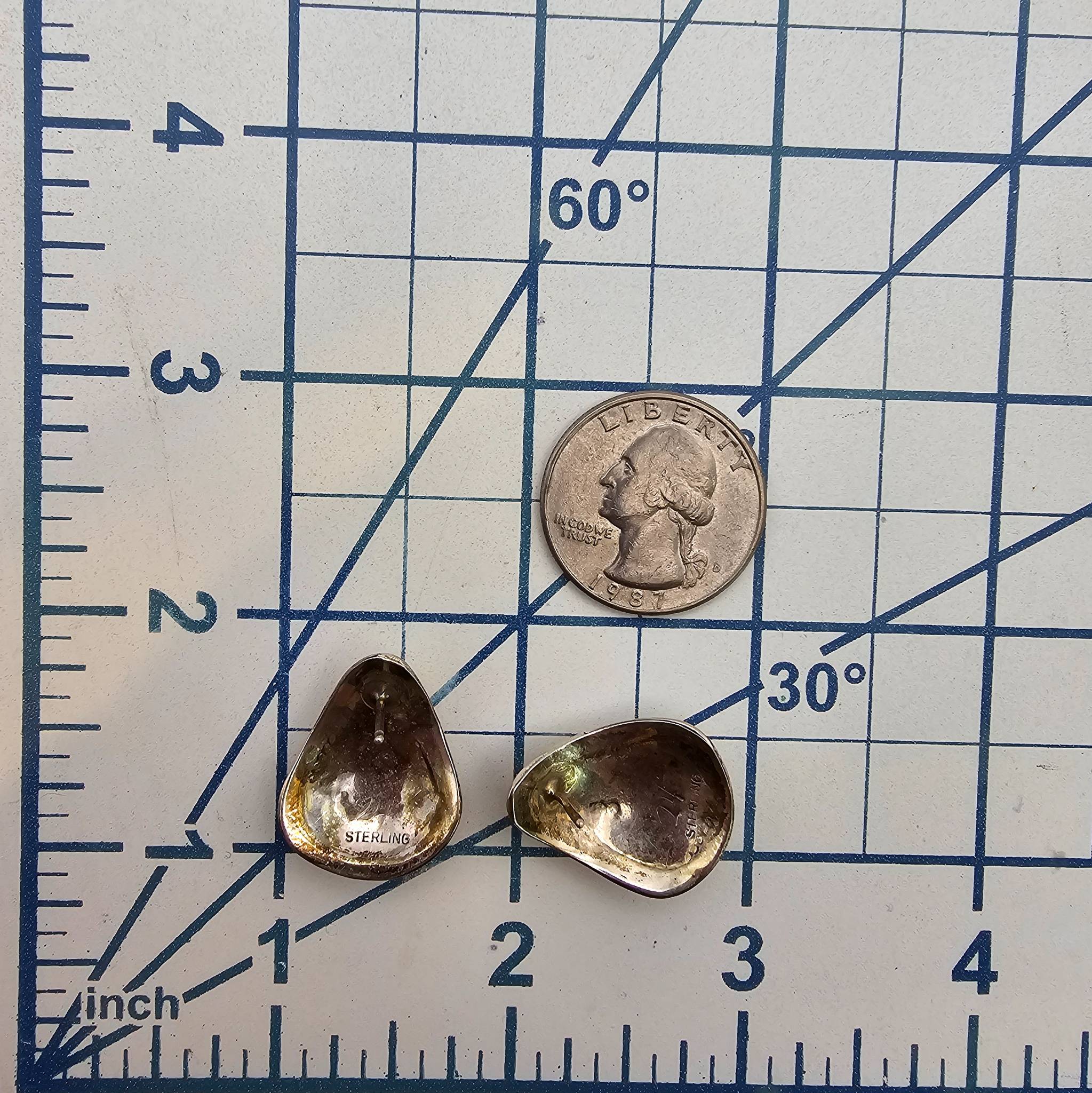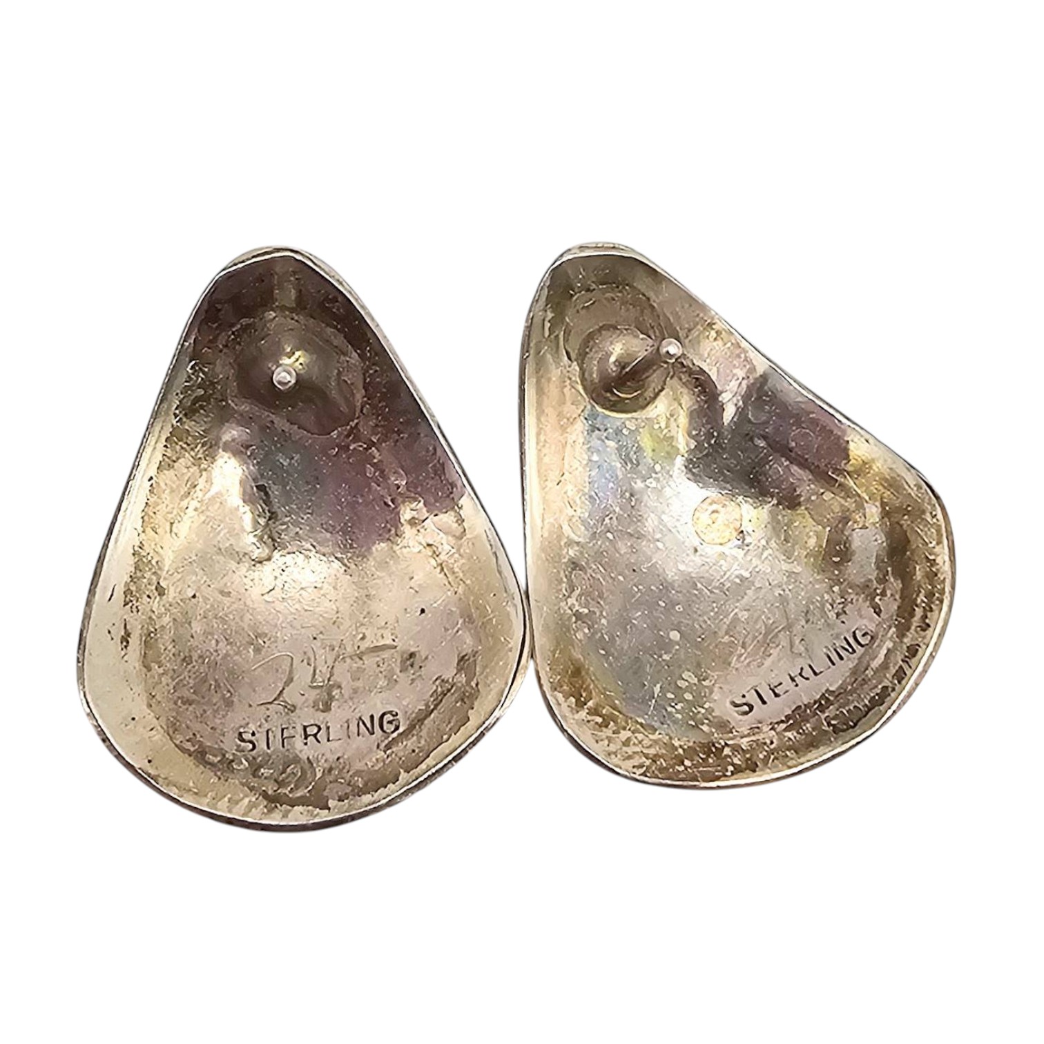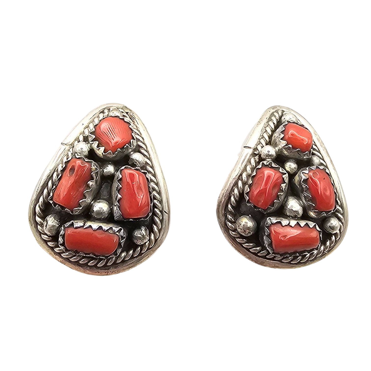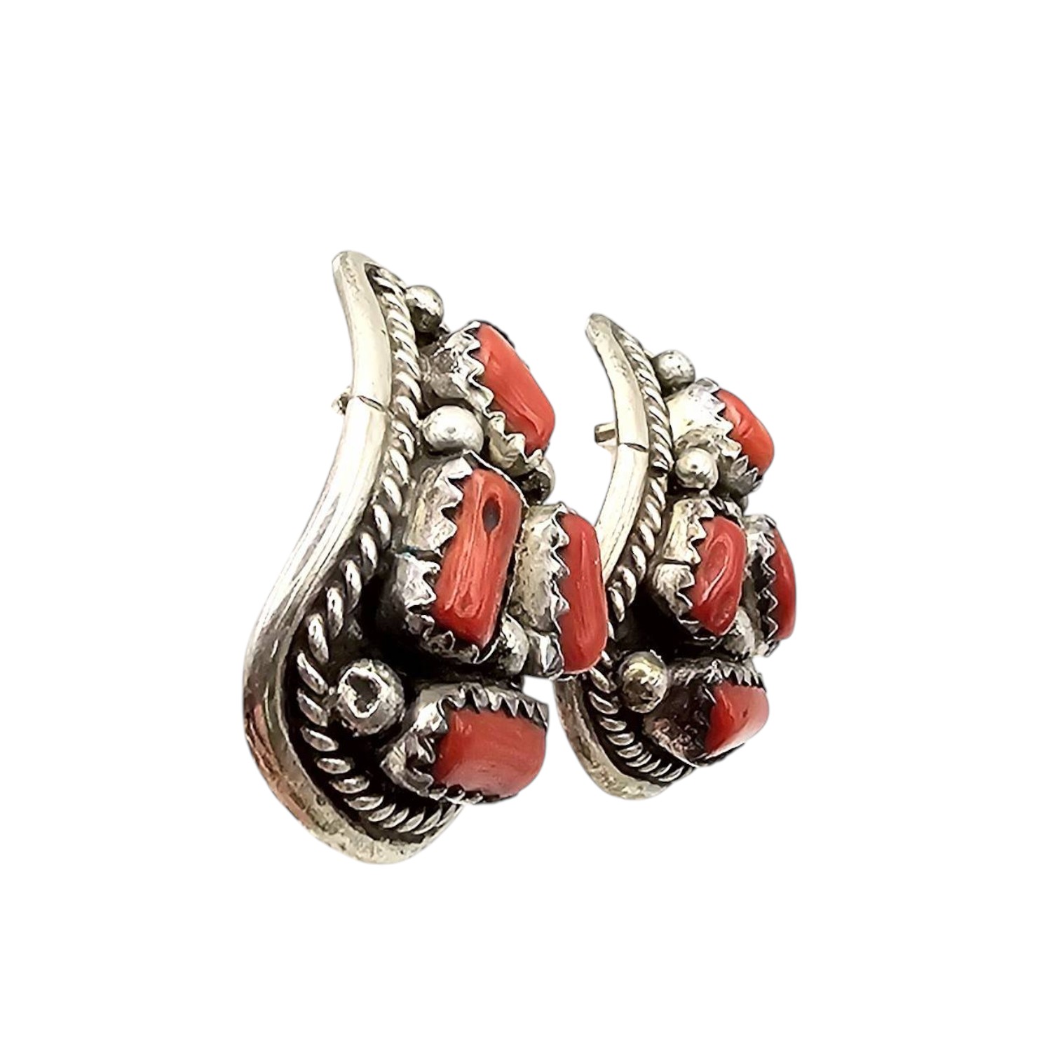 Sterling silver earrings featuring natural red coral stones inlaid in a decorative design. Stamped ‘Sterling’ on the reverse side, indicating authenticity. The total weight is 7 grams. These earrings do not include backs. Each earring is teardrop-shaped with intricate silver detailing.