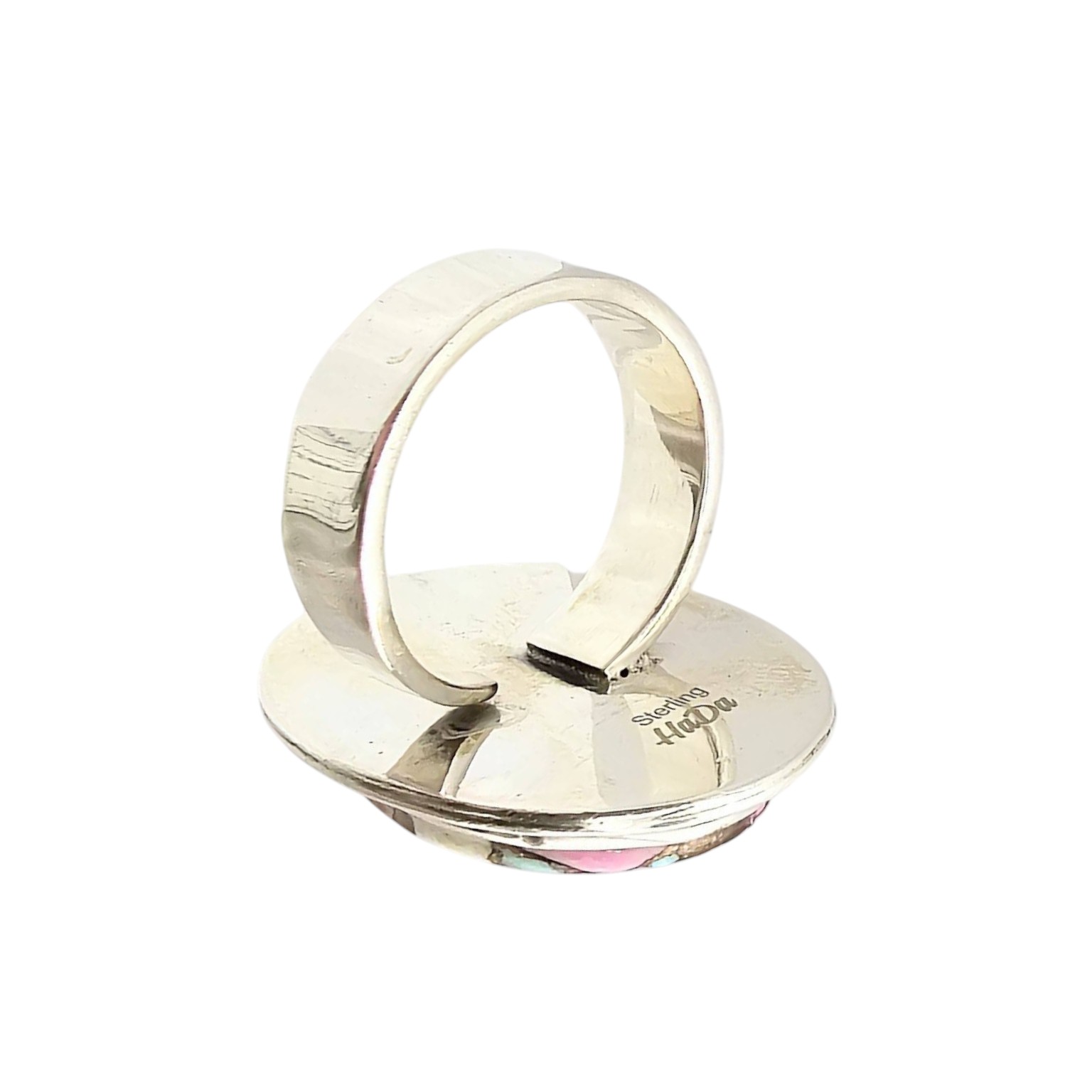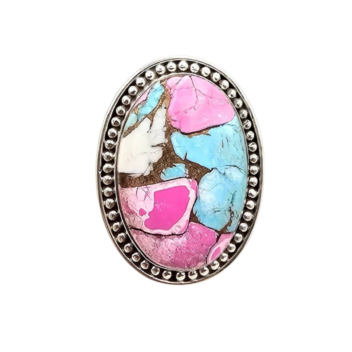 Navajo handmade sterling silver adjustable ring by Tia Long, showcasing a vibrant ‘Cotton Candy’ inlay design featuring pink, turquoise, and white tones. The oval centerpiece is set in a beaded bezel. The ring weighs approximately 12.6 grams and bears the artist’s hallmark. Crafted with precision, it is both a statement and collectible piece.