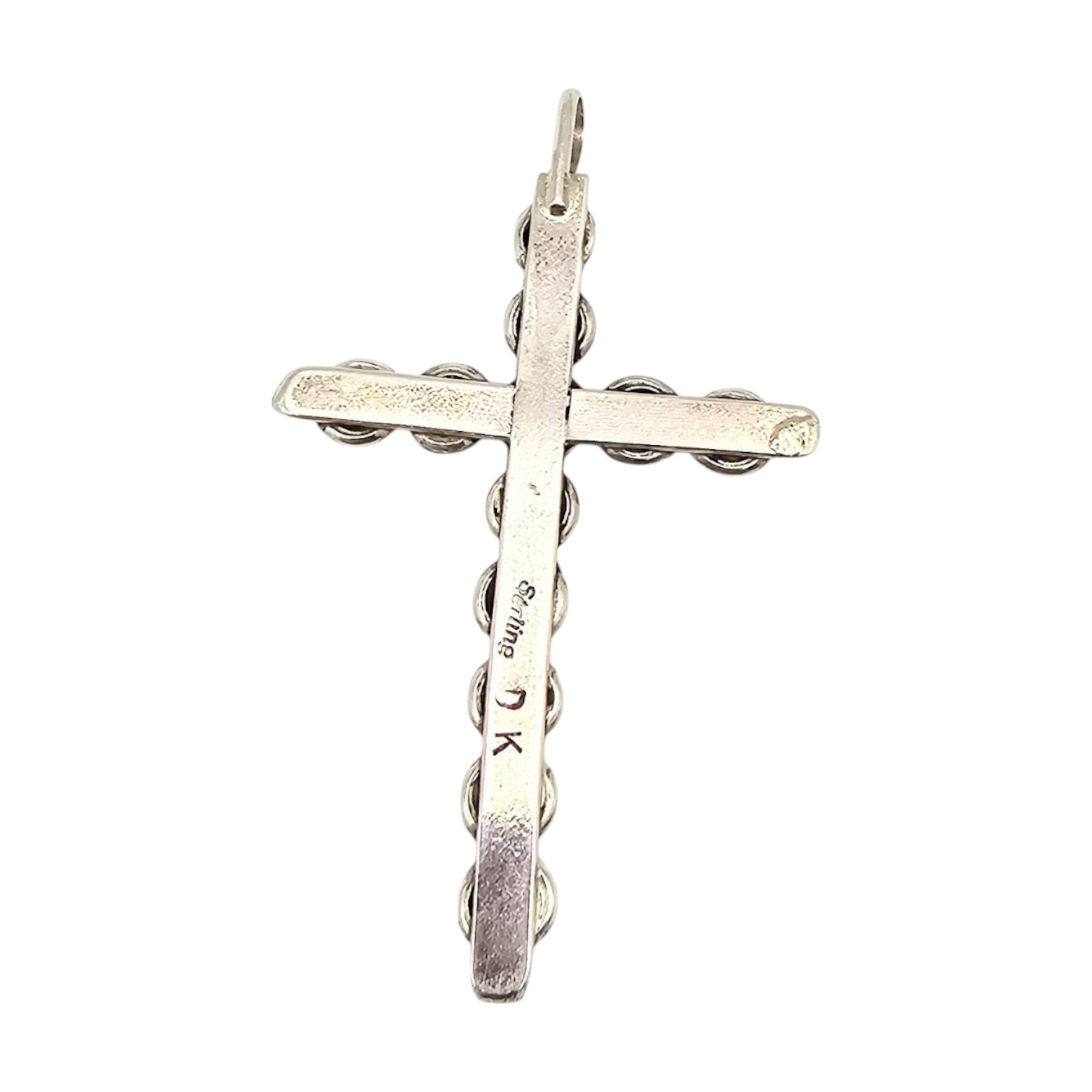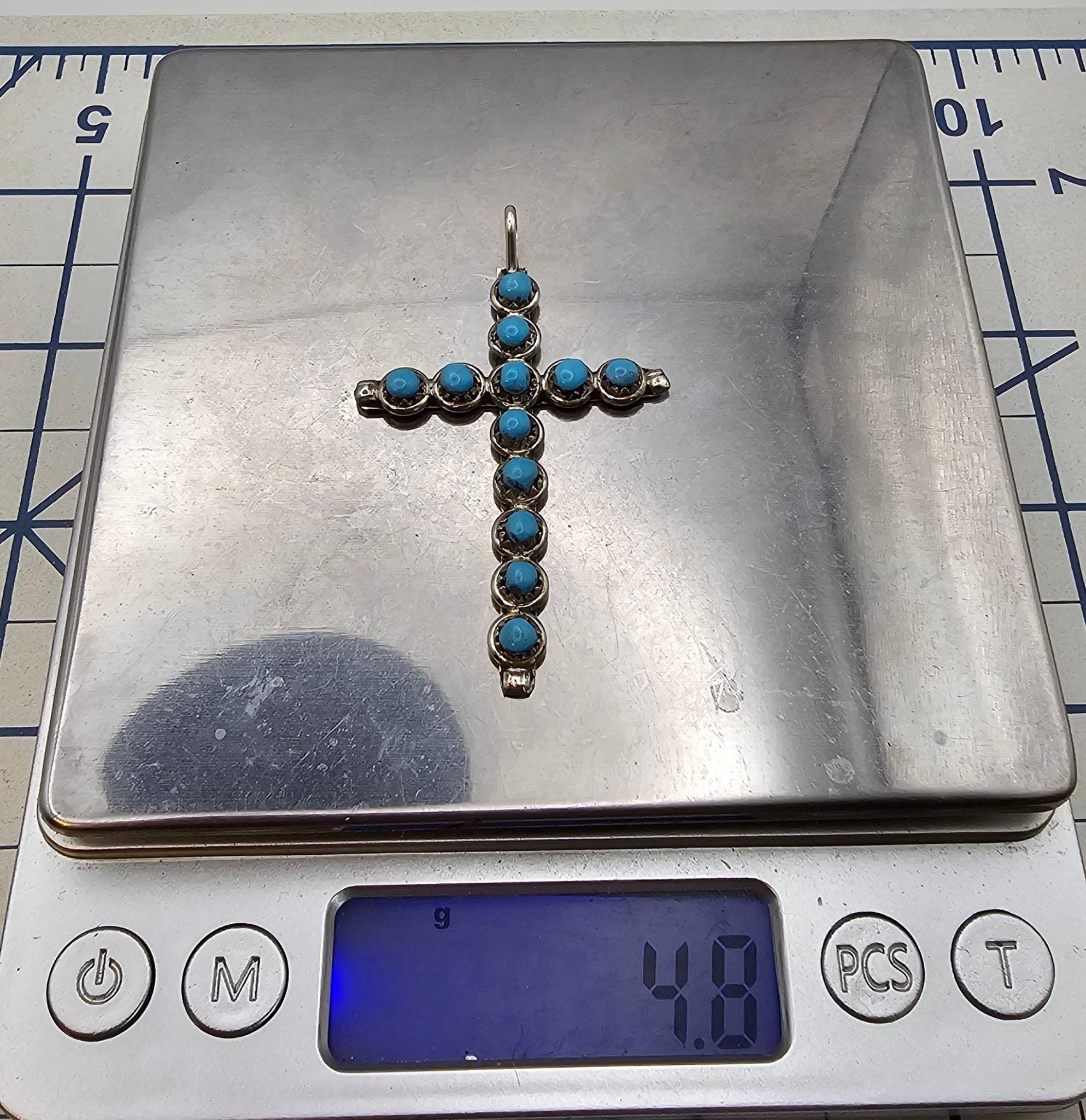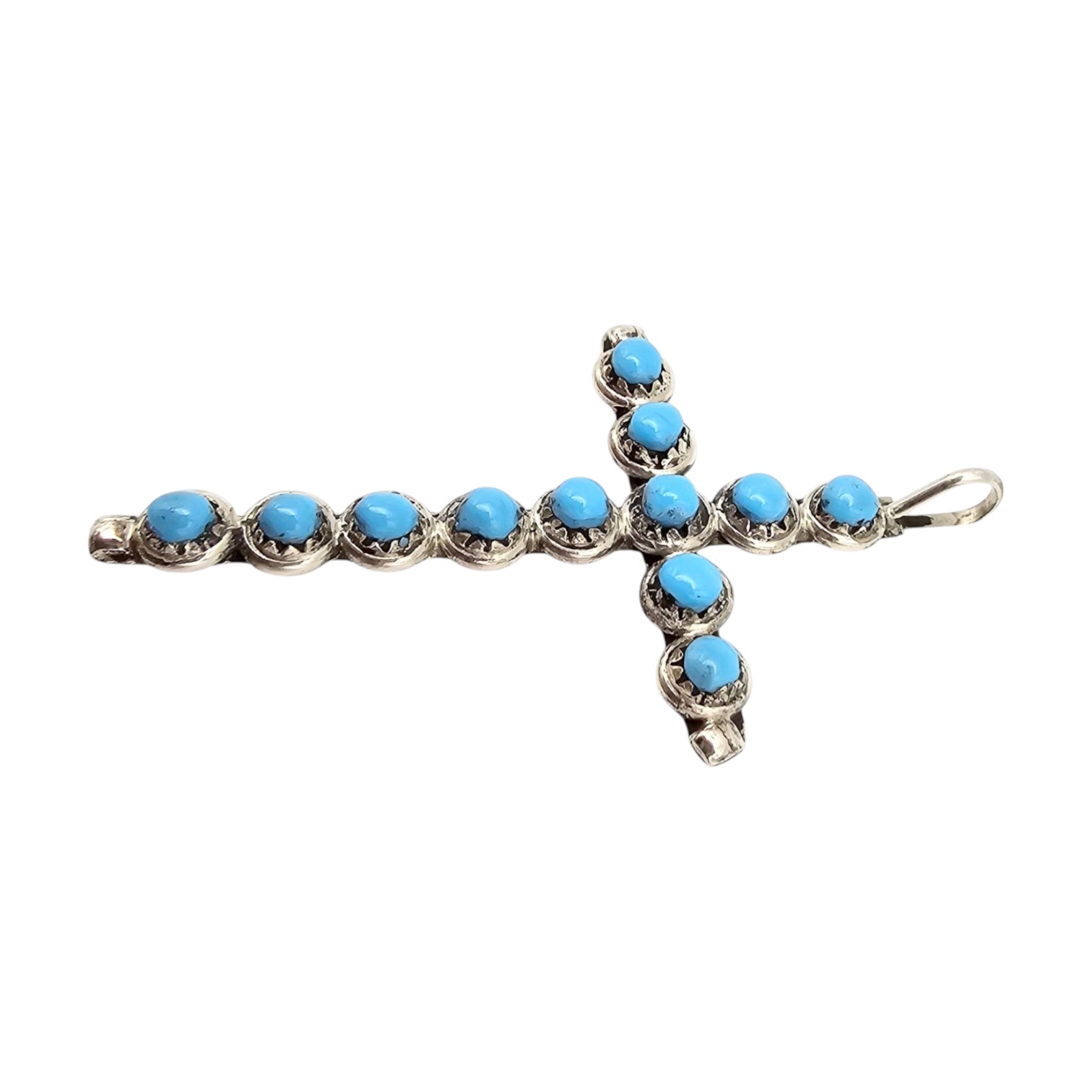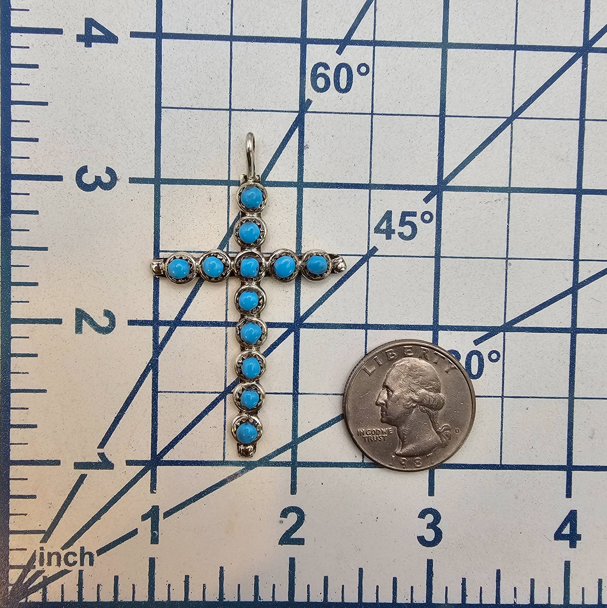 Sterling silver handmade cross pendant by Zuni artisan Davis Kamasse featuring Kingman turquoise stones. The pendant is crafted with 12 stones and measures approximately 2.25 inches in length (including the bail). Weighs 4.8 grams and marked with ‘Sterling’ and the initials ‘DK’ on the back.
