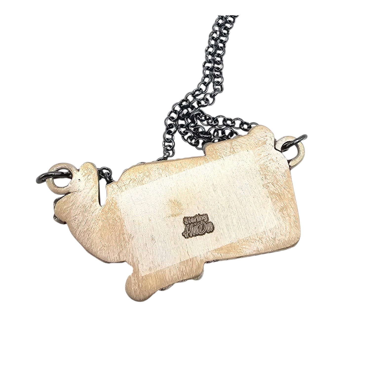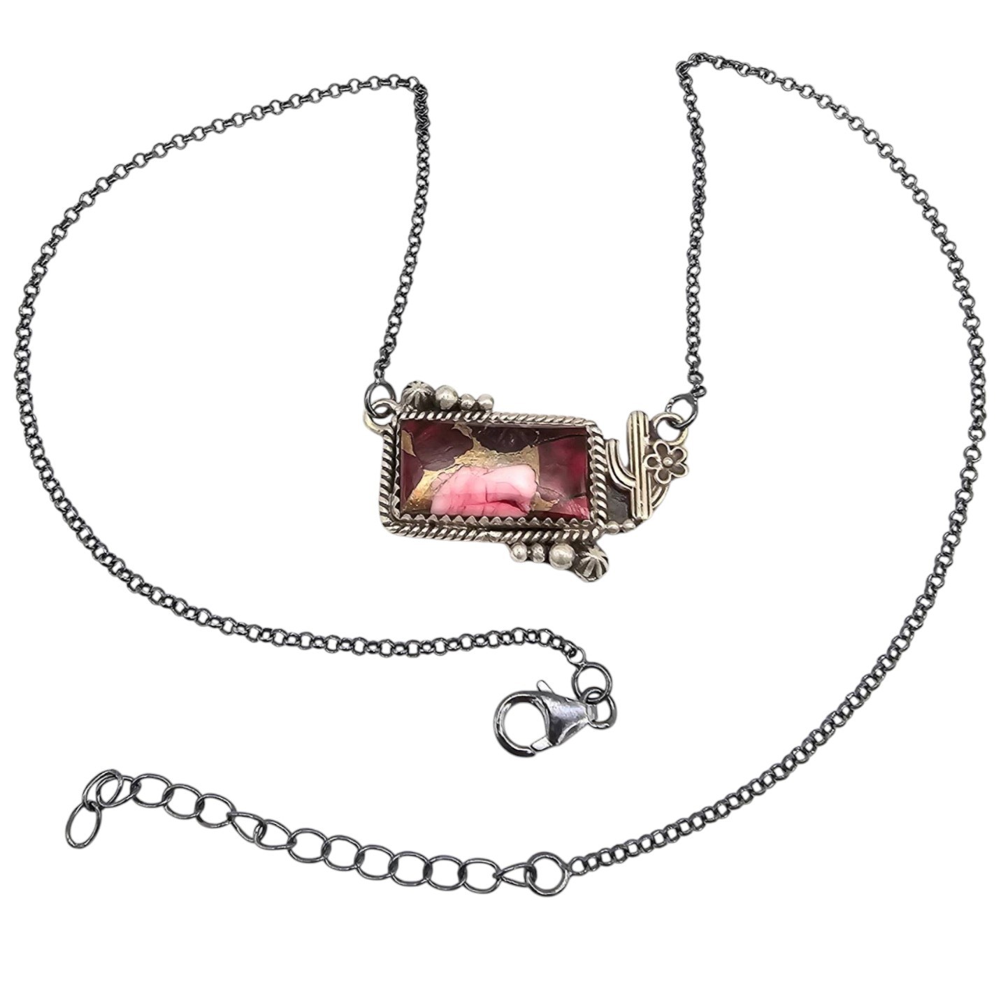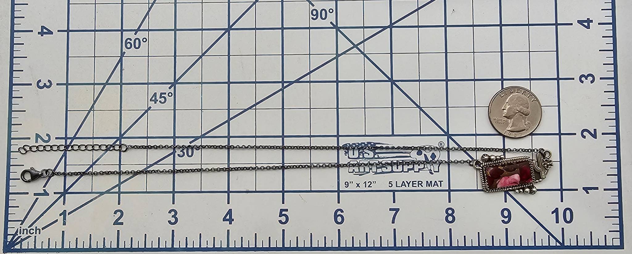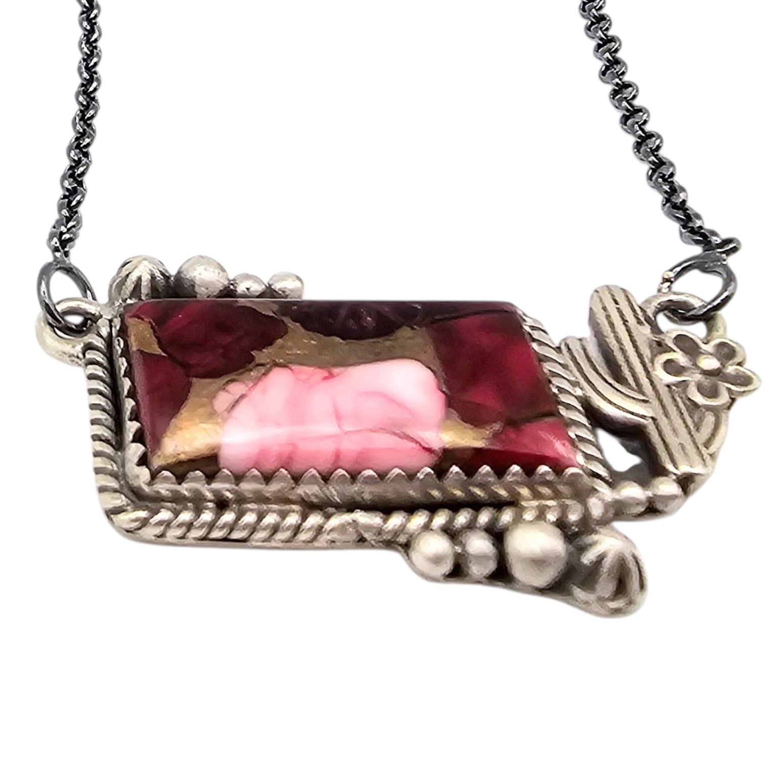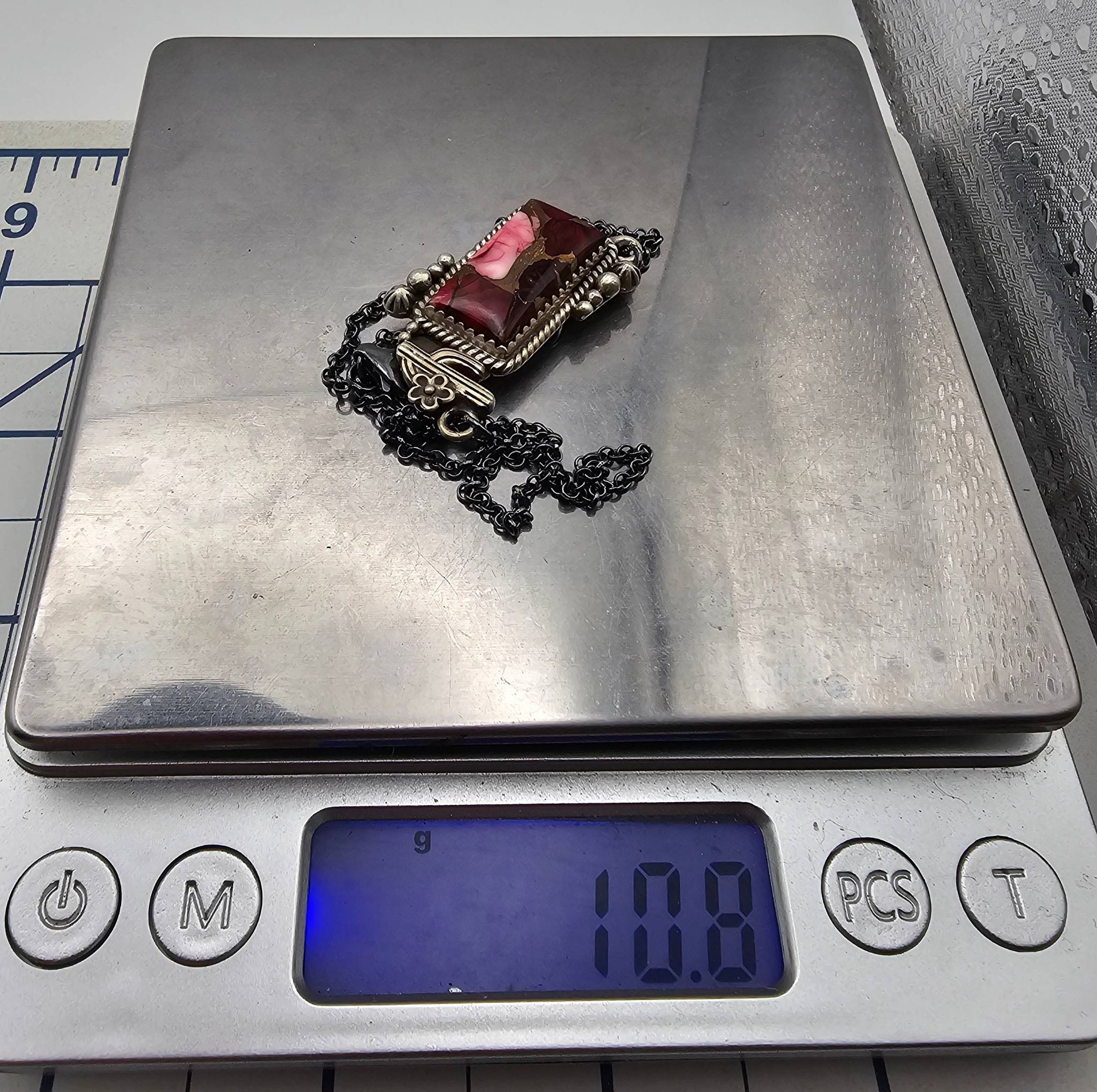 Hada Collection sterling silver necklace featuring a unique pendant with a rose dahlia design. The pendant is adorned with detailed floral accents and a pink and red stone centerpiece. The chain has adjustable links with a secure clasp. Weighs approximately 10.8 grams and features a designer mark on the back of the pendant.