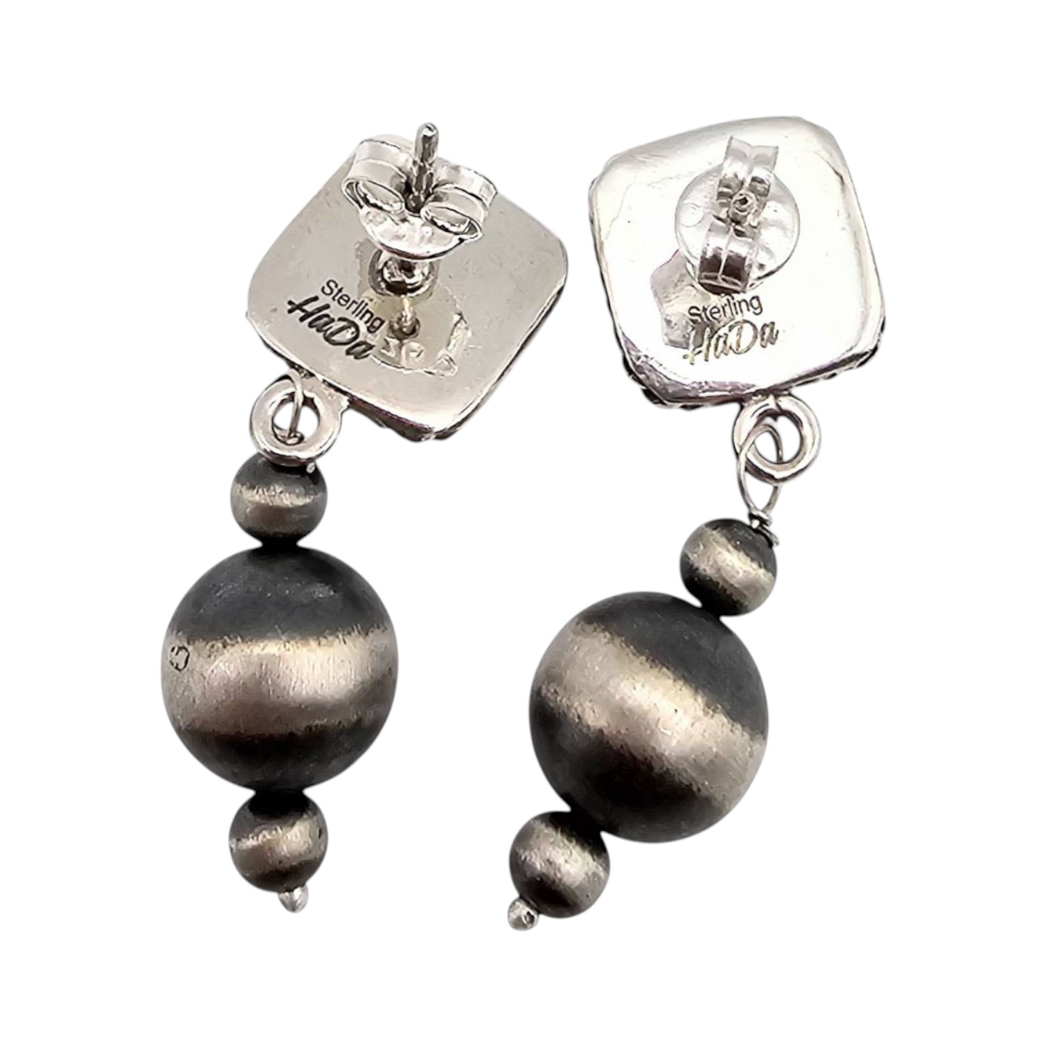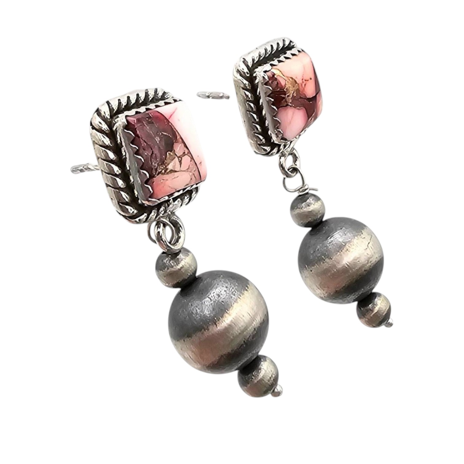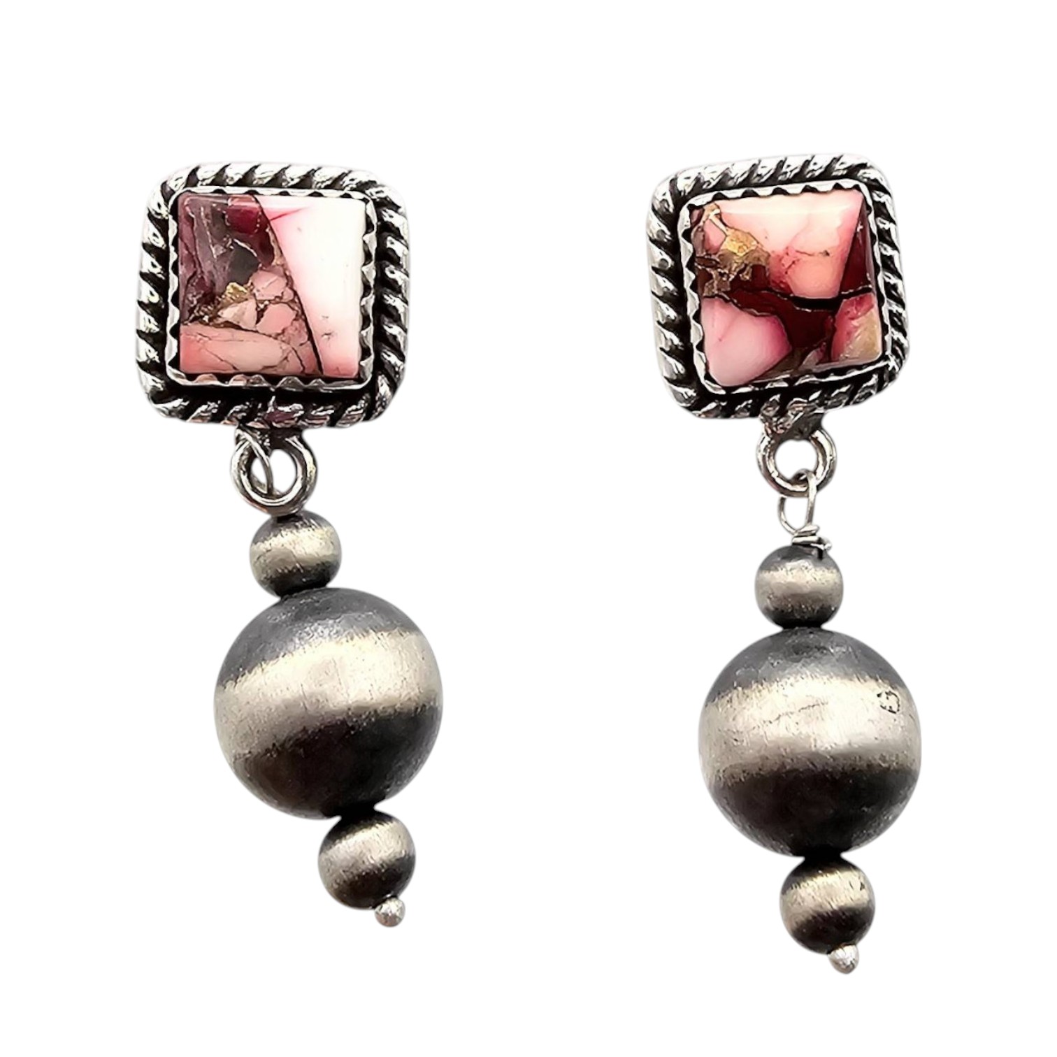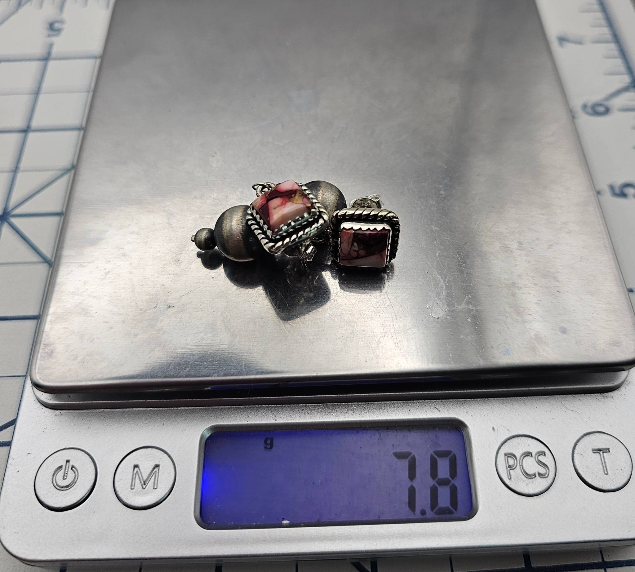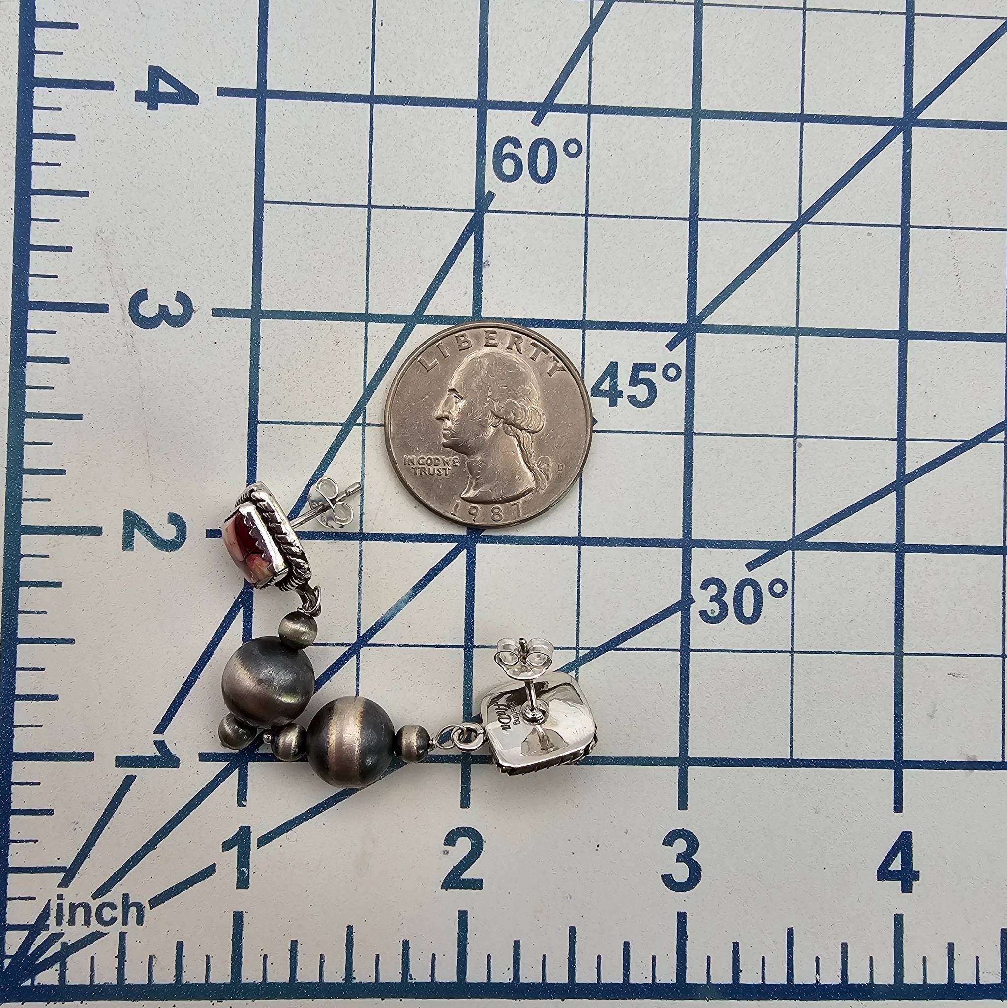 Hada Collection sterling silver earrings featuring a Dahlia Rose design. The earrings showcase square pink stone accents framed with twisted detailing and dangling spherical silver components. They are stamped ‘ ‘ indicating sterling silver purity and weigh approximately 7.8 grams as shown. Includes measurements on a grid for size reference. Condition appears good without obvious damage.