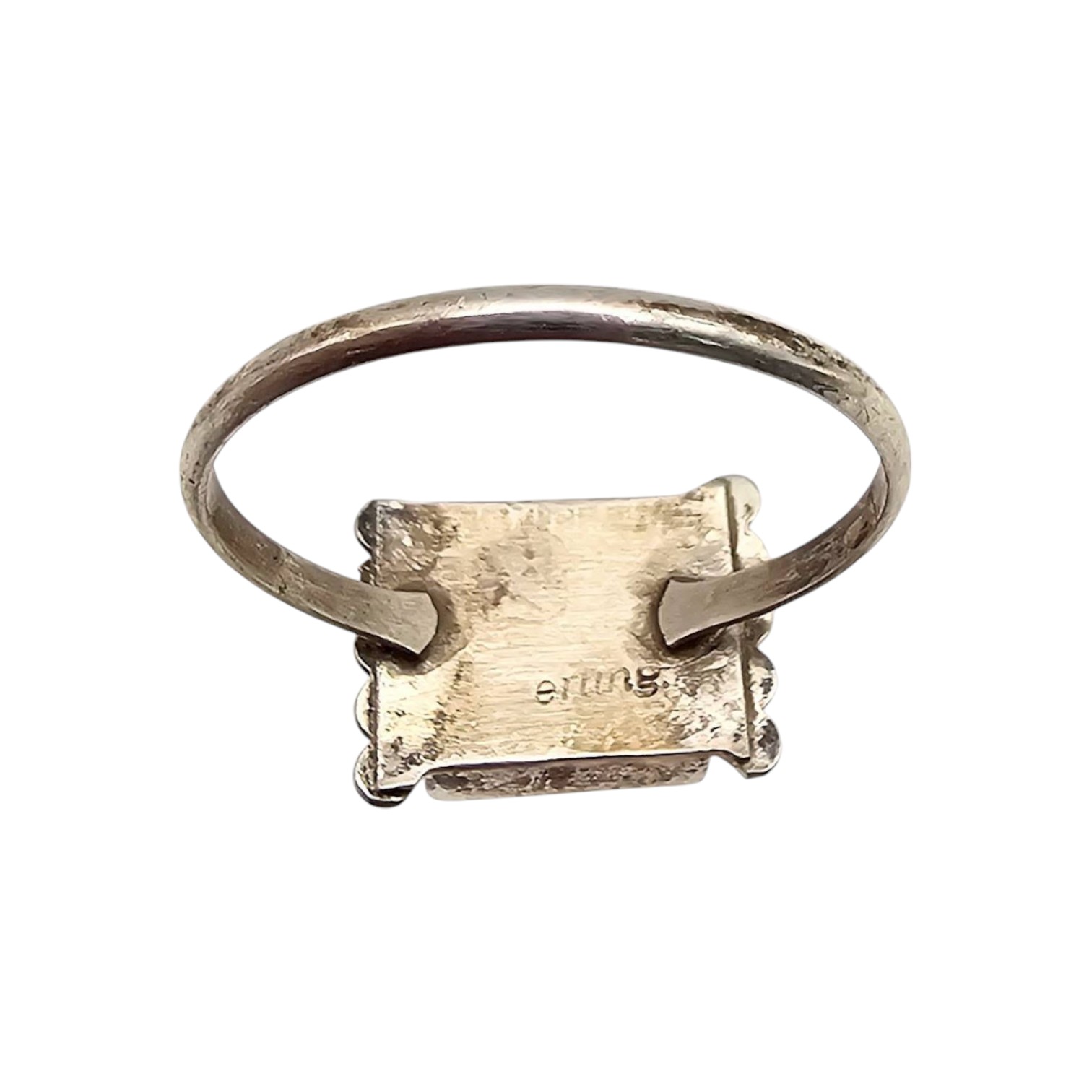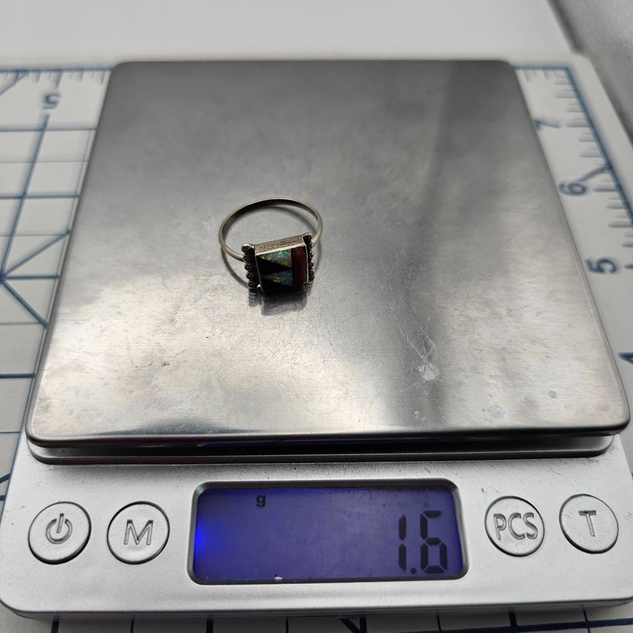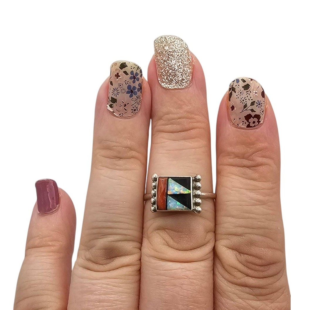 Sterling silver ring handmade by Zuni artisan Tyrone Martinez. The ring features a multicolor geometric inlay pattern with vibrant materials, including opal and coral stones. Marked as sterling on the reverse and weighs 1.6 grams.