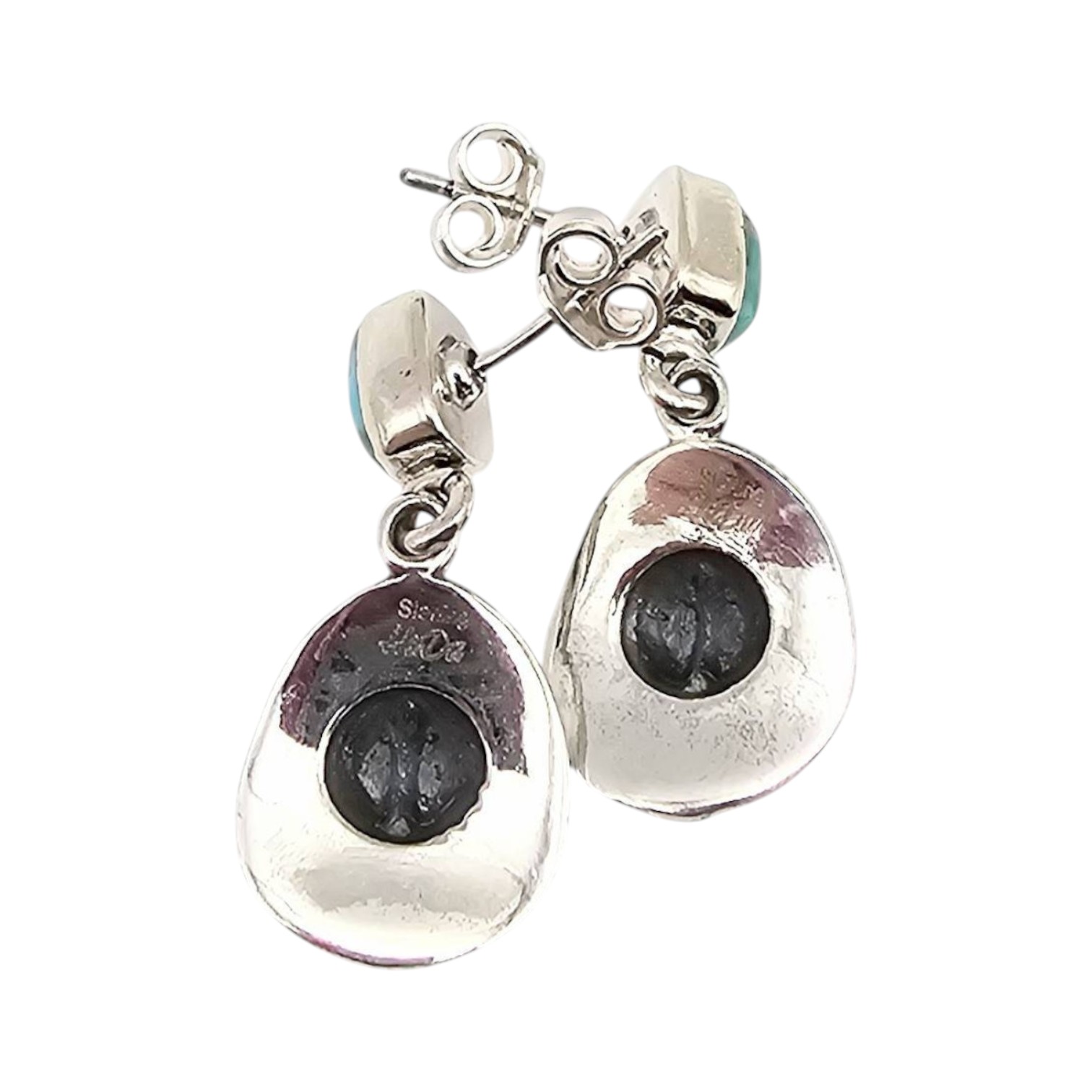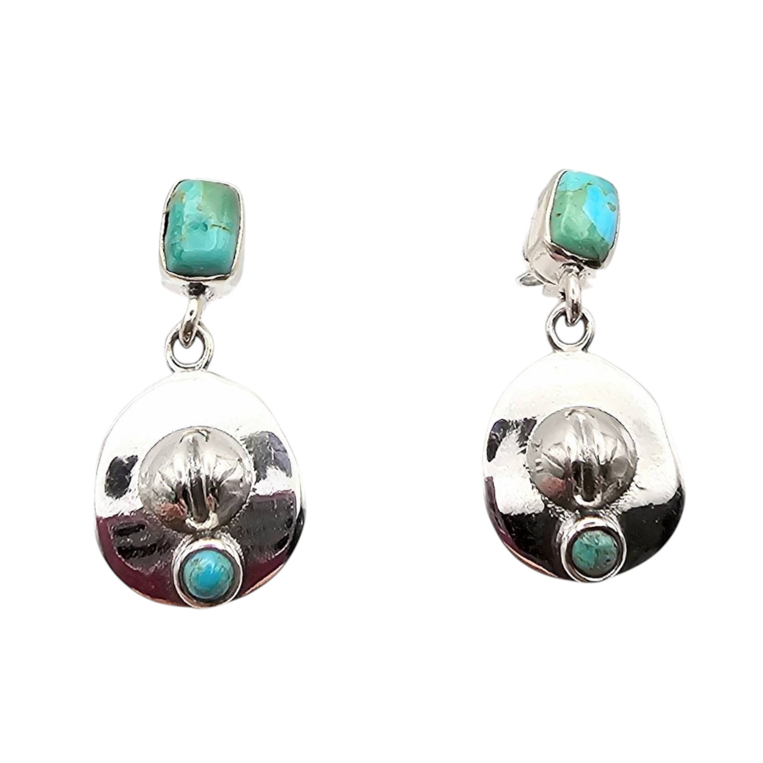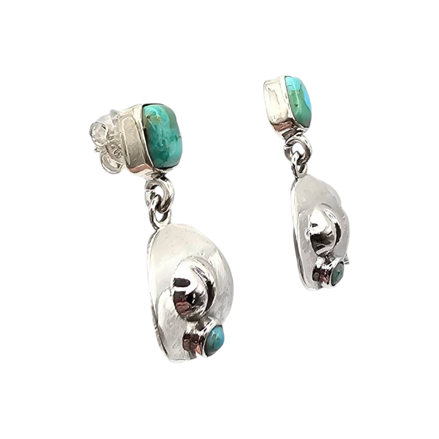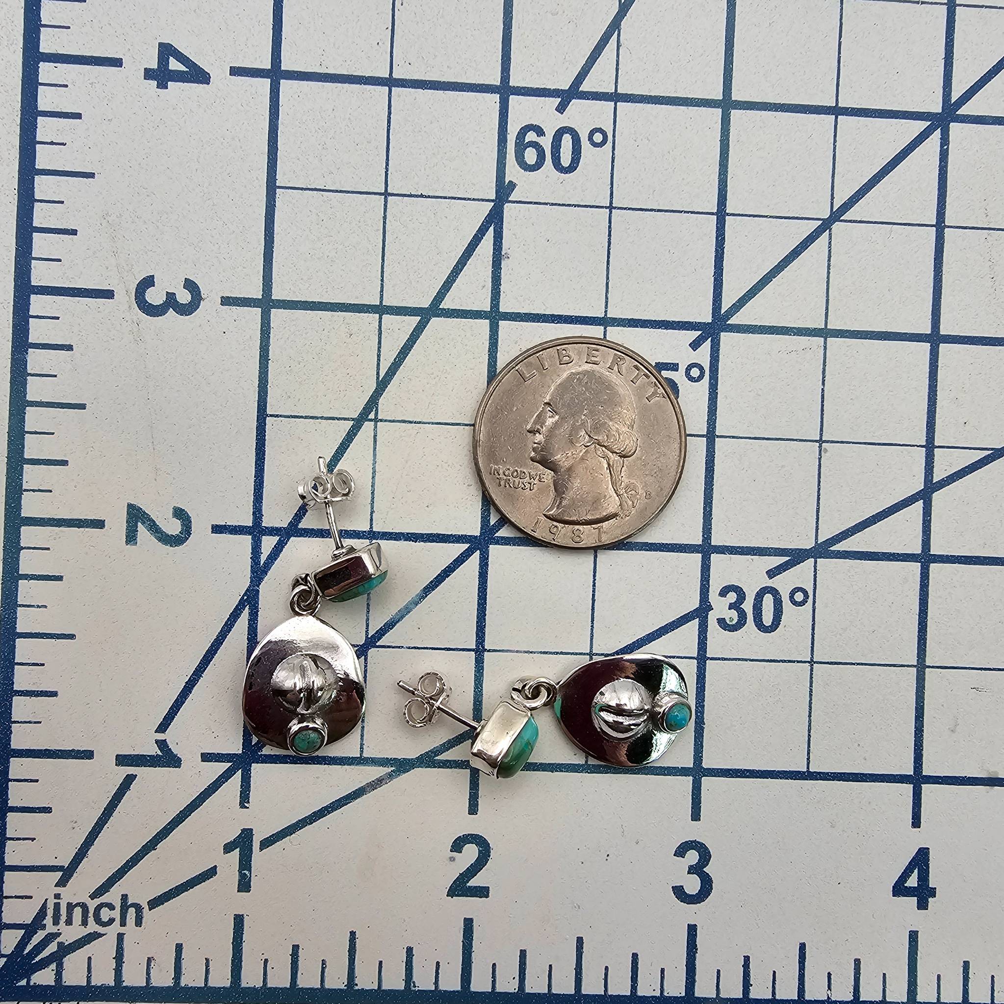 Sterling silver earrings from the Hada Collection featuring Kingman turquoise stones and a cowboy hat design. They weigh approximately 5.8 grams and have post backings. Crafted in sterling silver, these earrings exhibit a polished finish and a southwestern style. Excellent condition with minimal signs of use.