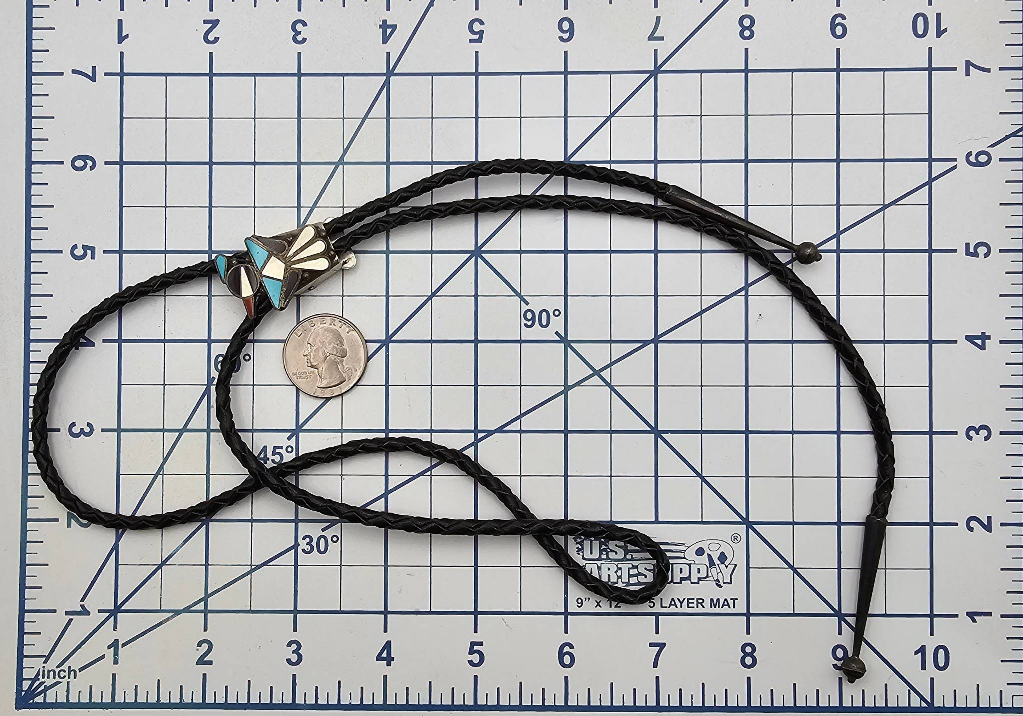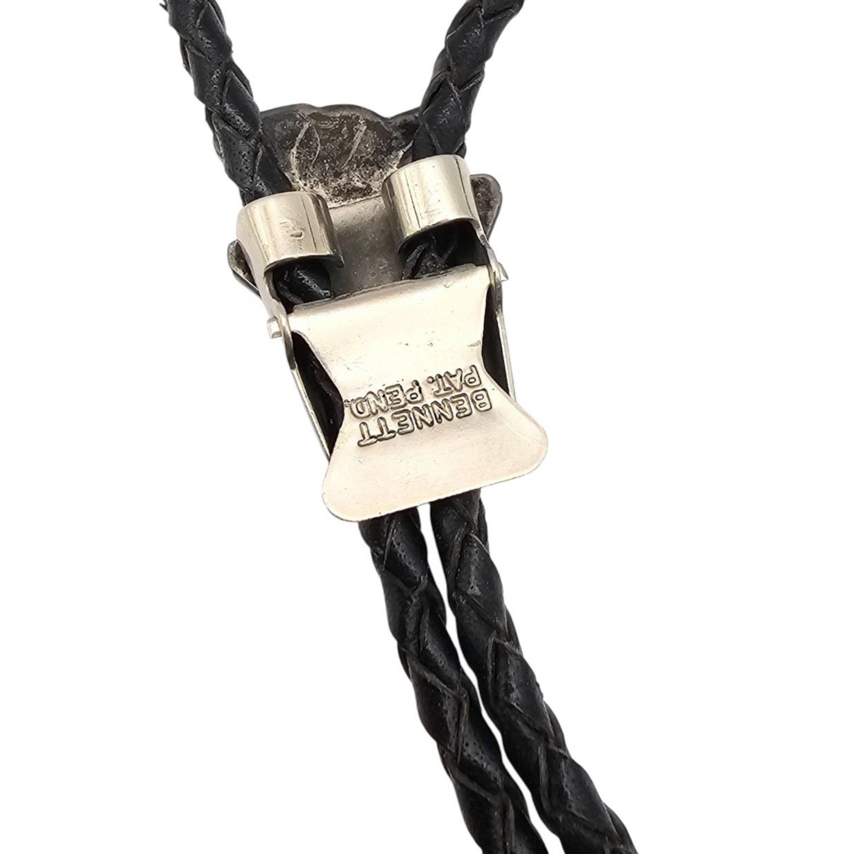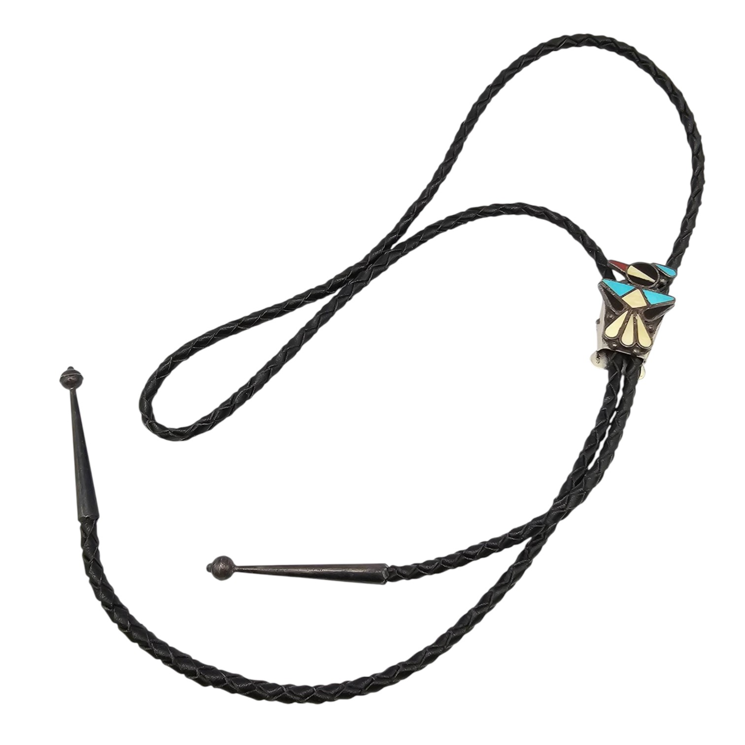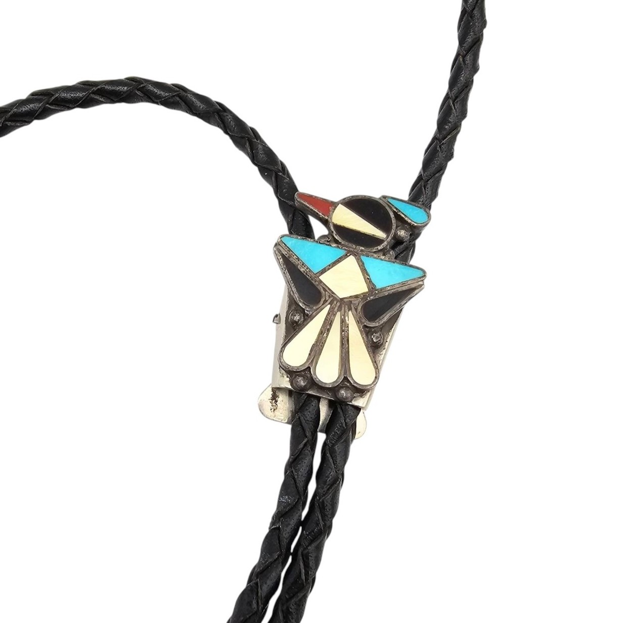 Zuni sterling silver bolo tie featuring a thunderbird design inlaid with mother-of-pearl (MOP), turquoise, and onyx. The slide is stamped ‘Bennett Pat. Pend.’ and is in good condition. The braided leather cord has metallic tips and measures approximately 36 inches long. Total weight is 18.8 grams.