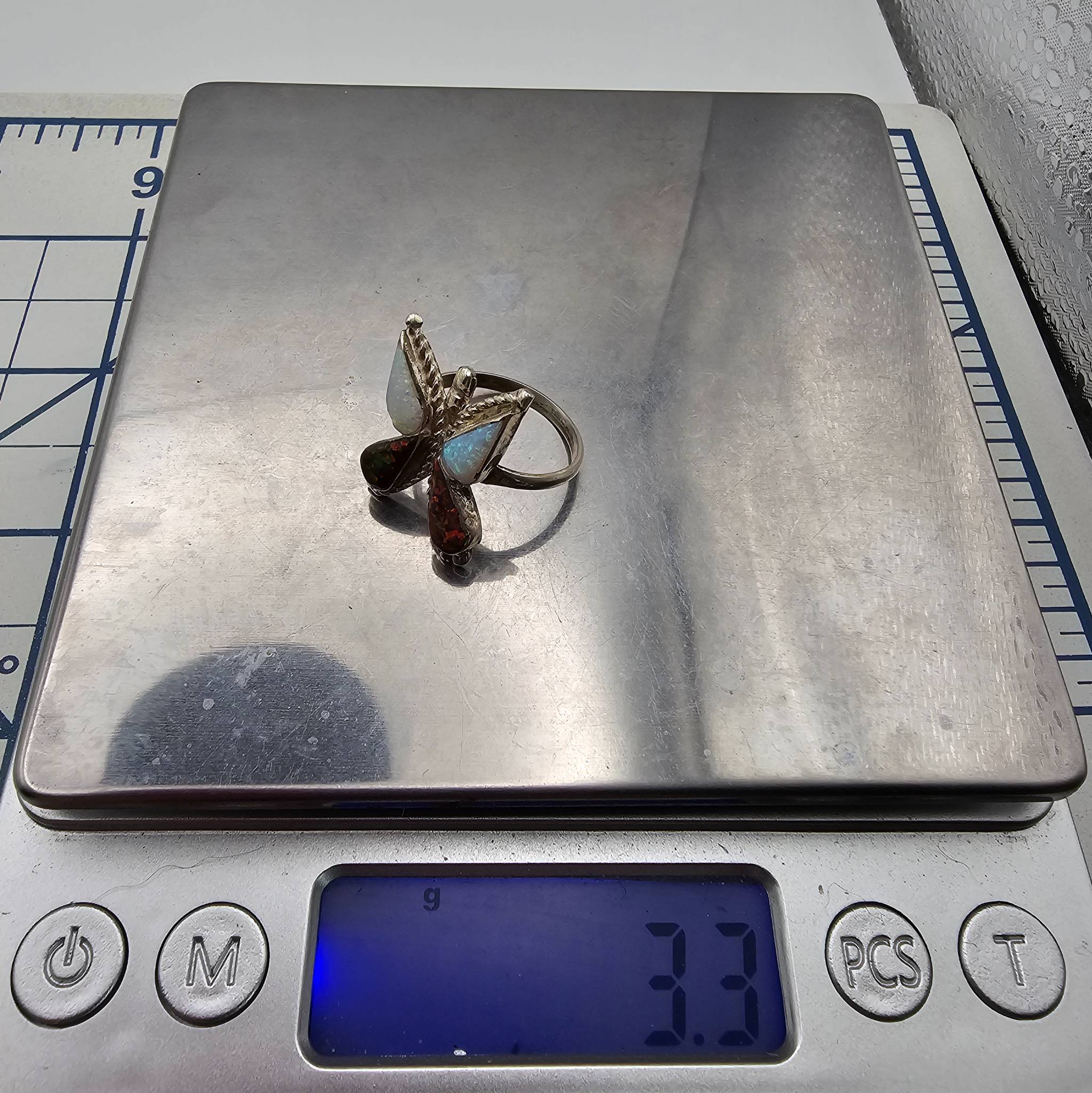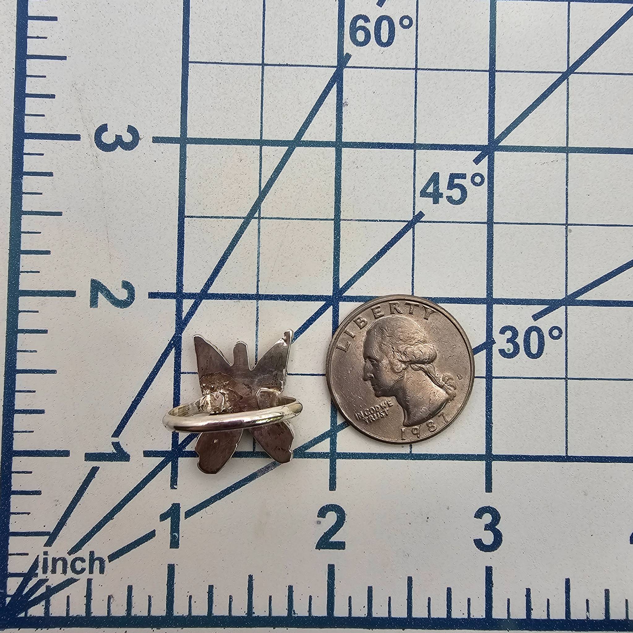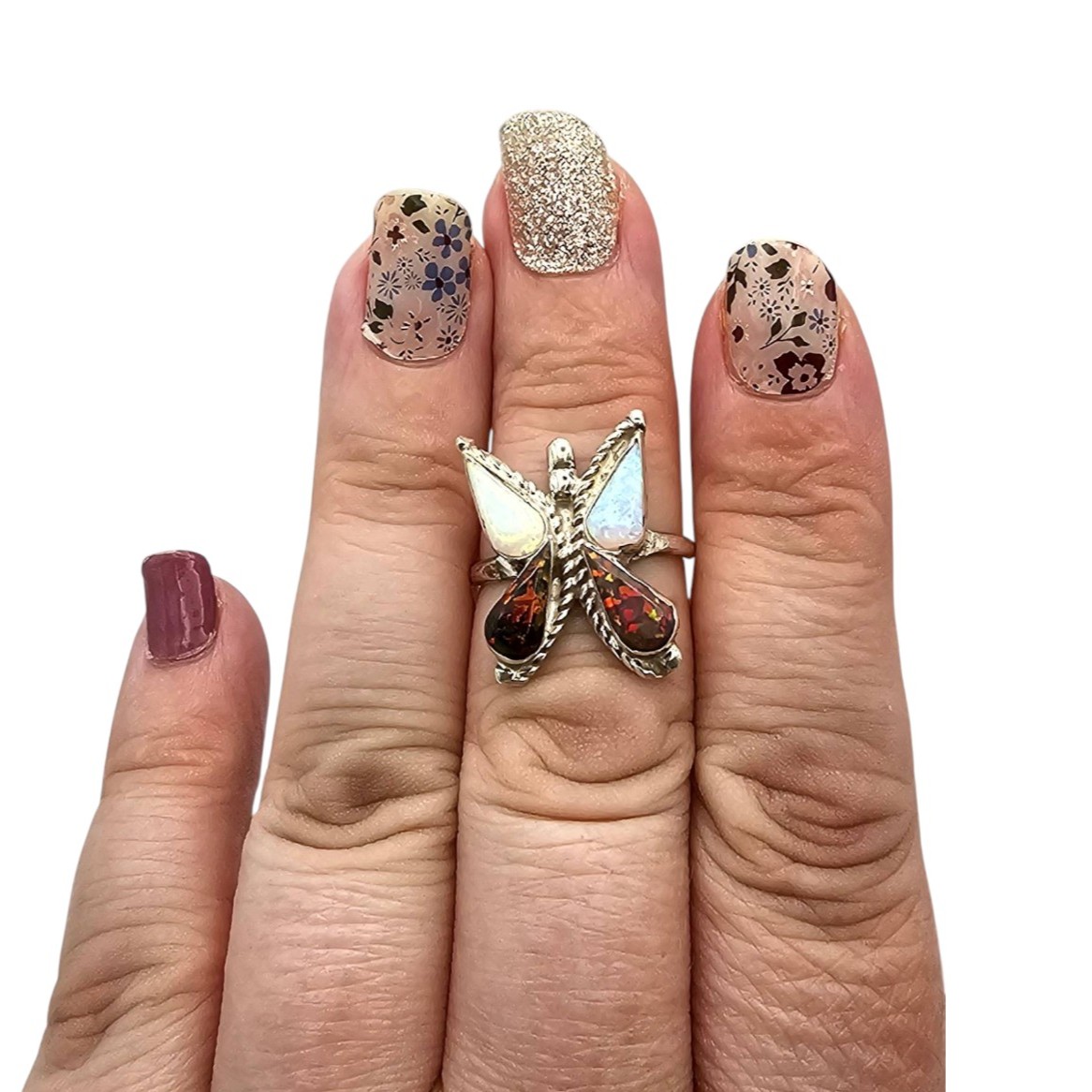 A sterling silver handmade butterfly design ring by Swain Charlie from the Zuni artisans. The ring features inlaid opal stones with intricate silver detailing. It is size 6.5 and weighs approximately 3.3 grams.