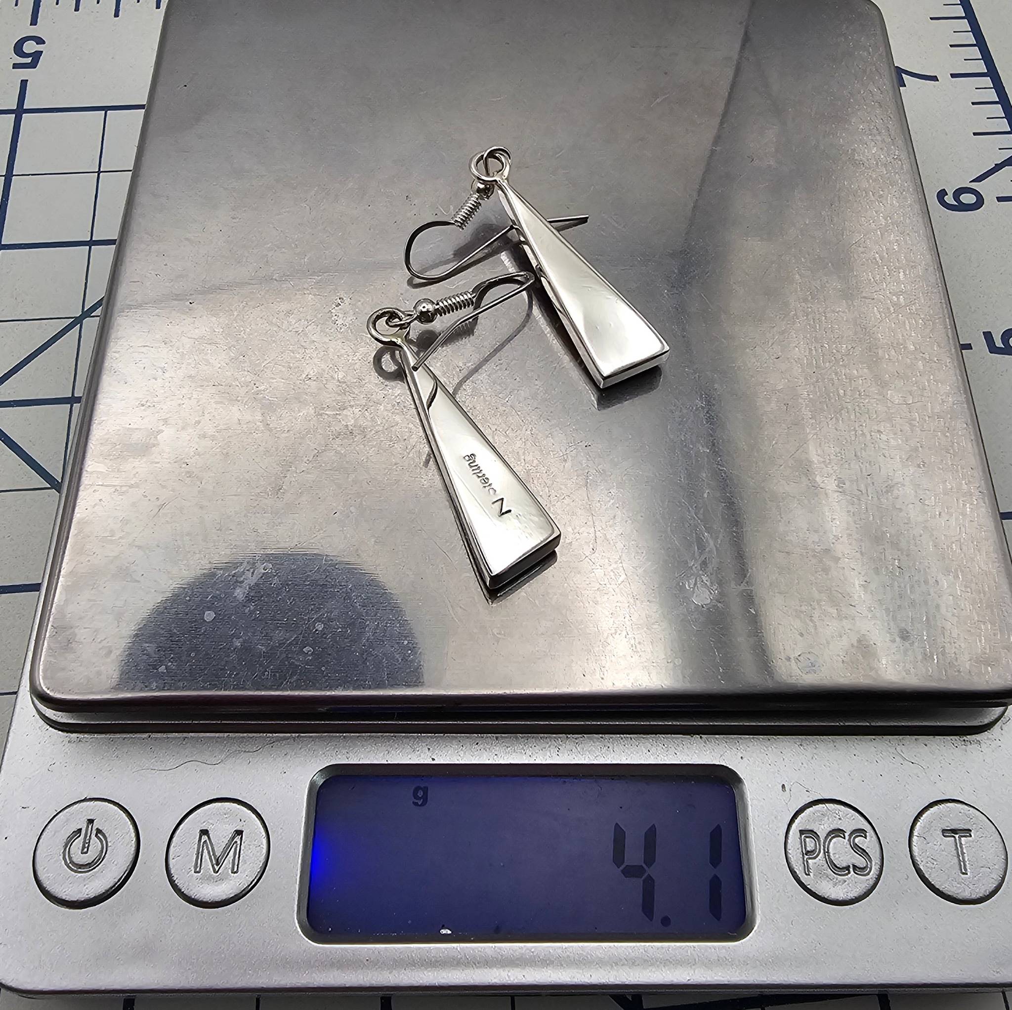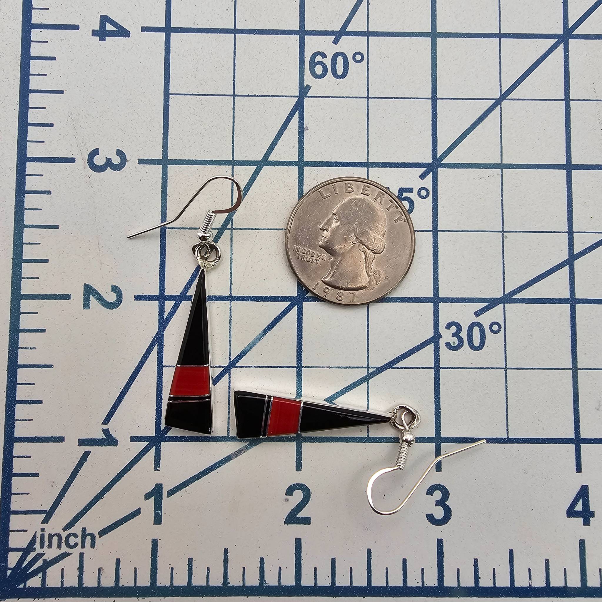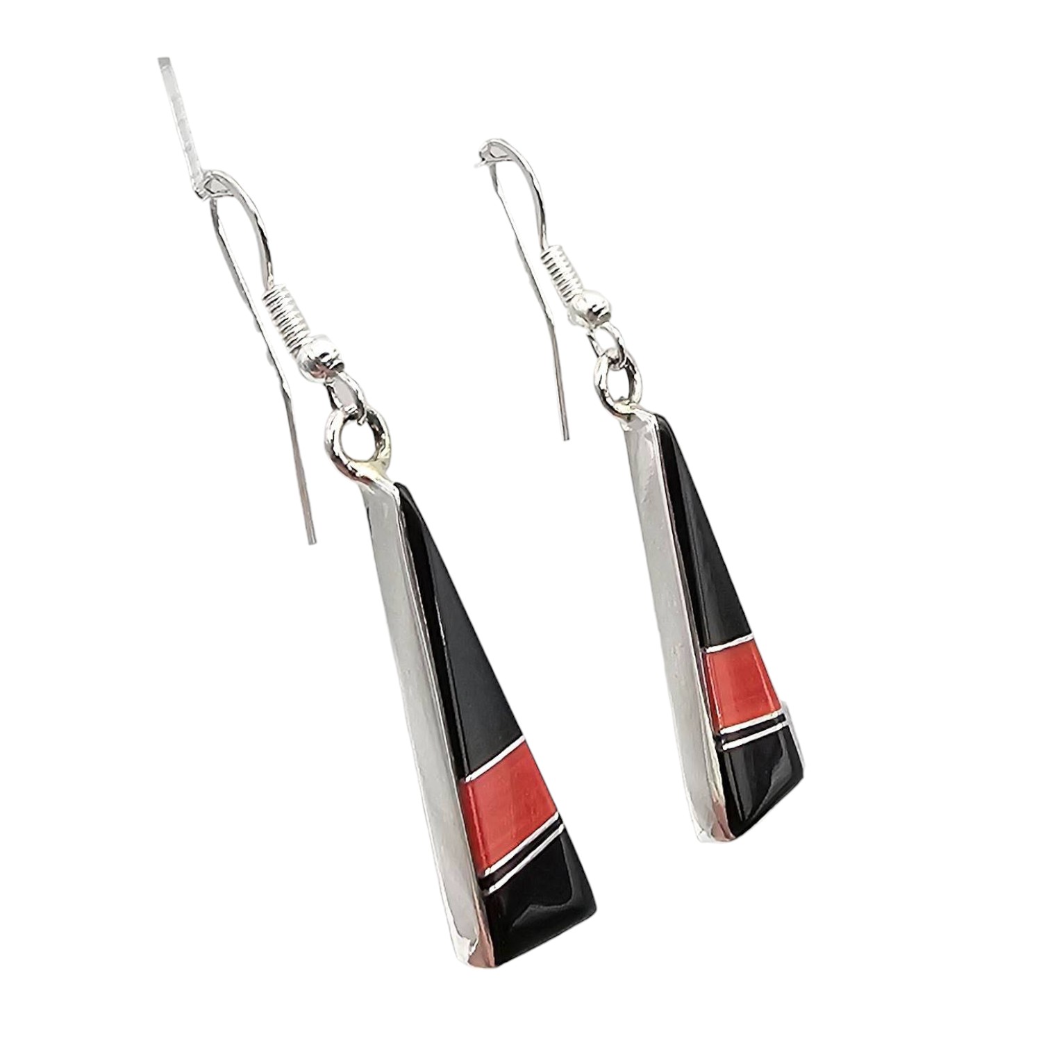 Each earring features a tapered design with inlaid multi-stone elements, primarily black onyx and coral accents. The earrings measure approximately 2 inches in length, including the hooks, and weigh 4.1 grams in total. Signed ‘N’ and marked sterling.
