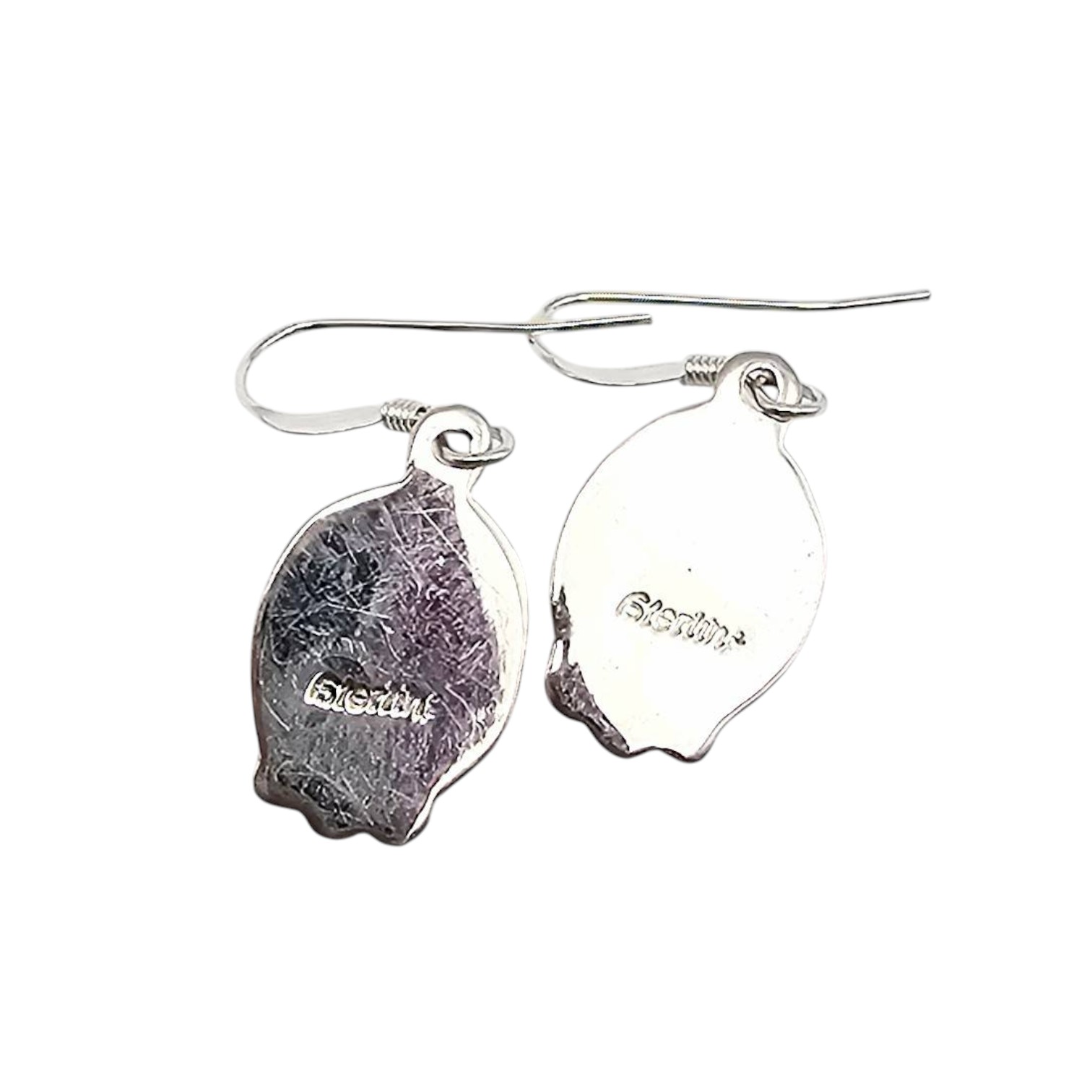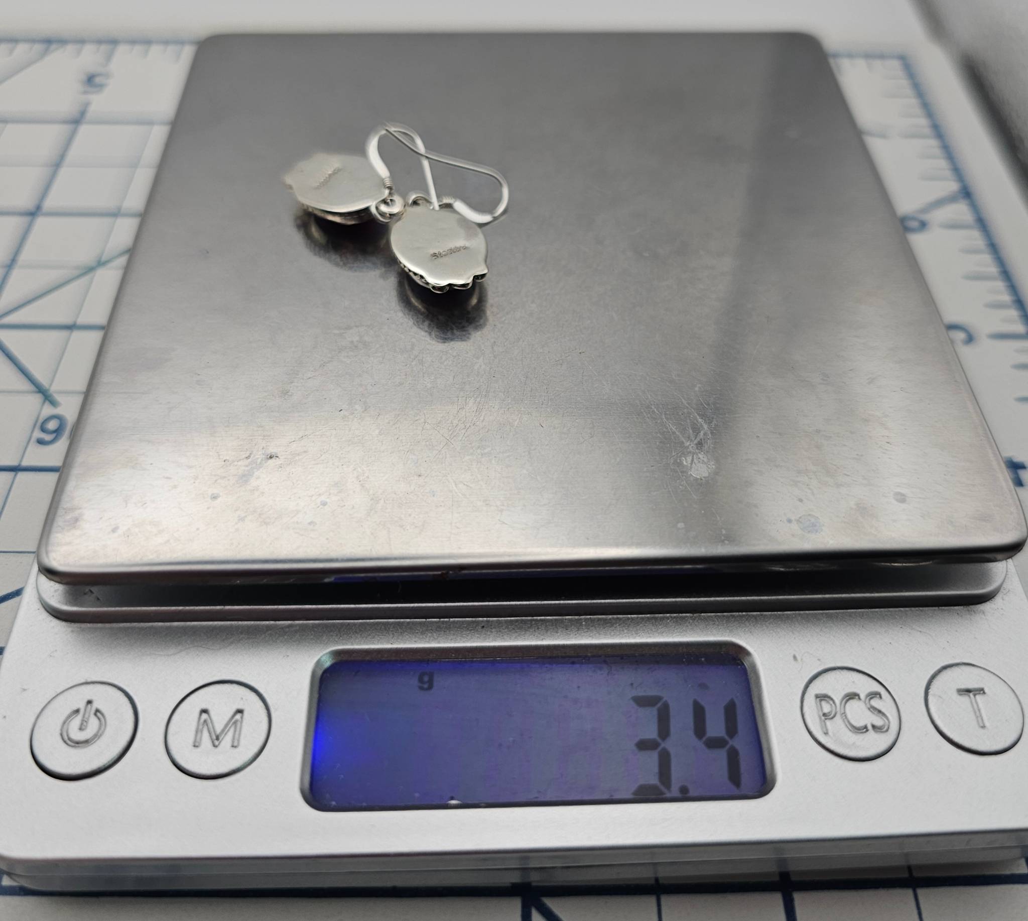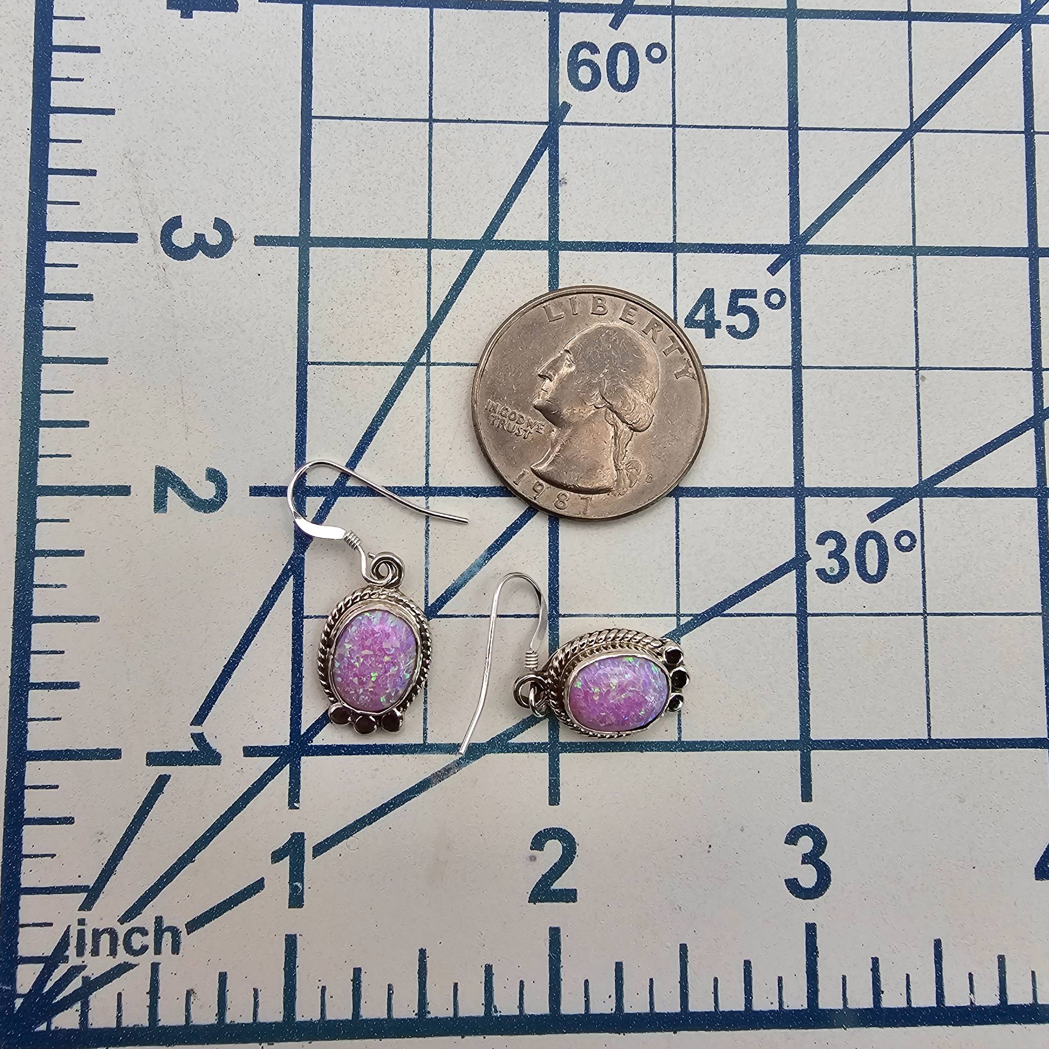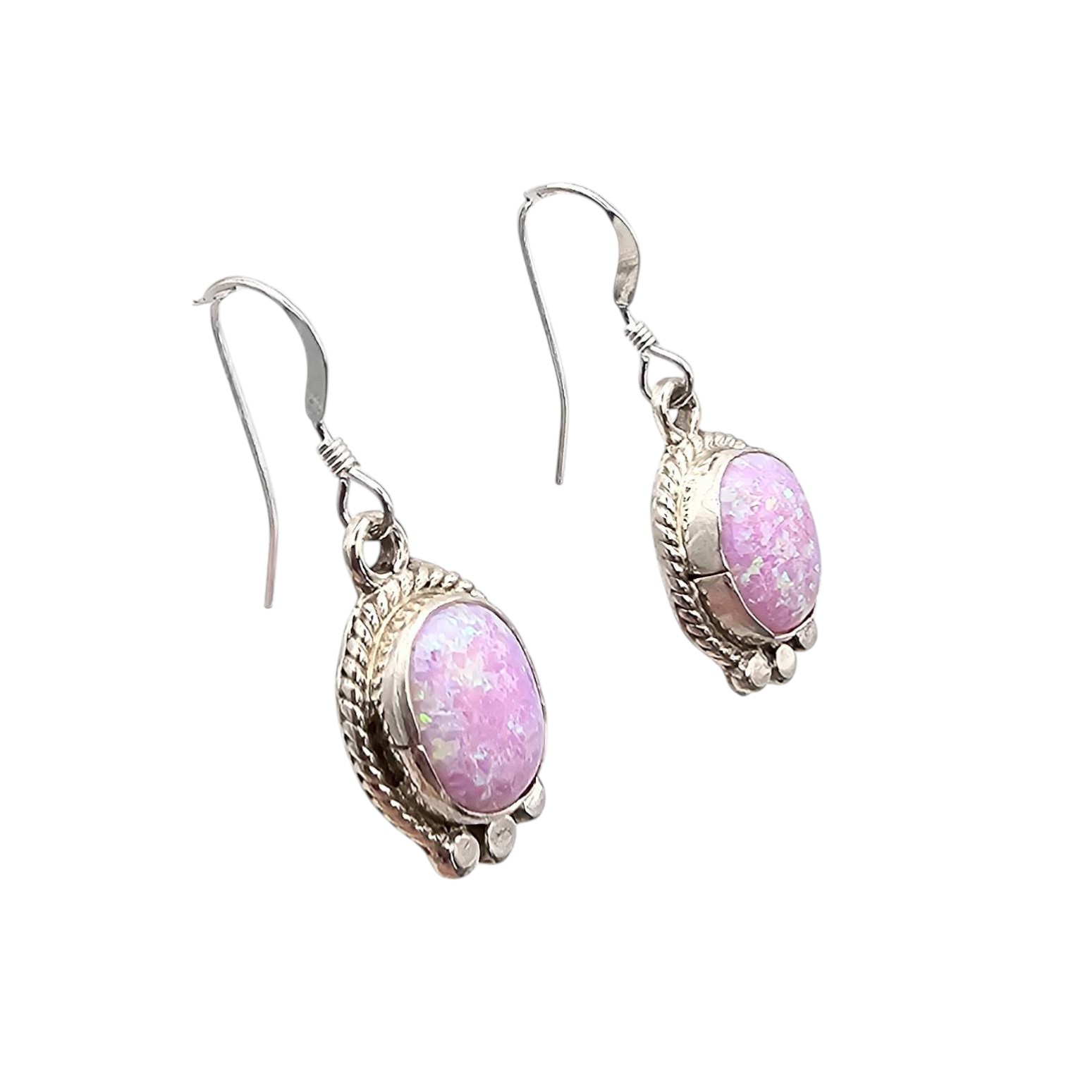 Earrings handmade by Navajo artist Sharon McCarthy, featuring sterling silver and pink opal cabochons. The earrings display an intricate rope-like border design and three polished silver accents beneath the opal. Stamped with an artist’s mark on the reverse. The earrings weigh approximately 3.4 grams combined. Each earring hangs from a sterling silver hook.