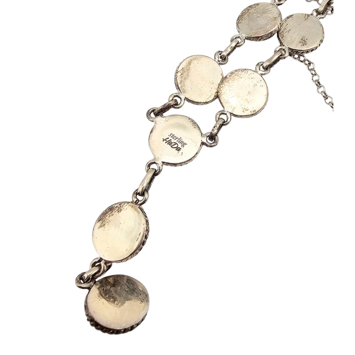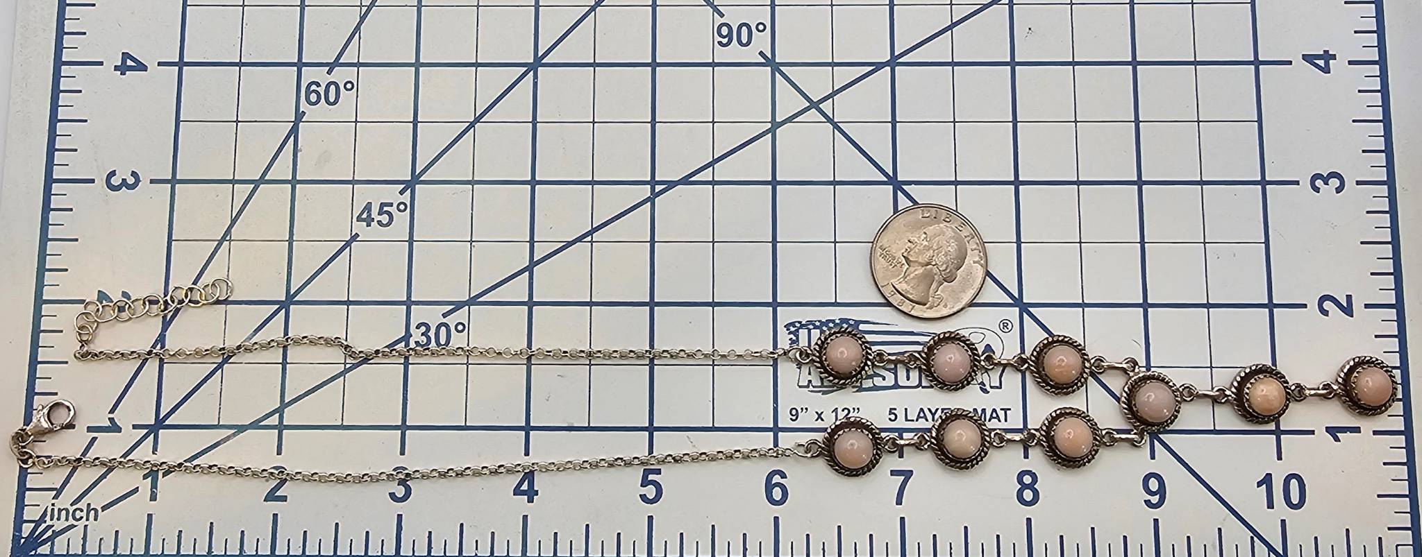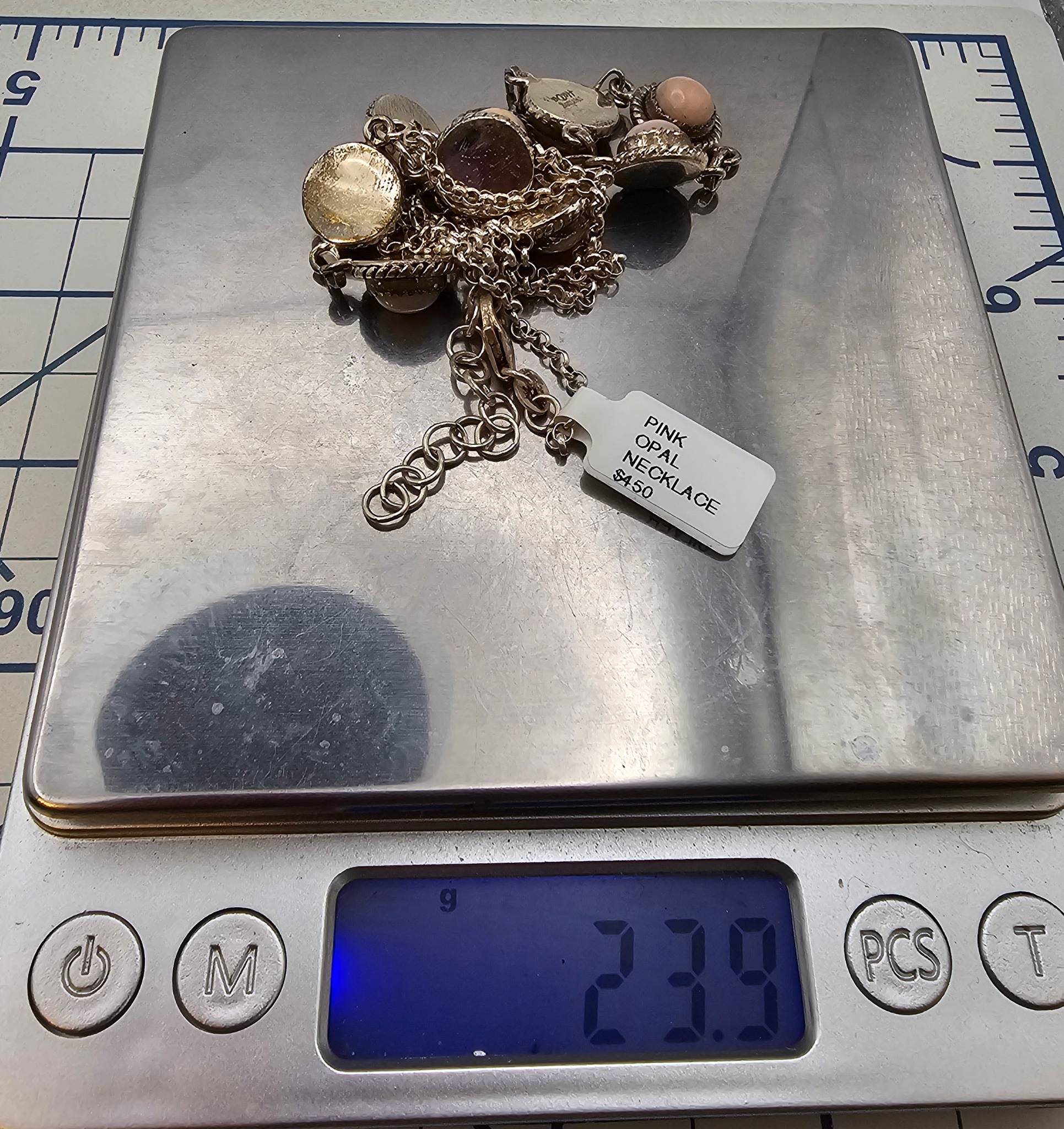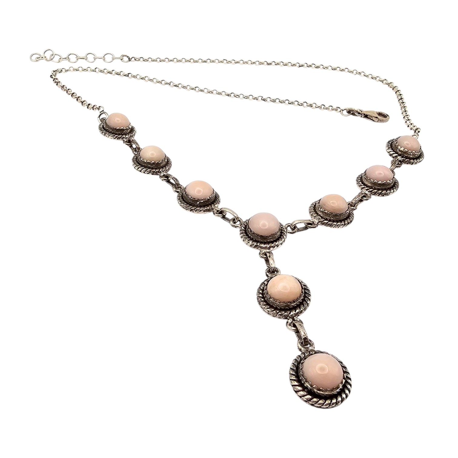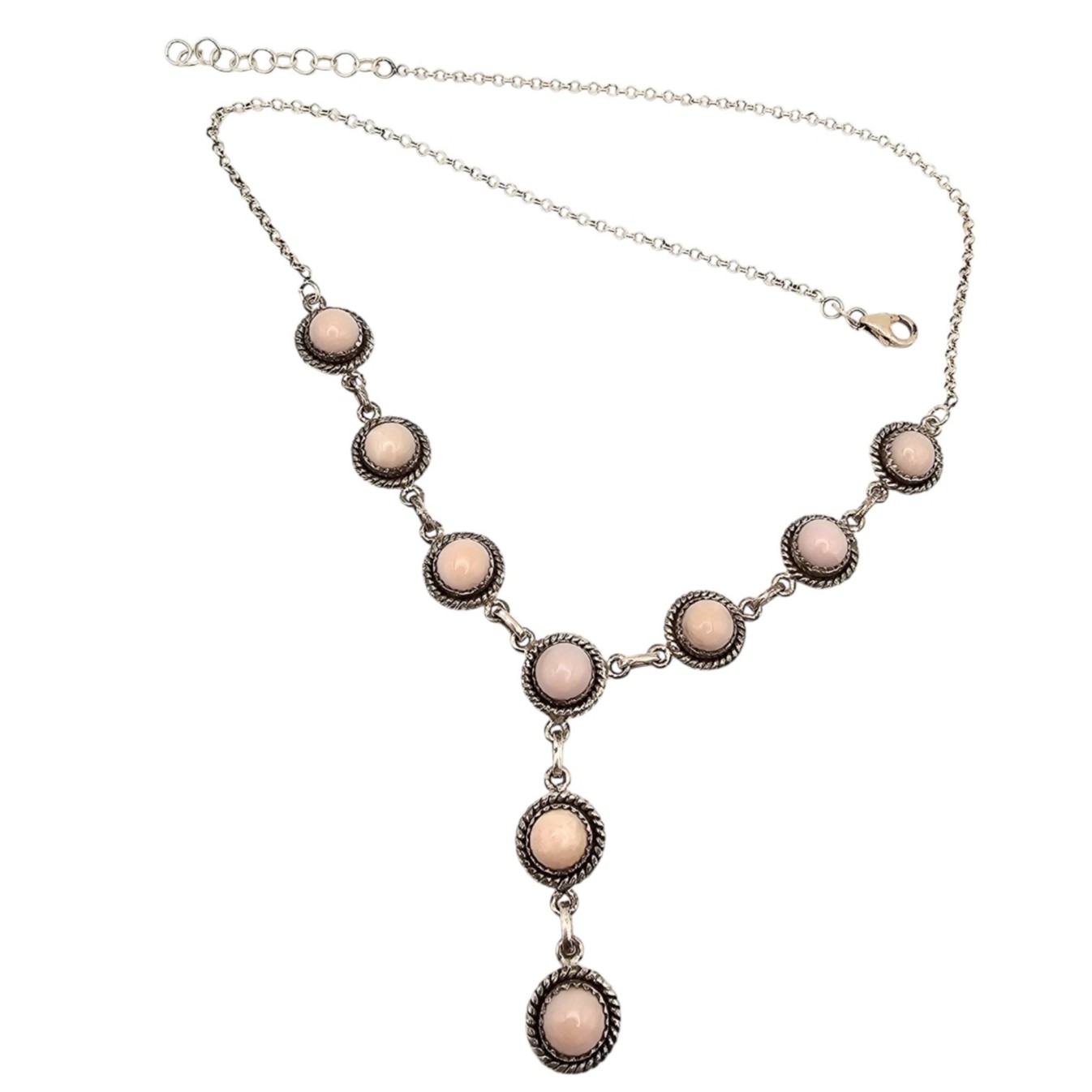 Hada Collection pink opal necklace set in sterling silver. Features multiple pink opal stones with detailed settings arranged in a drop-style design. Necklace weighs 23.9 grams as shown. Includes a chain with a clasp for secure wear. Very good condition with no visible damage to the stones or metal.