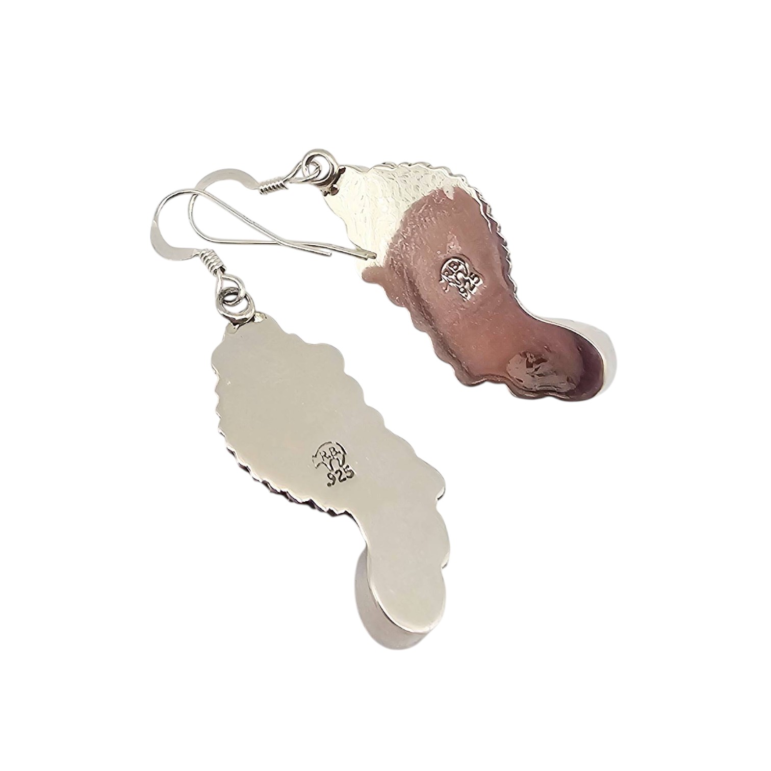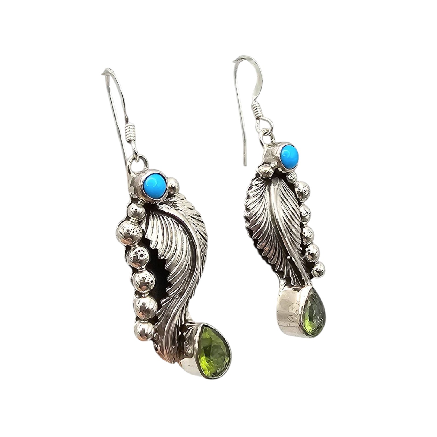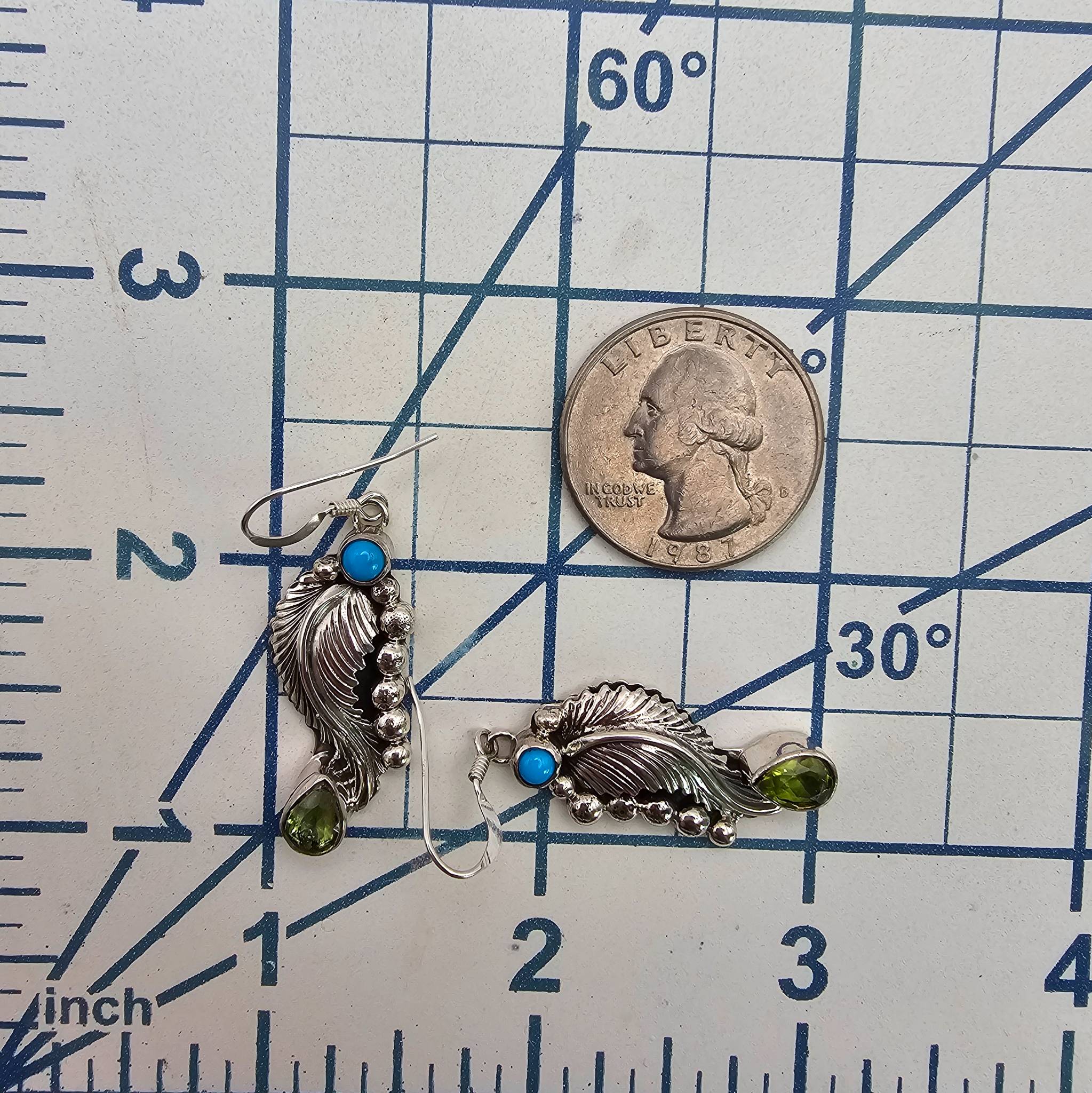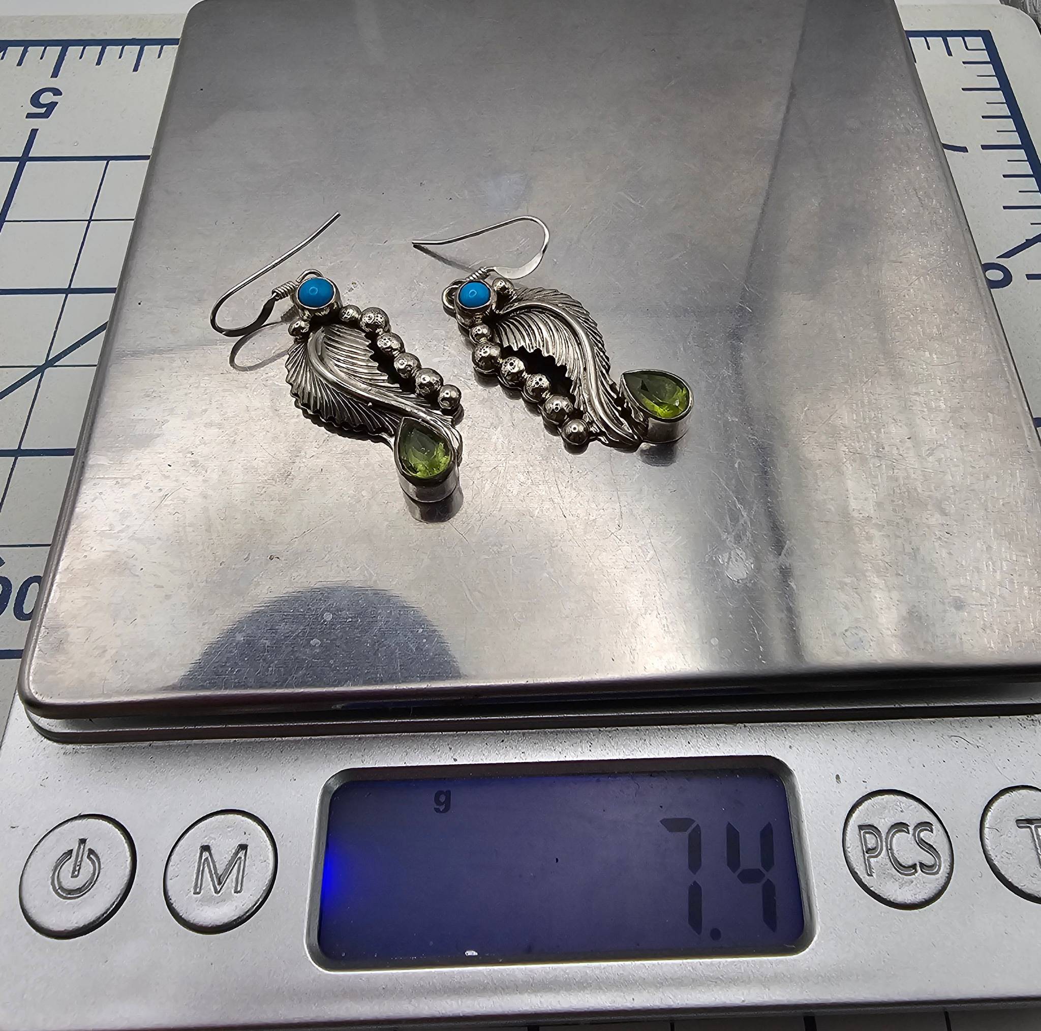 Handmade Navajo sterling silver earrings by artisan Mike Smith, featuring Kingman turquoise and peridot gemstones. The earrings are stamped ‘ ‘ and an artisan hallmark on the reverse. Weighing 7.4 grams collectively, they measure approximately 1.75 inches in length.