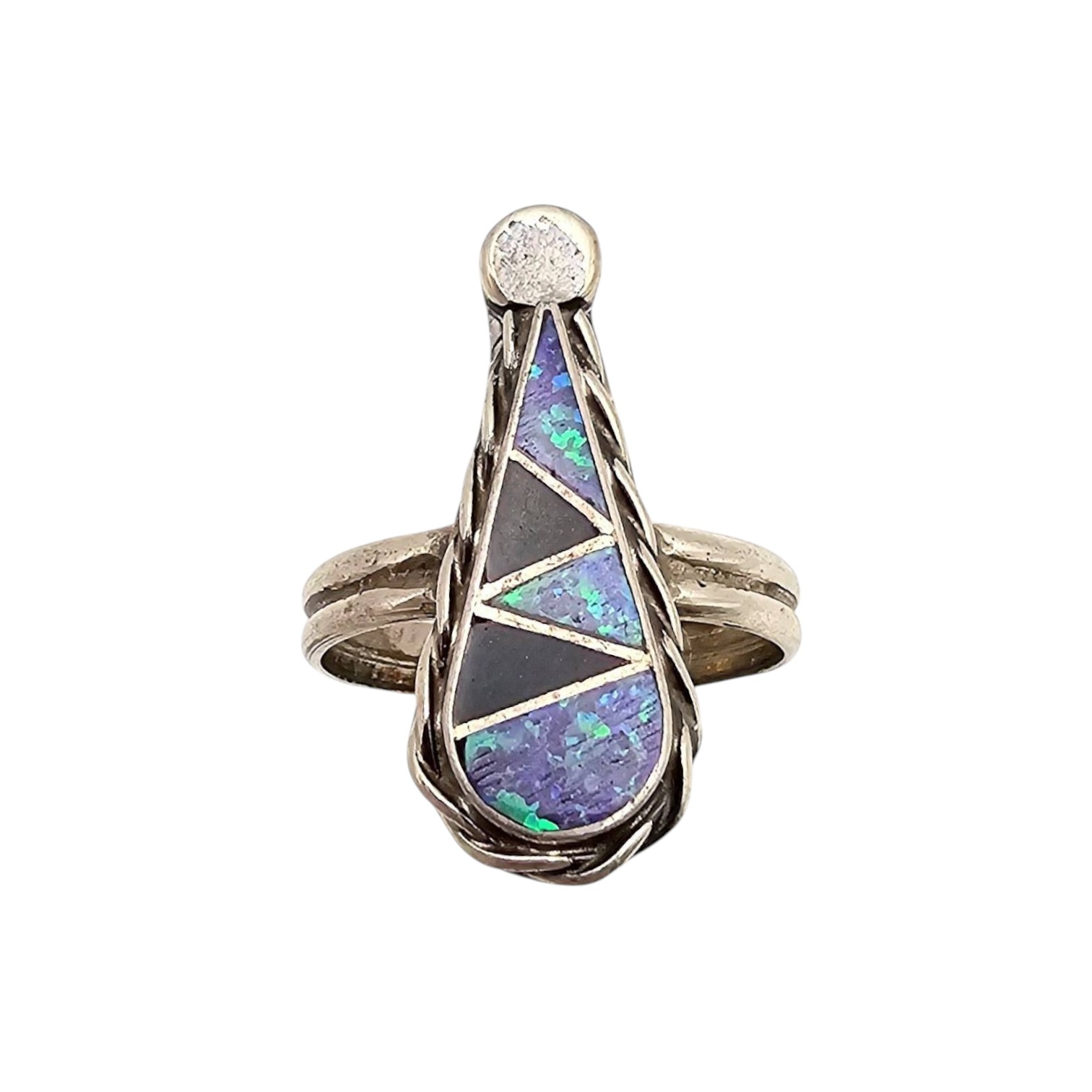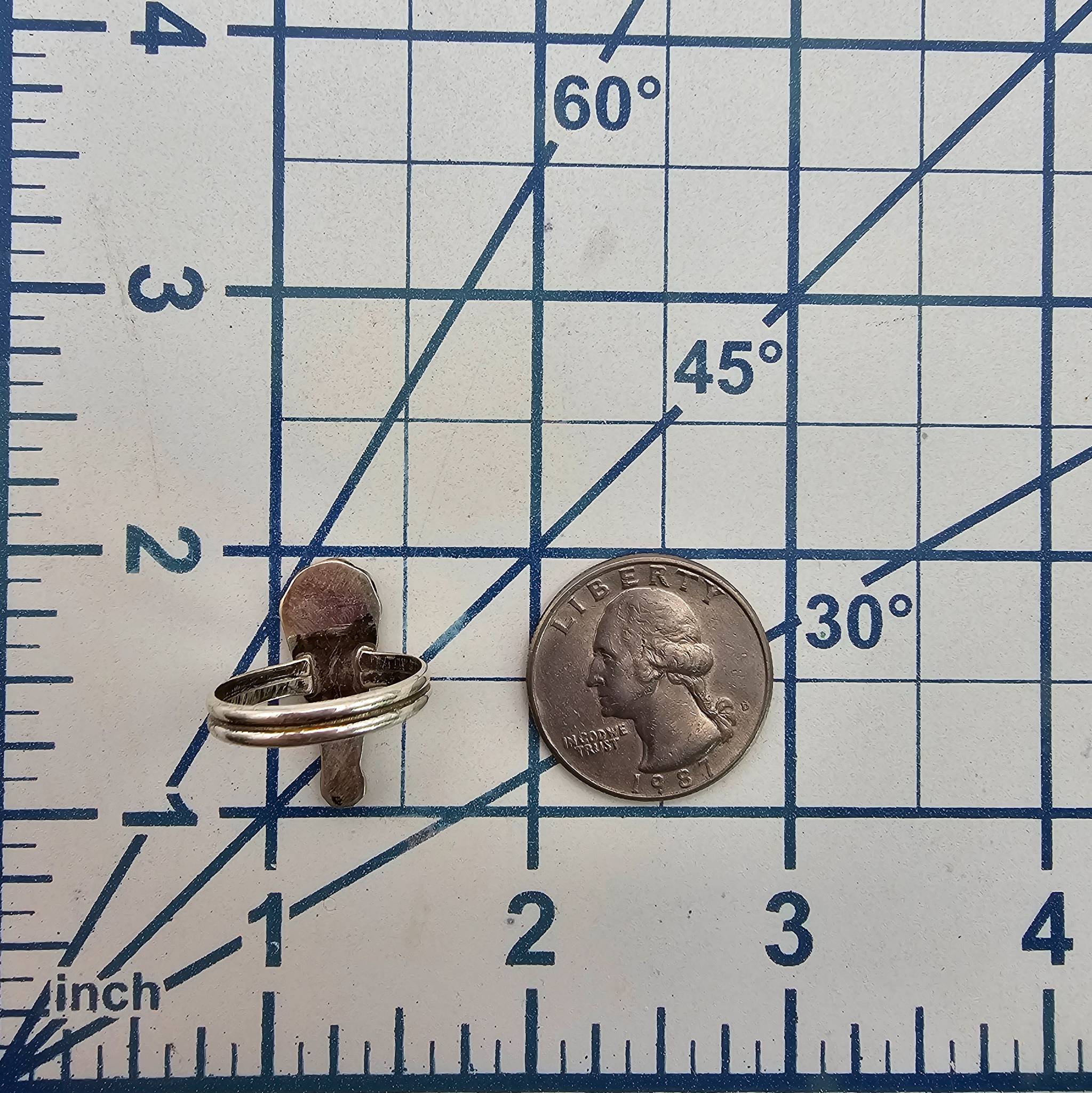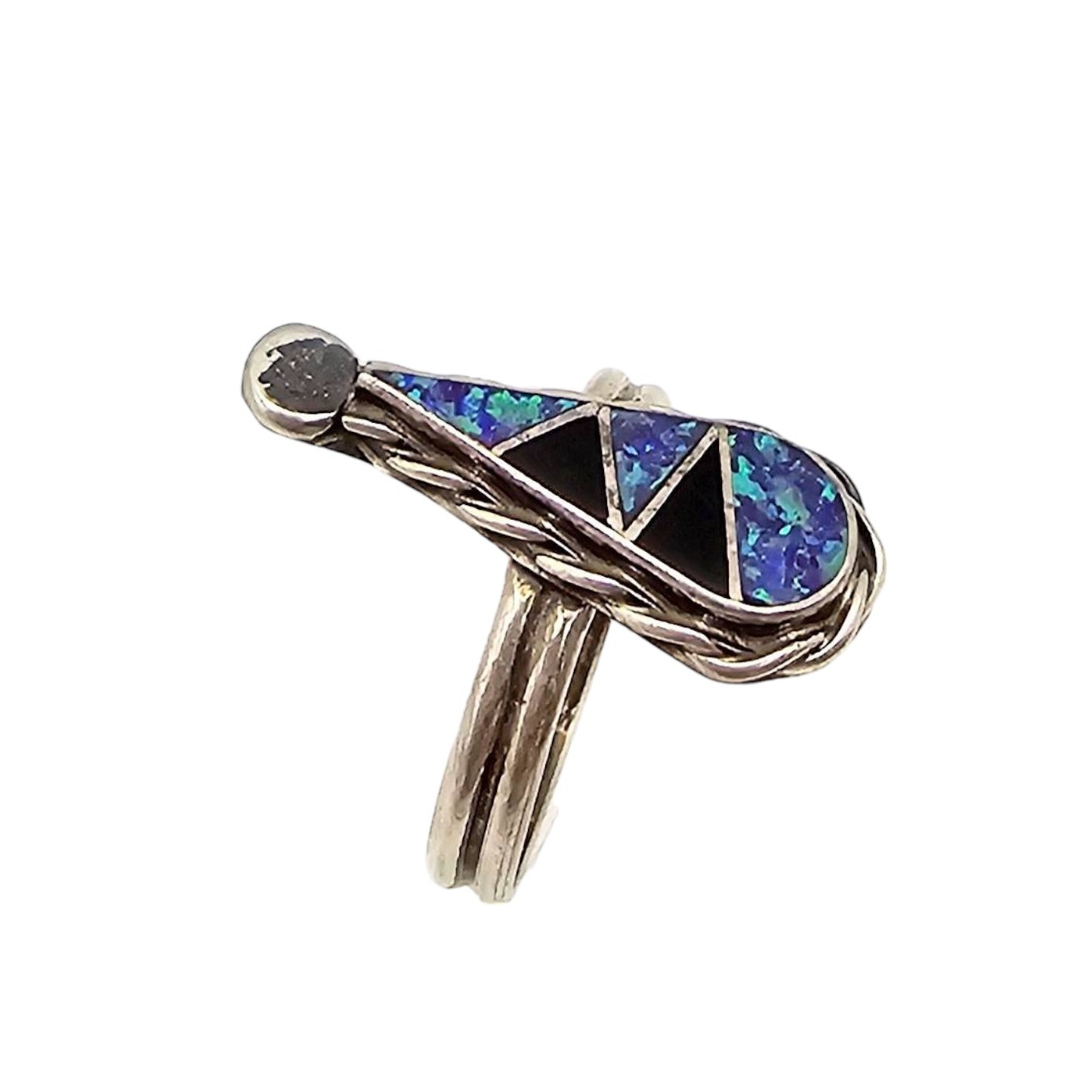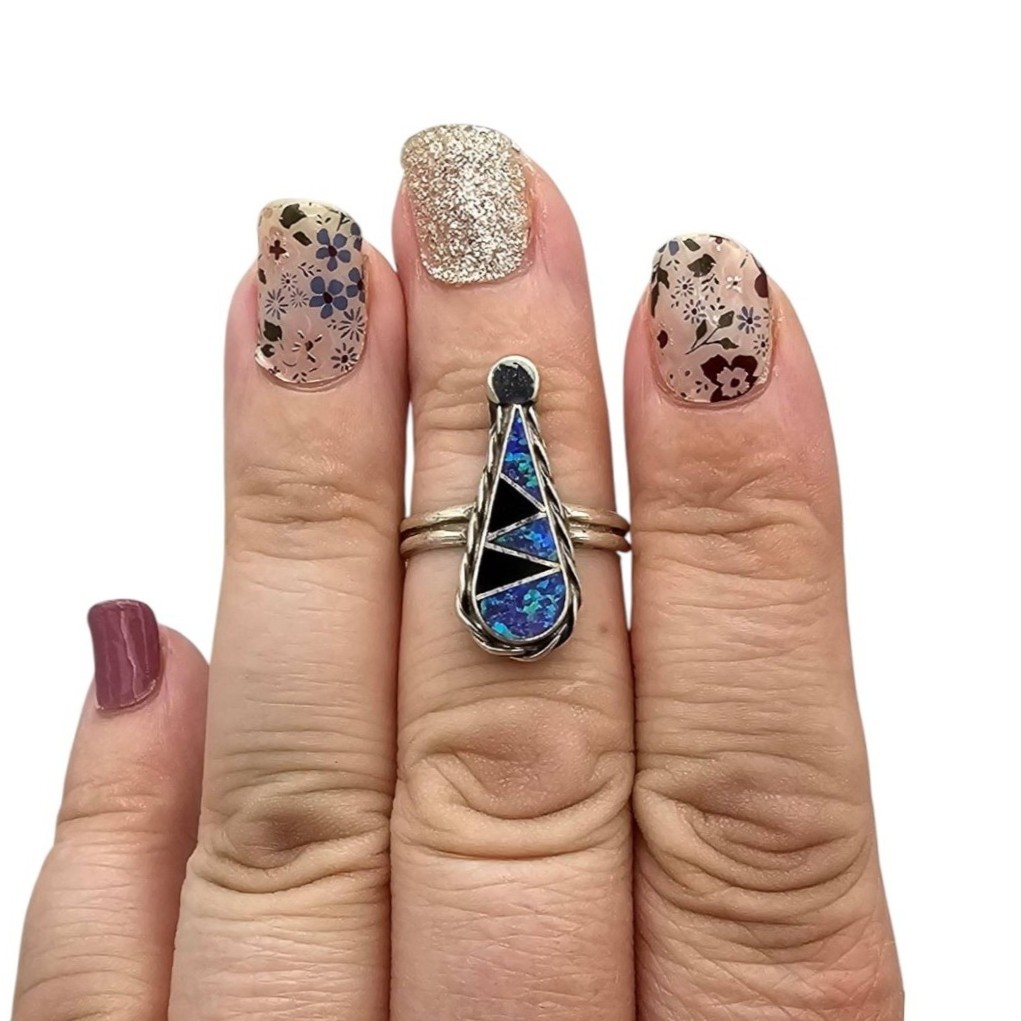 Handmade sterling silver ring by Zuni artist Charlie Swain. Features a multicolor inlay design with geometric patterns in vibrant blue, black, and green hues. The ring weighs approximately 2.7 grams and is a size 7. The retail price tag lists $85 for reference.