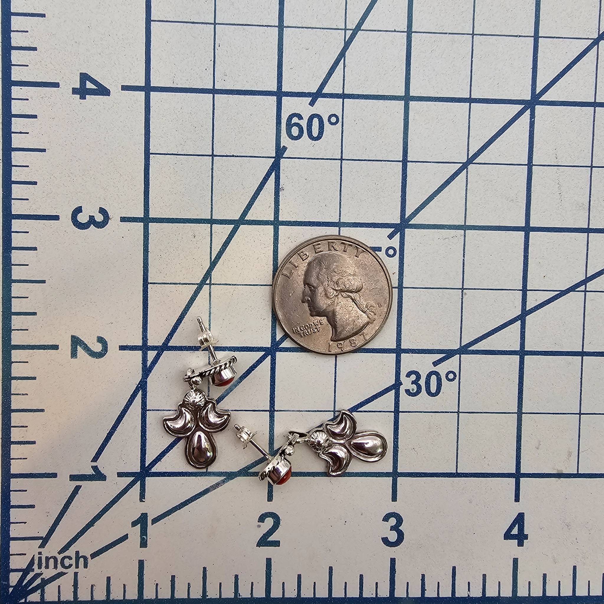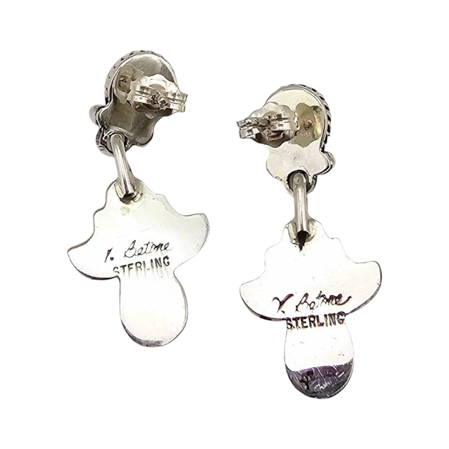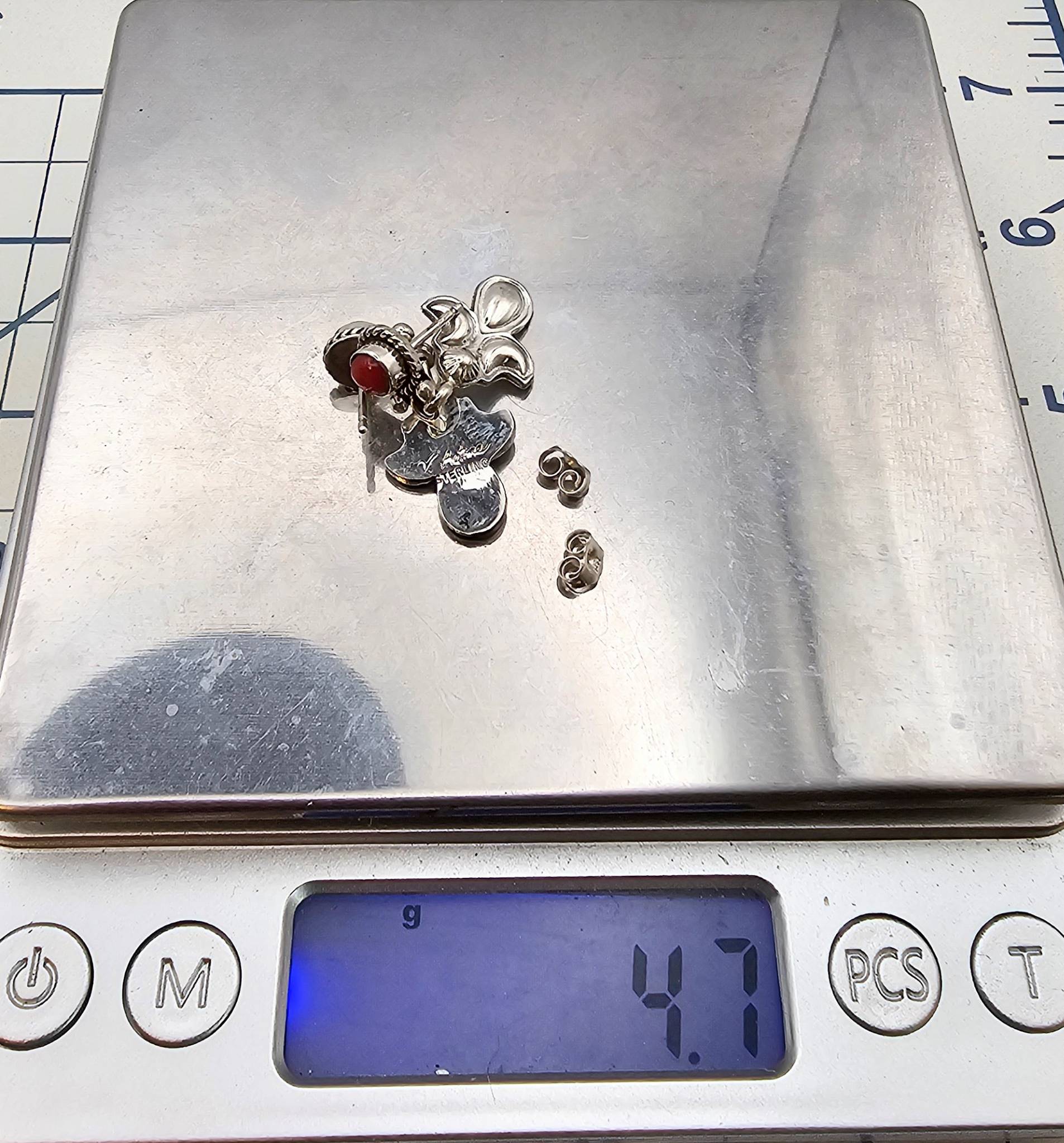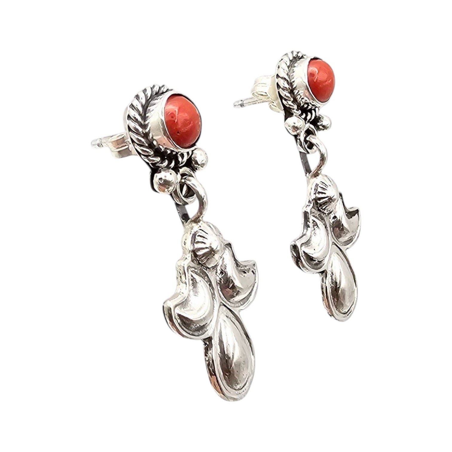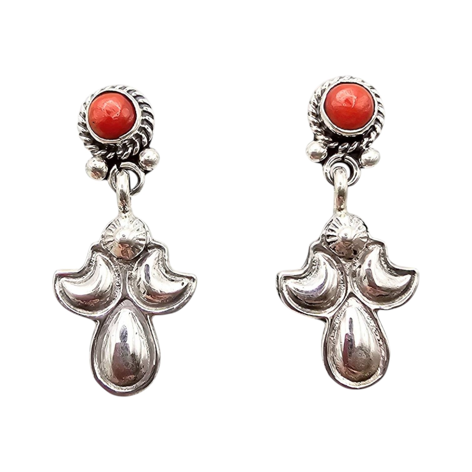 Handcrafted sterling silver earrings by Navajo artisan Verley Betone. Each earring features a red coral cabochon set in a bezel with a rope pattern accent. The dangle design has floral-inspired sterling silver elements. Marked ‘V. Betone’ and ‘STERLING’ on the back. Weighs 4.7 grams.