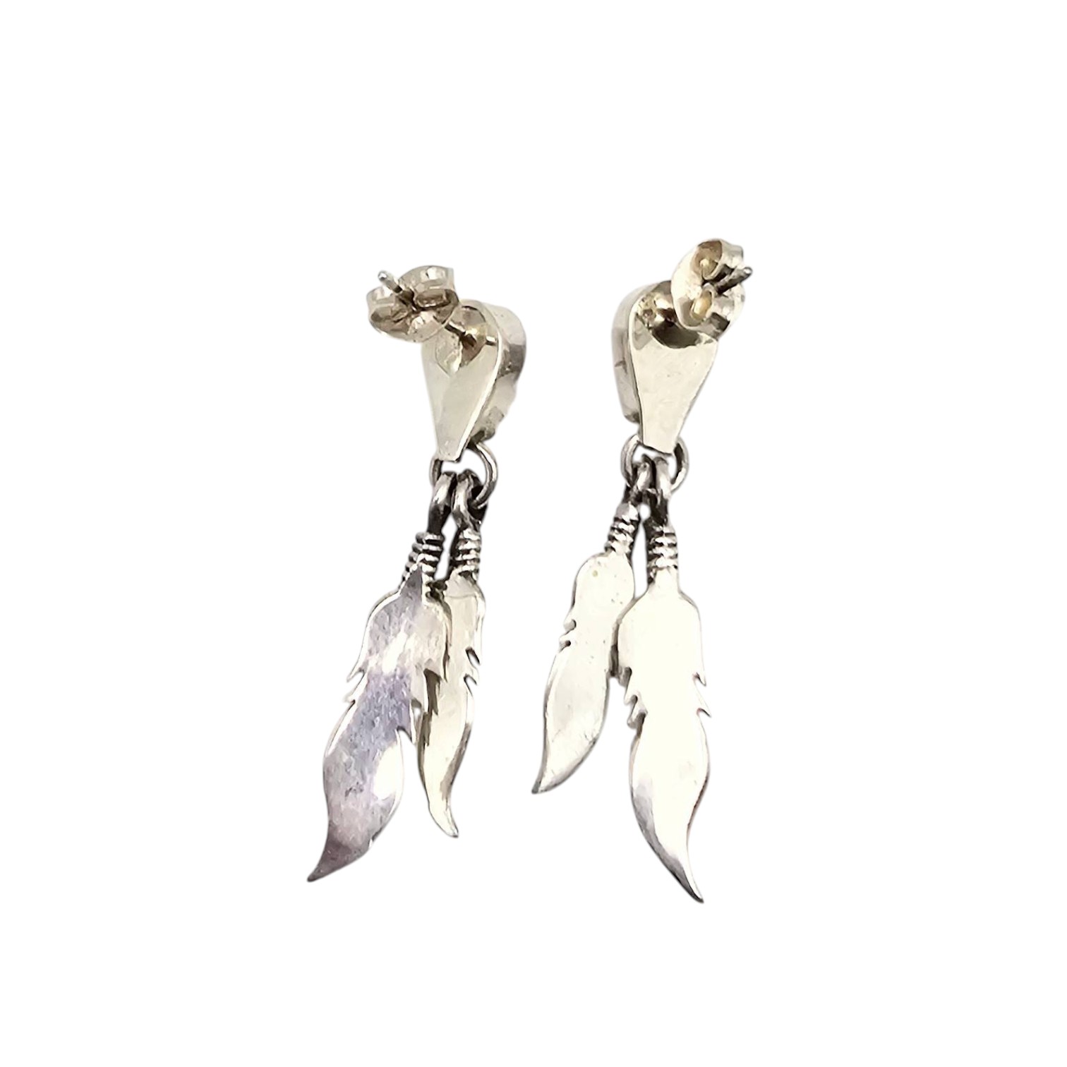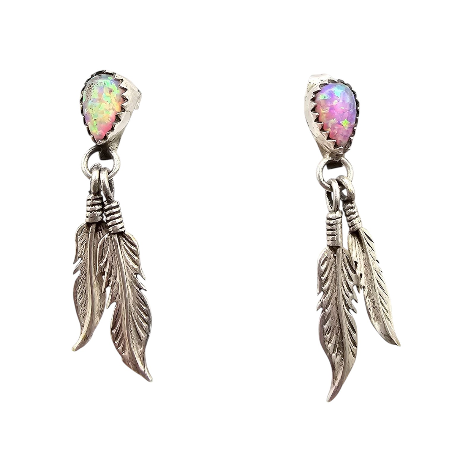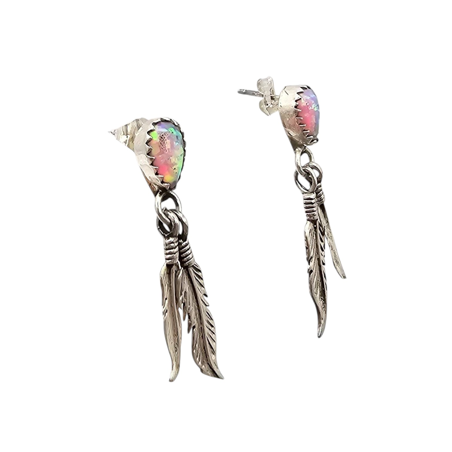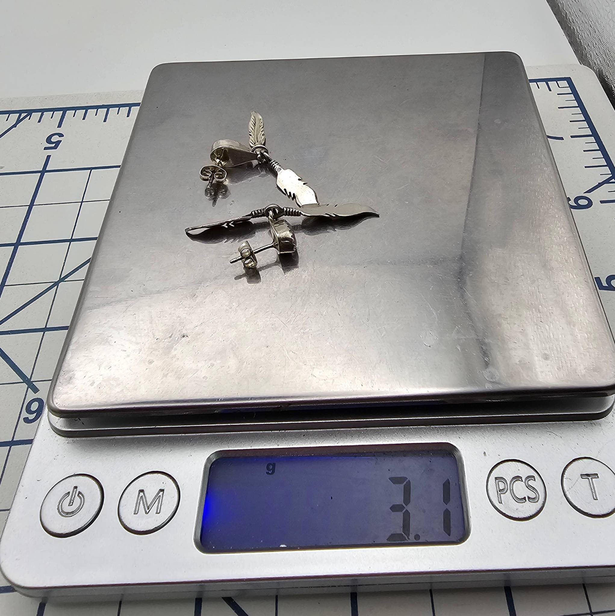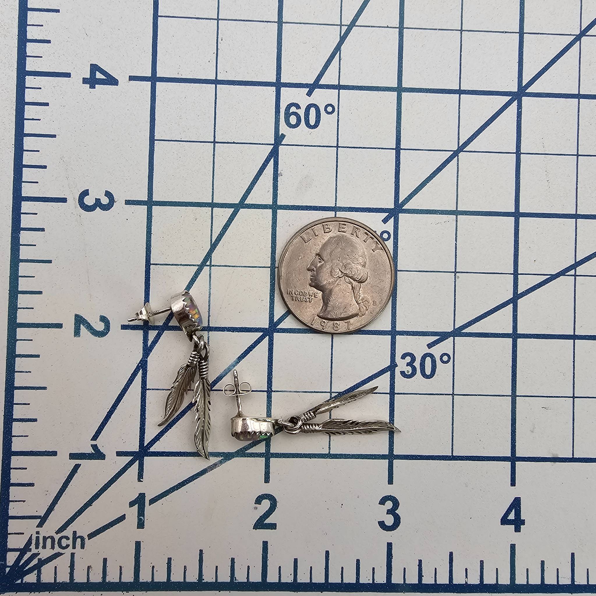 Navajo feather drop earrings featuring sterling silver ( ) and opal cabochons. The design incorporates detailed feather-shaped silver drops. The combined weight of the earrings is 3 grams. Includes post-back closures for secure wear. Estimated dimensions can be referenced using the included scale and ruler images.