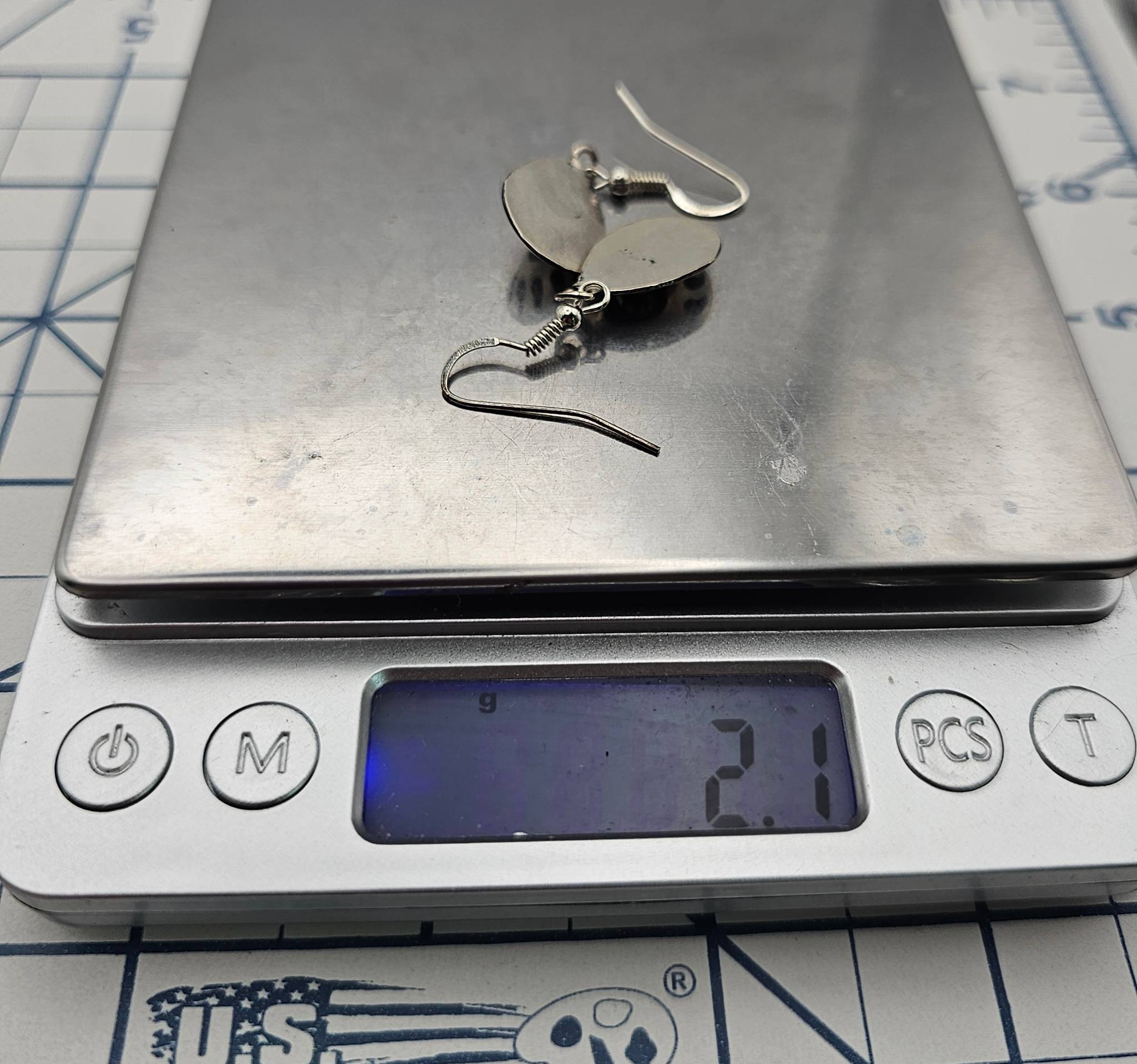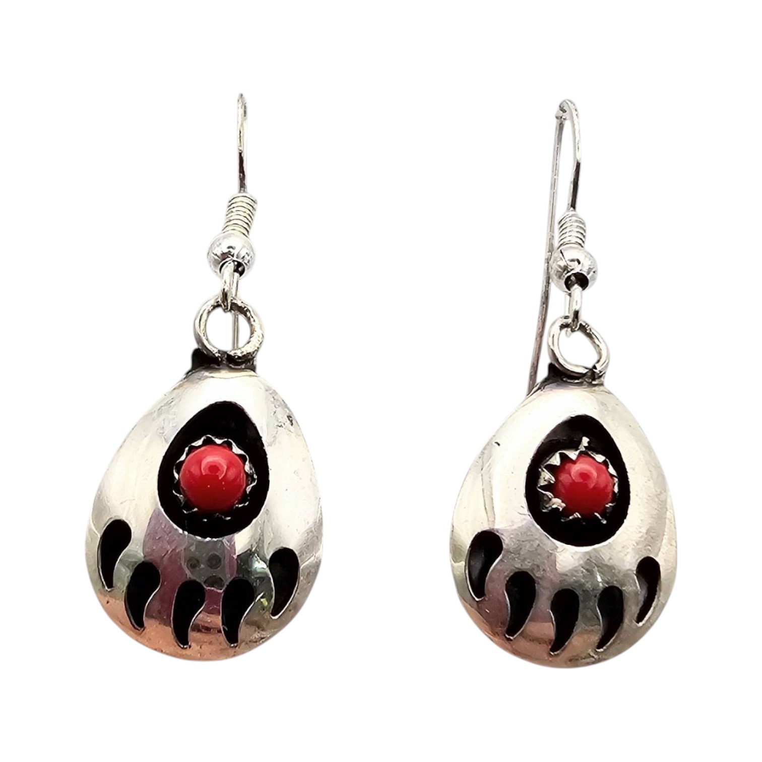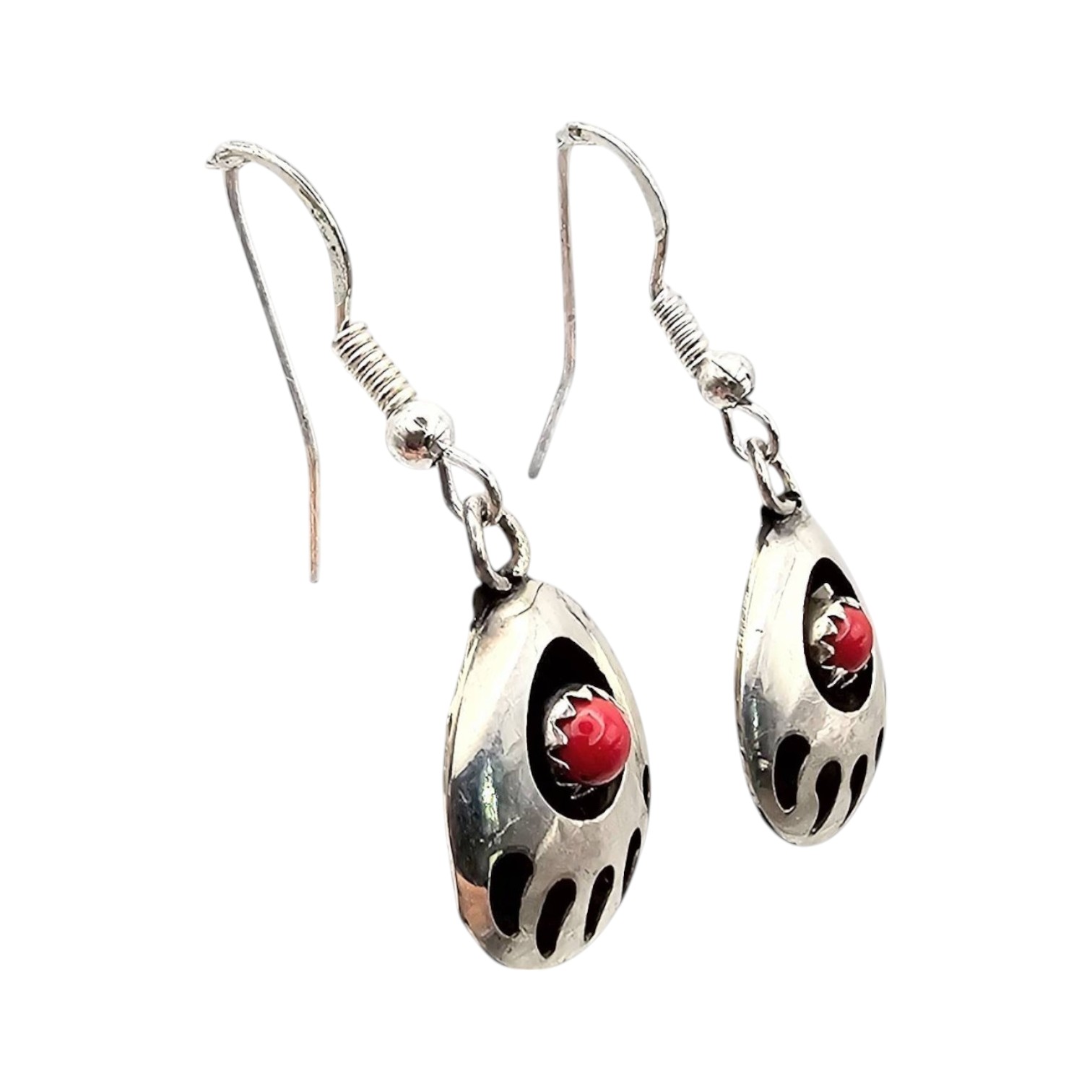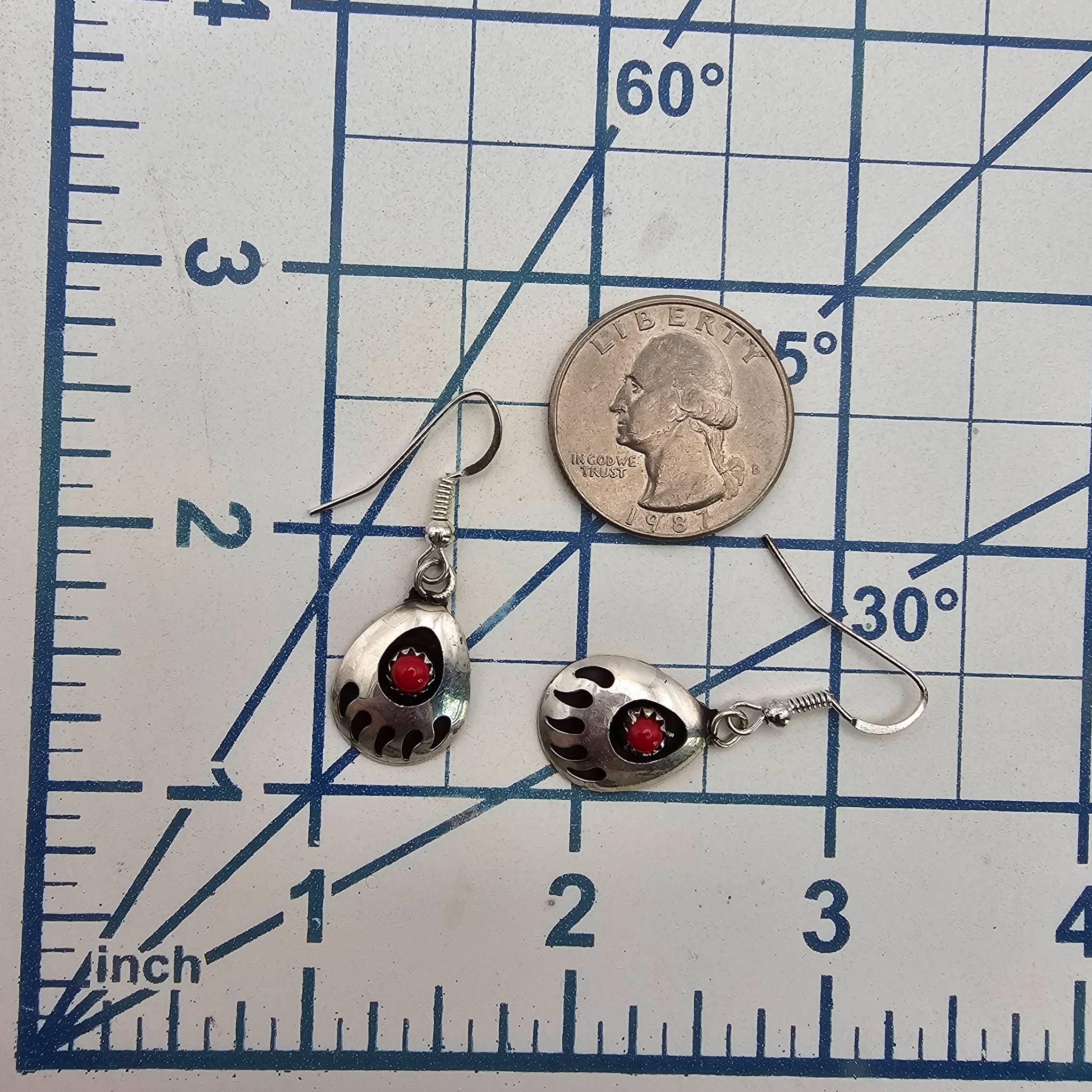 Navajo handmade earrings crafted in sterling silver by artisan Virginia John. The design features a bear paw motif set with coral stones at the center. The earrings measure approximately 2 inches long, including the hooks, and weigh 2.1 grams.