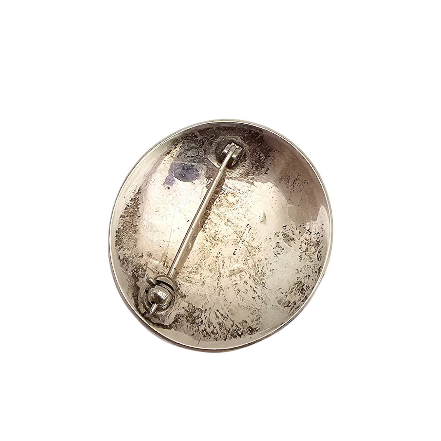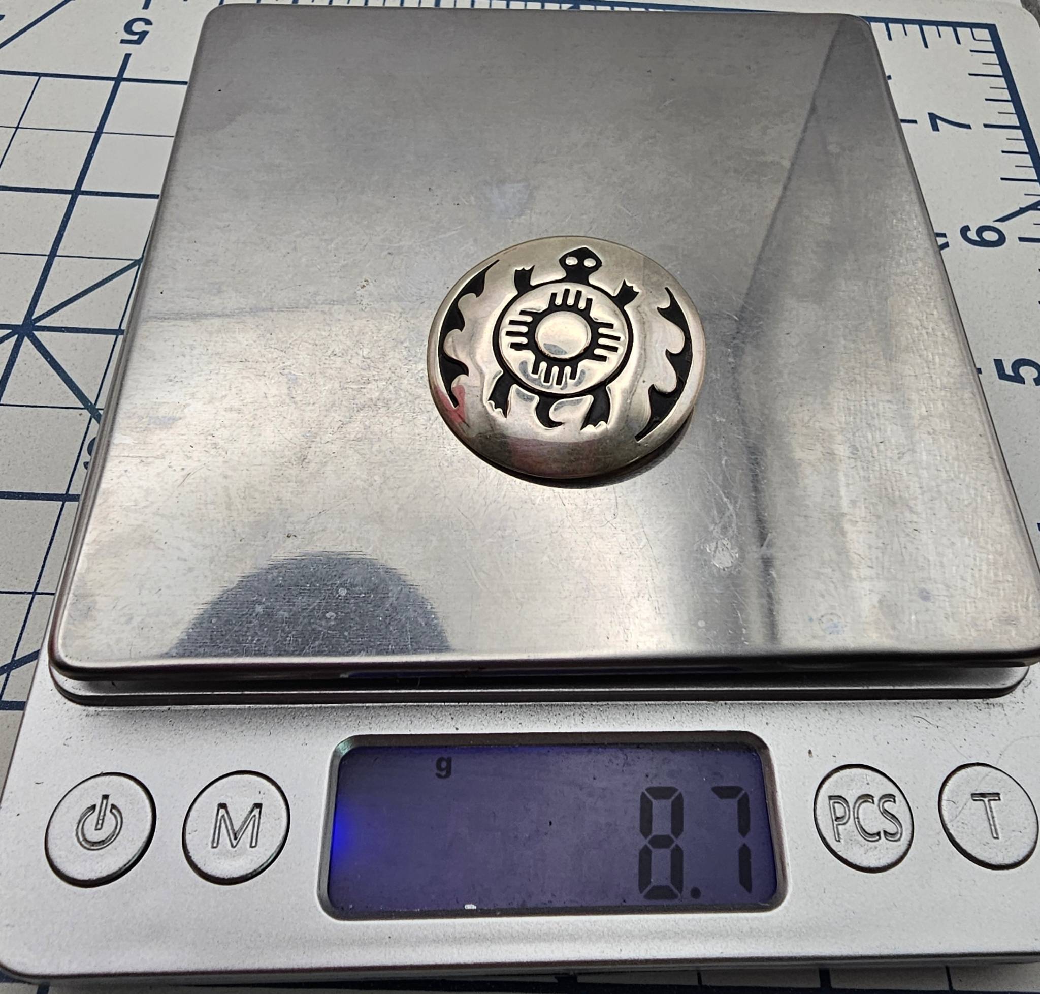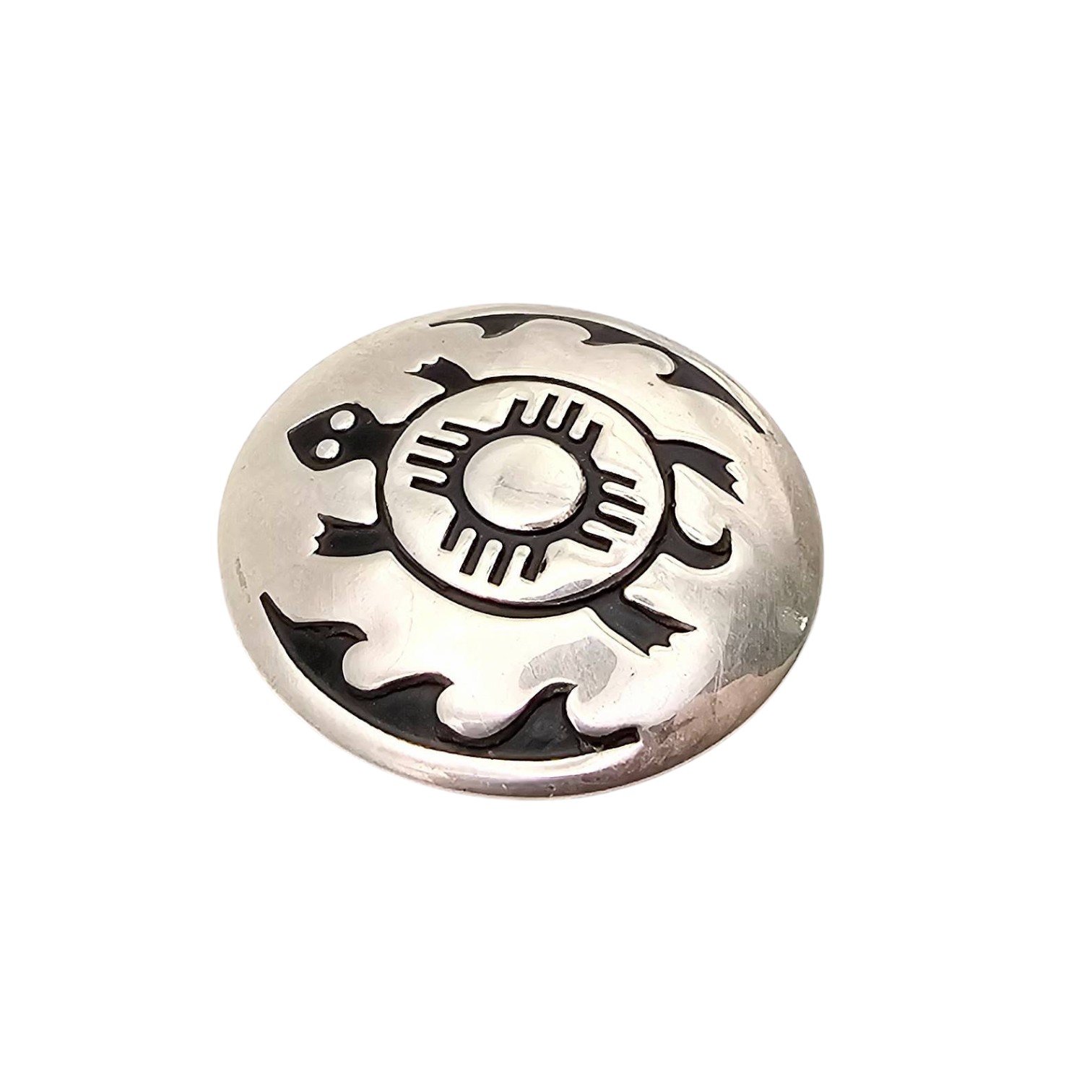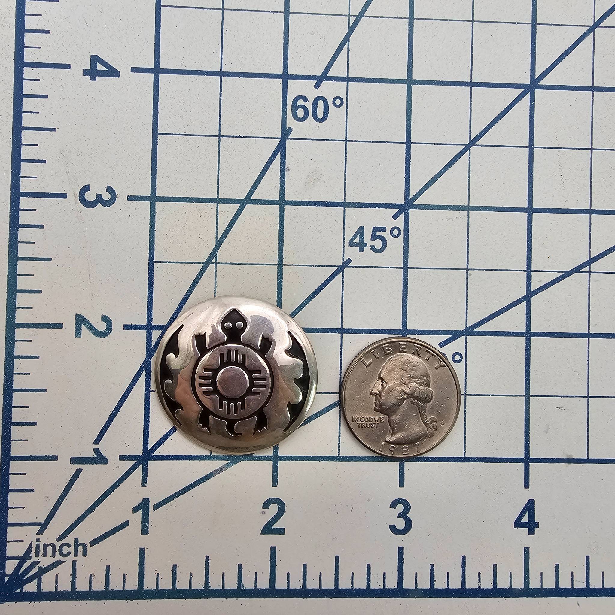 Navajo-made sterling silver brooch featuring a turtle design with decorative engravings. Crafted from sterling silver, it weighs approximately 8.7 grams. The brooch measures about 1.5 inches in diameter, with a secure pin back for attachment.