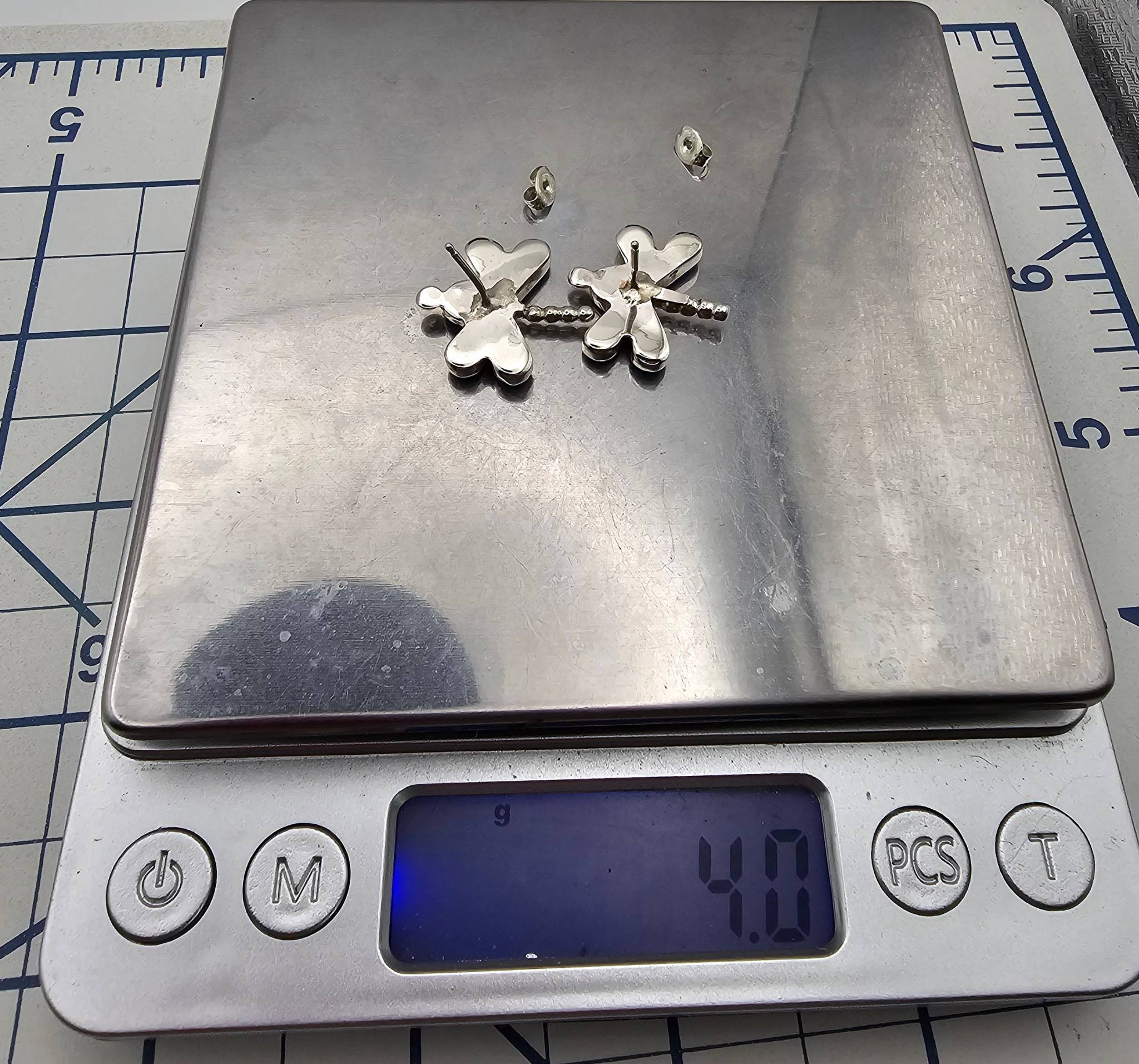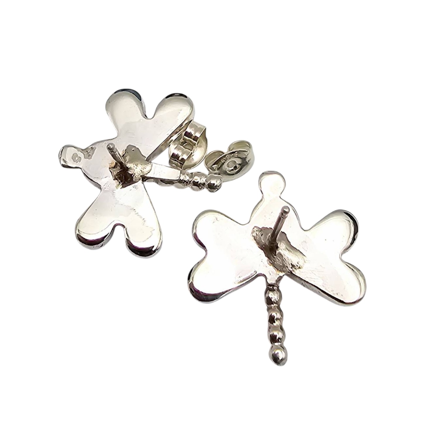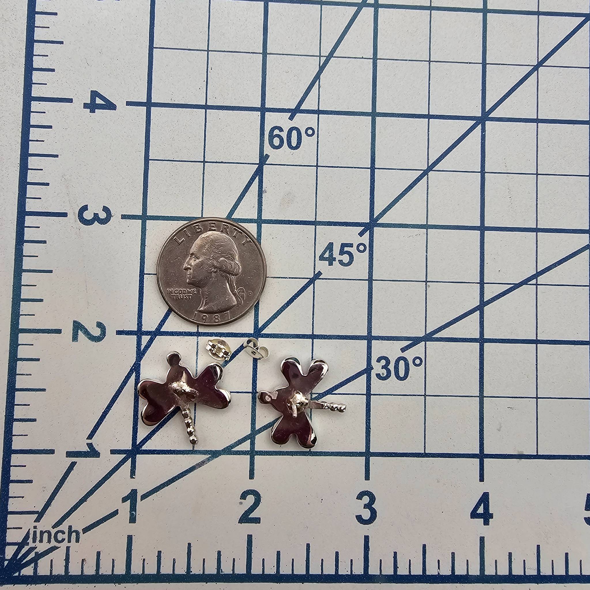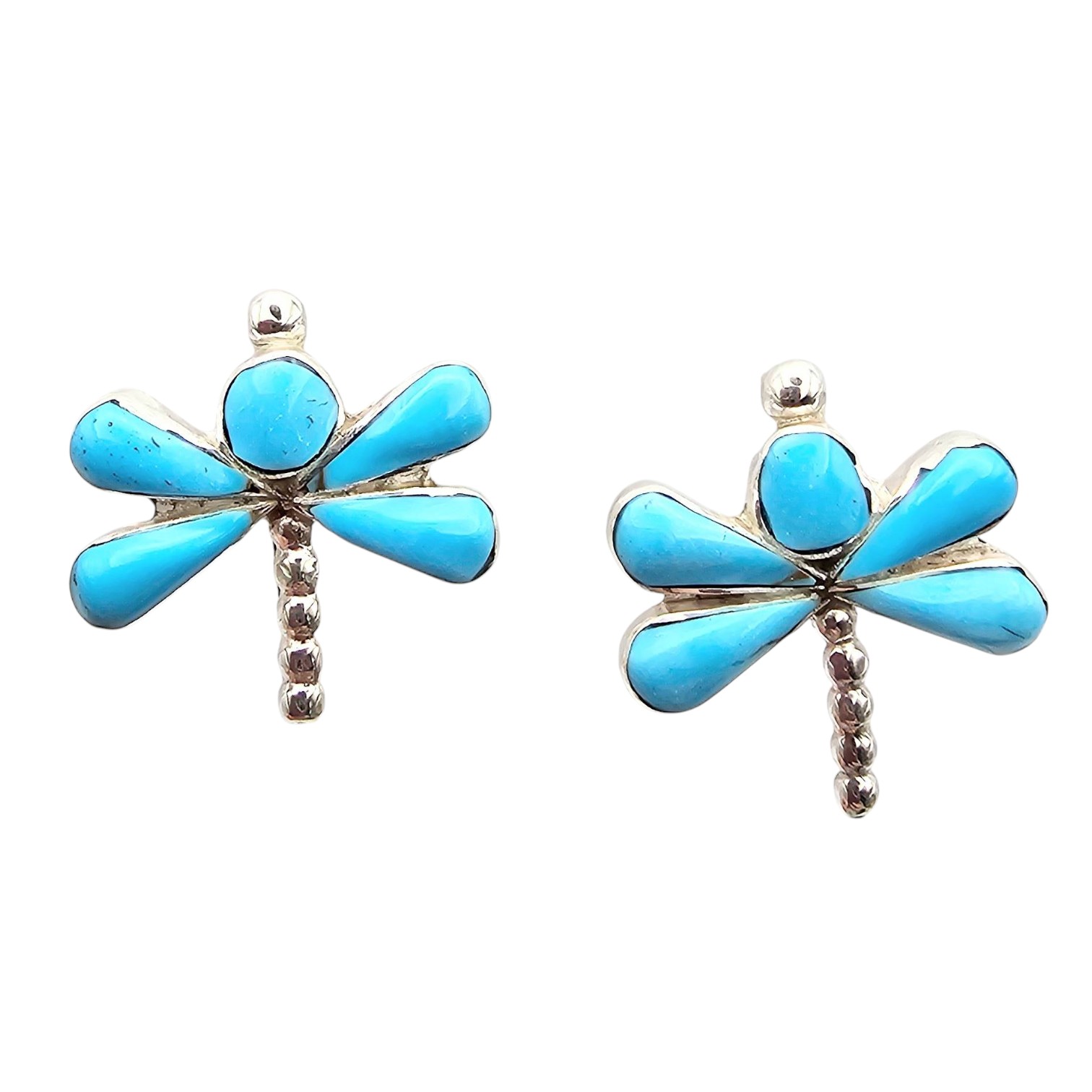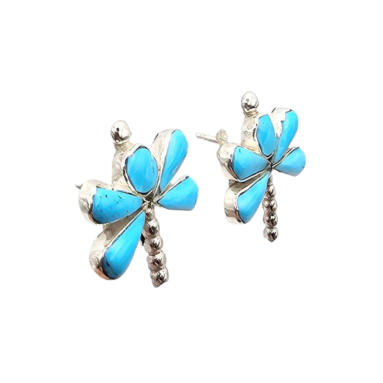 Dragonfly-shaped earrings handmade by Zuni artisan Swain Charley. Crafted in sterling silver (SS), featuring vibrant Kingman turquoise inlay. Post-back style with a total weight of 4.0 grams as displayed. Dimensions are shown in the images, with each earring smaller than 1 inch in height and width.