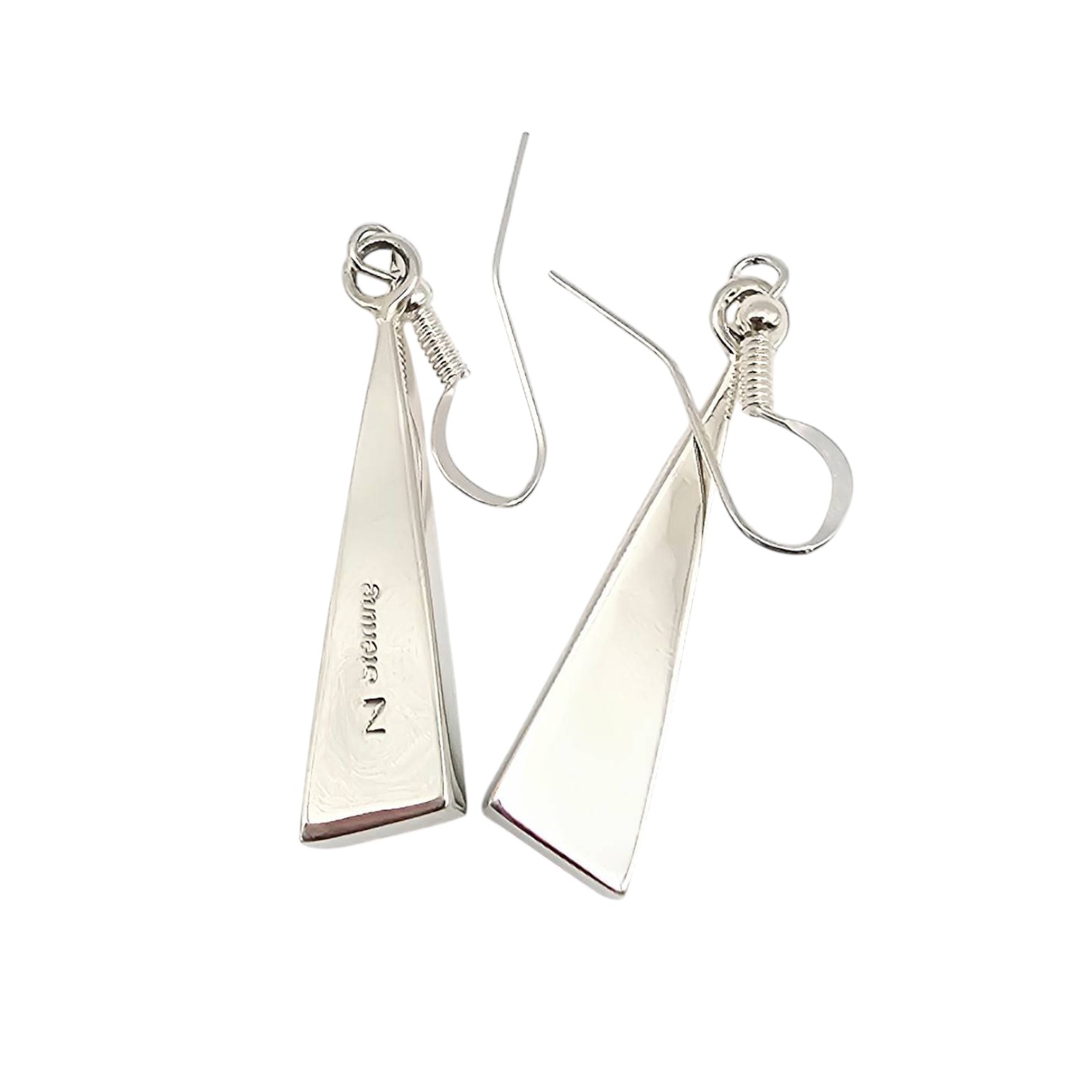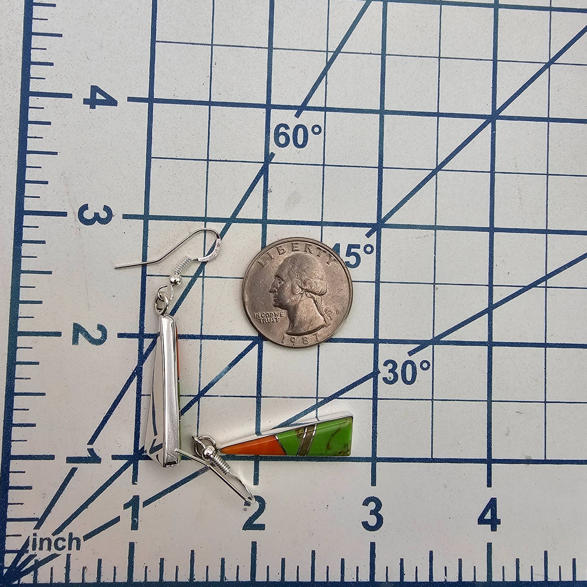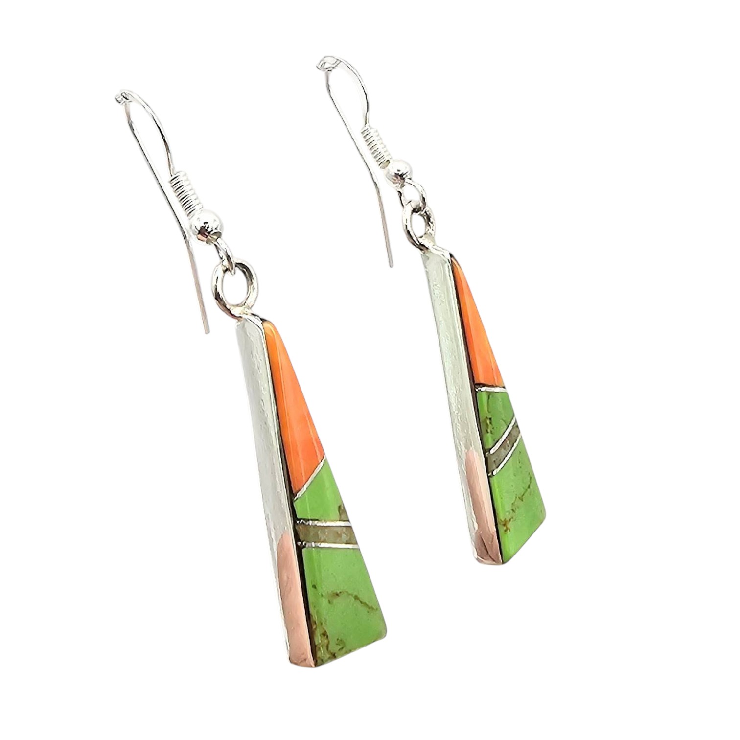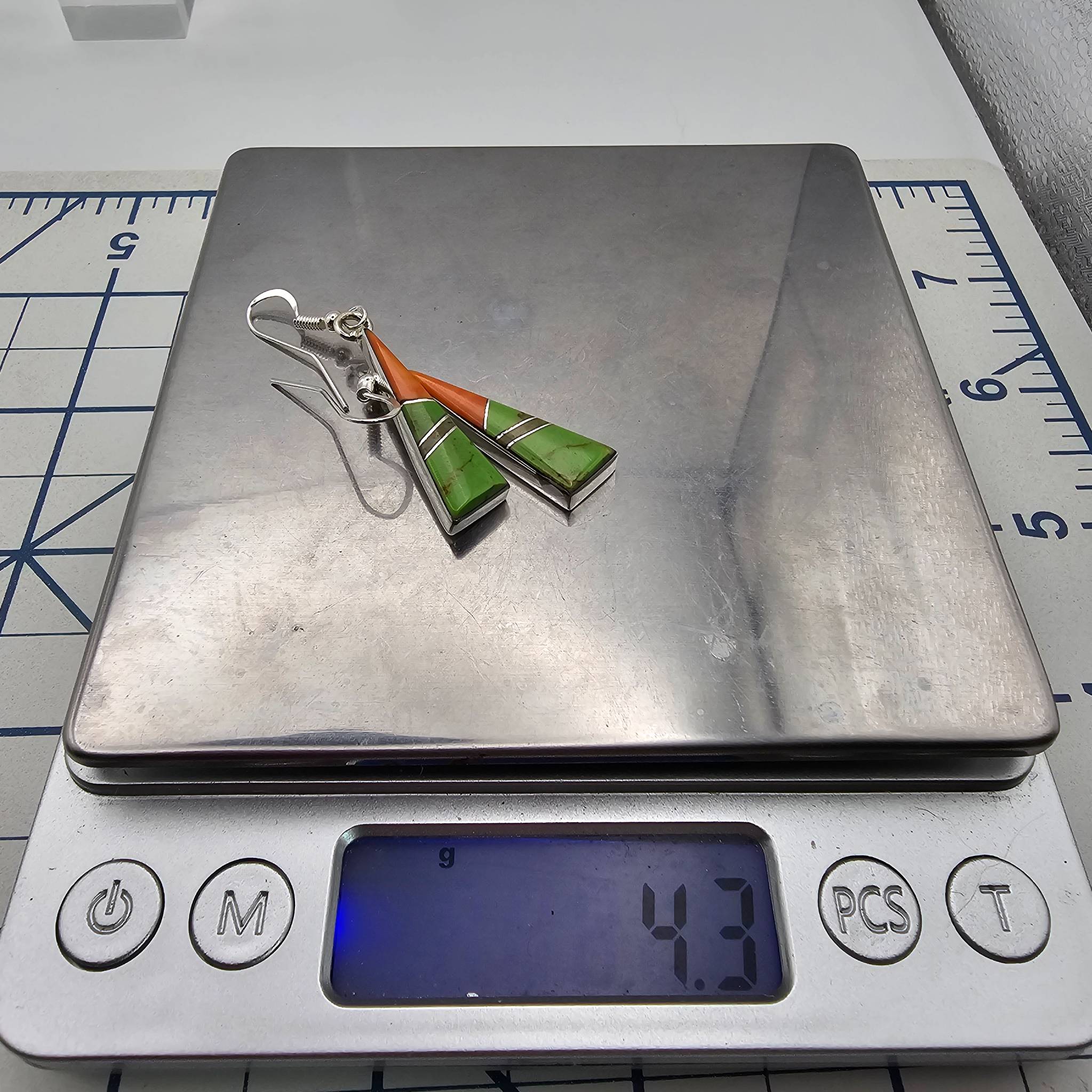 Handmade sterling silver earrings created by Mary Yazzie, featuring an elegant triangular design. The earrings incorporate multi-stone inlays with green and orange tonal stones, separated by fine silver lines. Each earring weighs approximately 4.3 grams (total weight shown).