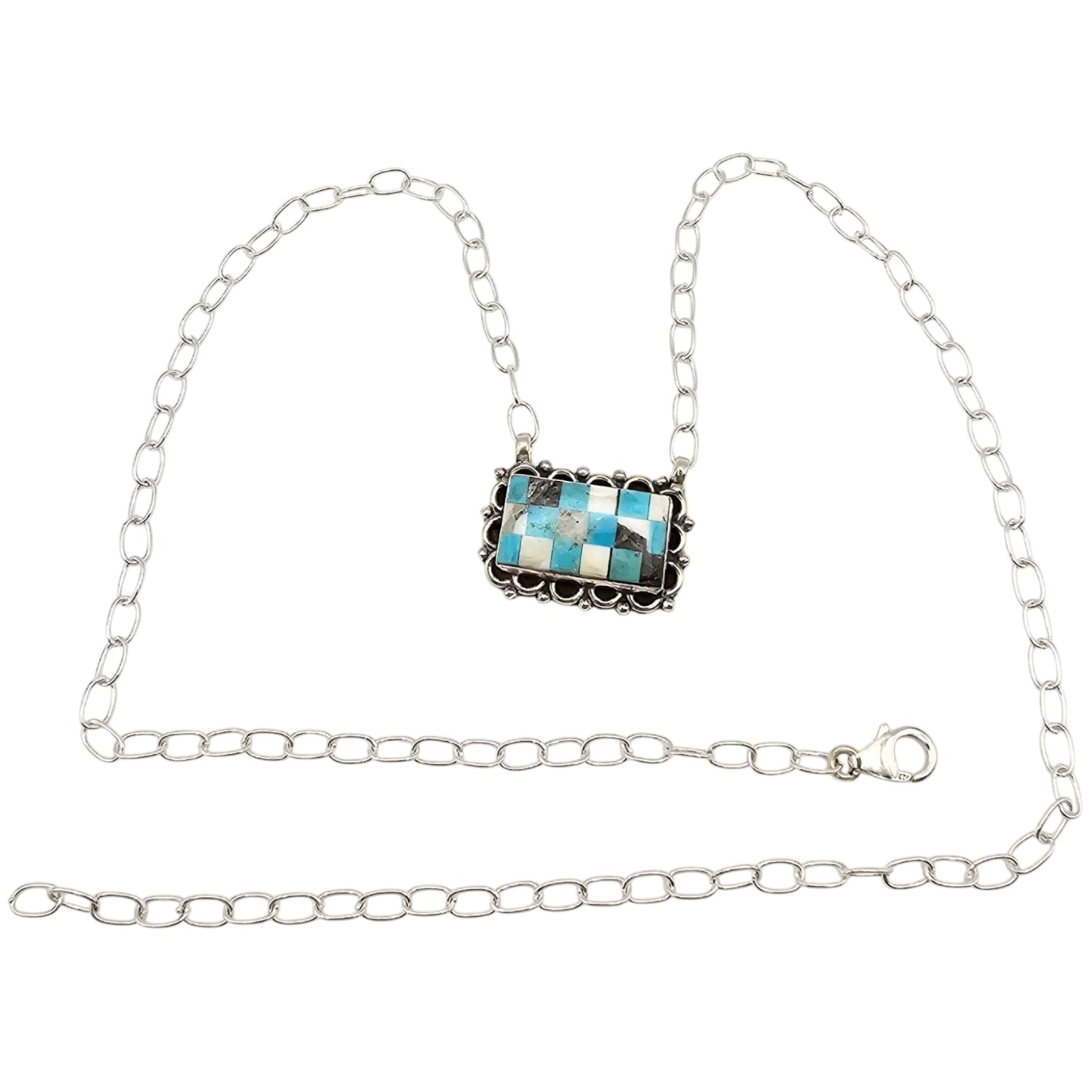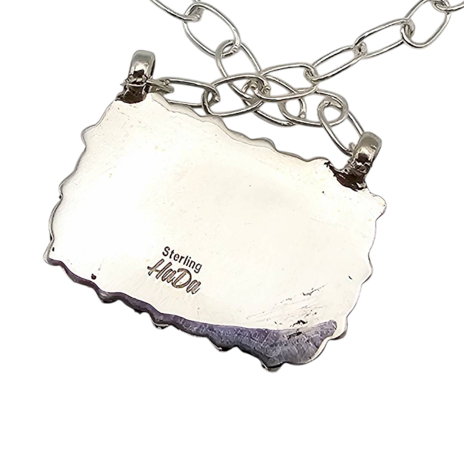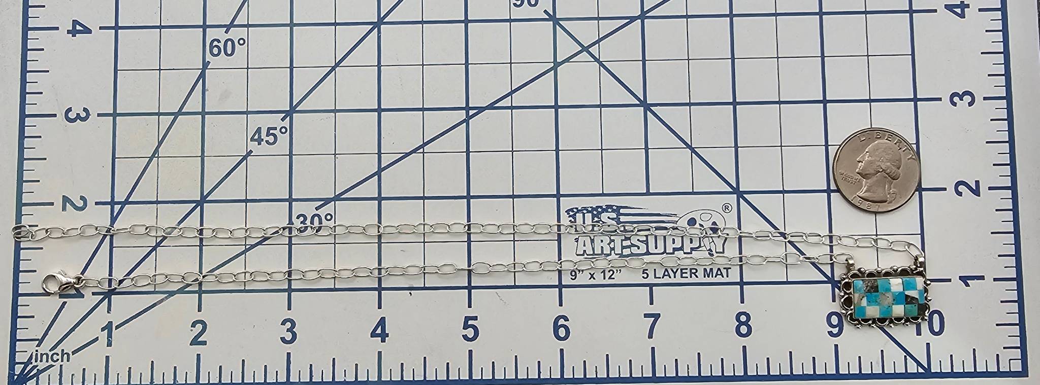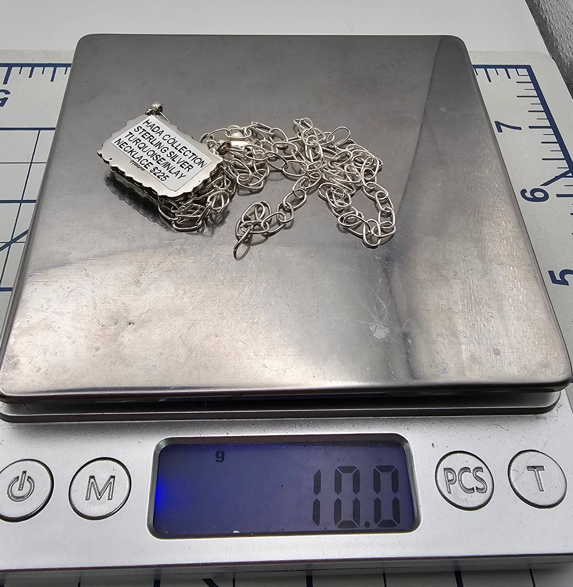 Hada Collection sterling silver necklace featuring a central pendant with turquoise and inlay design. The pendant is rectangular with decorative edges and marked ‘Sterling Hada’ on the back. The chain is made of sterling silver with a lobster clasp. Total weight of the necklace is 10 grams. Original price on the tag indicates $225.