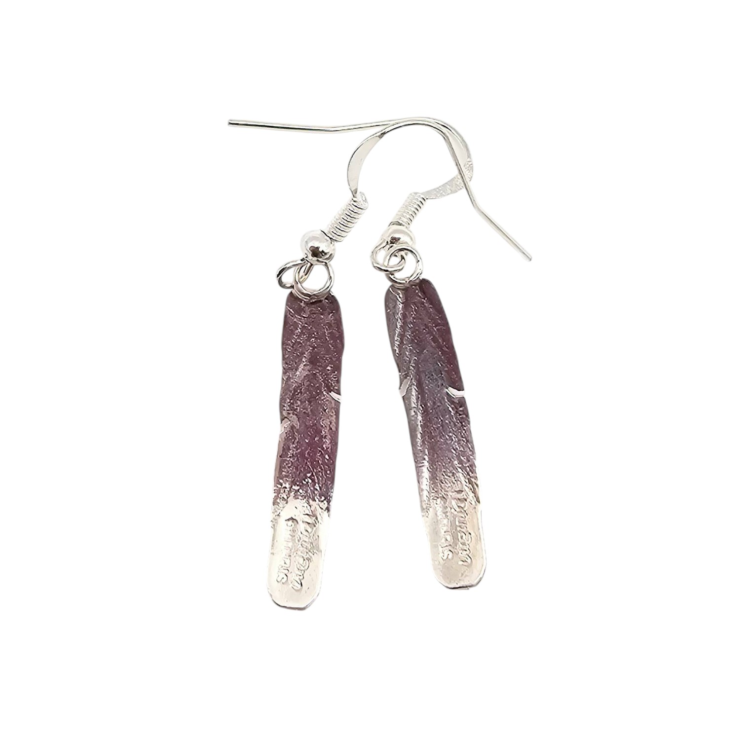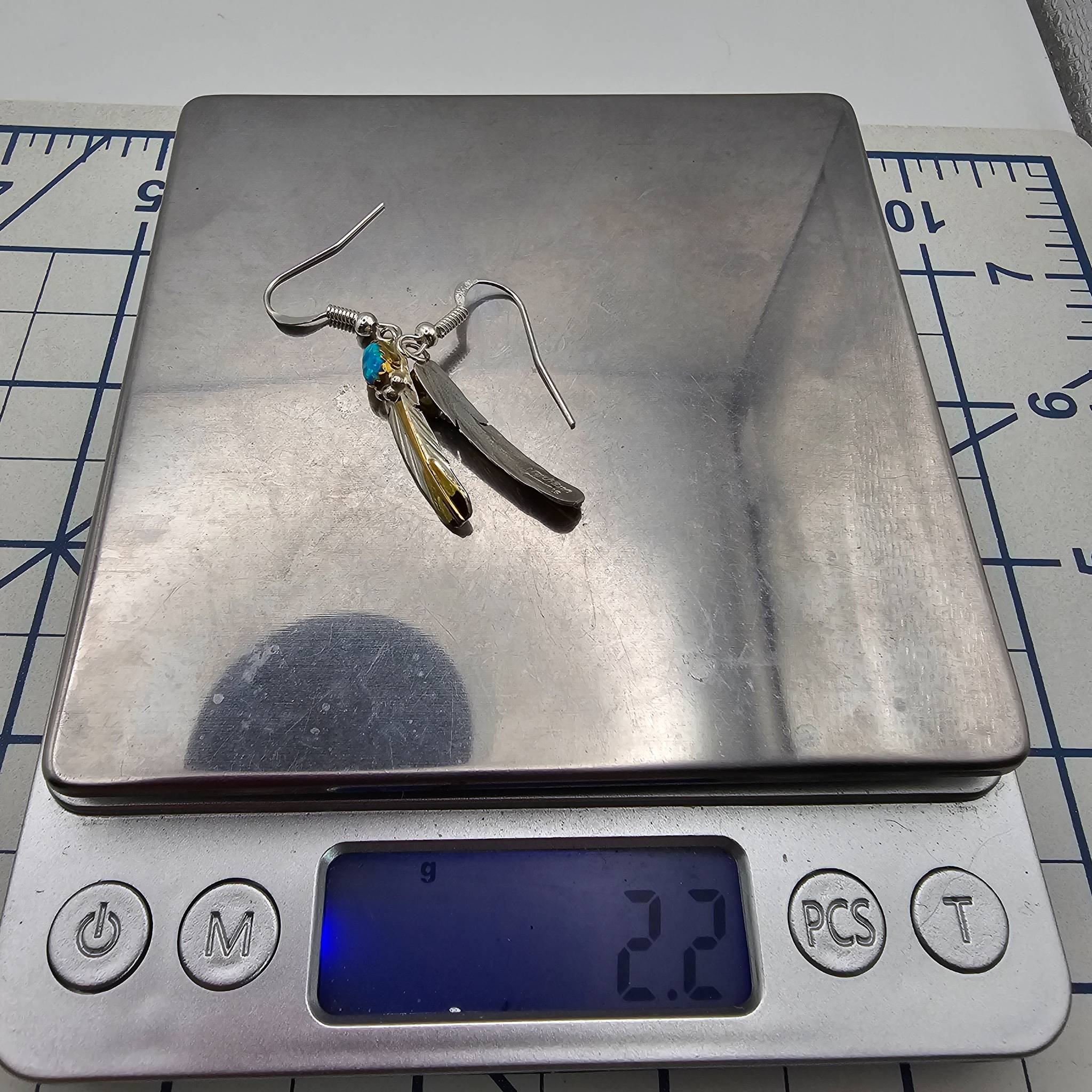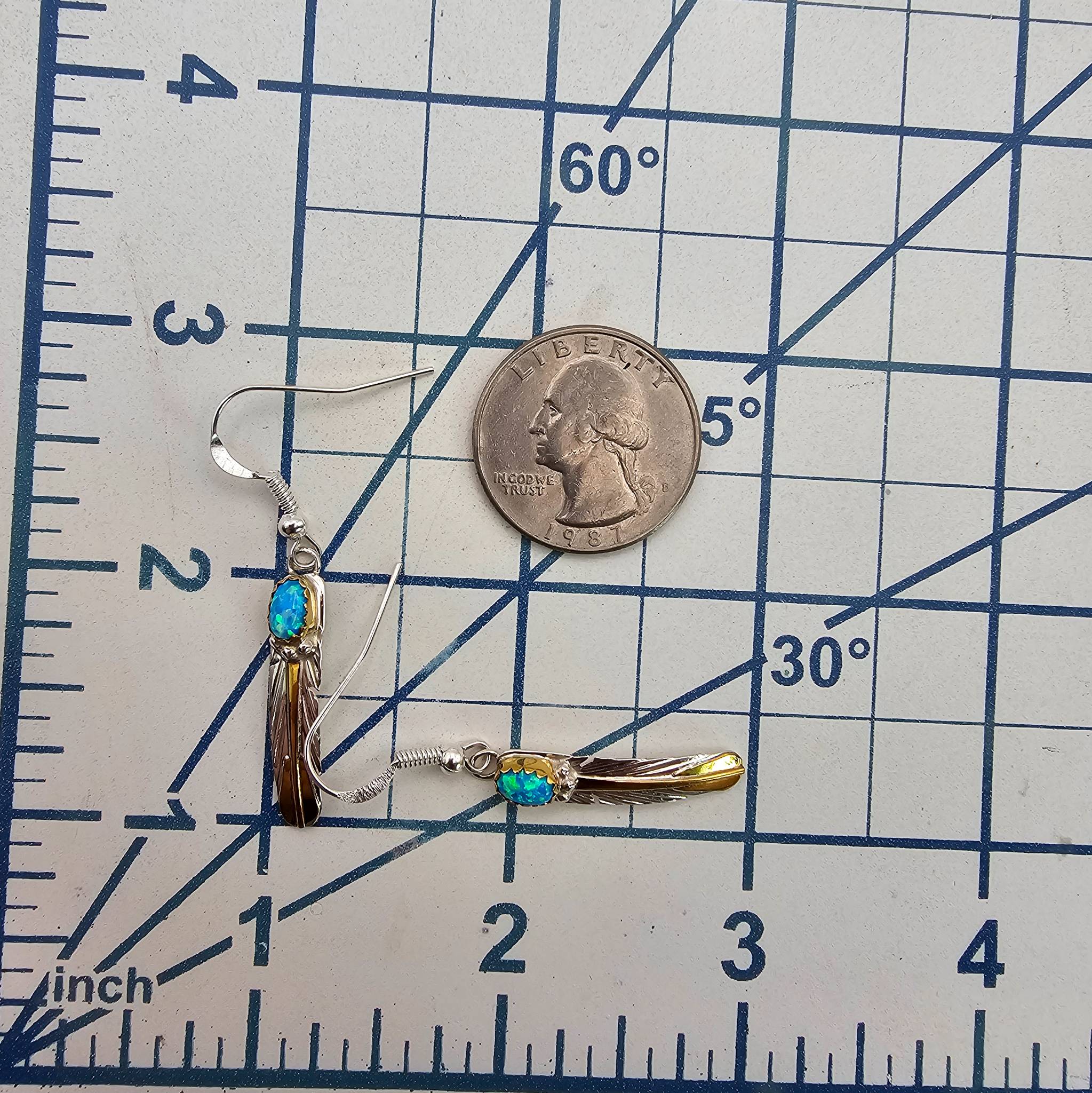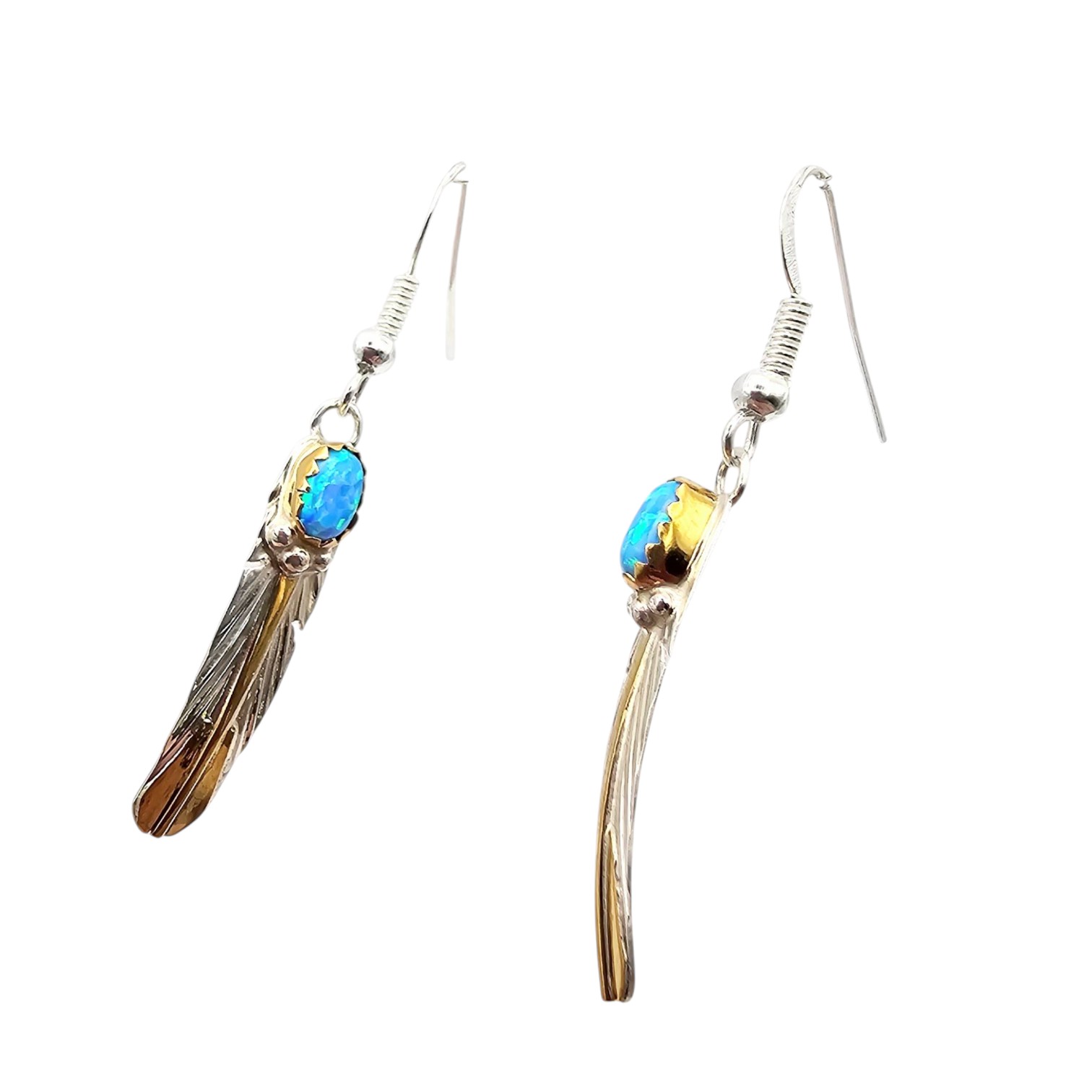 Handcrafted earrings by Navajo artisan Virginia John. Made of sterling silver (SS) with 14K gold-filled accents, the earrings feature opal stones set in a feather-style design. Total weight is approximately 2.2 grams as shown. Earrings are stamped for authentication and measure around 1.75 inches in length.