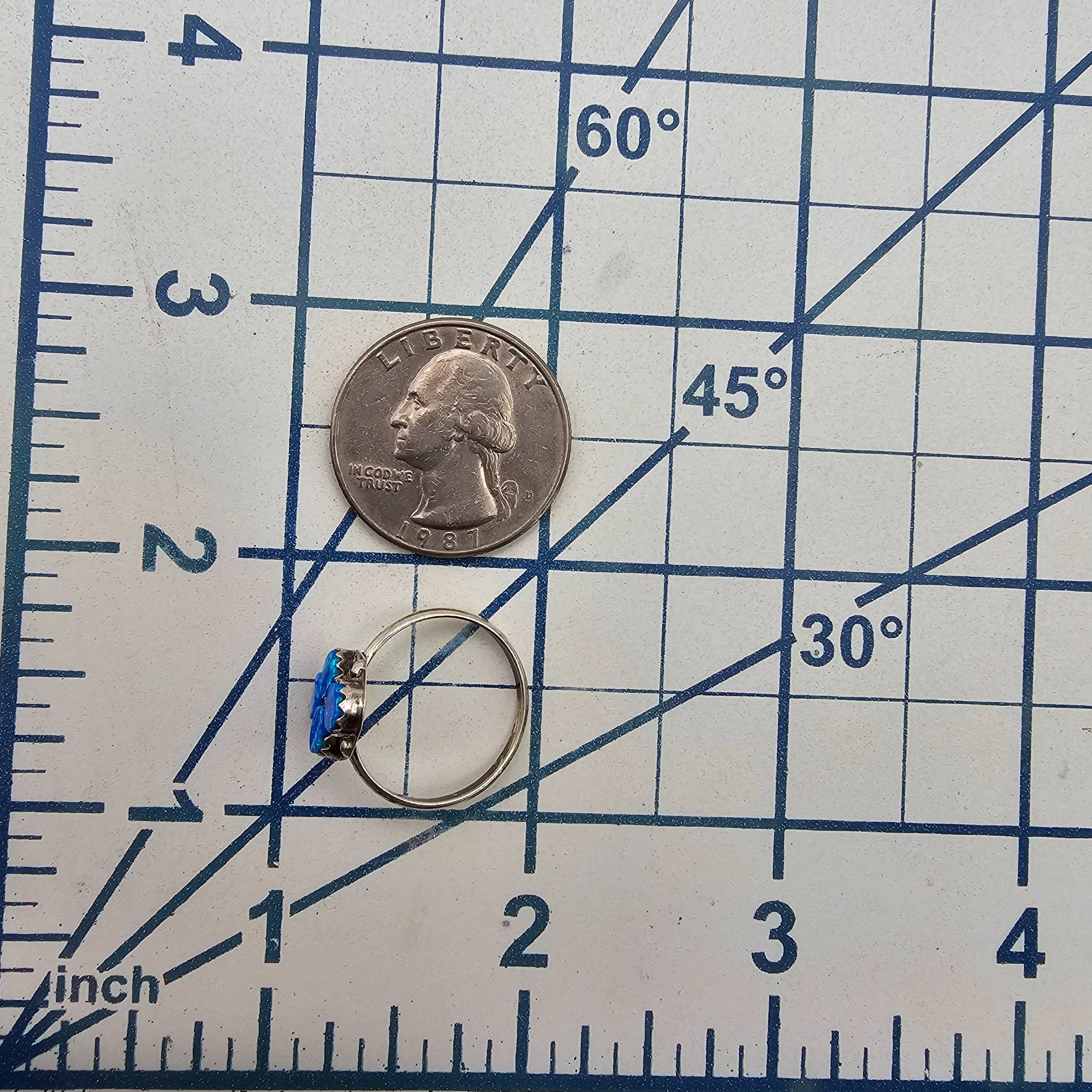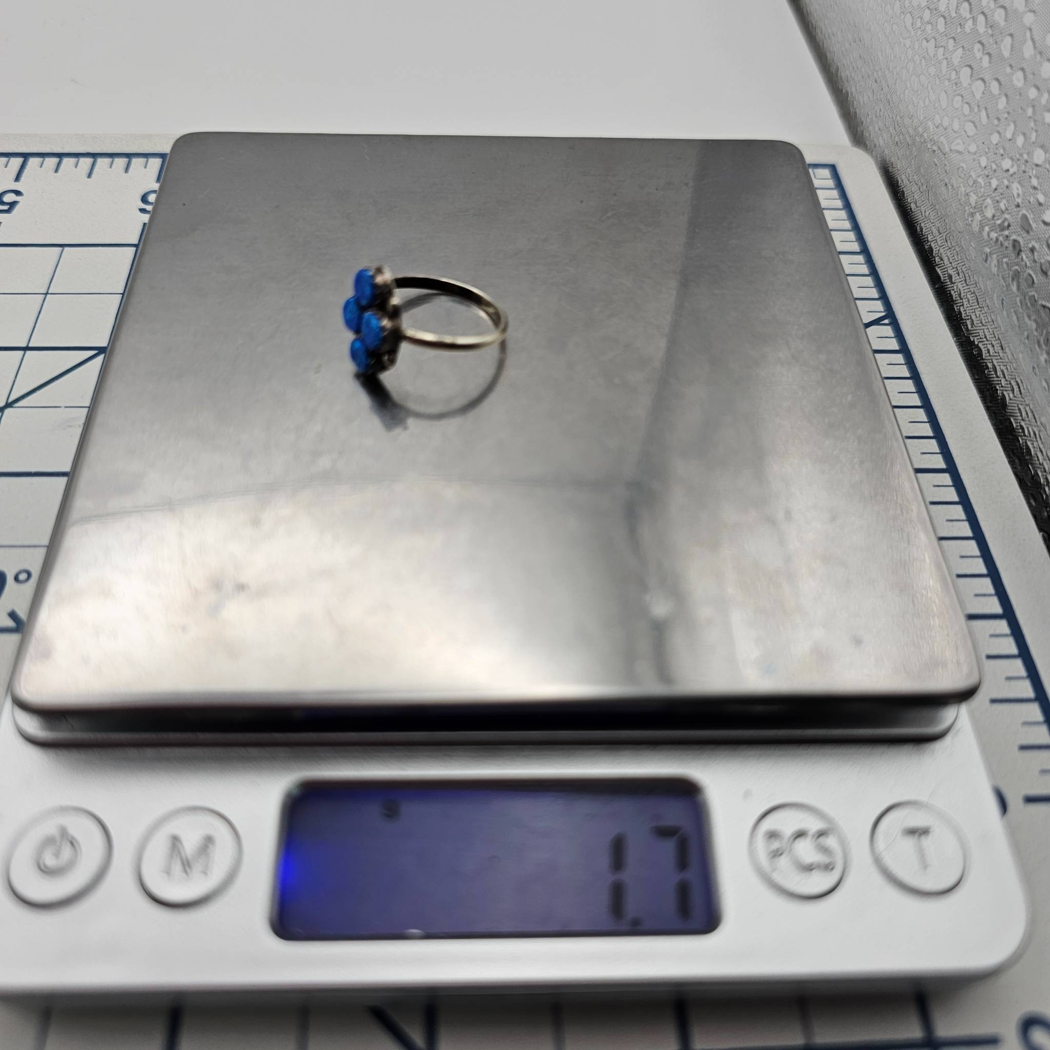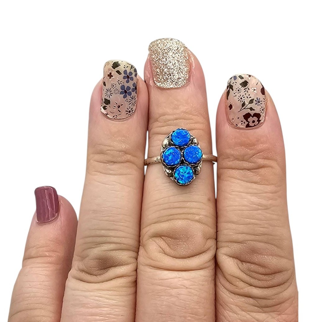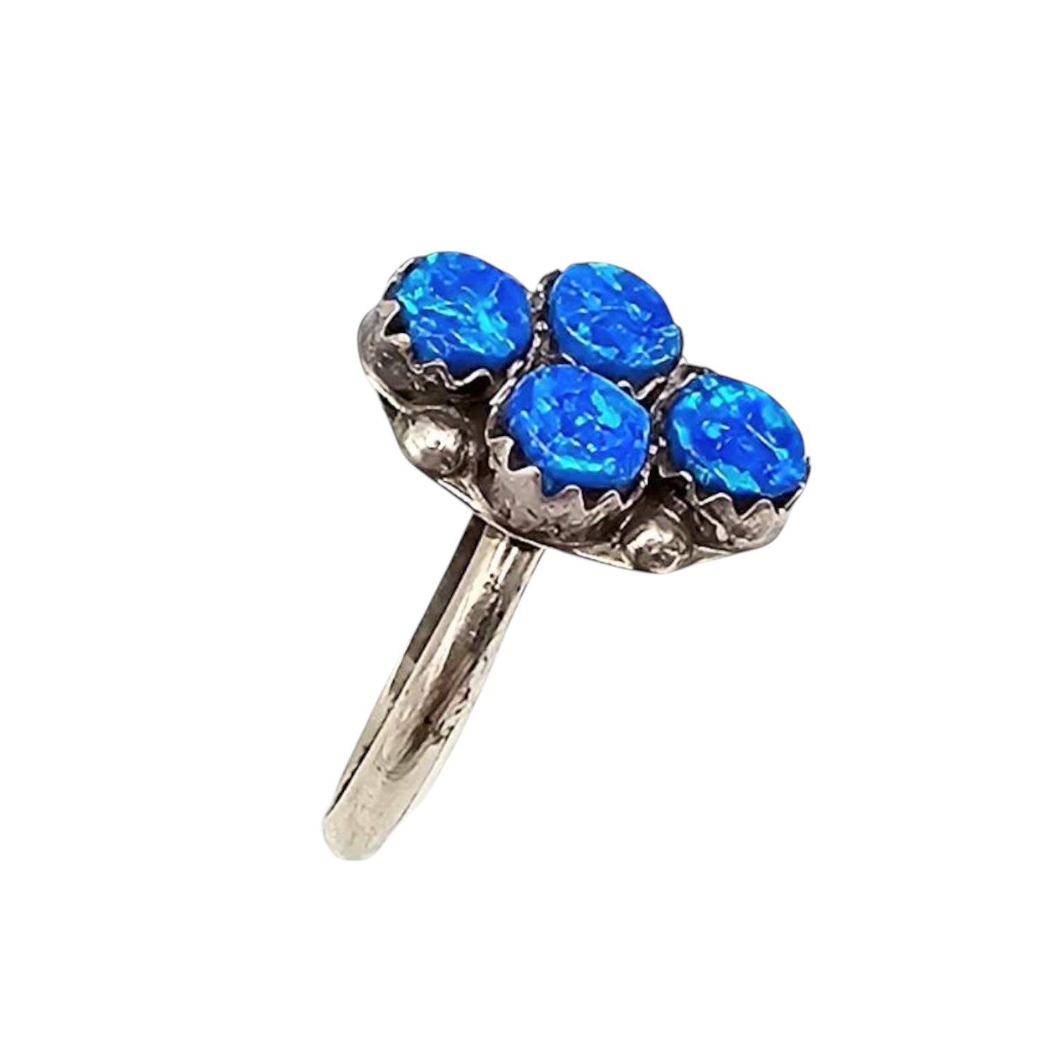 Handcrafted sterling silver opal ring by Swain Charlie, a Zuni artisan. The ring features four vibrant blue opals set prominently in a floral arrangement. It is marked as size 6.5 and weighs approximately 1.7 grams.