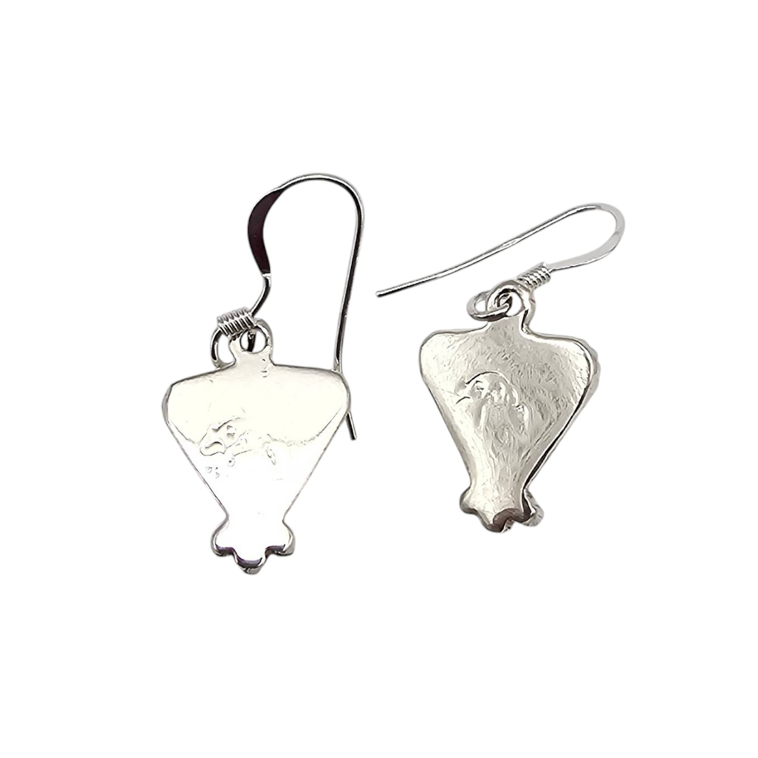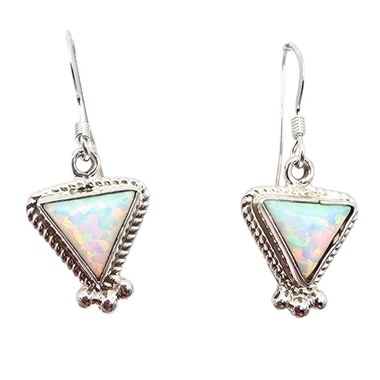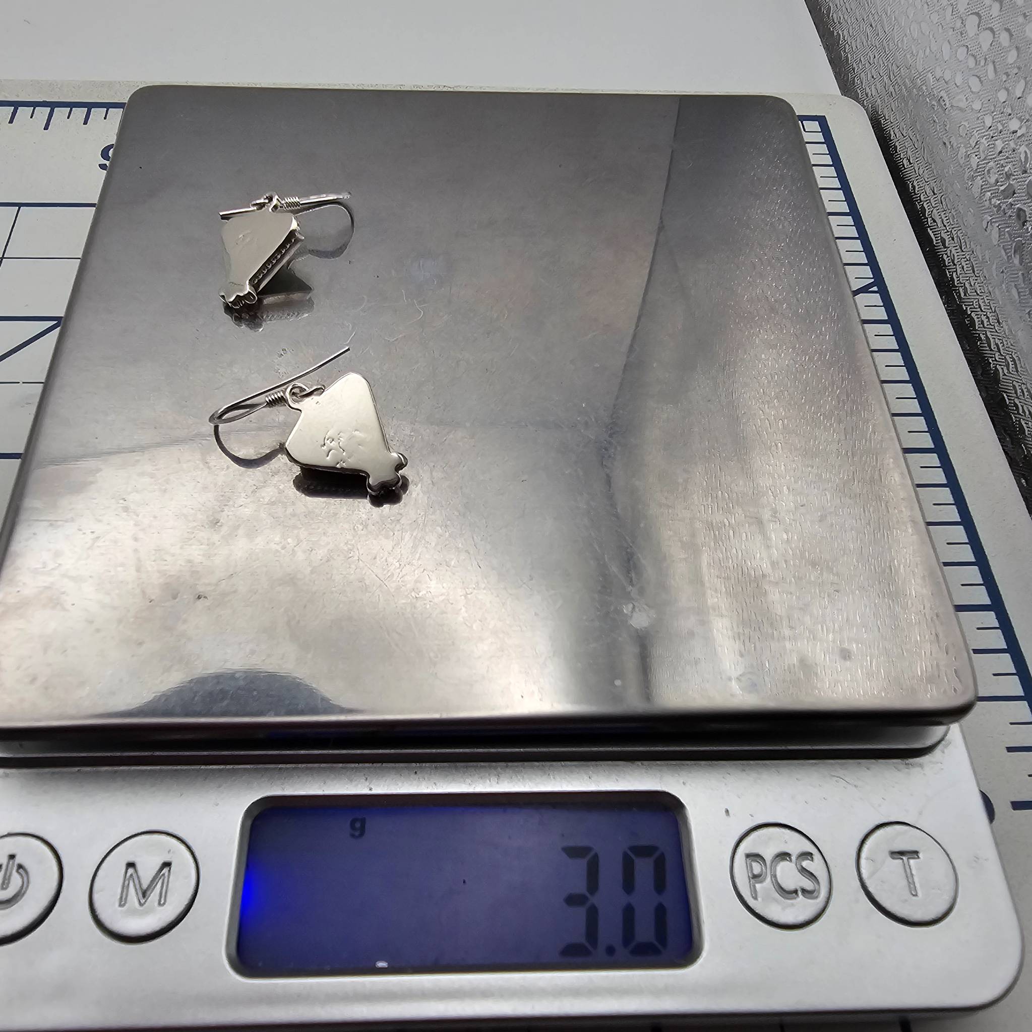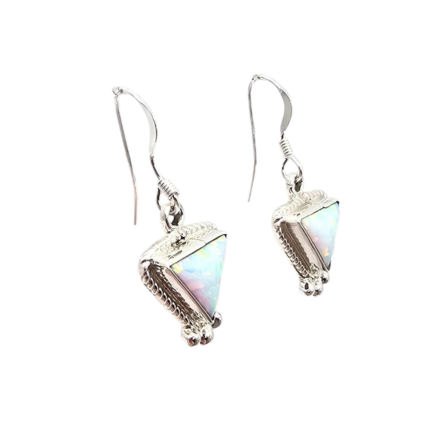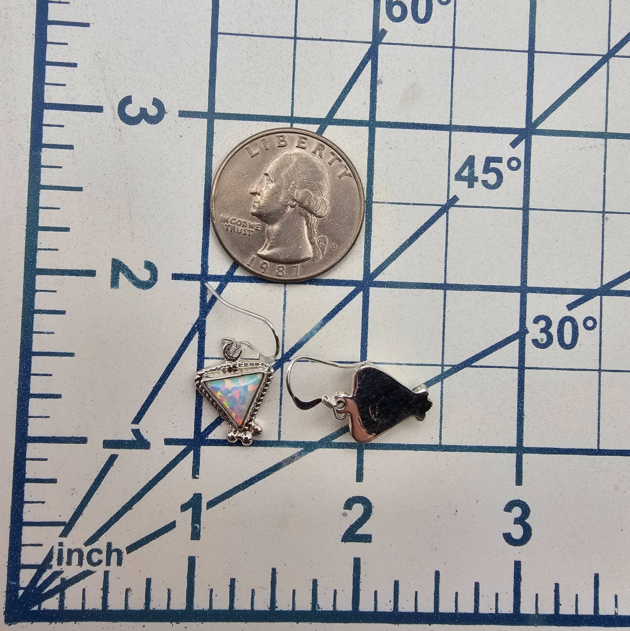 Handmade earrings by Navajo artisan Gary Shorty, crafted in sterling silver with triangular inlay opal stones. Earrings weigh a total of 3.0 grams and measure approximately 1 inch long (including hook) as shown next to a coin for scale. Condition is excellent, consistent with artisan-crafted pieces.
