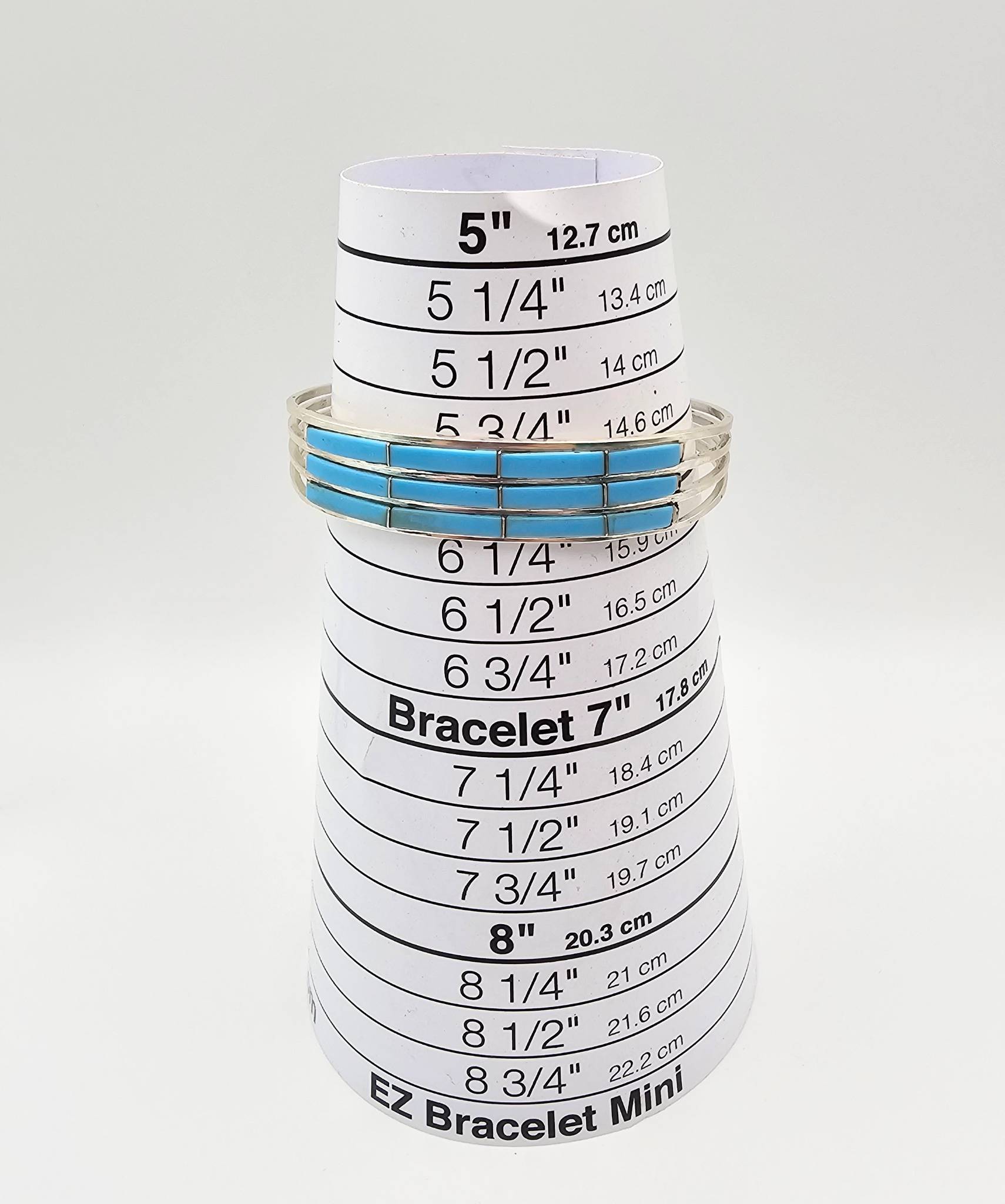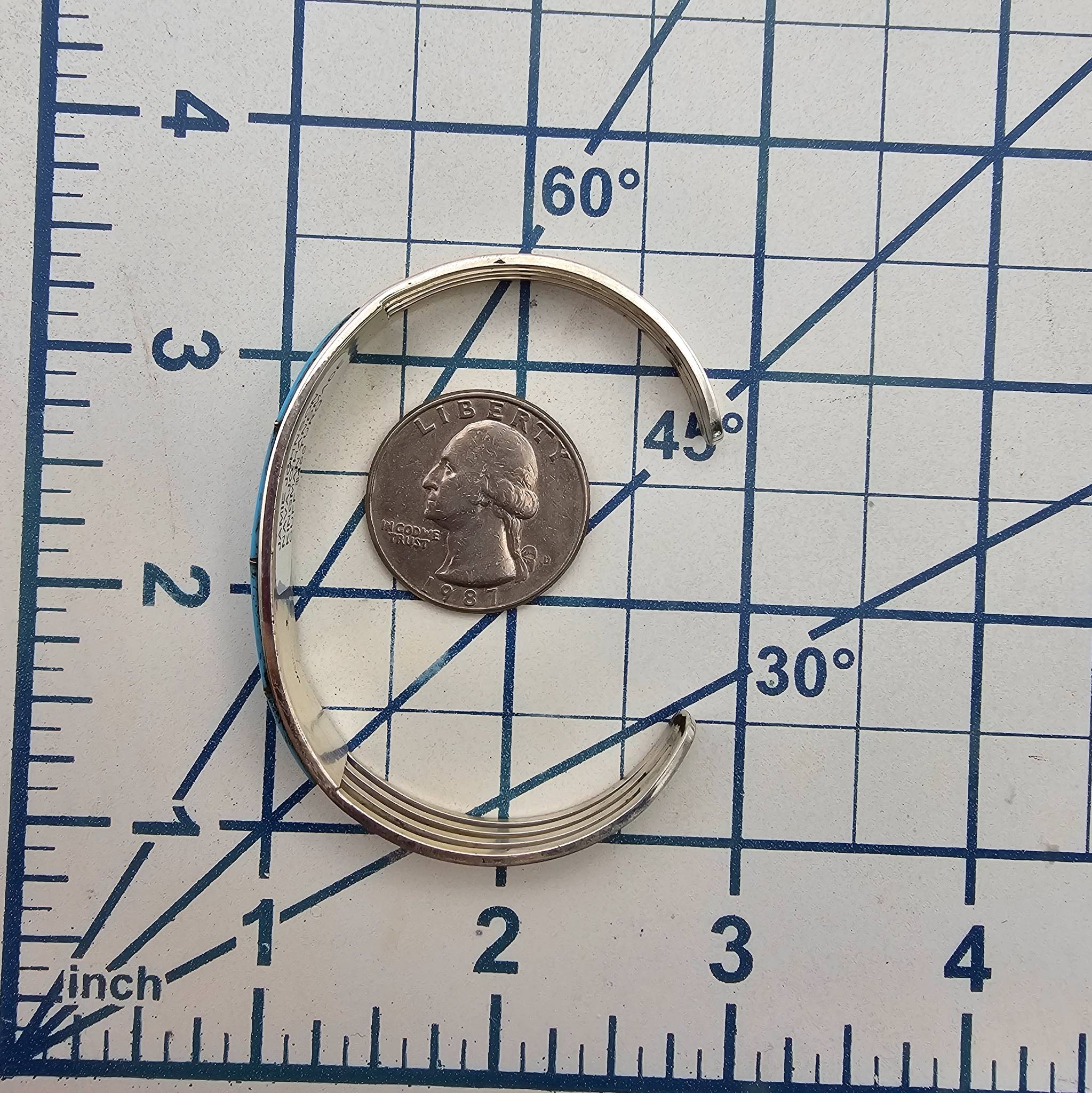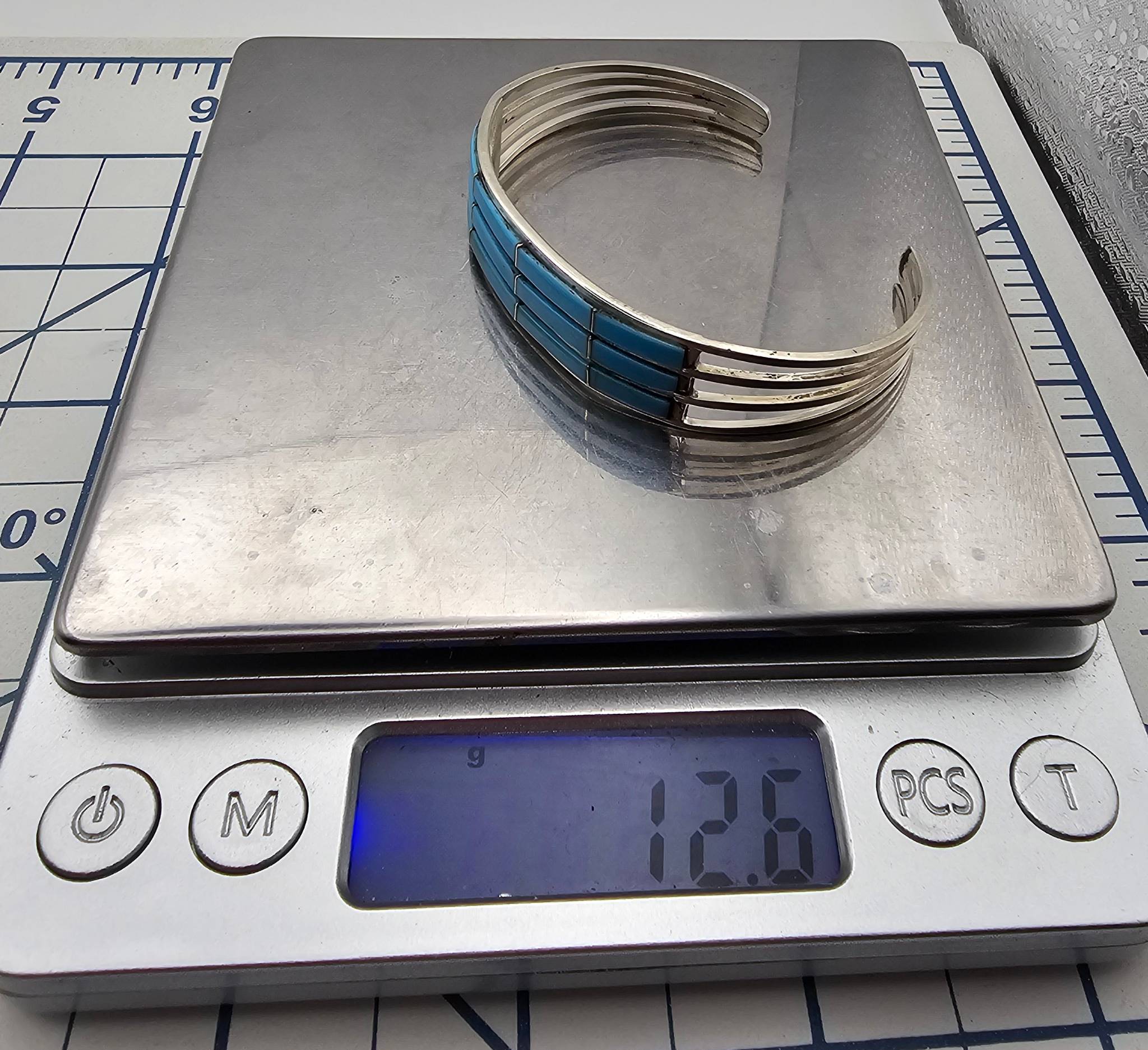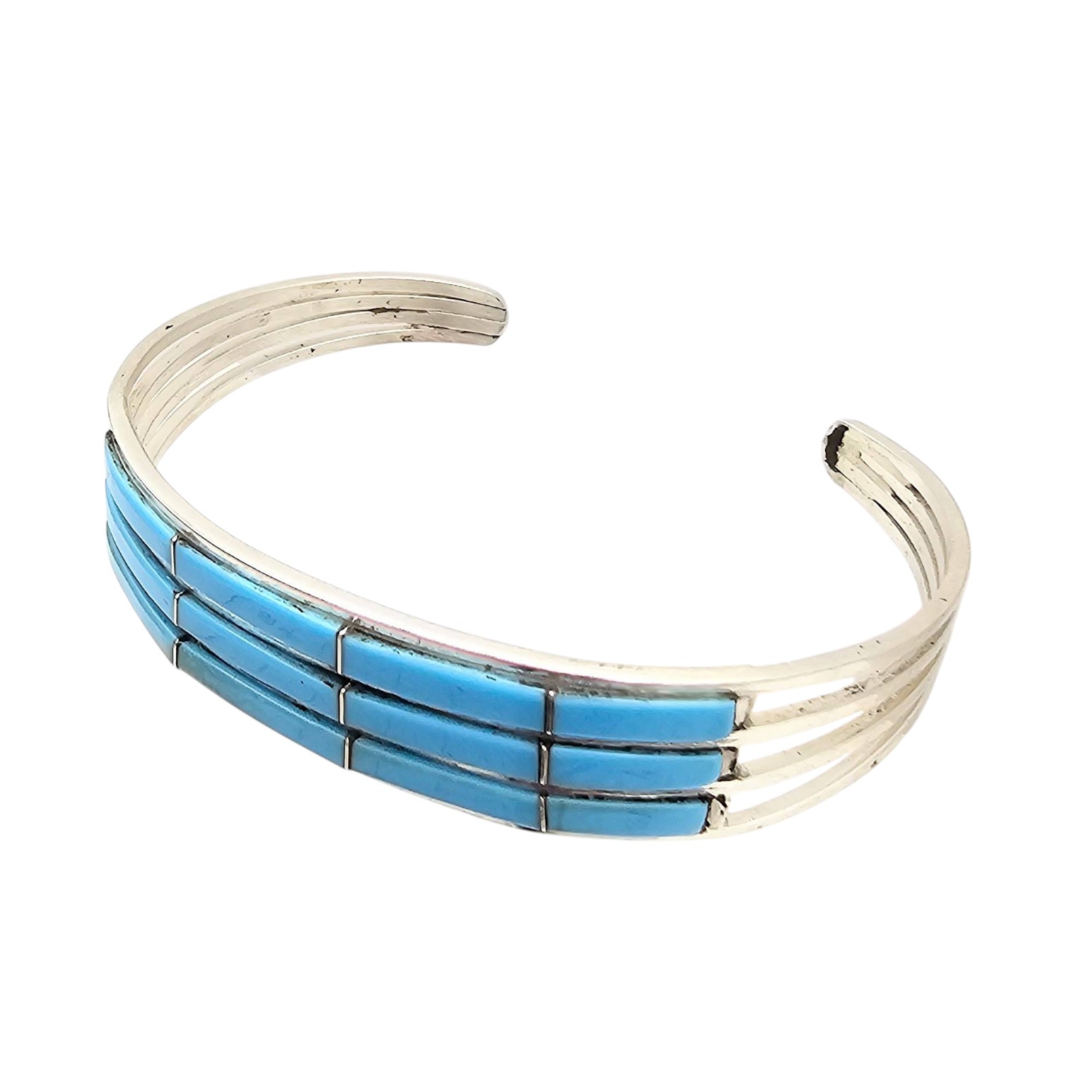 Handmade sterling silver cuff bracelet by Jamie Johnson, a Navajo artisan, featuring Kingman turquoise inlay in a three-row design.