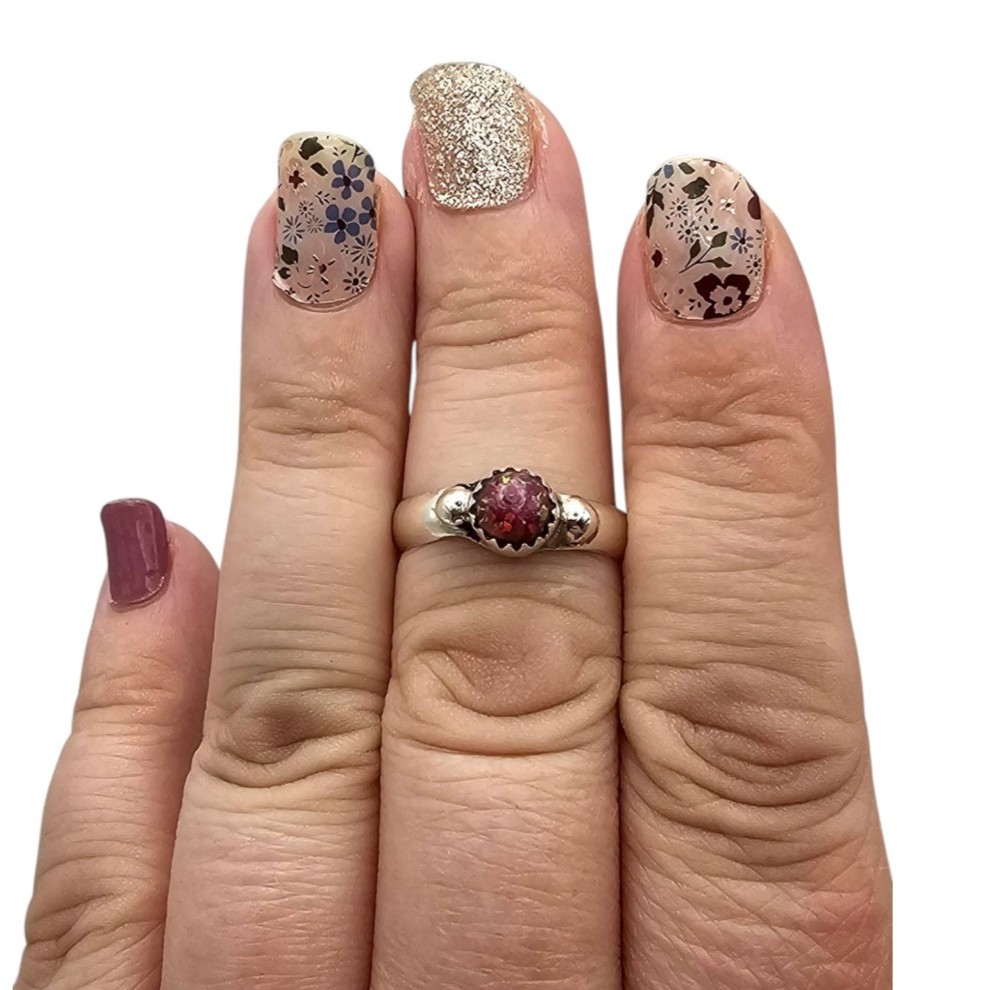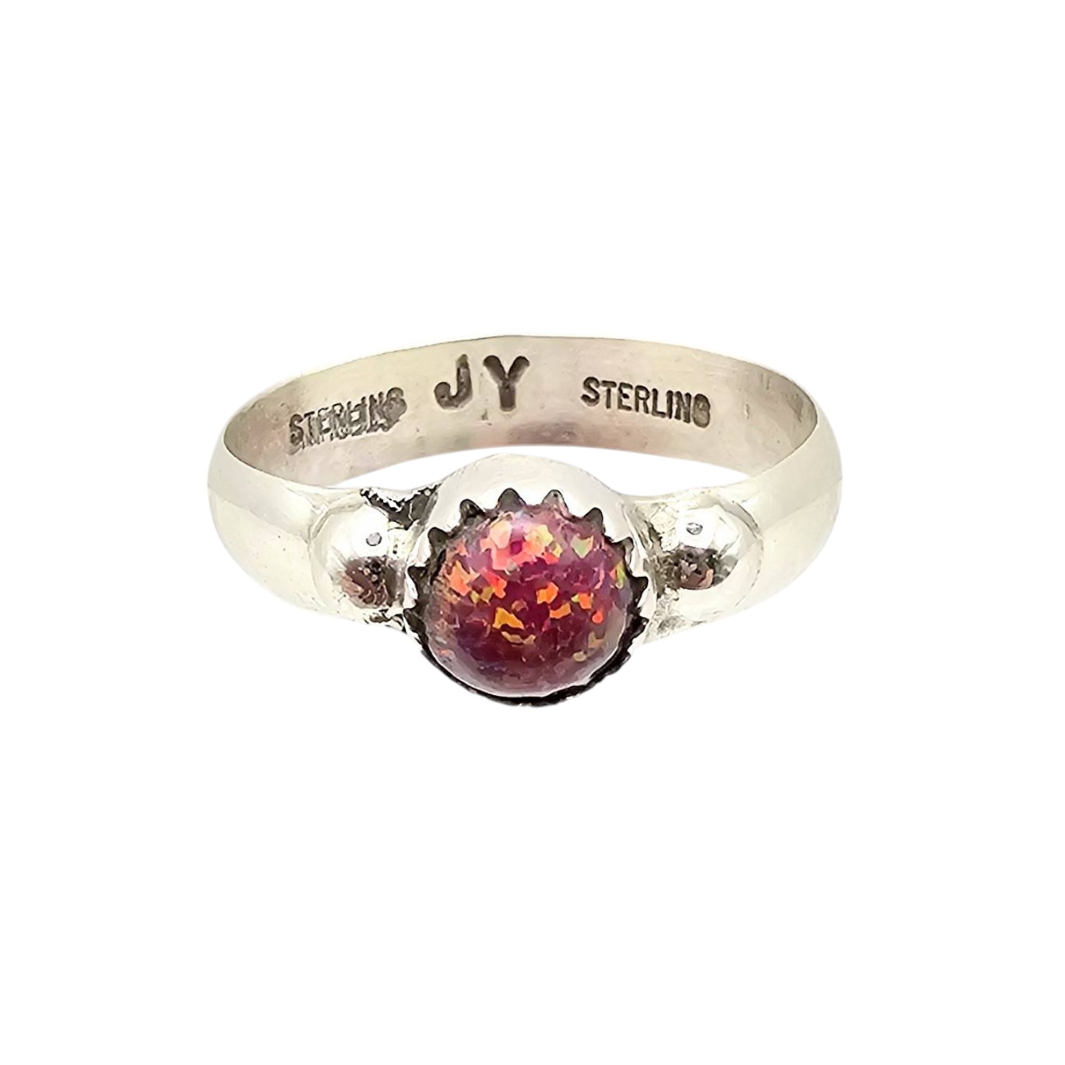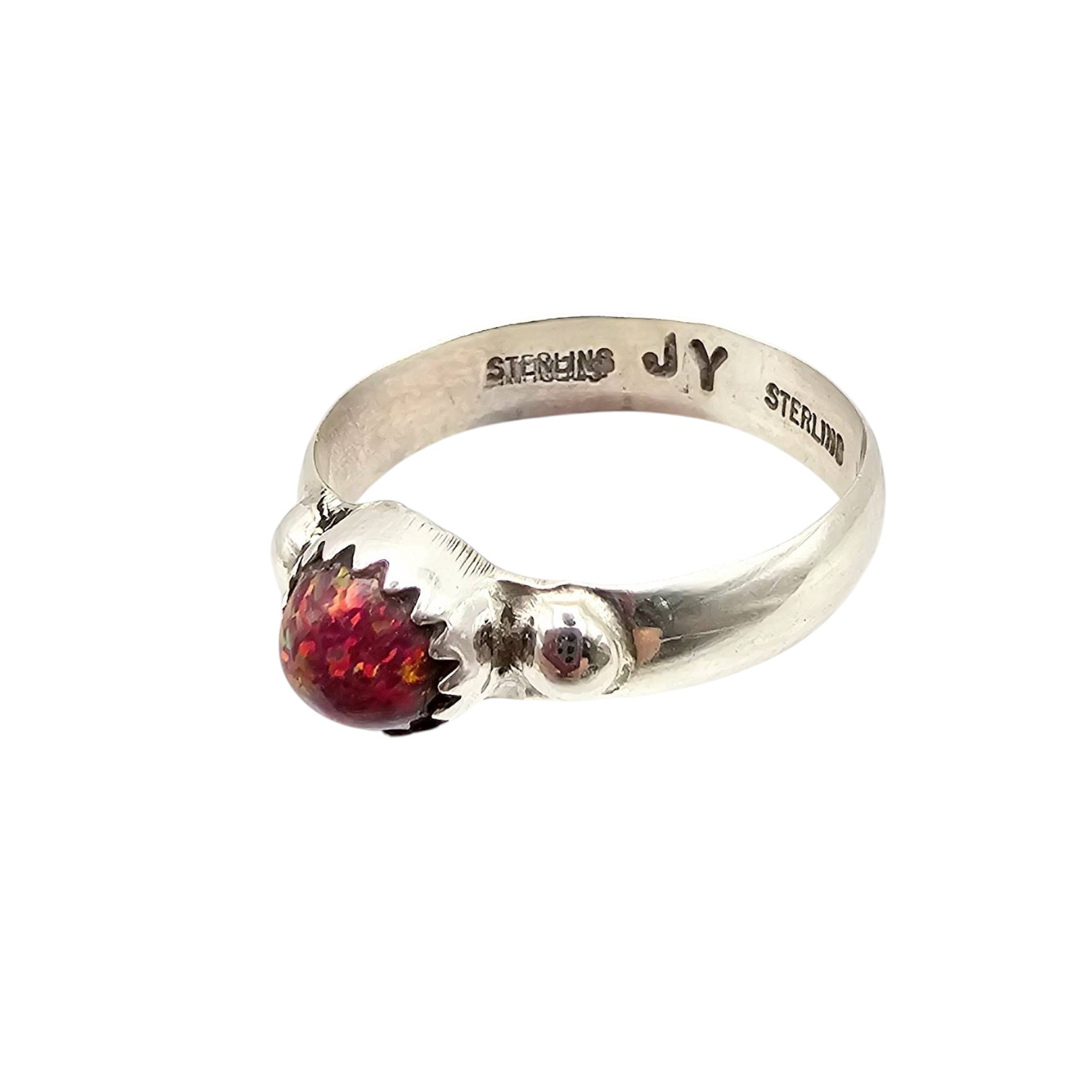 This handmade sterling silver ring by Navajo artisan Jason Yazzie features an opal gemstone in a size 8 setting. The ring is marked ‘STERLING’ and ‘JY’ on the inside band. It has a total weight of 2.4 grams.