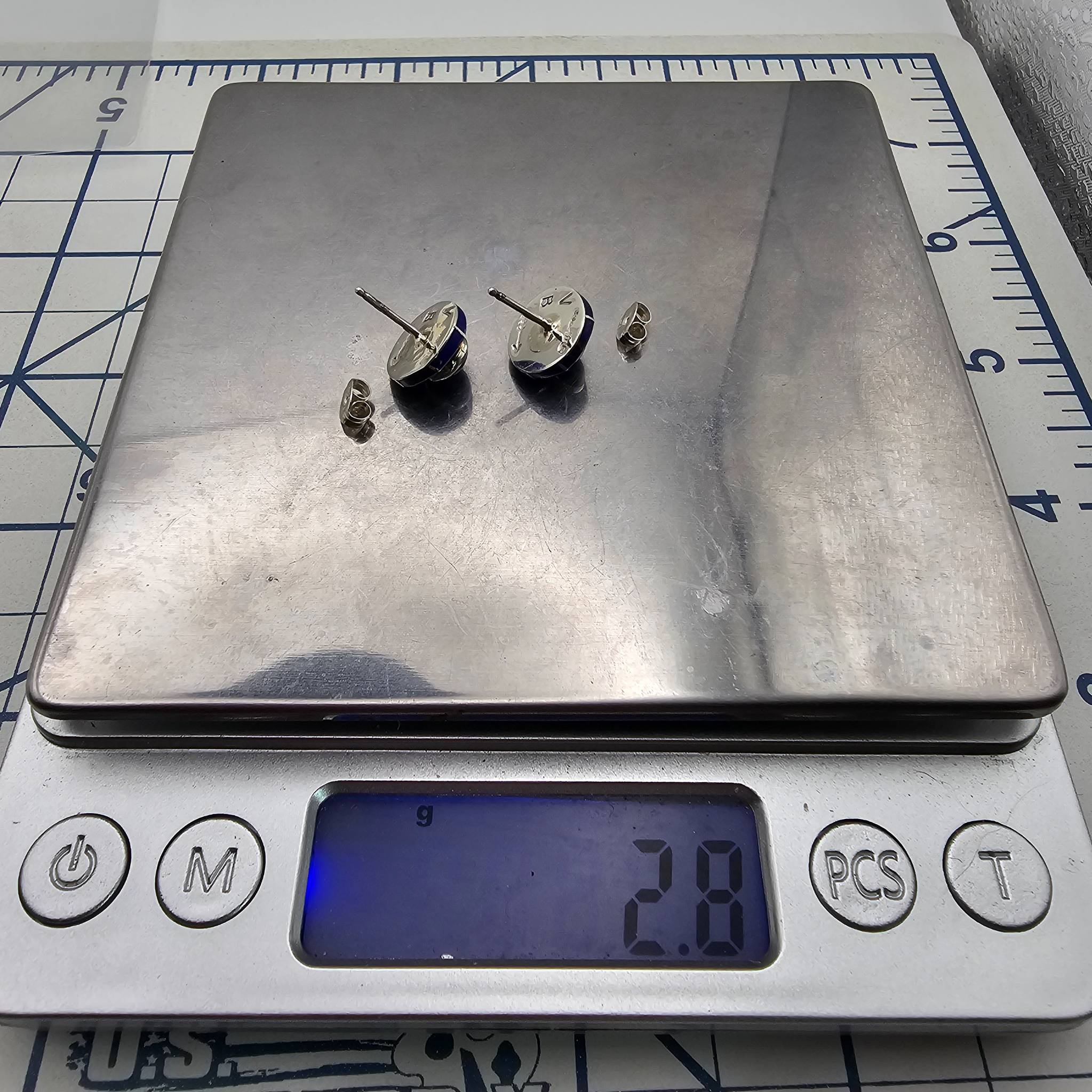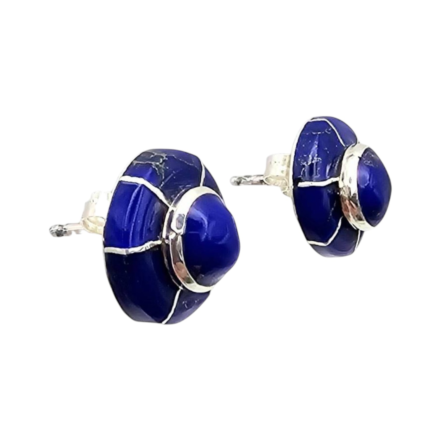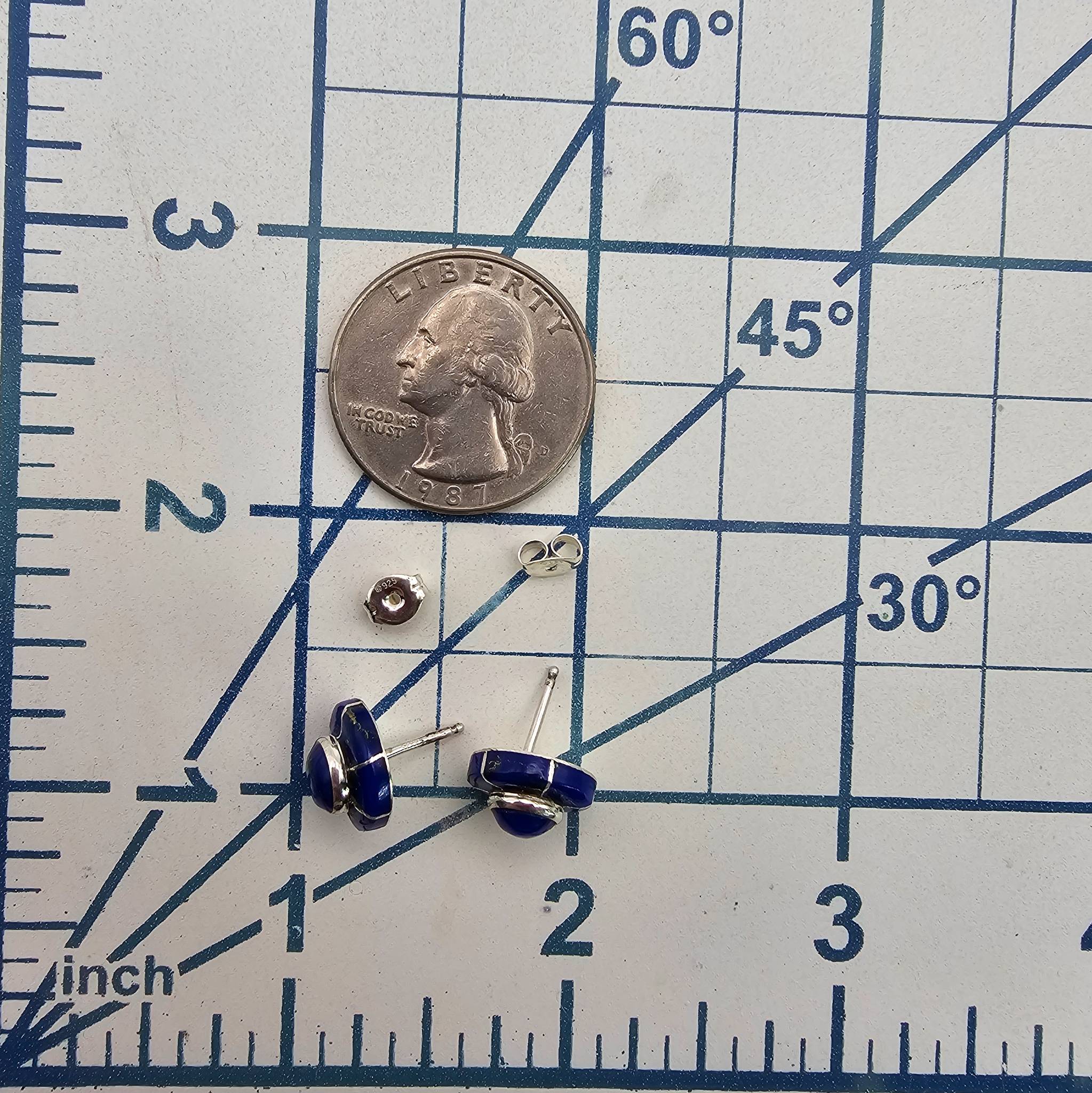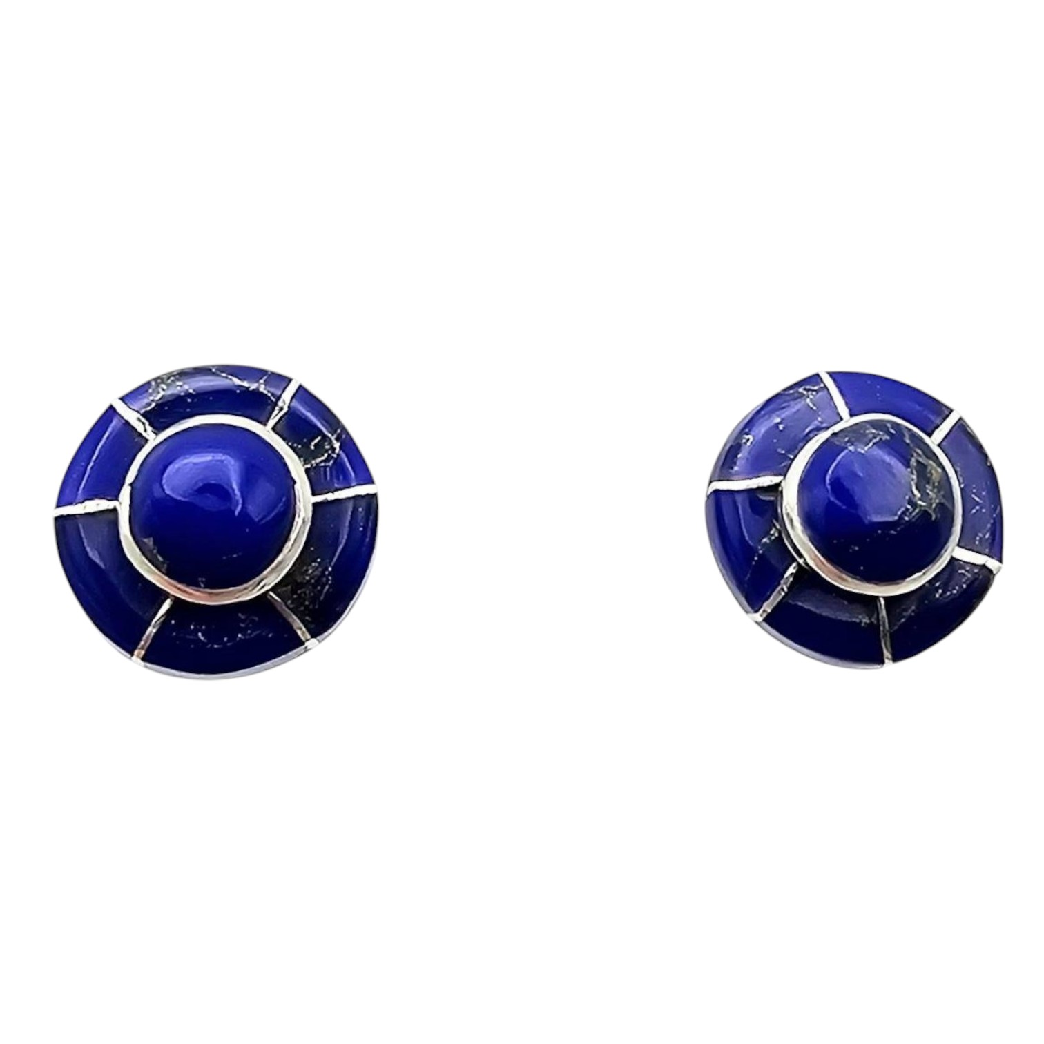 Fred Manuelito handmade Navajo earrings crafted from sterling silver with Lapis inlay. Earrings feature a domed round design with vibrant blue inset stonework, secured with sterling silver backs. Weighs approximately 2.8 grams, as shown.