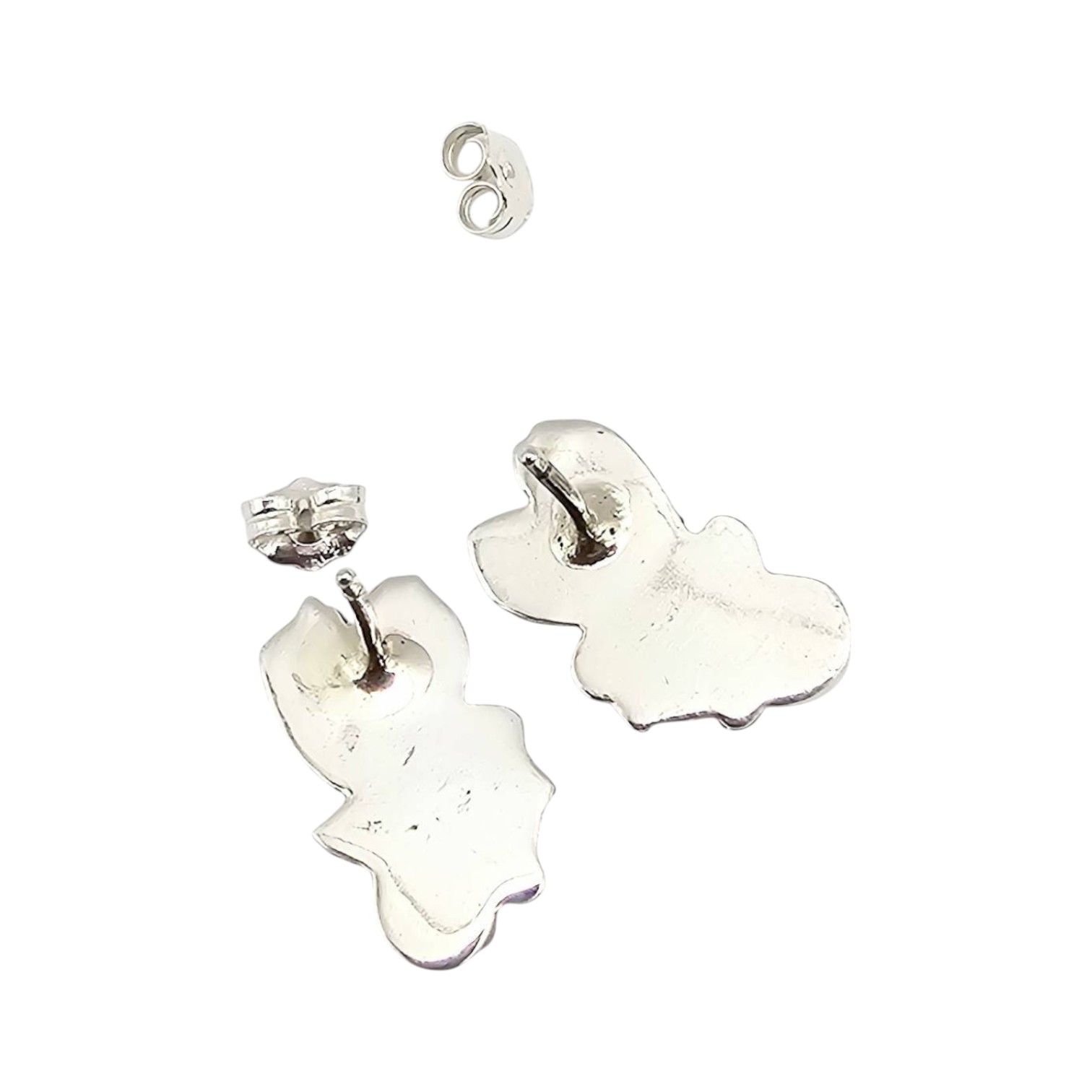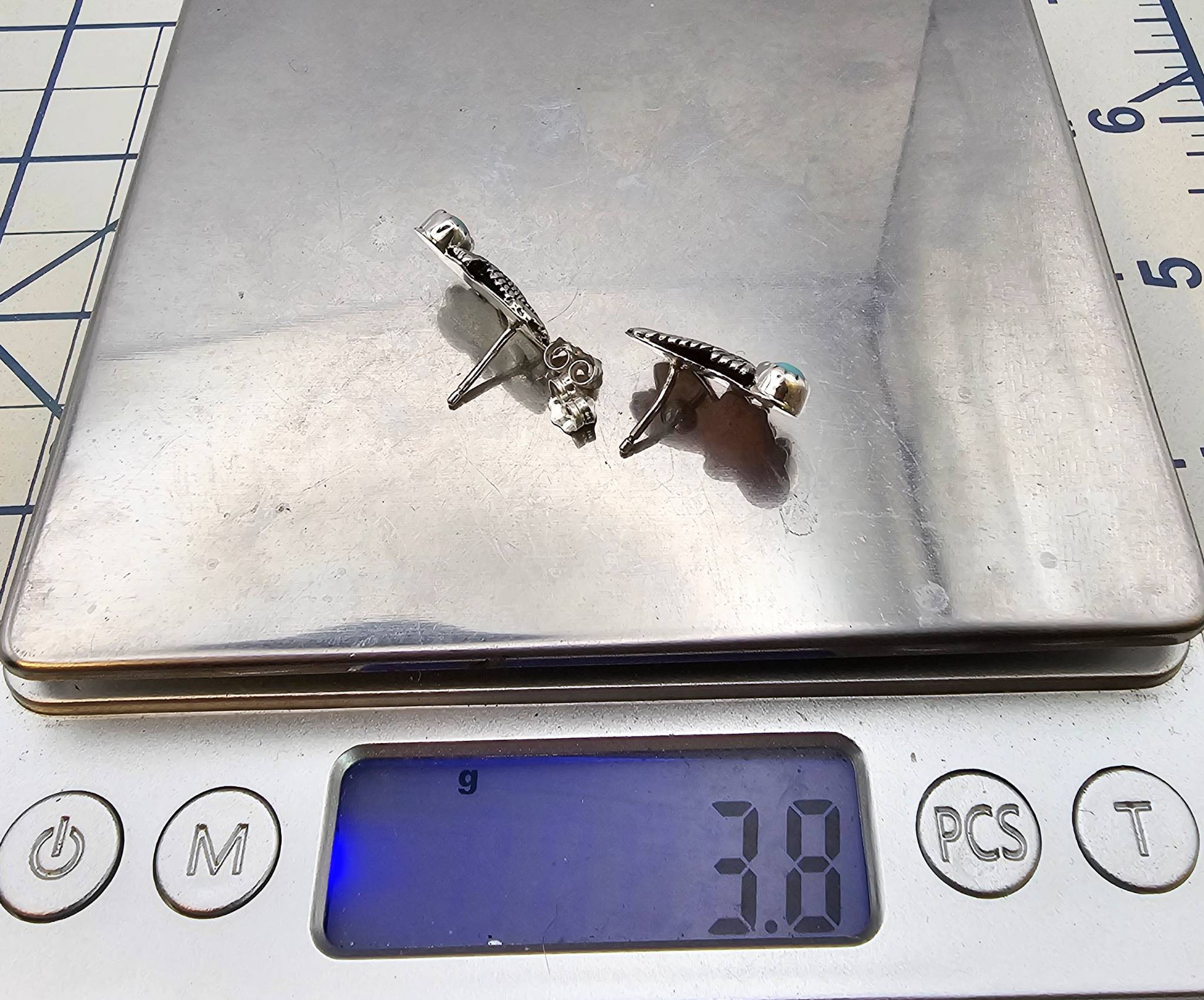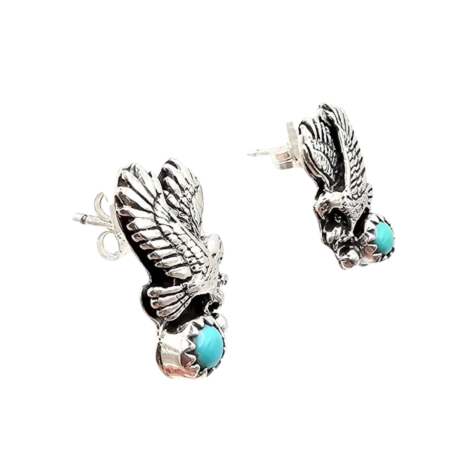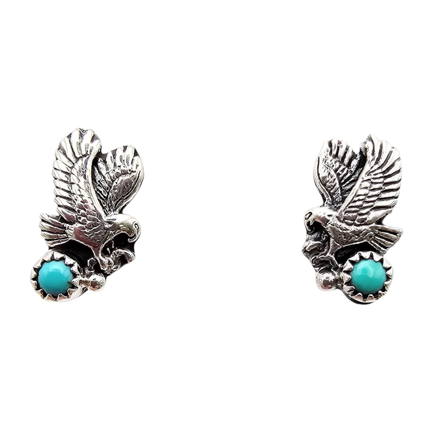 Handmade sterling silver earrings crafted by Elaine Shirley, a Navajo artisan. Featuring eagle motifs accented with Kingman turquoise stones, these earrings weigh approximately 3.8 grams. Stud backs with secure closures are included.