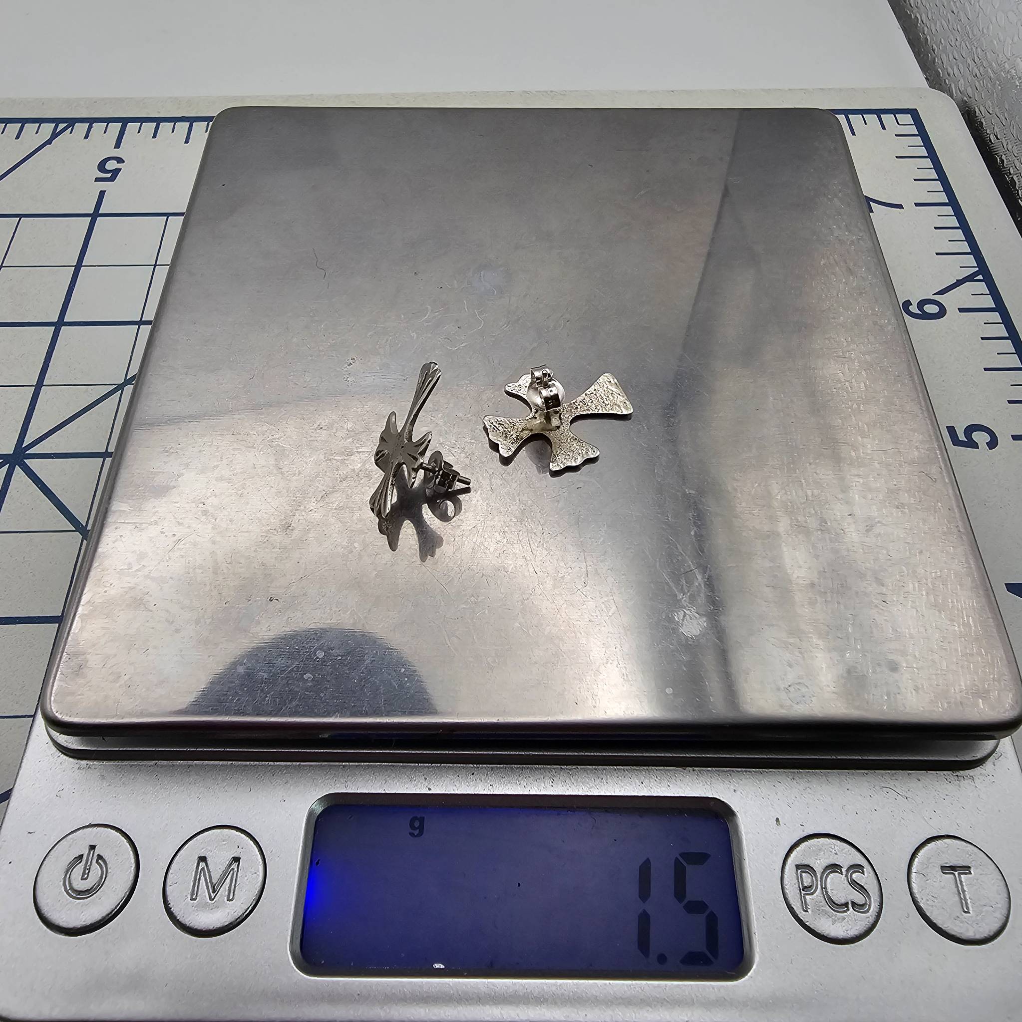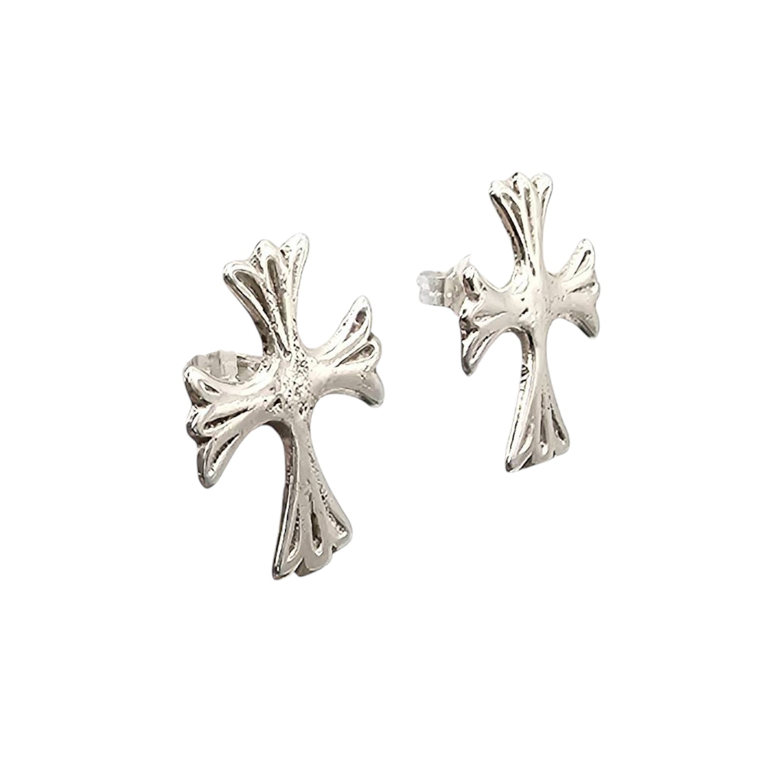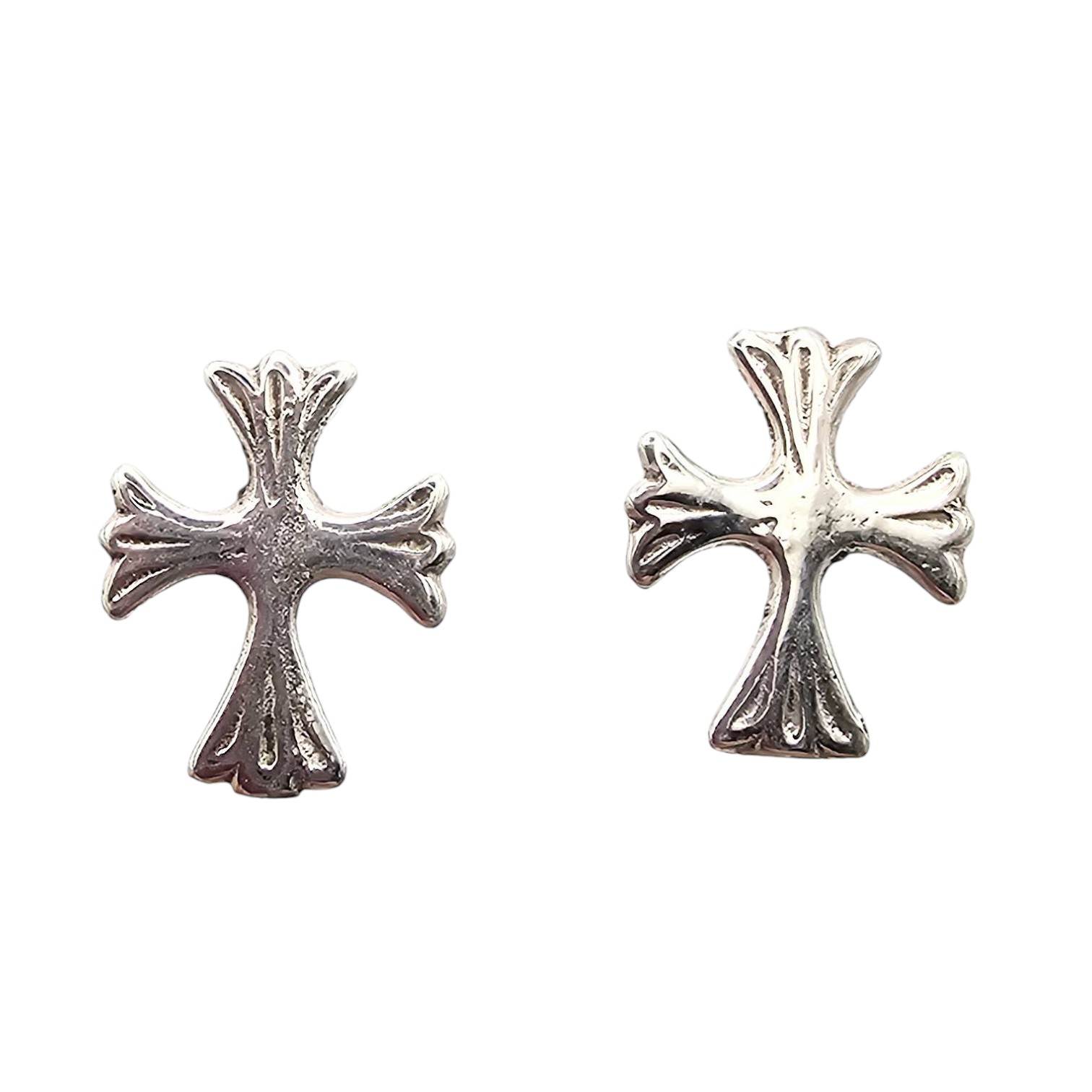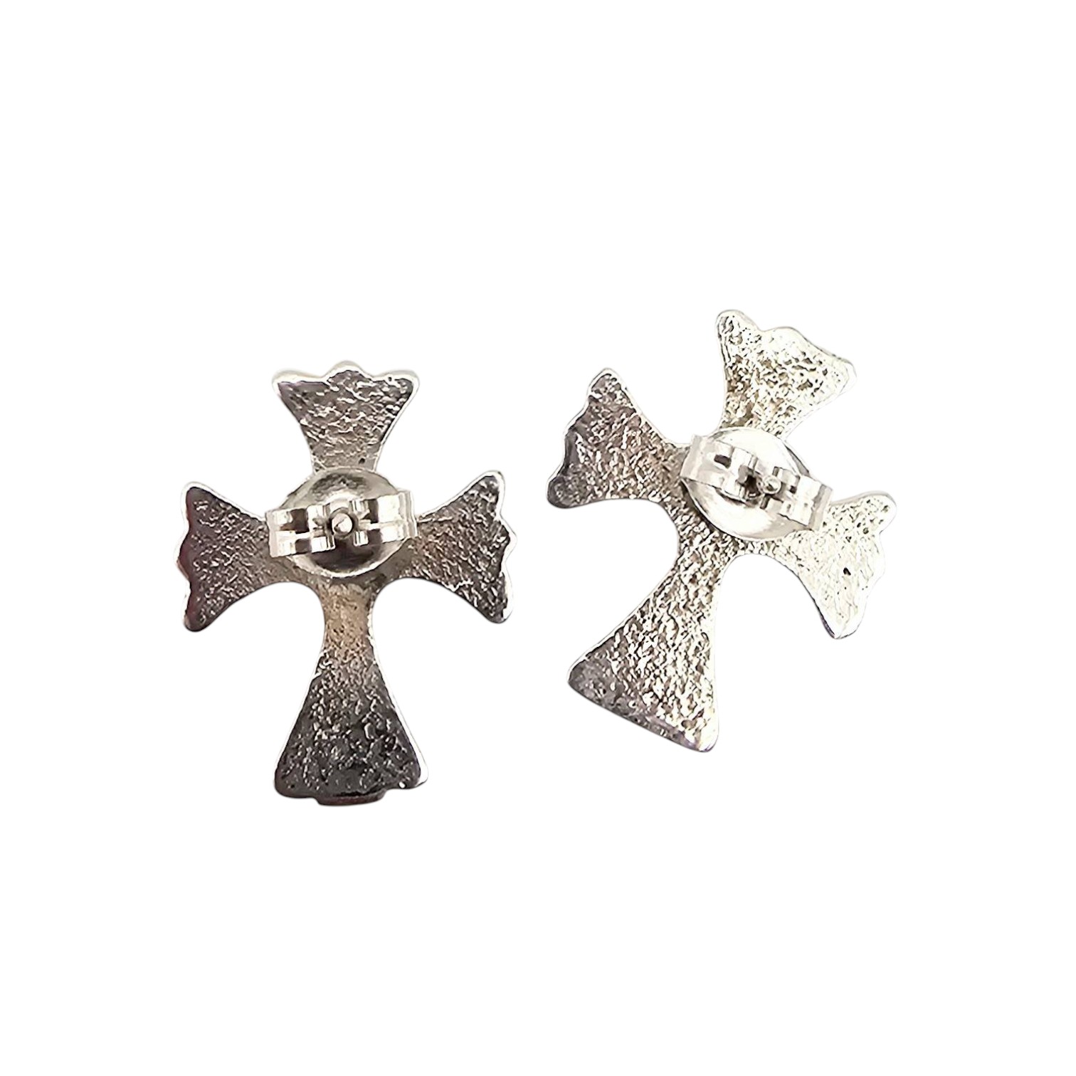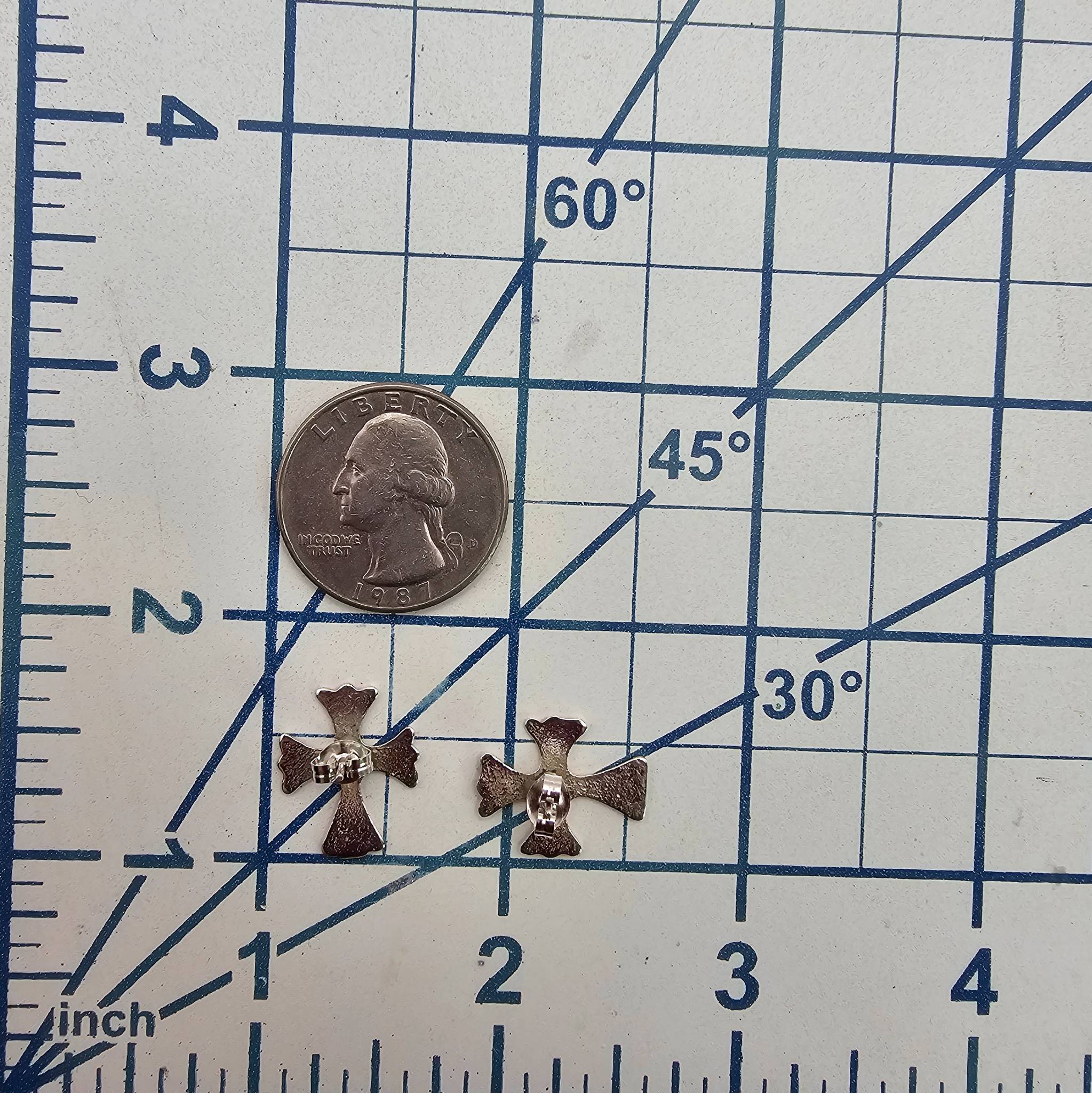 Sterling silver earrings handmade by Navajo artisan Lorraine Chee. Weighing approximately 1.5 grams, these earrings feature an intricately designed cross pattern with textured detailing. The pieces are clearly marked as sterling silver and are post-back for secure wear.
