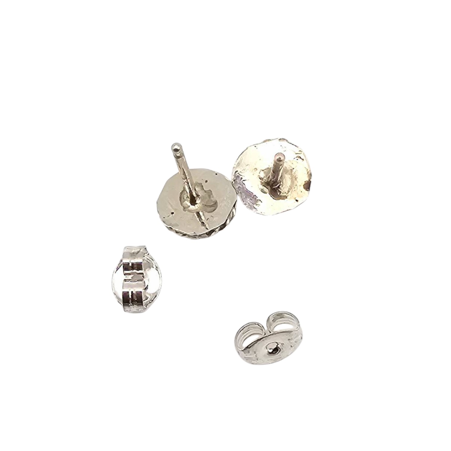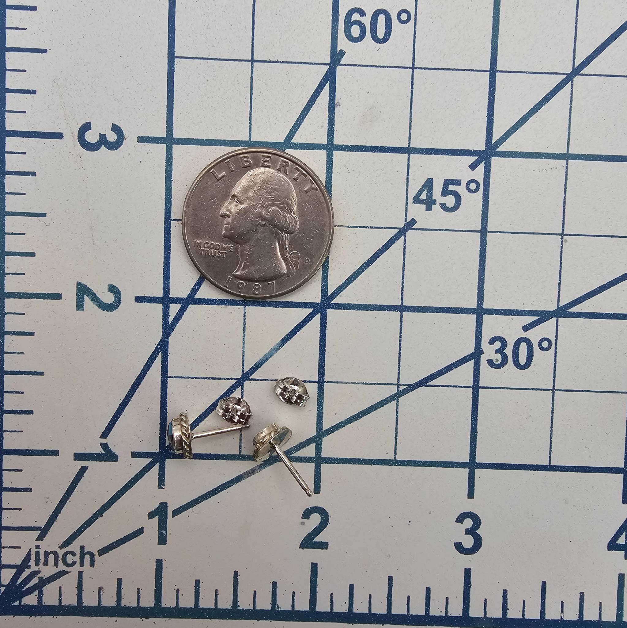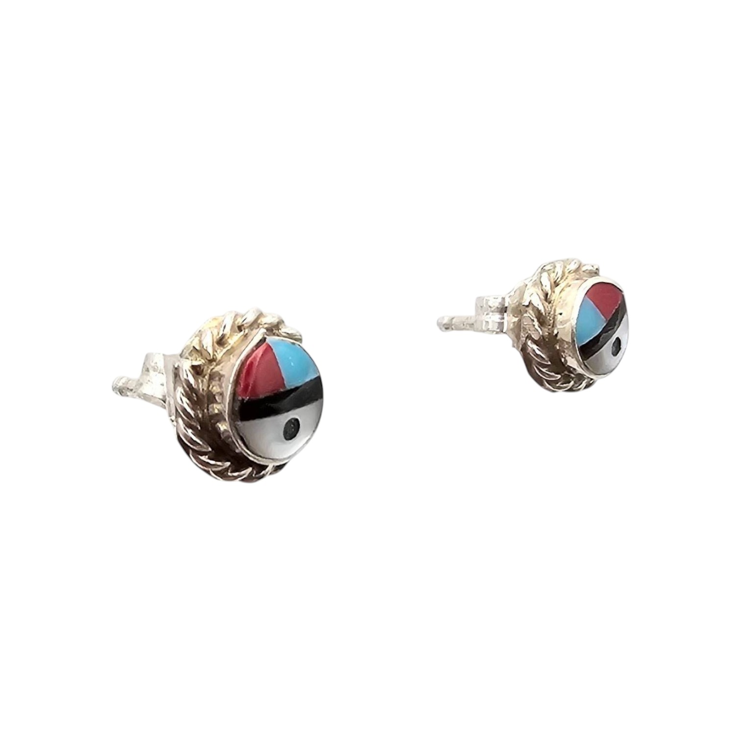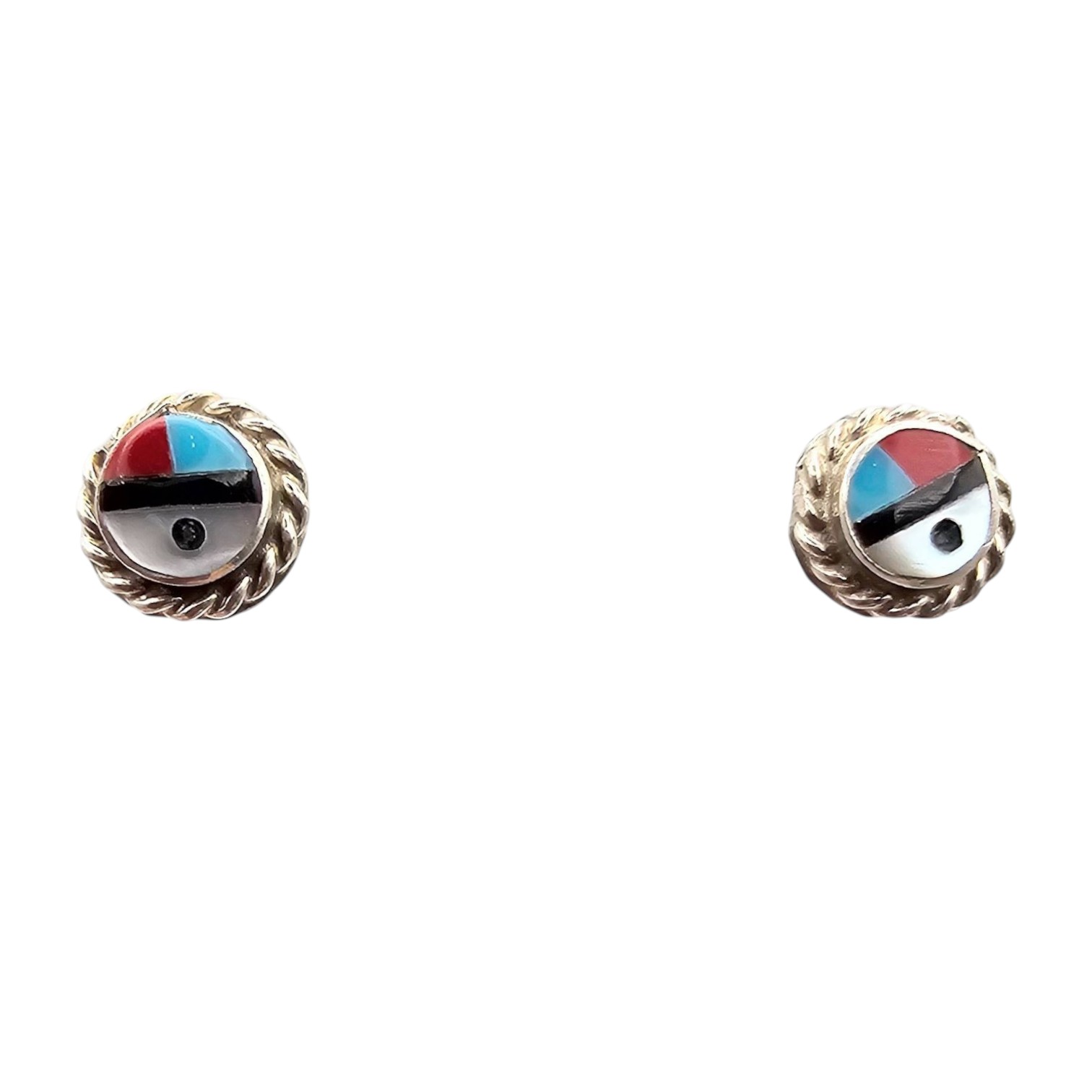 Zuni-style sterling silver stud earrings featuring finely inlaid mother of pearl, turquoise, coral, and black onyx. These sunface earrings are crafted in a circular design with twisted rope borders and silver posts with matching backs. They weigh approximately 1.1 grams. Measurements are provided in images for size reference. Condition is consistent with handcrafted jewelry.