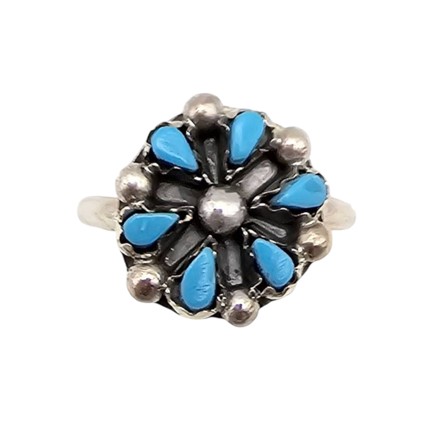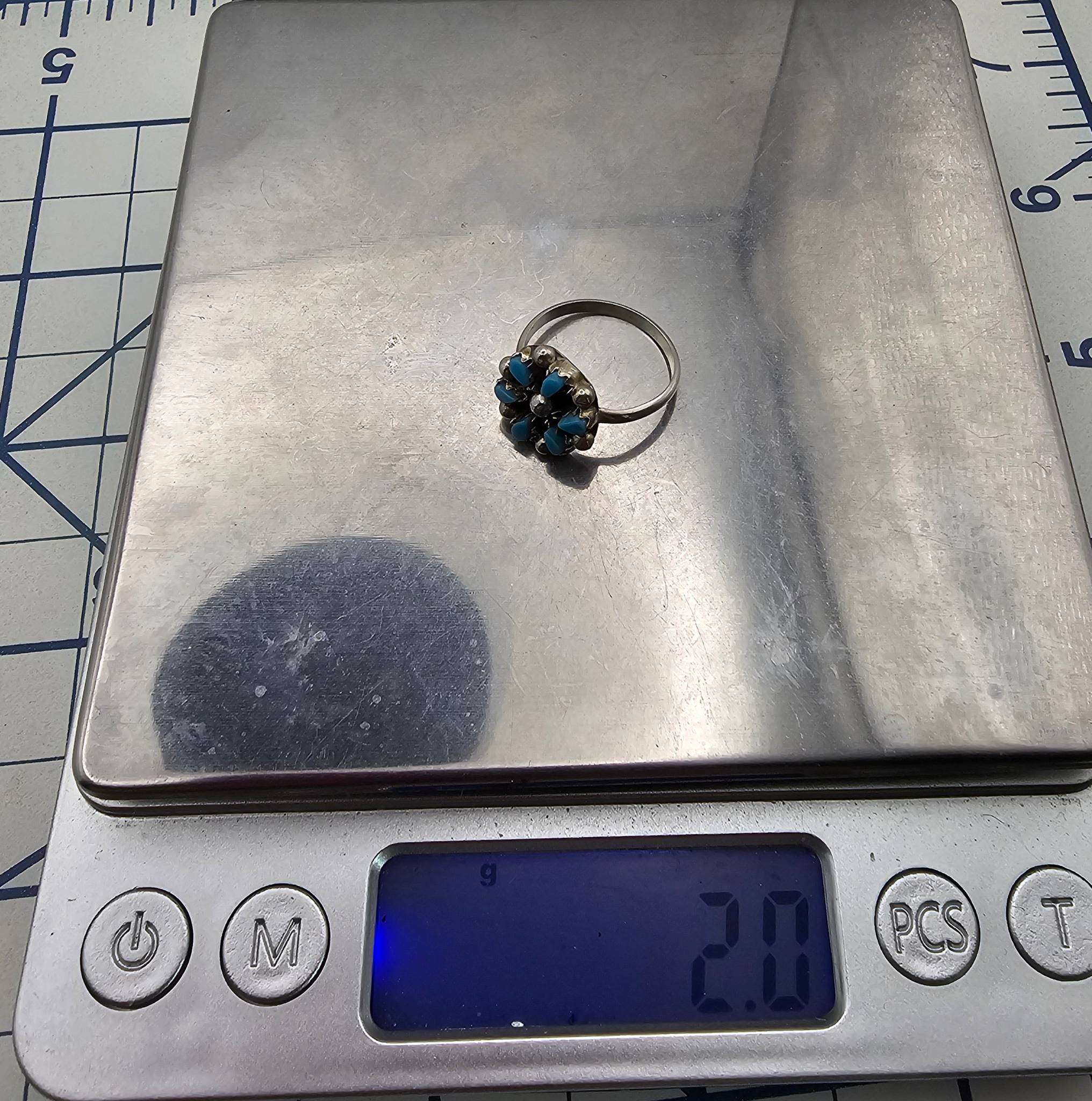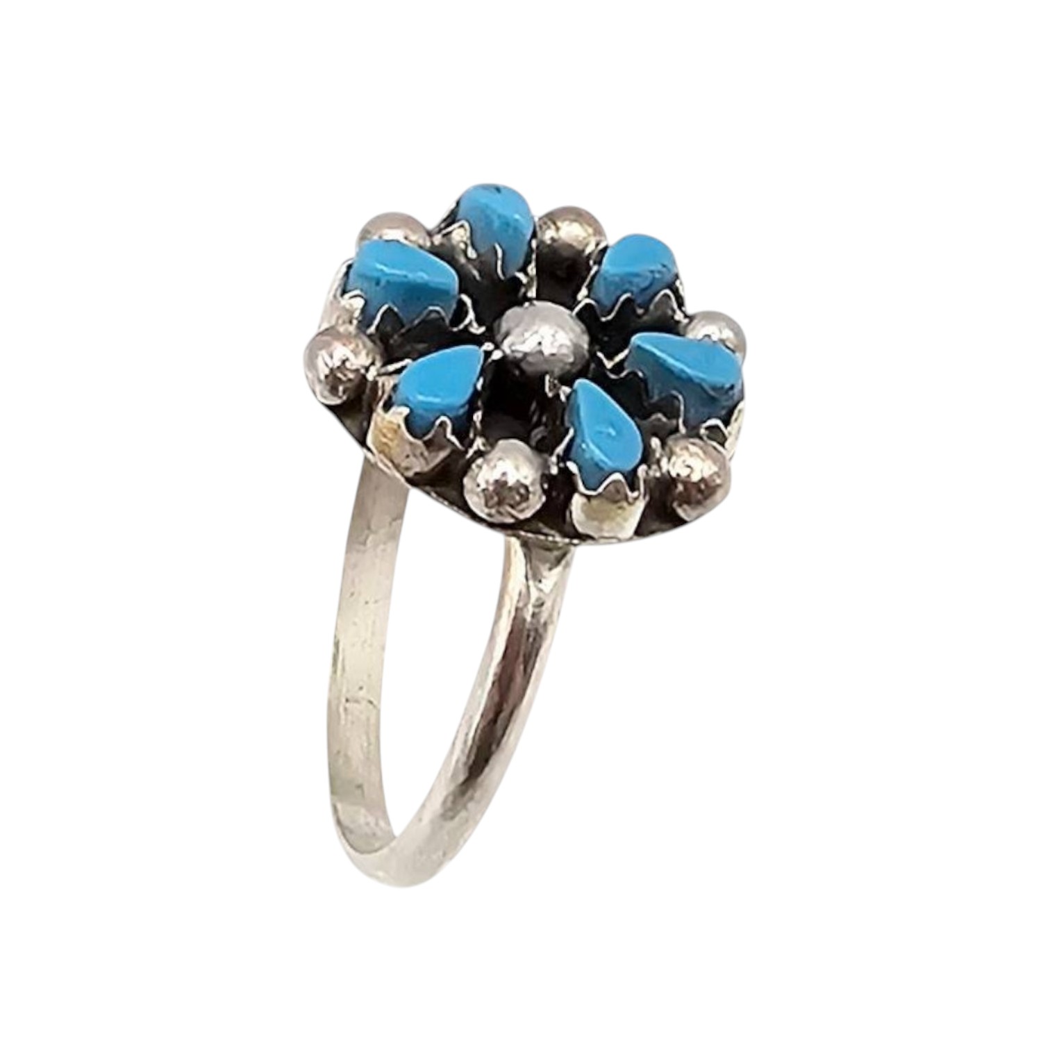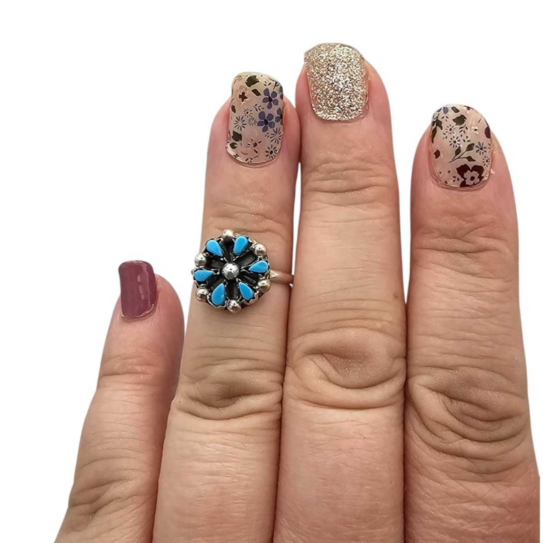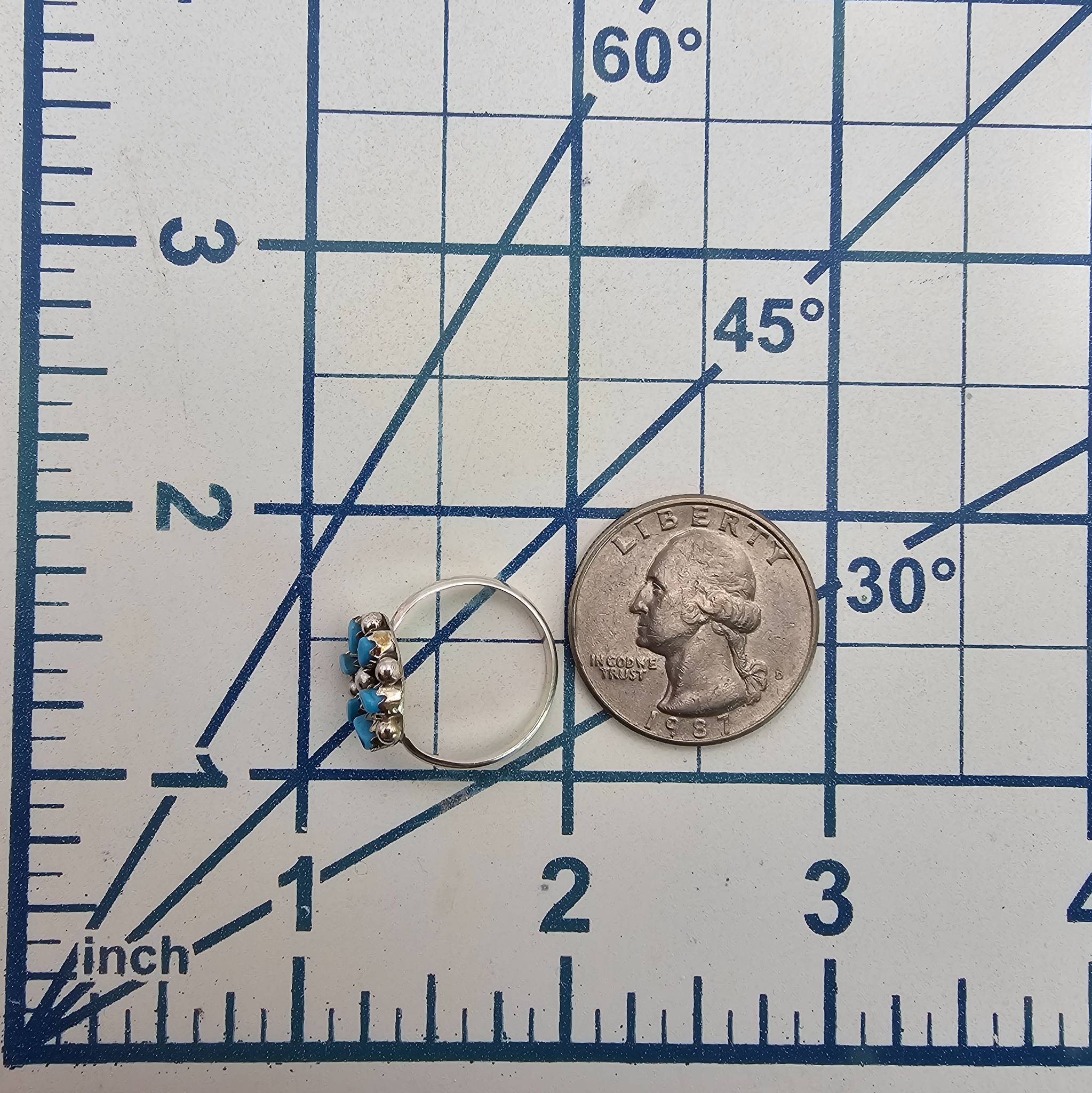Handmade sterling silver ring by Tricia Leekity, a Zuni artisan, featuring Kingman turquoise stones set in a floral cluster design. The ring is size 4.5 and weighs approximately 2.0 grams. Includes hallmarks indicating its origin.