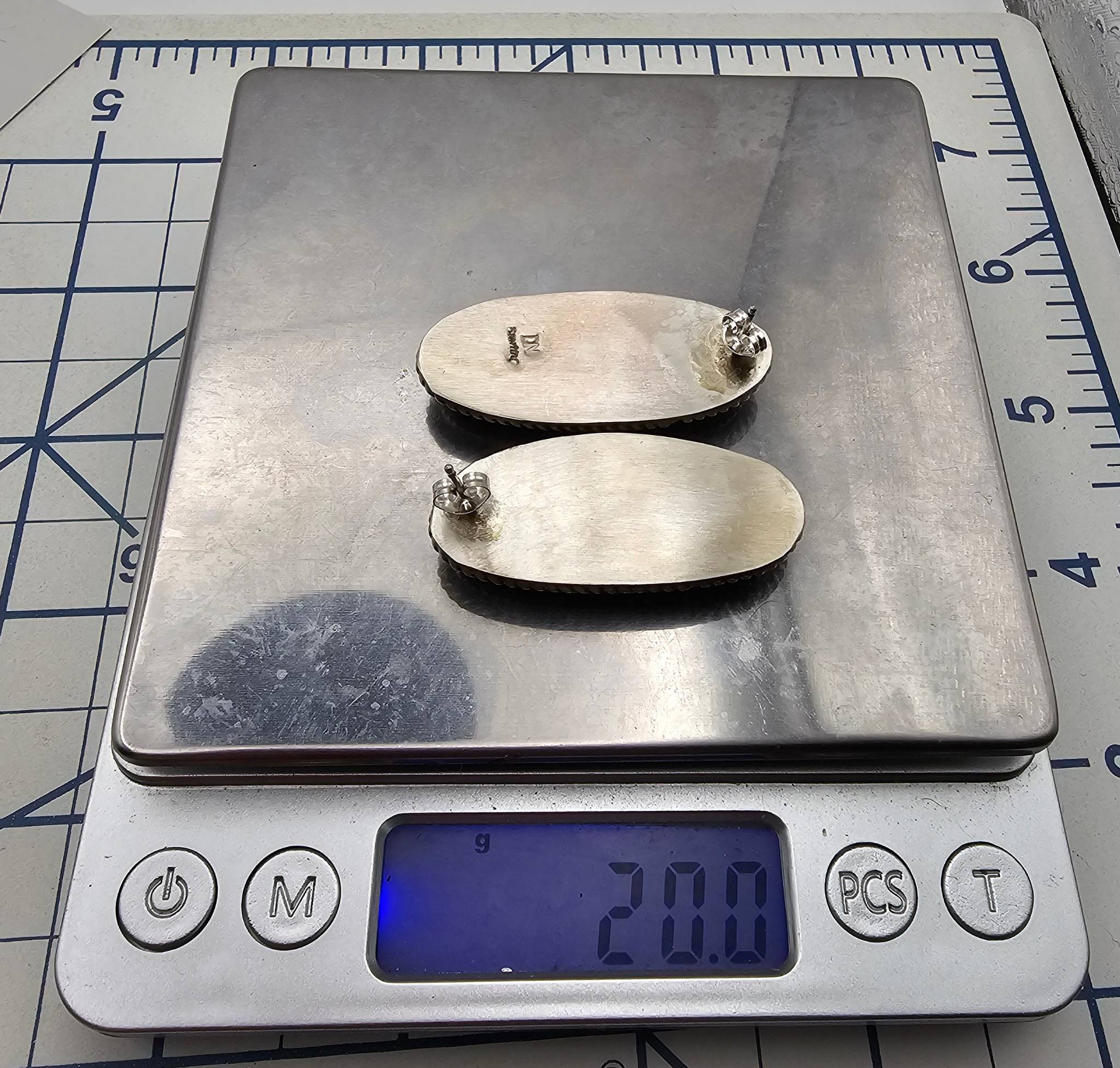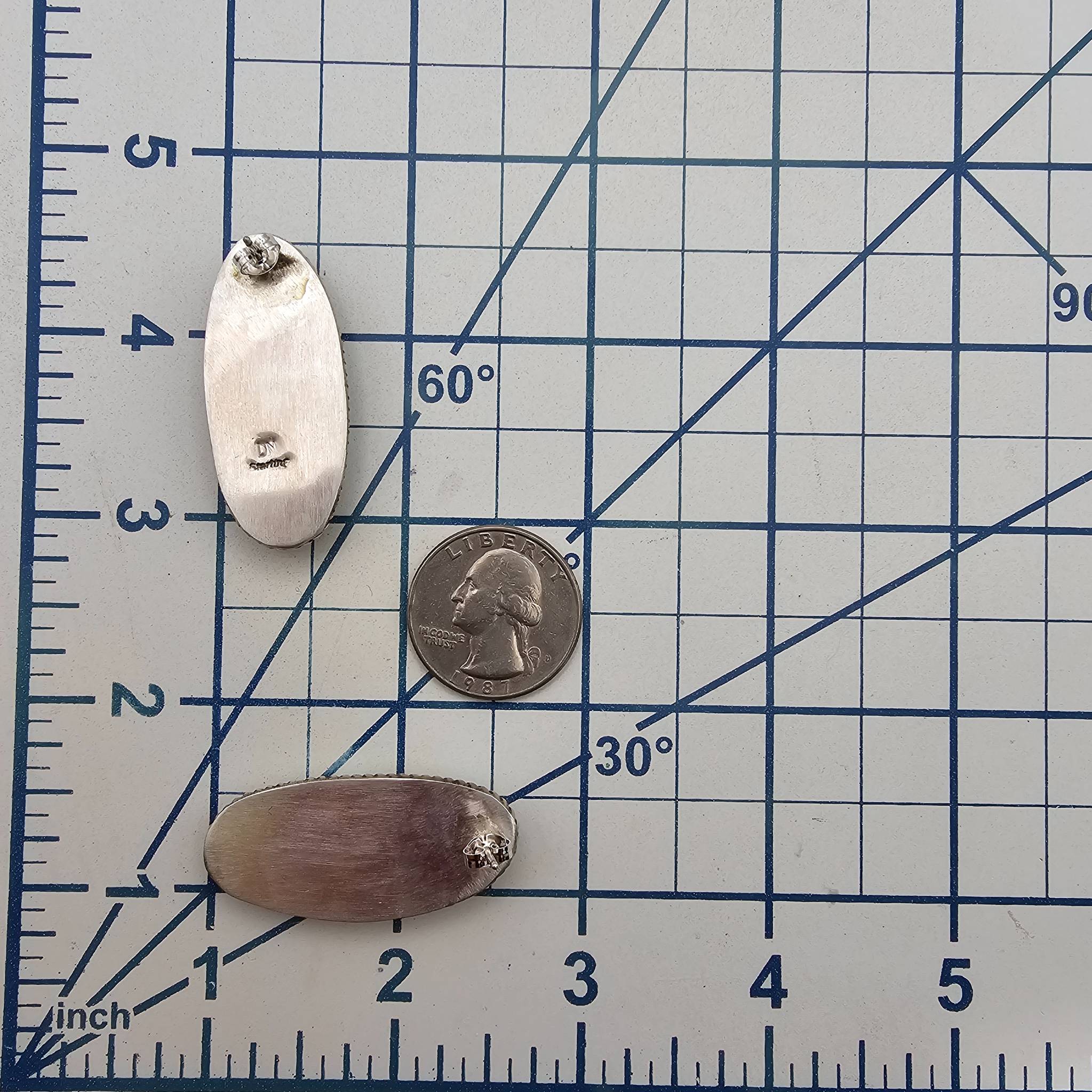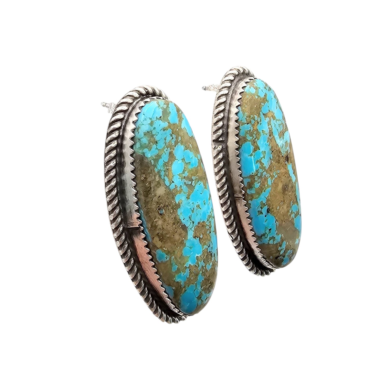 Handmade sterling silver earrings by Navajo artisan Donovan Nez, featuring Kingman turquoise gems. Each earring is oval in shape with post-back closures and bears the artisan’s hallmark. The total weight is 20 grams. Dimensions are not specified but scale imagery is provided for estimation. Originally priced at $450.