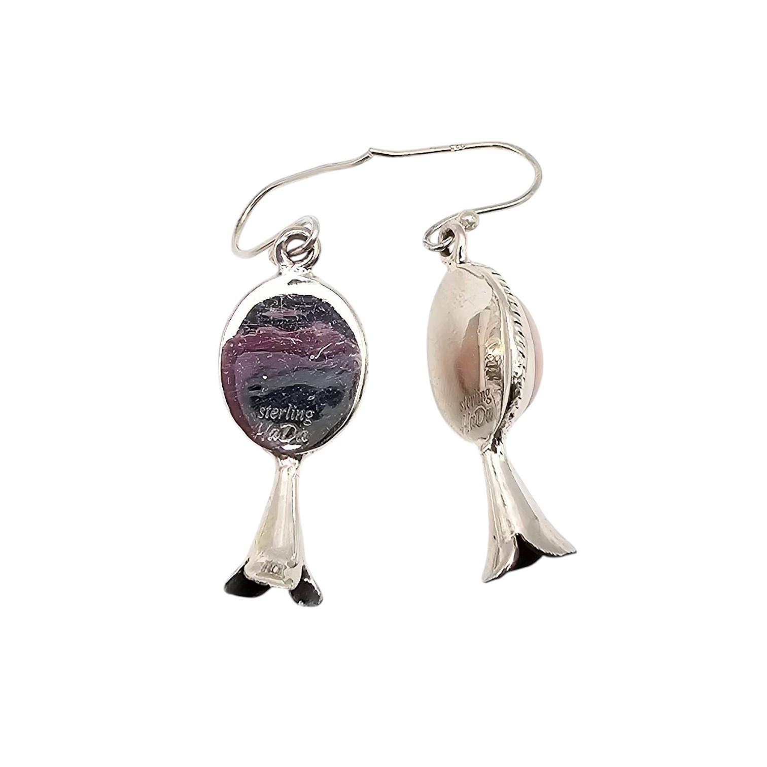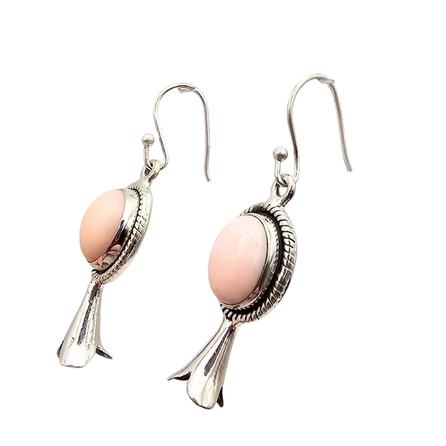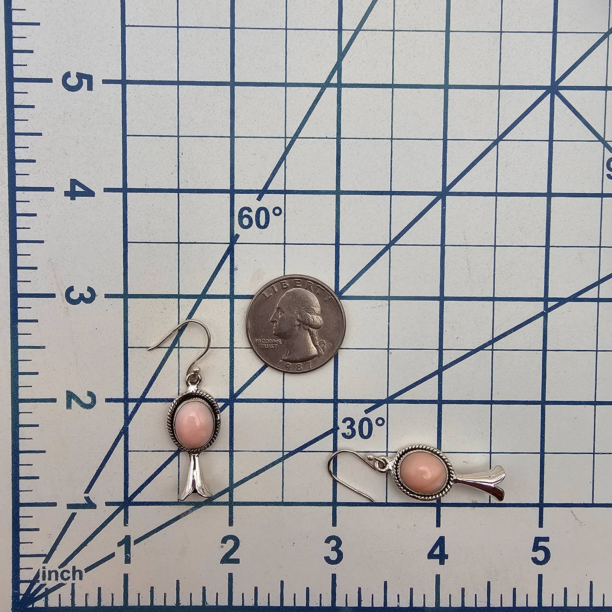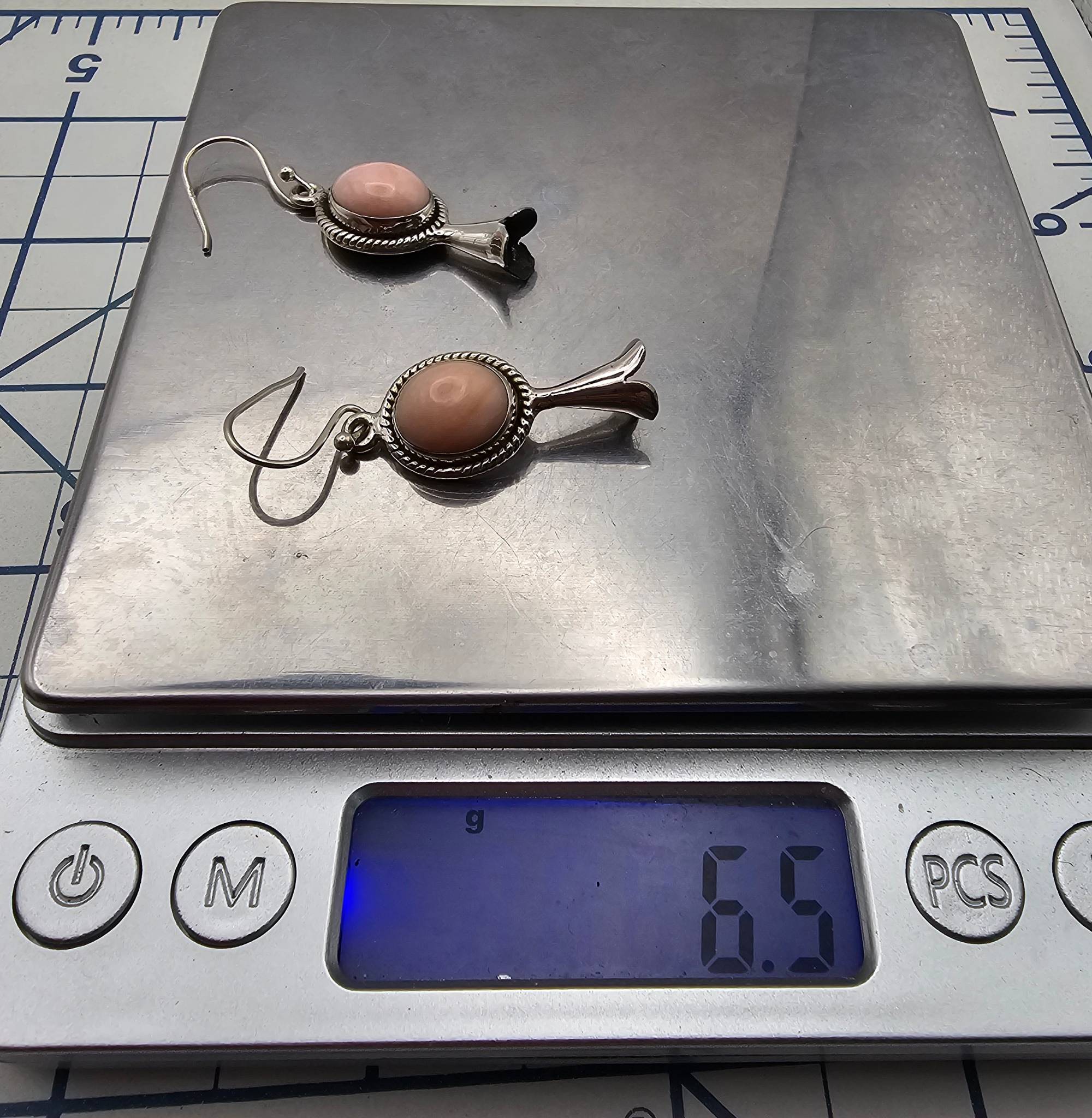 Hada Collection dangle earrings crafted from sterling silver and featuring oval-shaped pink opal stones. Stamped ‘Sterling’ on the back. Total weight is approximately 6.5 grams. Measurements shown against a ruler for size reference.